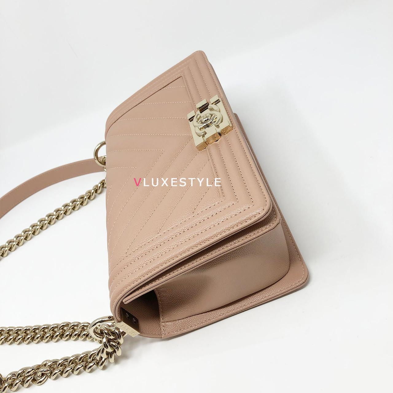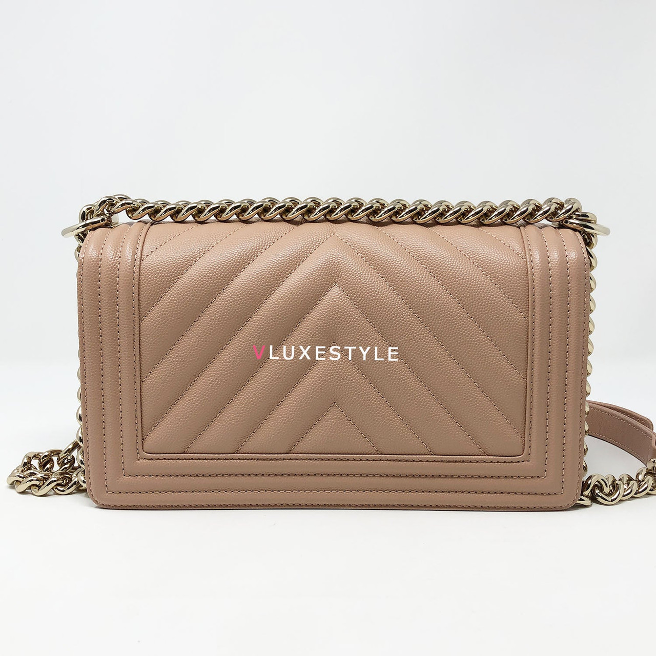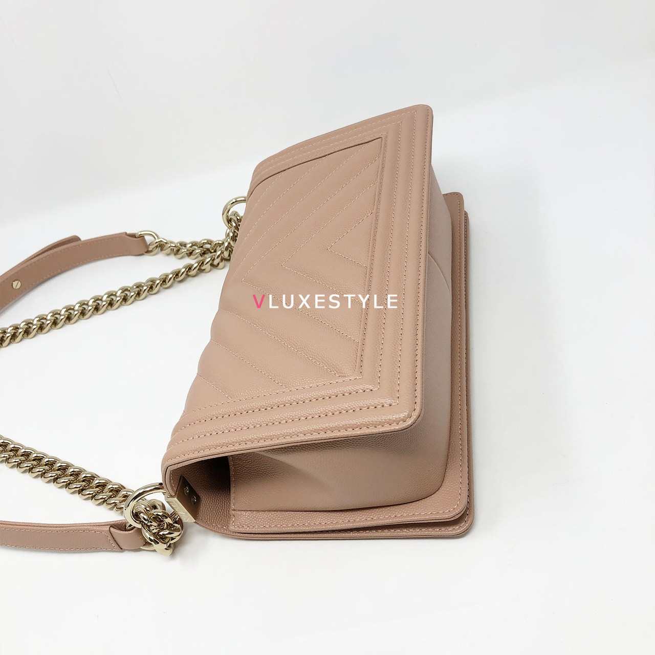 A very rare and highly sought-after combination! Authentic 18S Le Boy Old Medium Nude Blush Pink Chevron Caviar with light gold hardware. This stylish shoulder bag is crafted of luxurious and durable caviar leather in a gorgeous nude blush pink in an ultra-rare chevron pattern and light gold hardware. The bag can be worn long and short over-the-shoulder bag and crossbody. It's absolutely beautiful it's the perfect bag for every occasion.