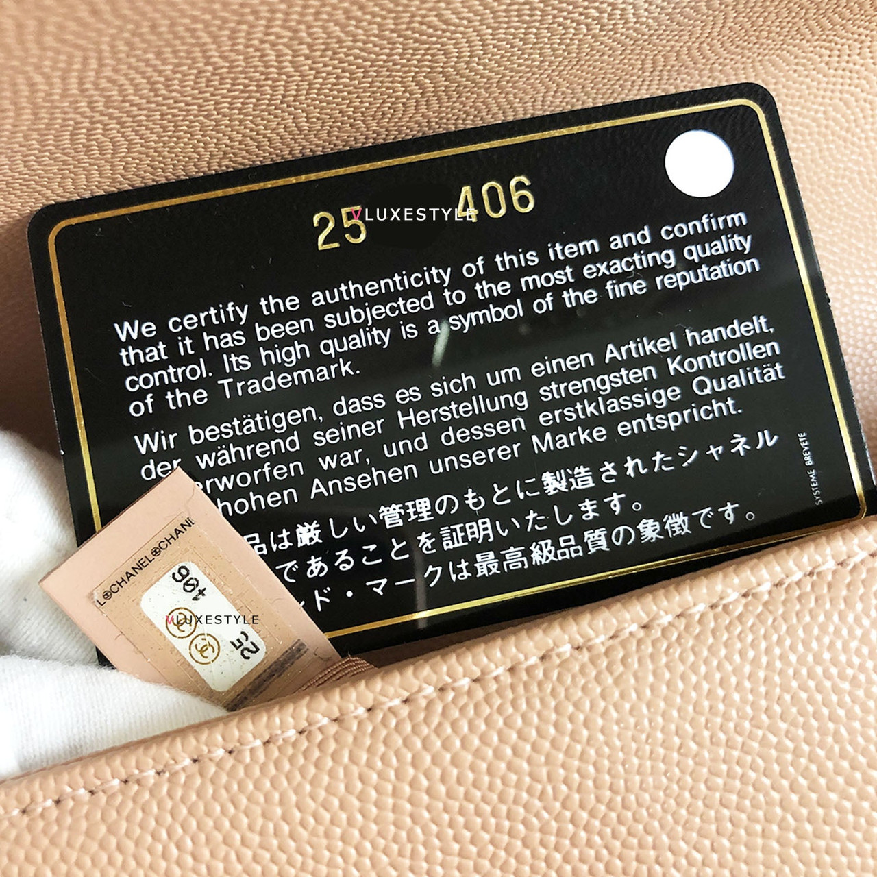 What comes with: Full set, tags, authenticity card, original receipt, dust bag, care booklet, ribbons, camellia and Chanel magnetic box with an additional Entrupy Authenticity Certificate.