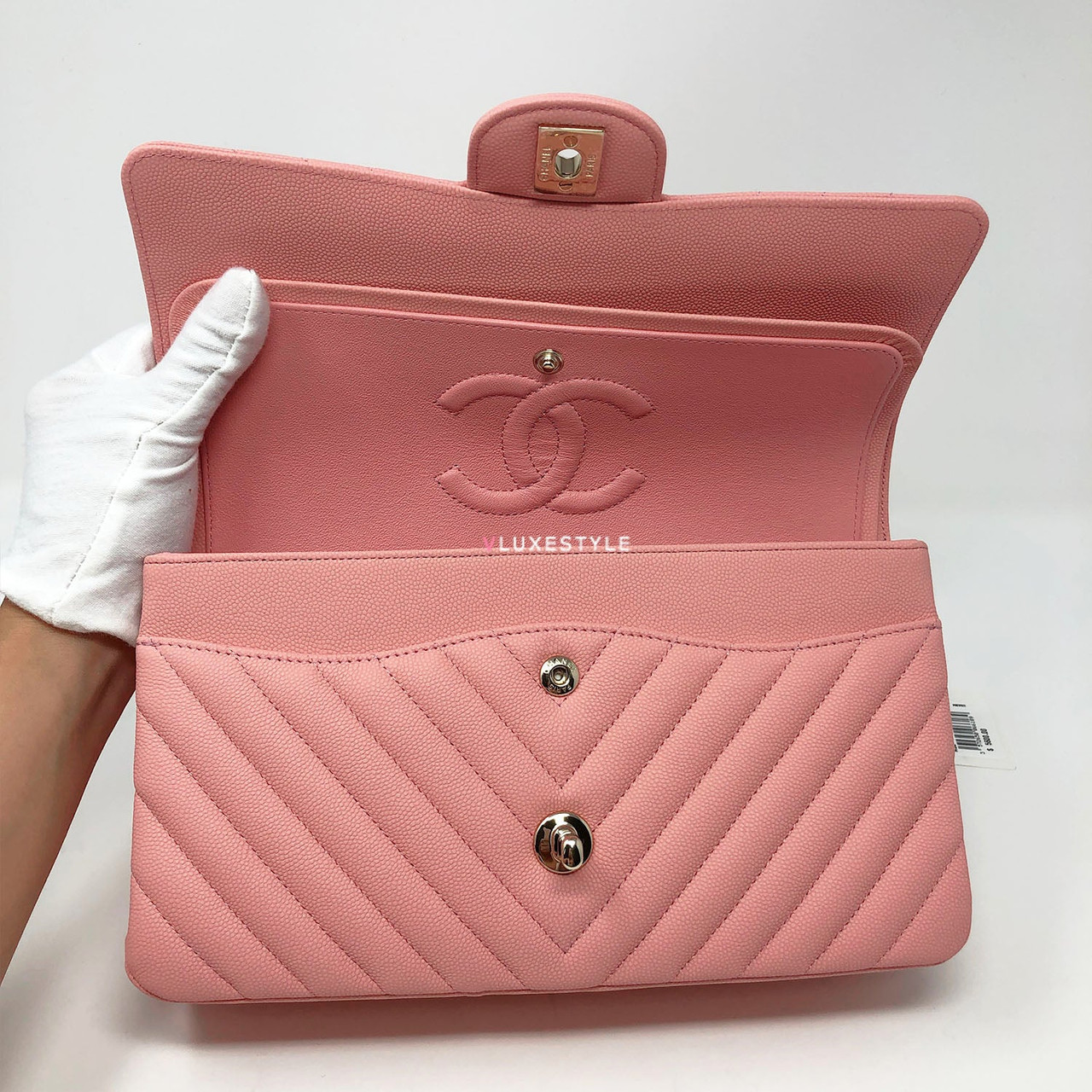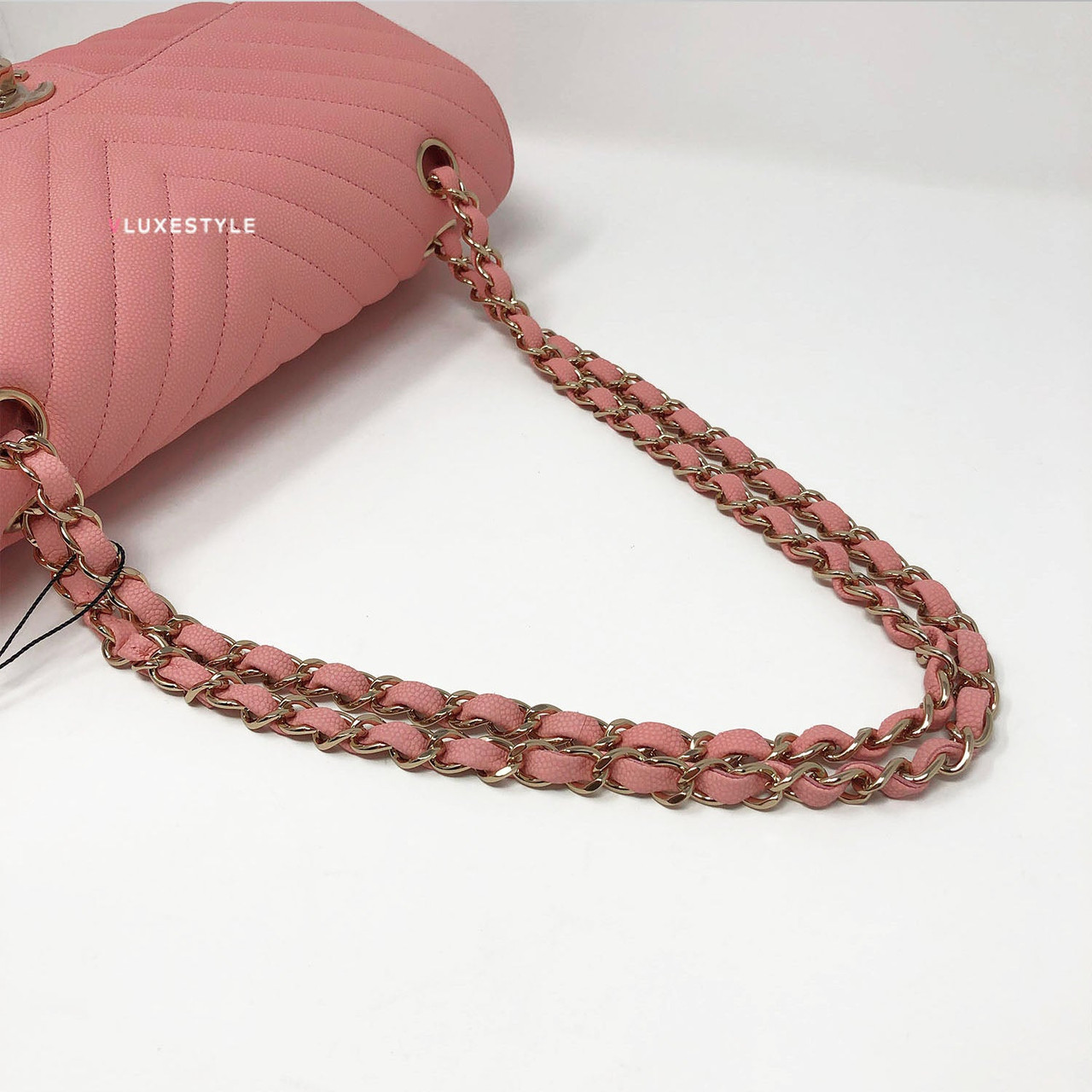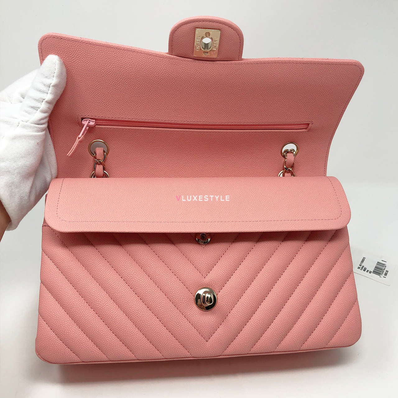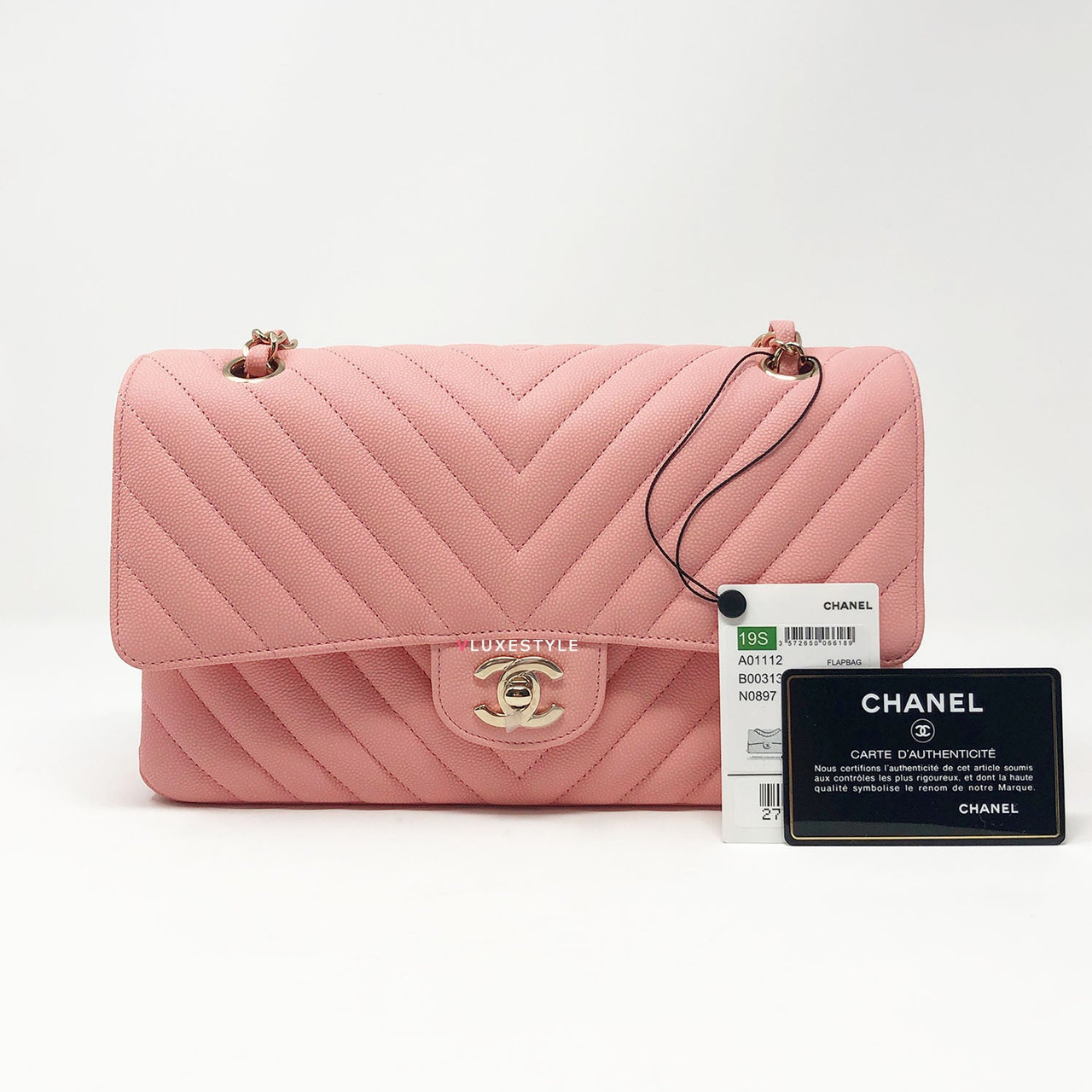 Brand new with tags! Authentic Chanel 19S Medium Matte Pink Chevron Caviar with light gold hardware. This timeless and stylish shoulder bag is crafted of luxurious matte pink caviar and light gold hardware.