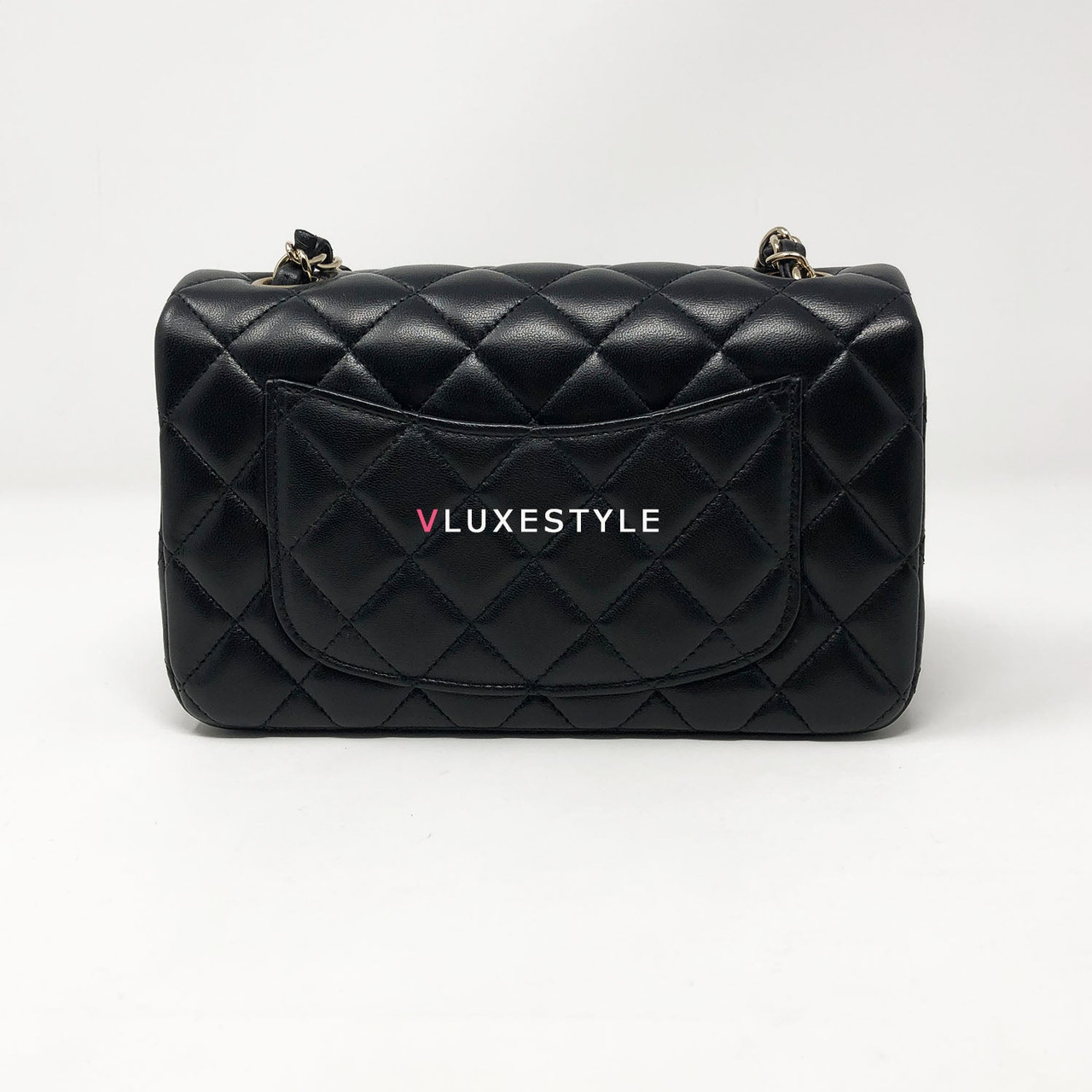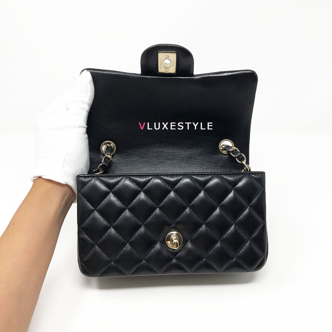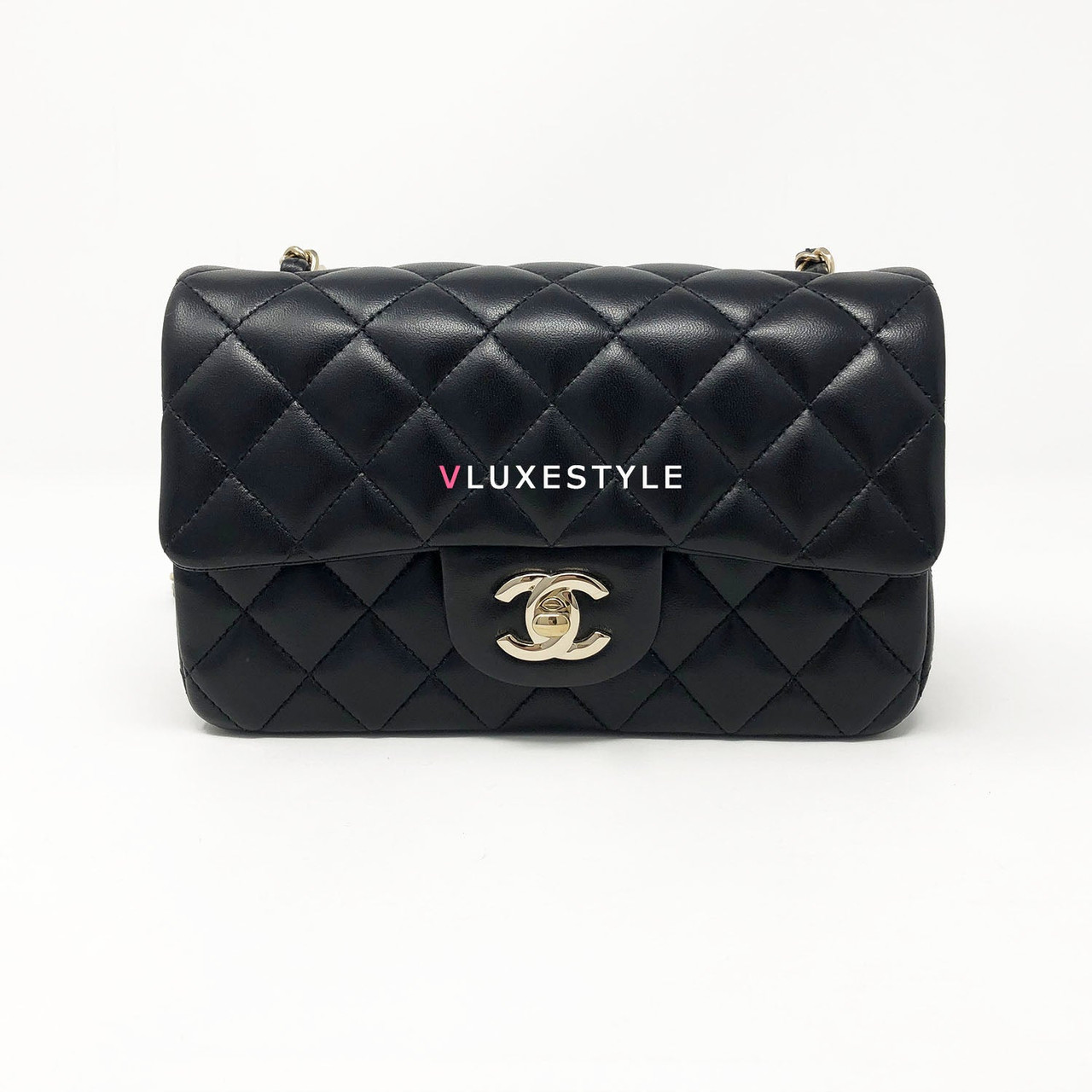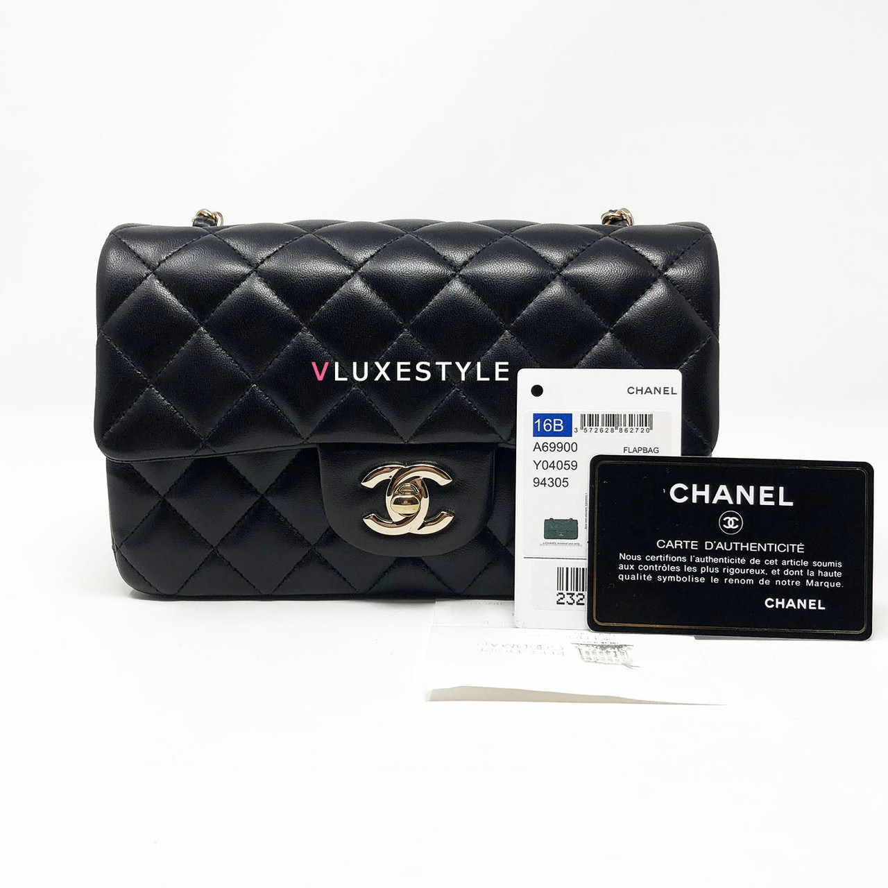 Rare and gorgeous! Chanel 16B Classic Mini Rectangular Black Quilted Lambskin with light gold hardware This stunning shoulder bag is crafted of luxurious lambskin leather in shiny and puffy jet black with light gold hardware. This mini bag can be worn as a crossbody or over-the-shoulder bag.