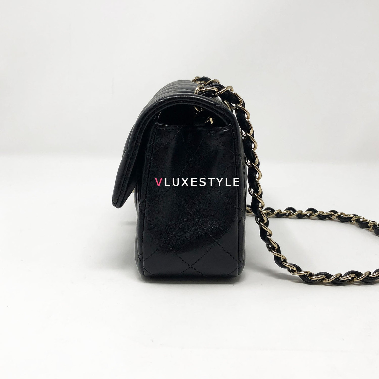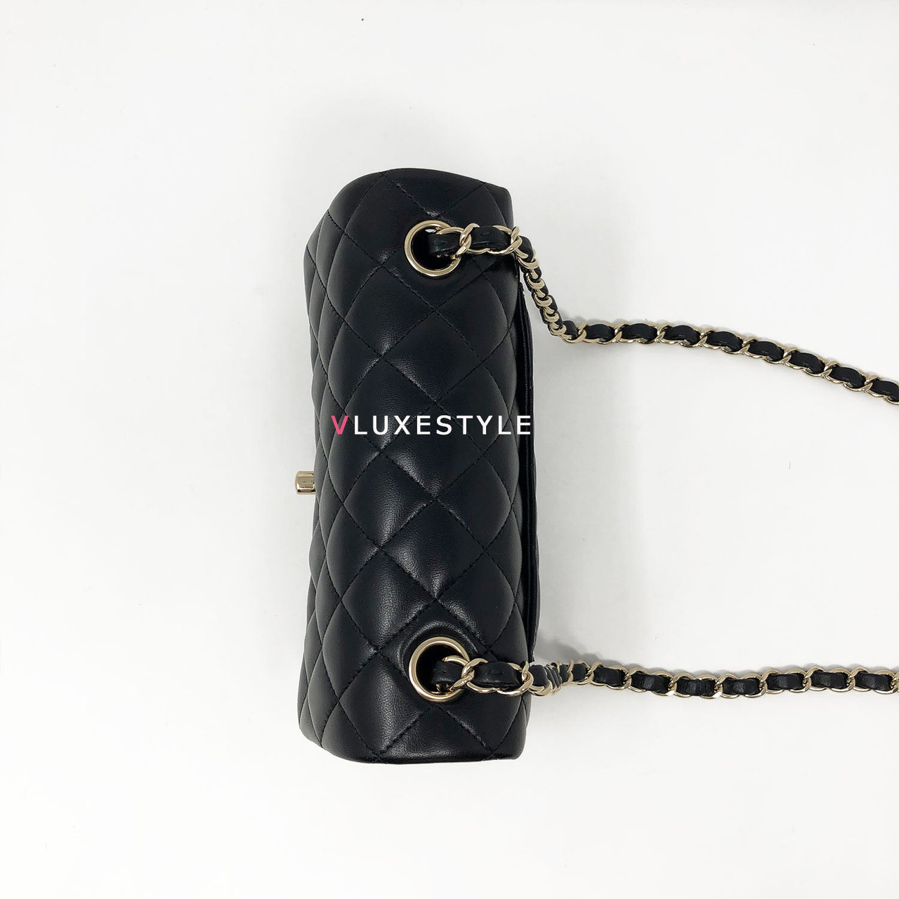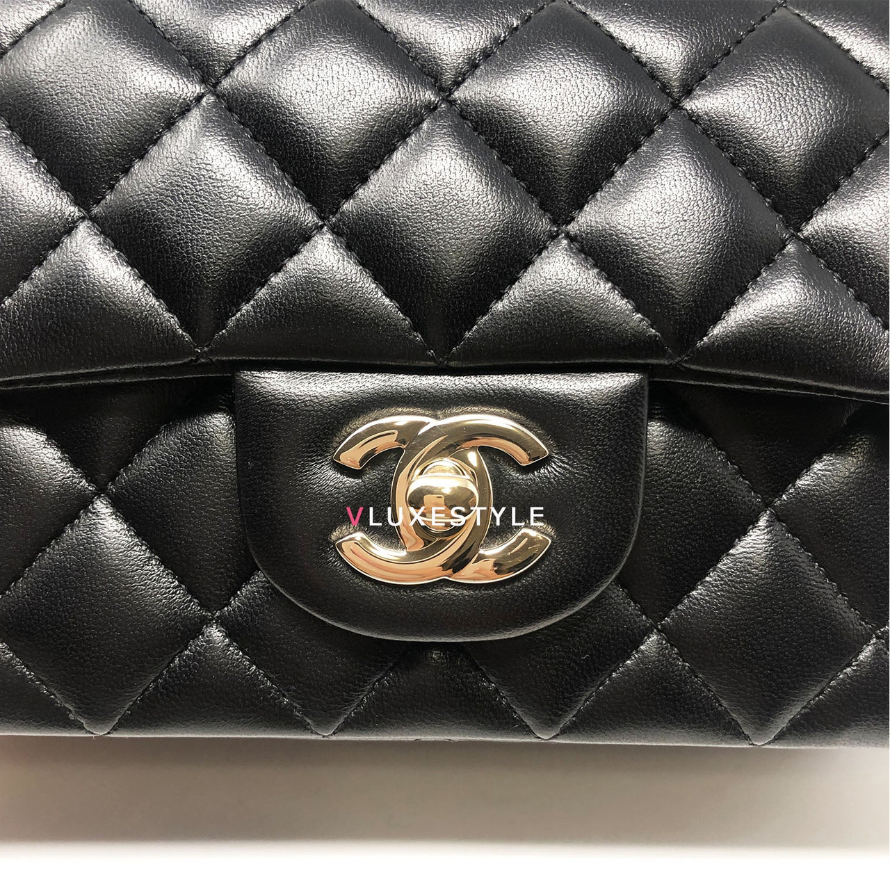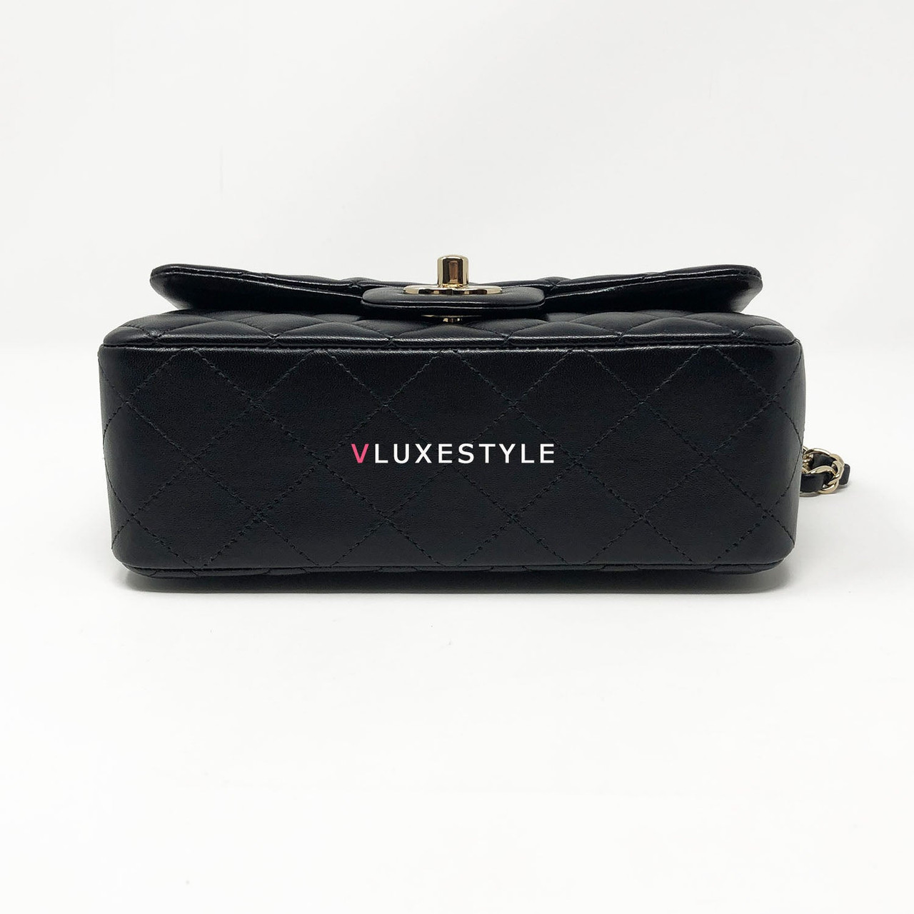 Rare and gorgeous! Chanel 16B Classic Mini Rectangular Black Quilted Lambskin with light gold hardware This stunning shoulder bag is crafted of luxurious lambskin leather in shiny and puffy jet black with light gold hardware. This mini bag can be worn as a crossbody or over-the-shoulder bag.