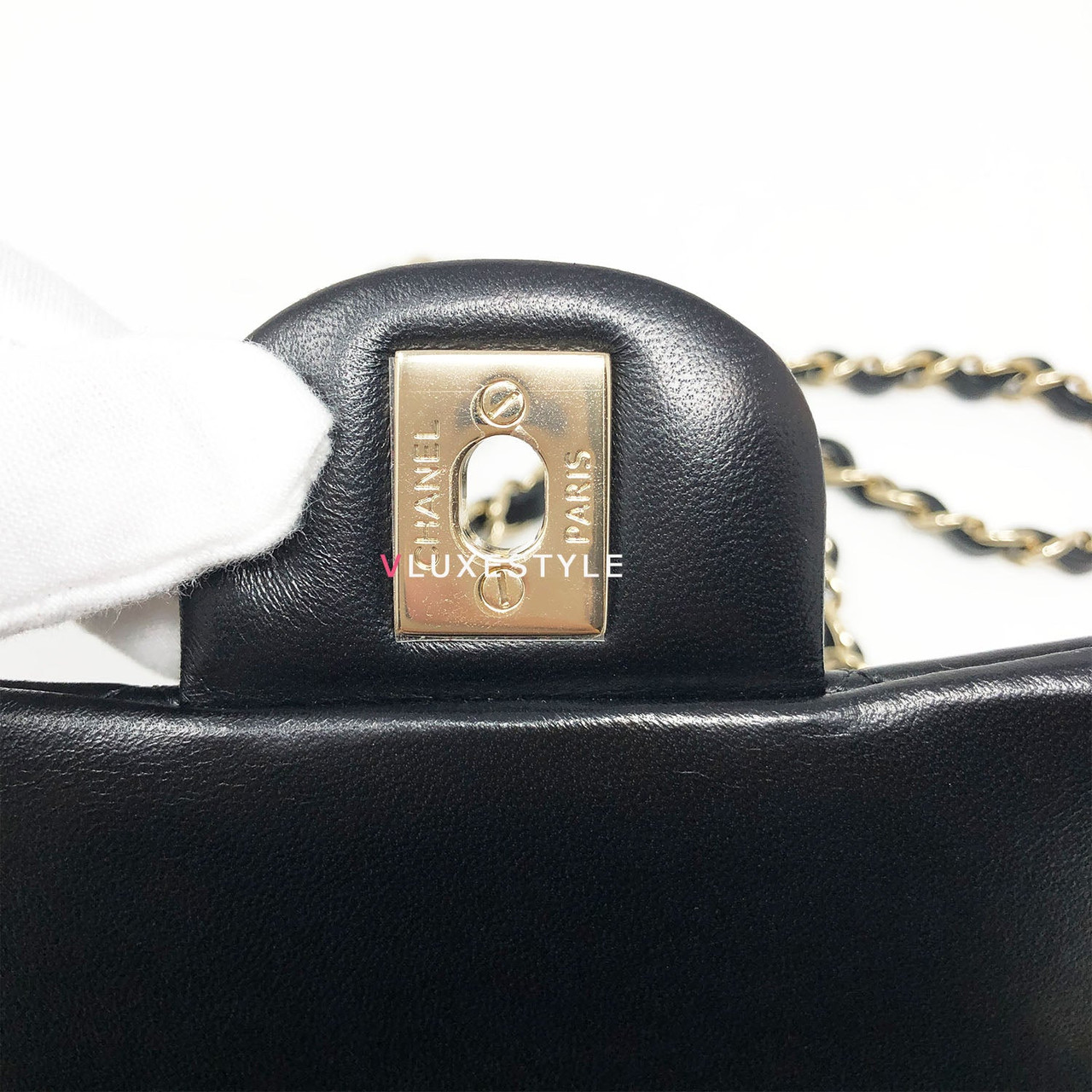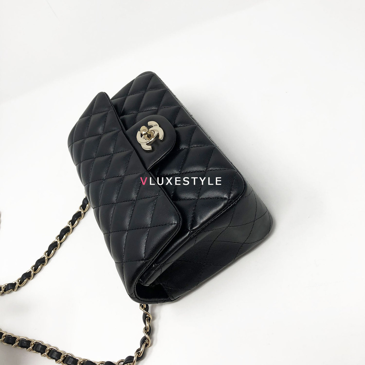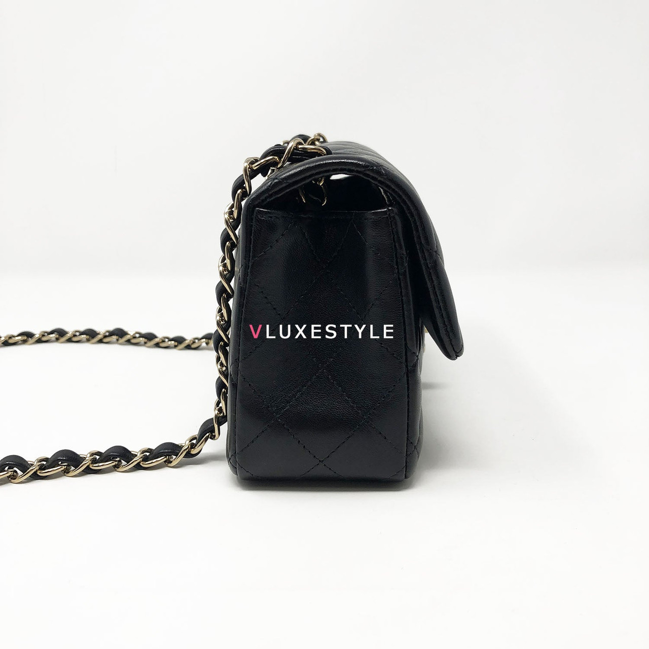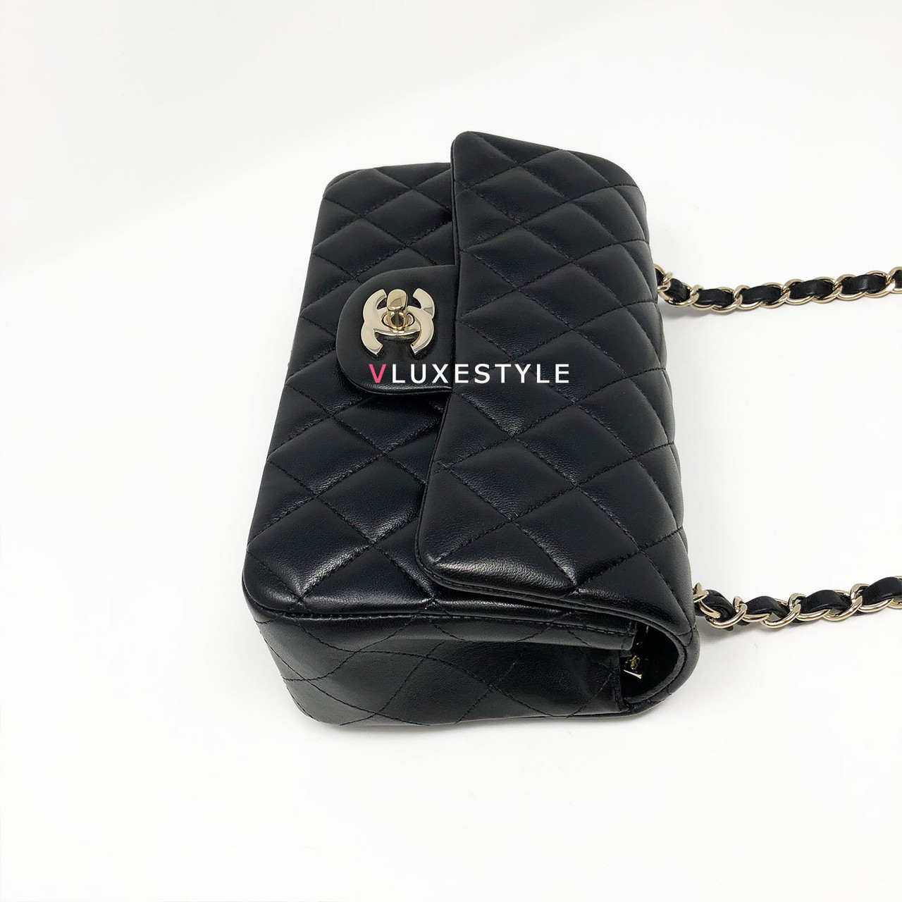 Rare and gorgeous! Chanel 16B Classic Mini Rectangular Black Quilted Lambskin with light gold hardware This stunning shoulder bag is crafted of luxurious lambskin leather in shiny and puffy jet black with light gold hardware. This mini bag can be worn as a crossbody or over-the-shoulder bag.