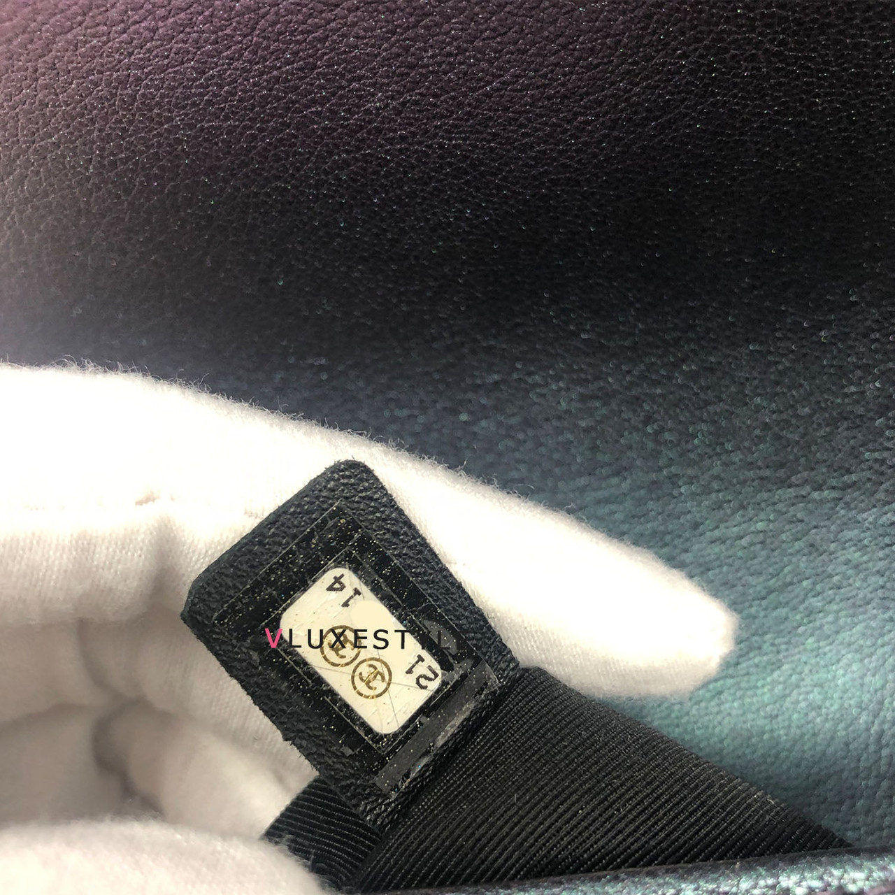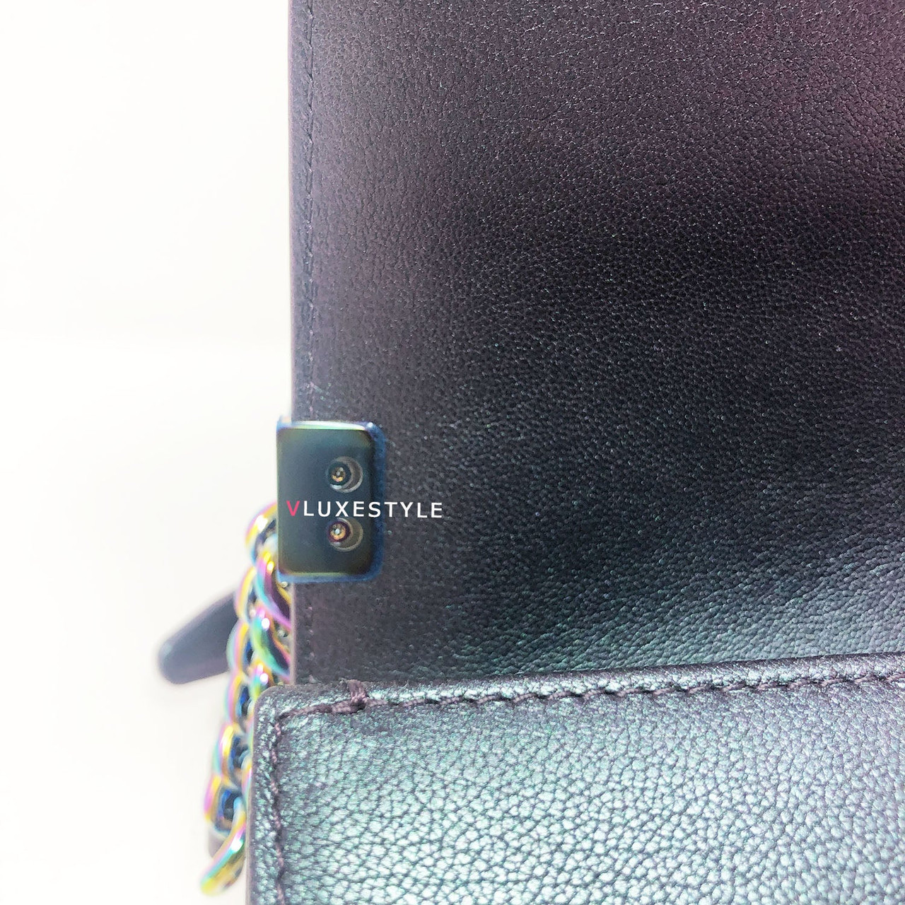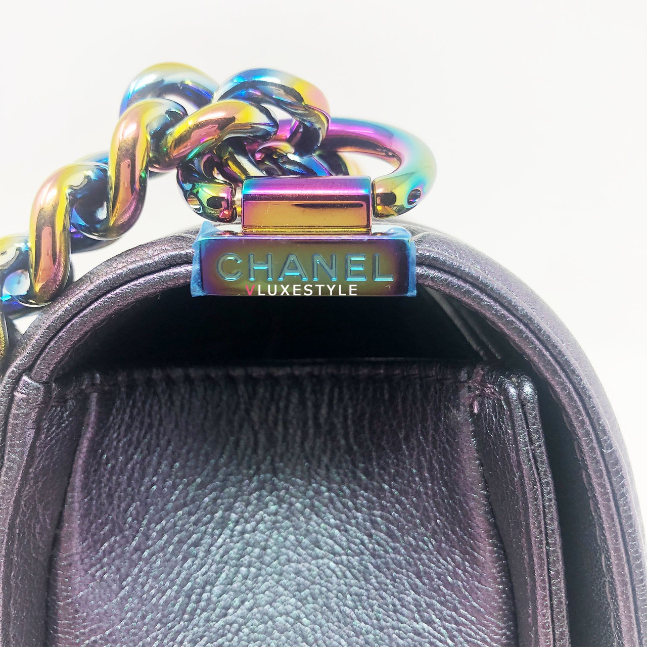 The ultimate unicorn from the 2016 Cruise Collection. The highly sought after Chanel 16C Le Boy Old Medium Purple Iridescent Goatskin Mermaid with rainbow hardware. One of the best iridescent leather released of all time. This stylish shoulder bag is crafted of luxurious and durable quilted goatskin leather in purple iridescent and rainbow hardware. The bag can be worn long and short over-the-shoulder bag and crossbody. It's functional and versatile and features enough interior space to fit in all your essentials. It's the perfect bag for any occasion, wear it as a casual or formal bag.