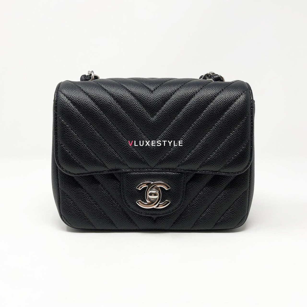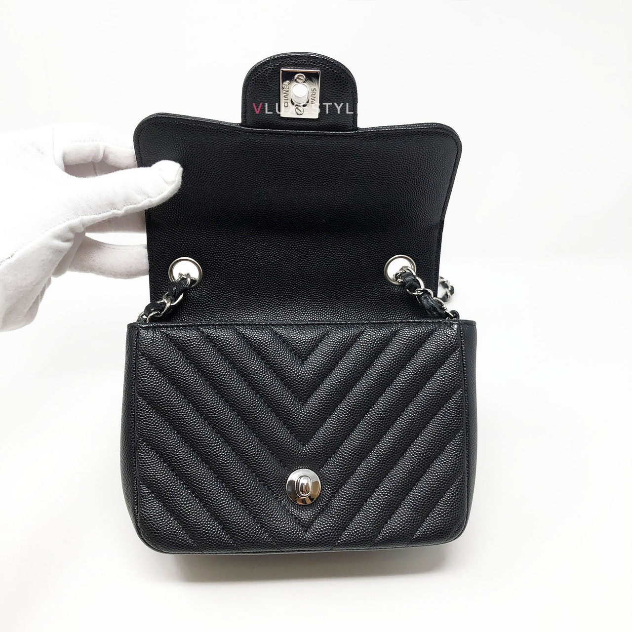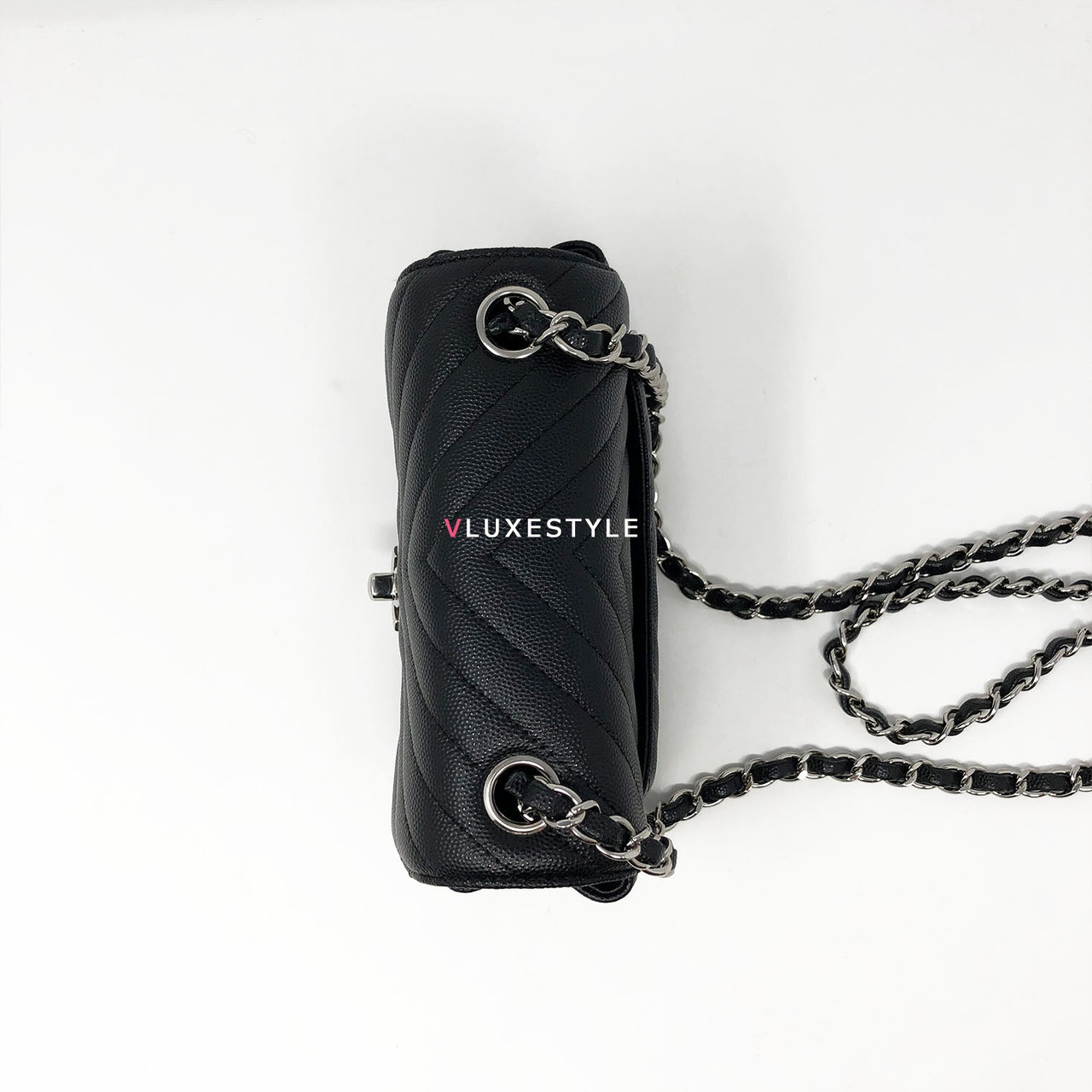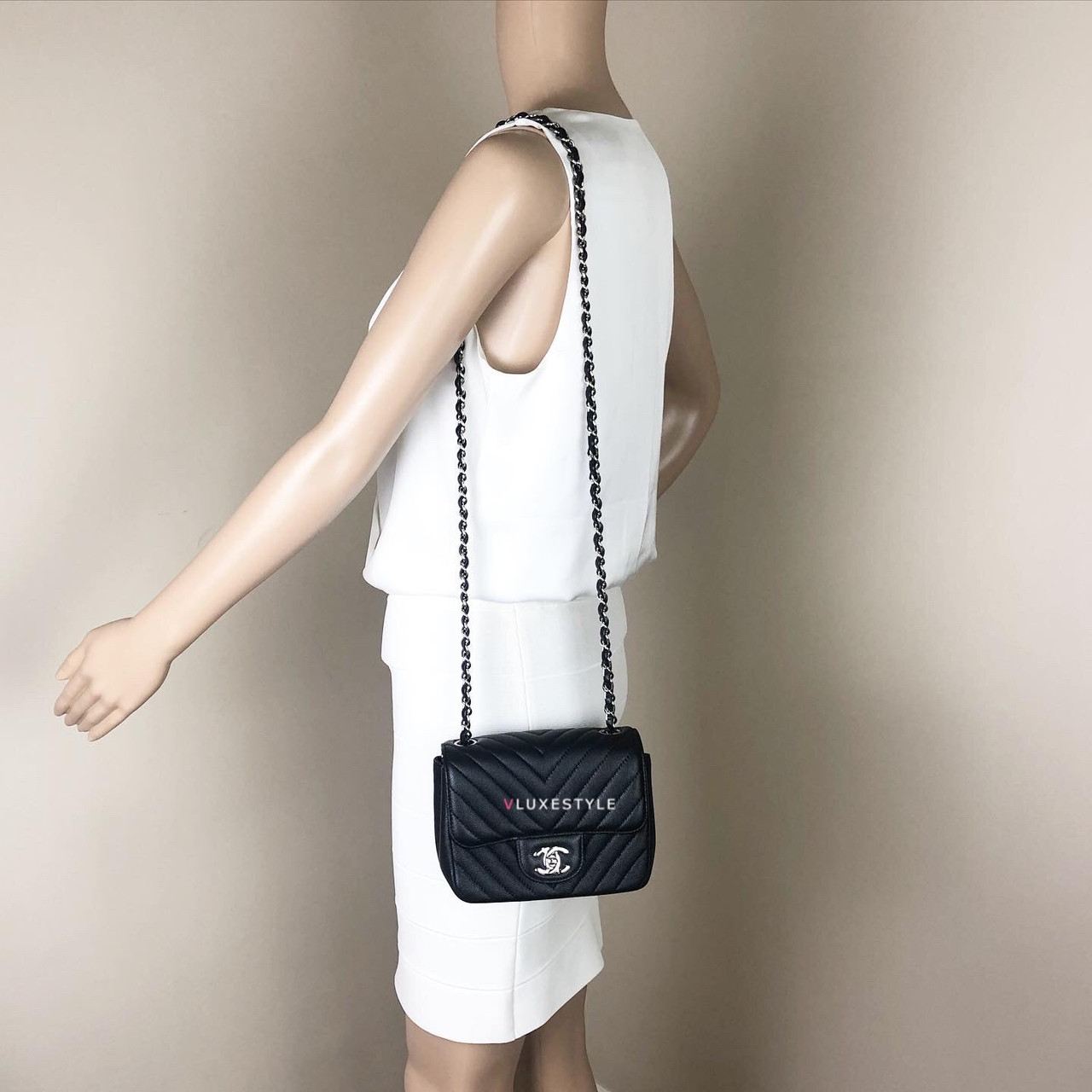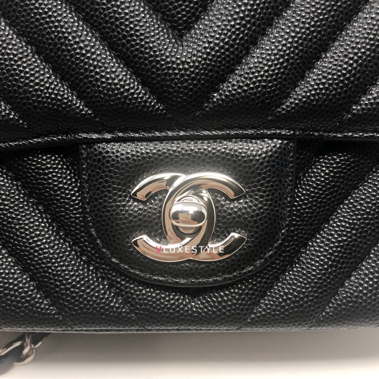 The highly sought-after and very rare to find! Chanel 17S Classic Mini Square Black Chevron Caviar with silver hardware. This stunning shoulder bag is crafted of luxurious and durable caviar leather in gorgeous jet black, perfectly matched with a beautiful chevron pattern and silver hardware.