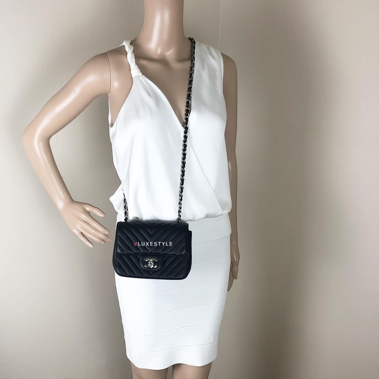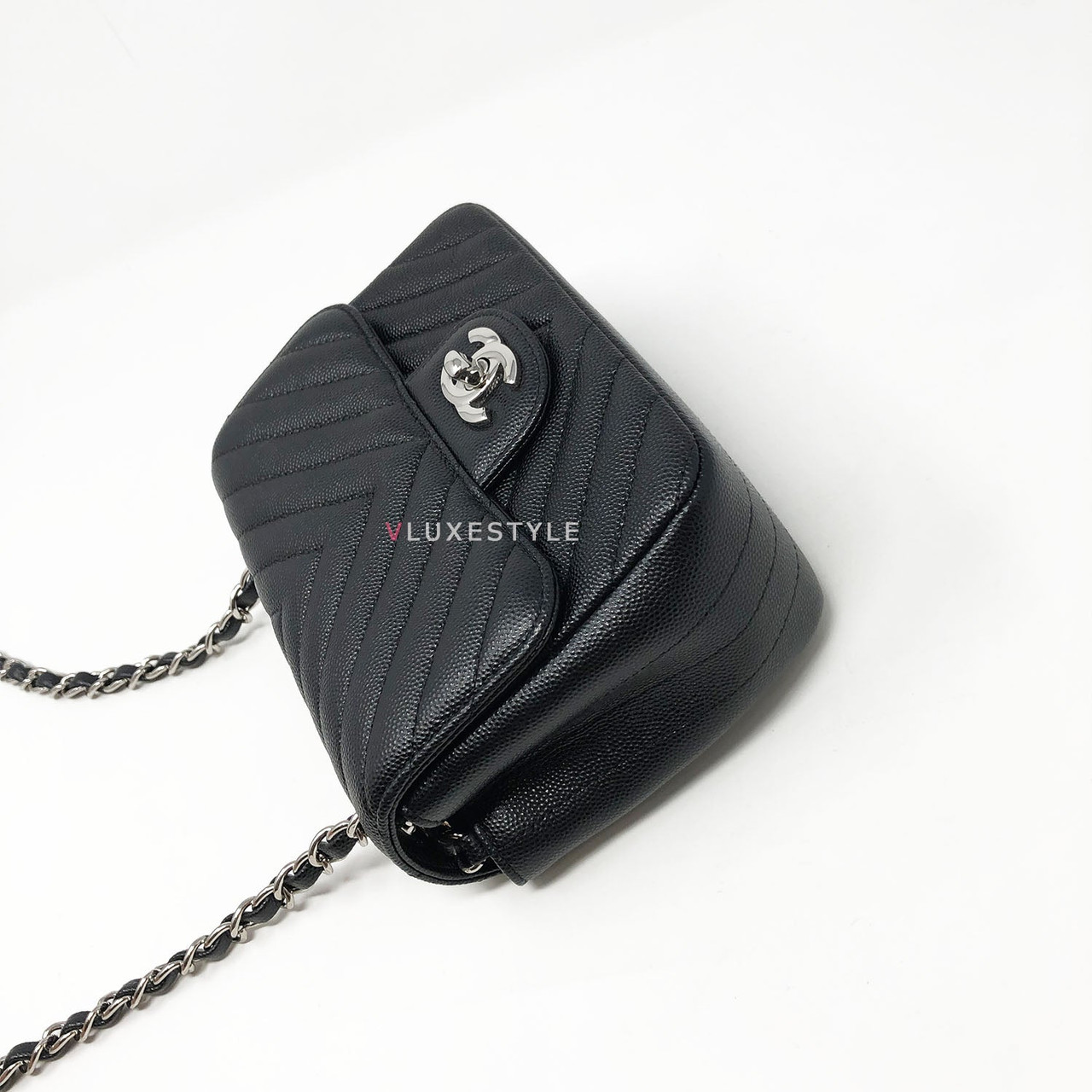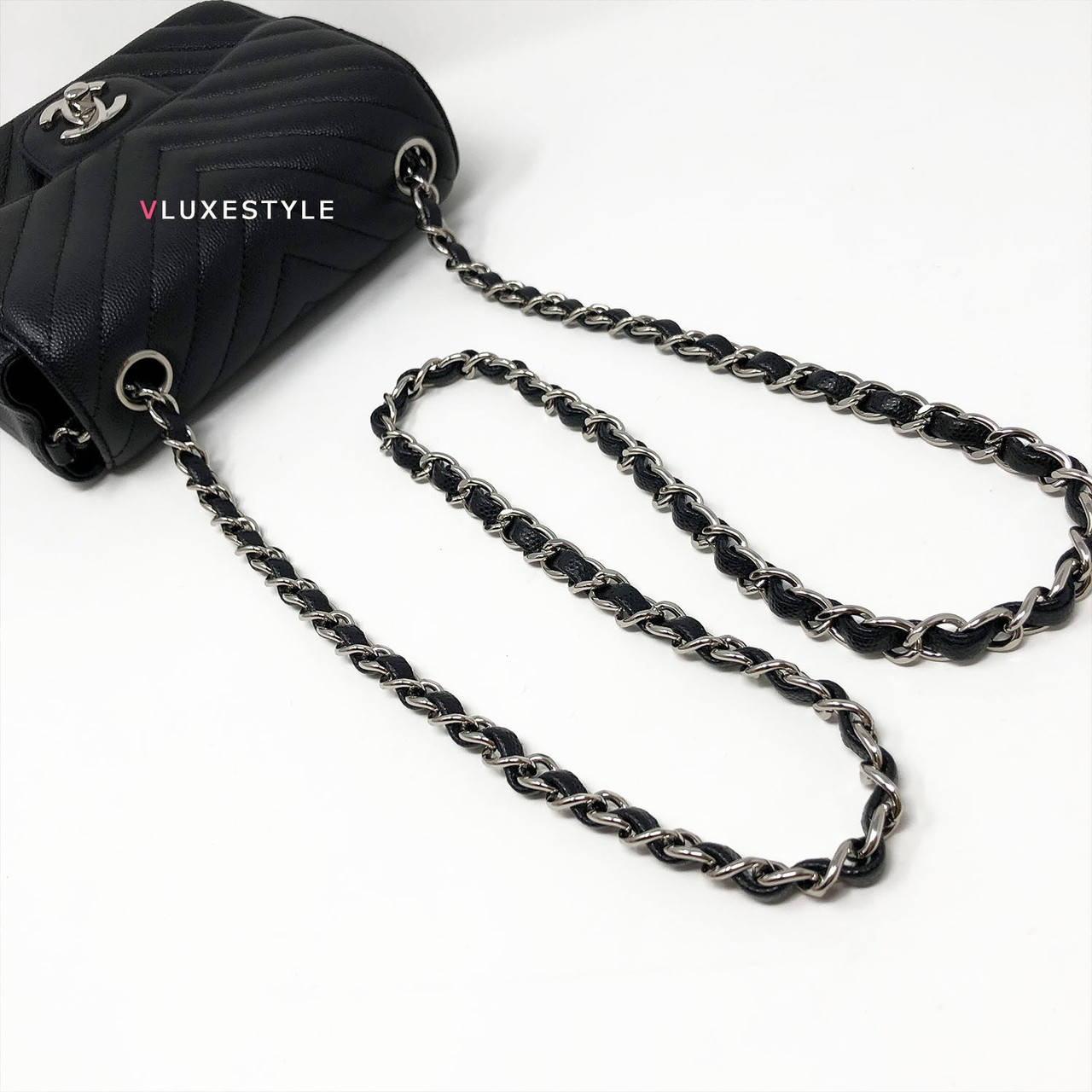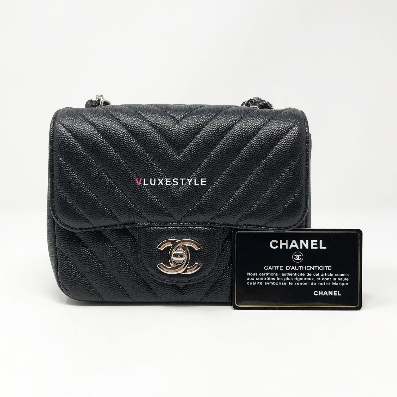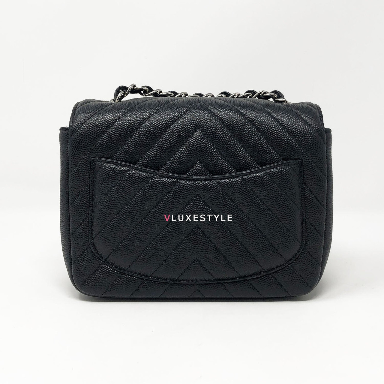 The highly sought-after and very rare to find! Chanel 17S Classic Mini Square Black Chevron Caviar with silver hardware. This stunning shoulder bag is crafted of luxurious and durable caviar leather in gorgeous jet black, perfectly matched with a beautiful chevron pattern and silver hardware.