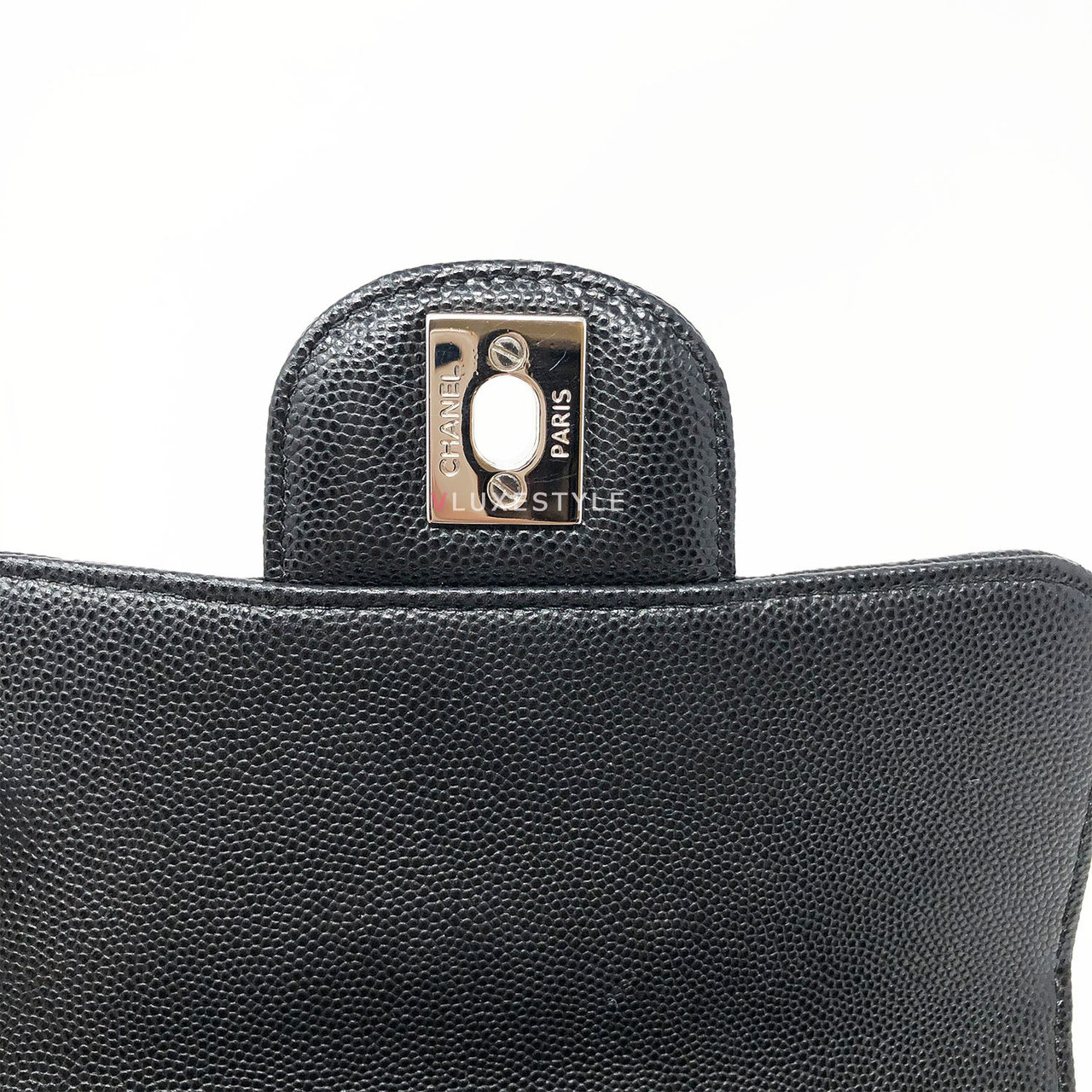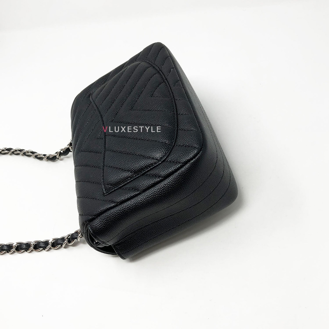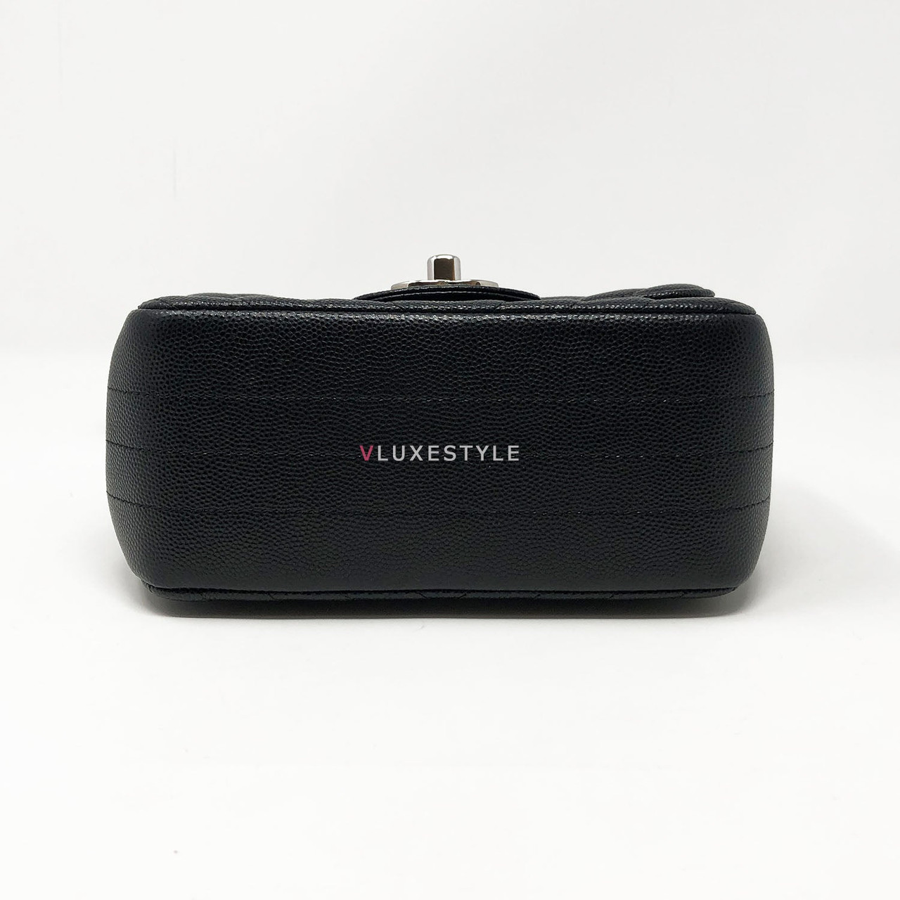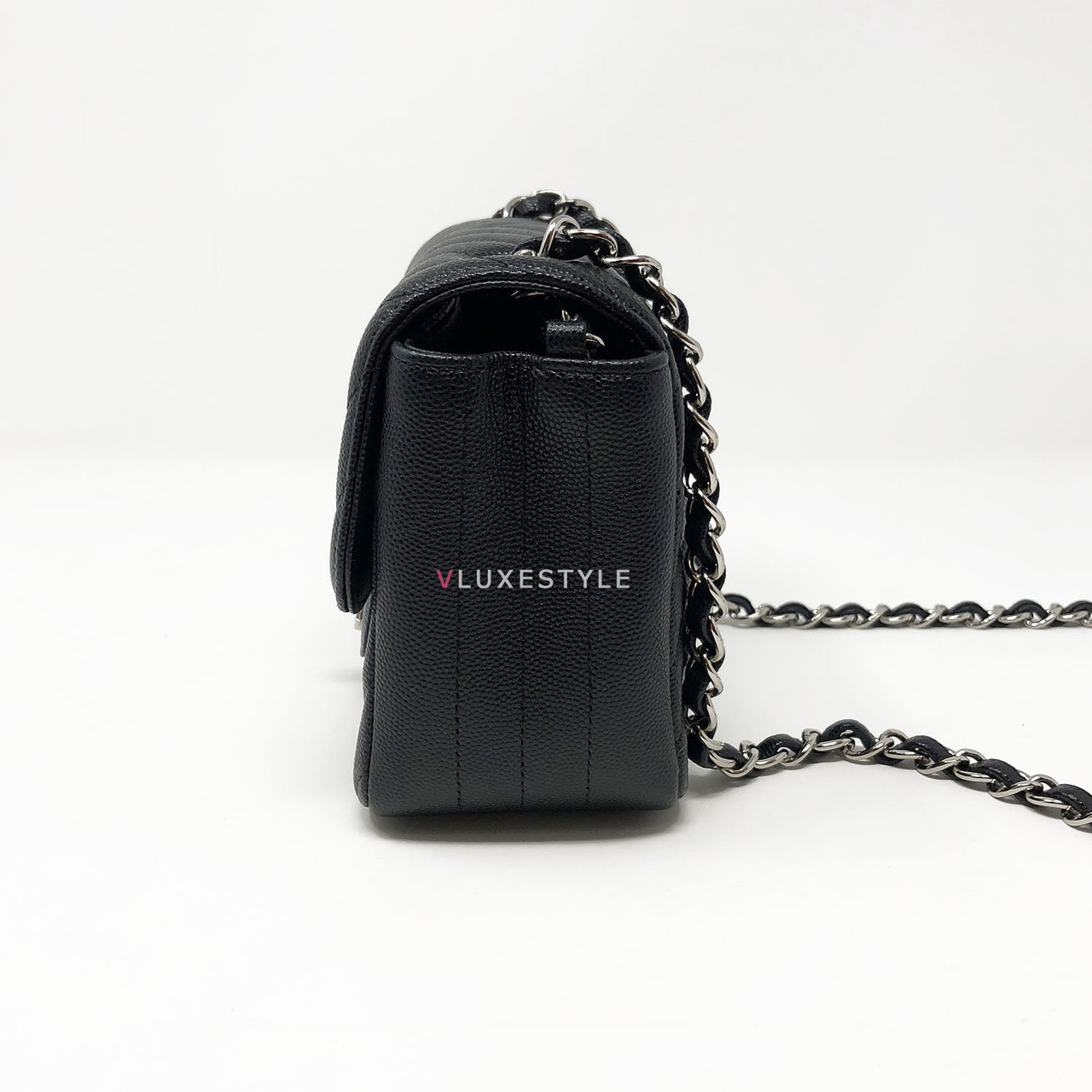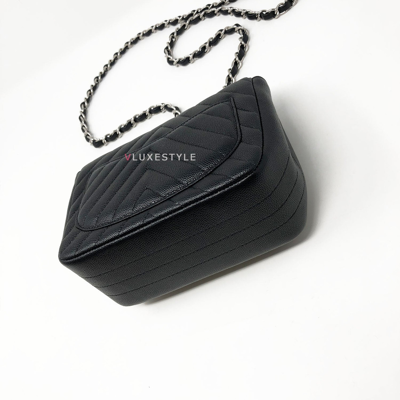 The highly sought-after and very rare to find! Chanel 17S Classic Mini Square Black Chevron Caviar with silver hardware. This stunning shoulder bag is crafted of luxurious and durable caviar leather in gorgeous jet black, perfectly matched with a beautiful chevron pattern and silver hardware.