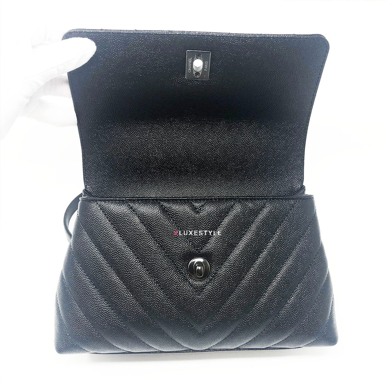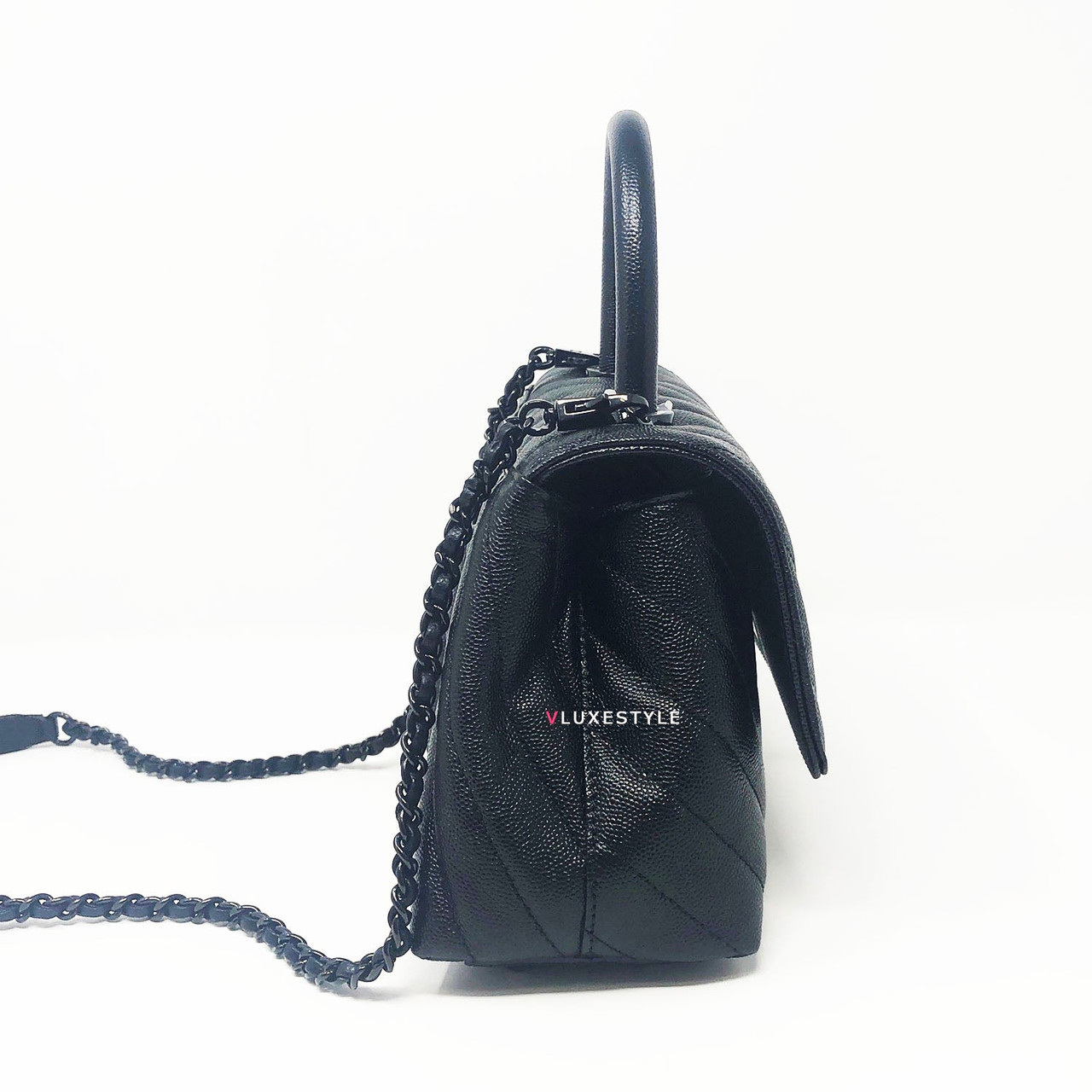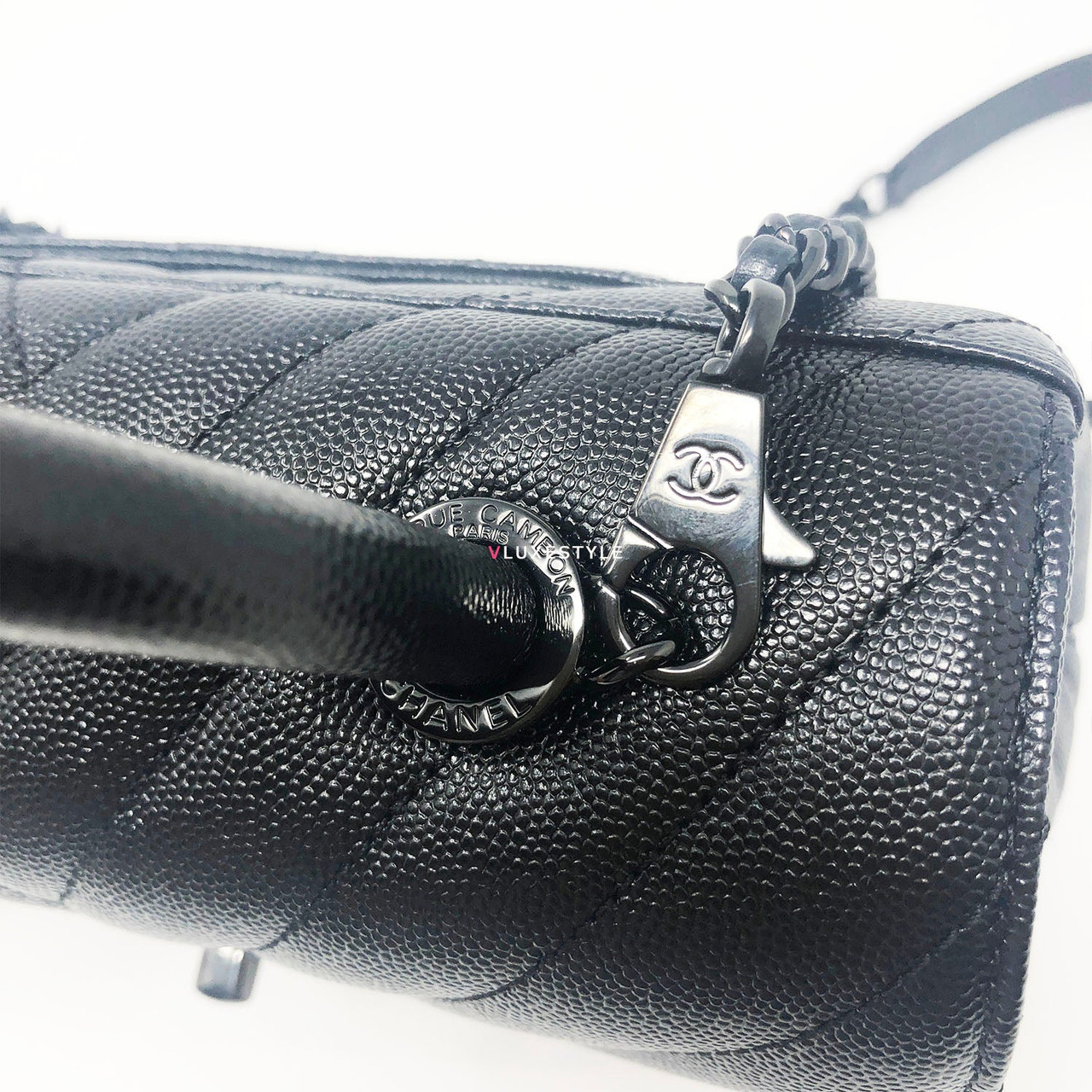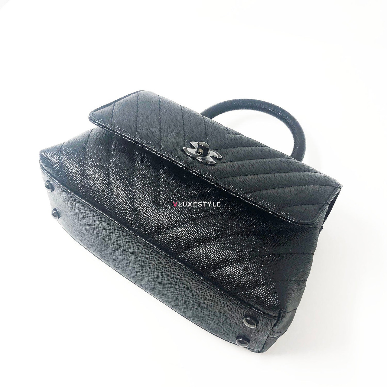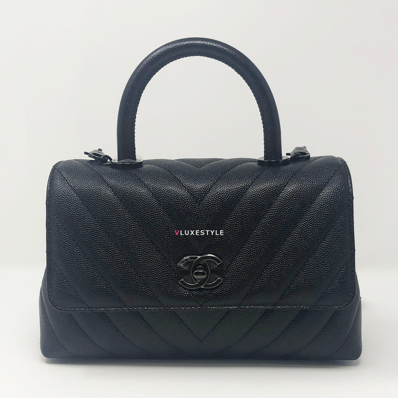 The highly sought after and very hard to find! Sold out when it was released. Brand new Chanel So Black Mini Coco Handle Chevron Caviar with shiny black hardware, from 2018 Pre-fall collection. This shoulder bag features a black leather top handle, shiny black hardware, and removable straps.