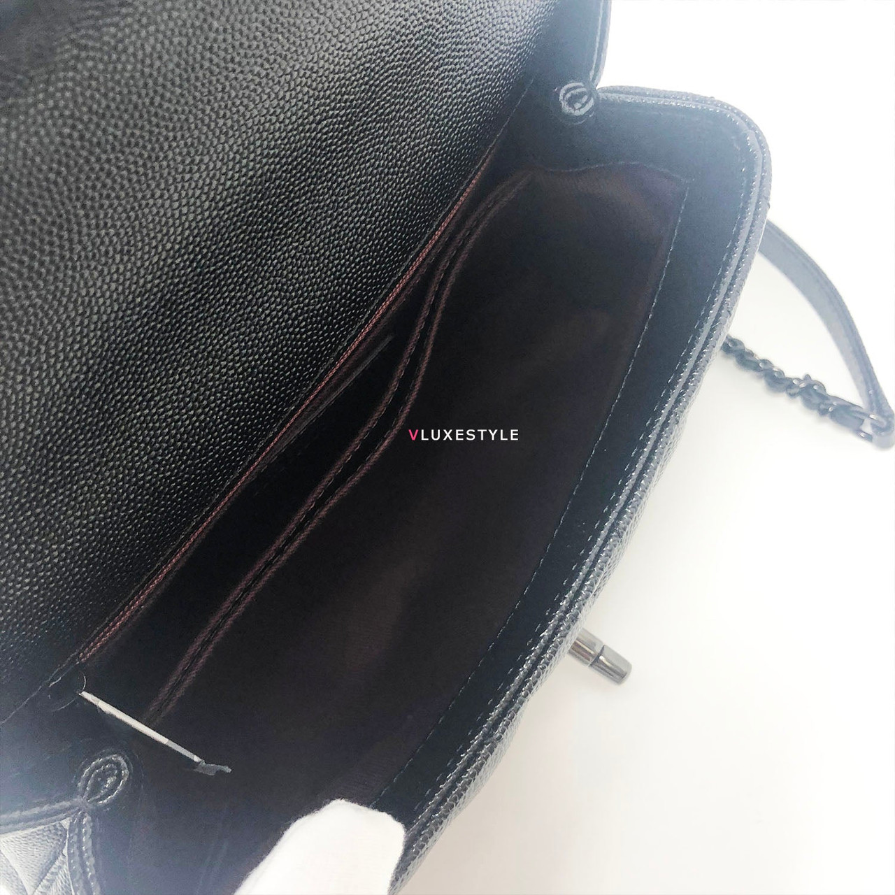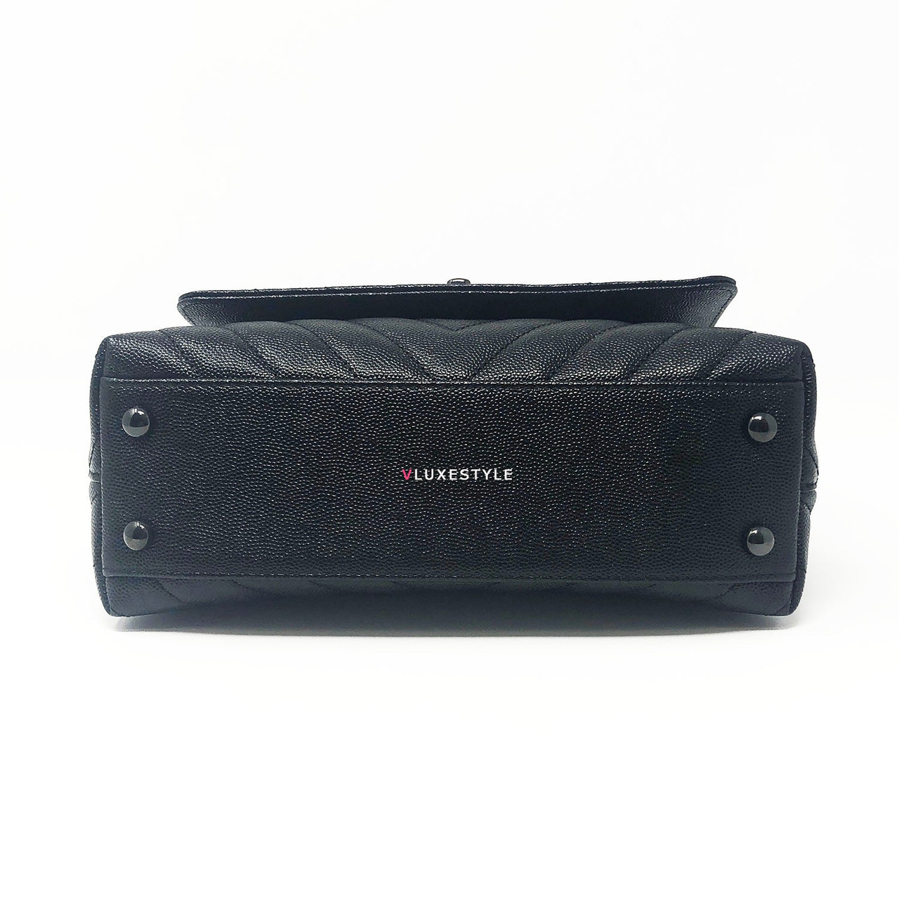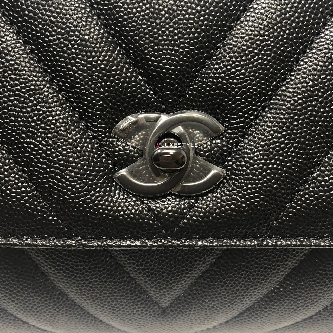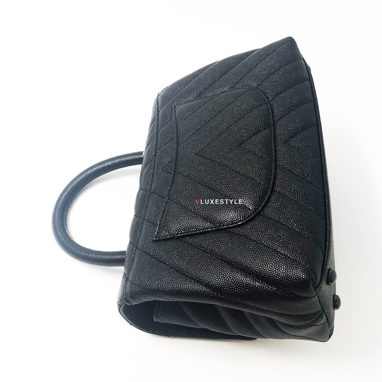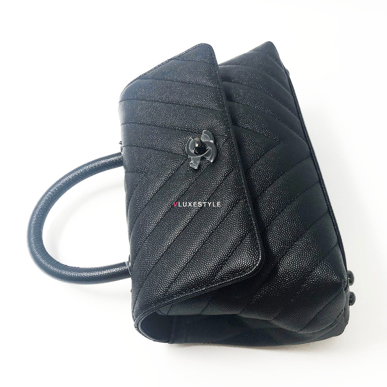 The highly sought after and very hard to find! Sold out when it was released. Brand new Chanel So Black Mini Coco Handle Chevron Caviar with shiny black hardware, from 2018 Pre-fall collection. This shoulder bag features a black leather top handle, shiny black hardware, and removable straps.