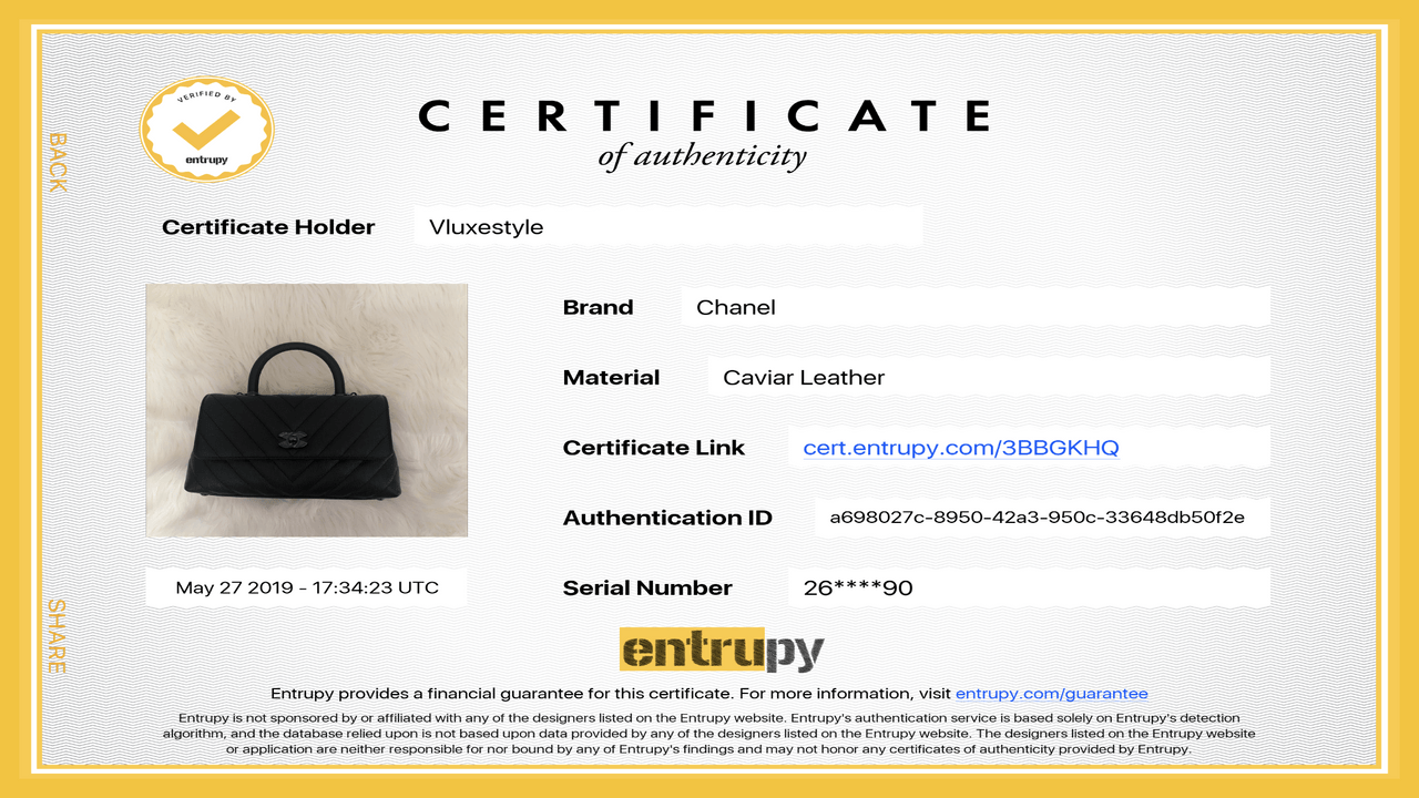 Comes with: Complete set with receipt, protective stickers are intact on CC and all hardware, authenticity card, receipt, dust bag, care booklet, felt, camellia, lace, and box with additional Entrupy Authenticity Certificate.
