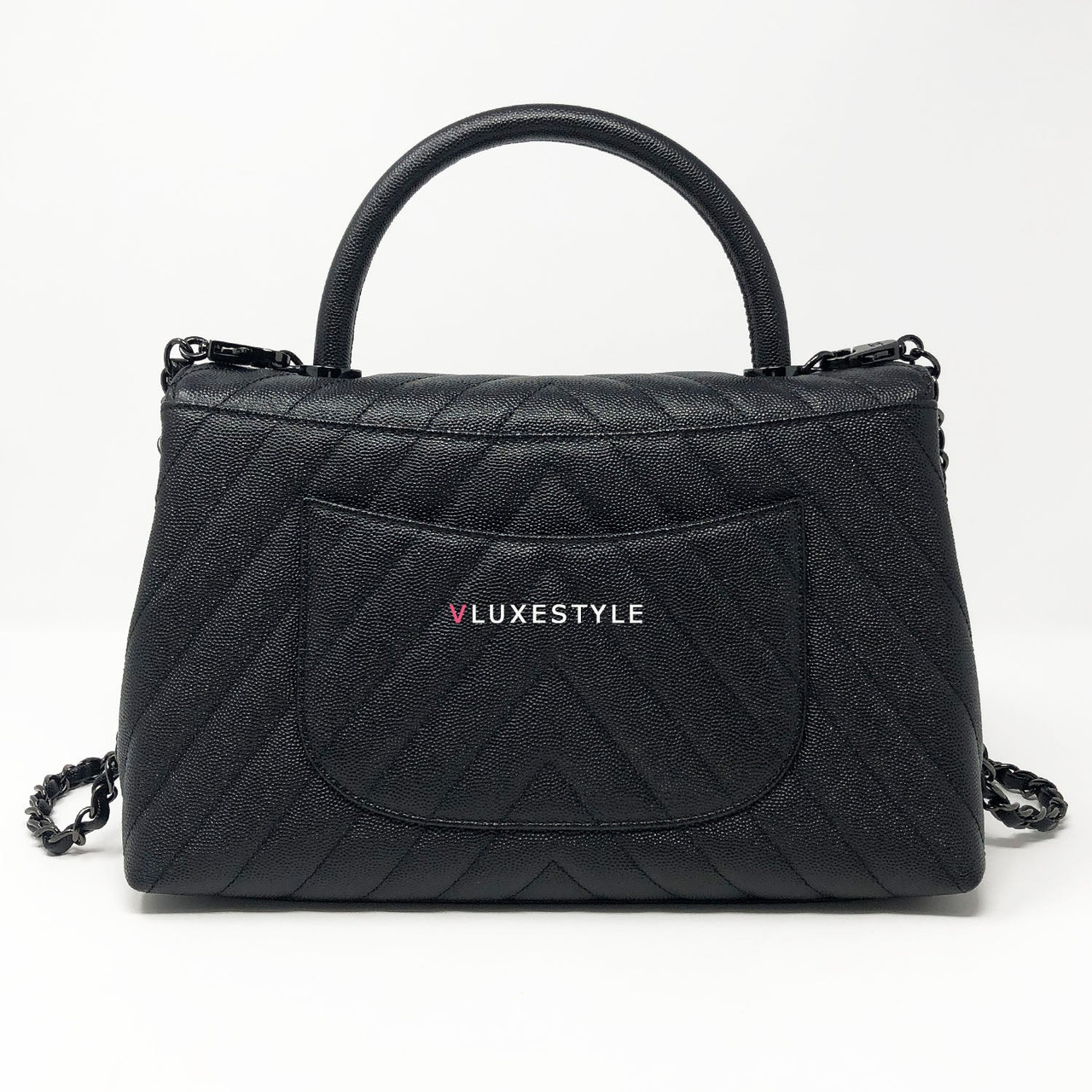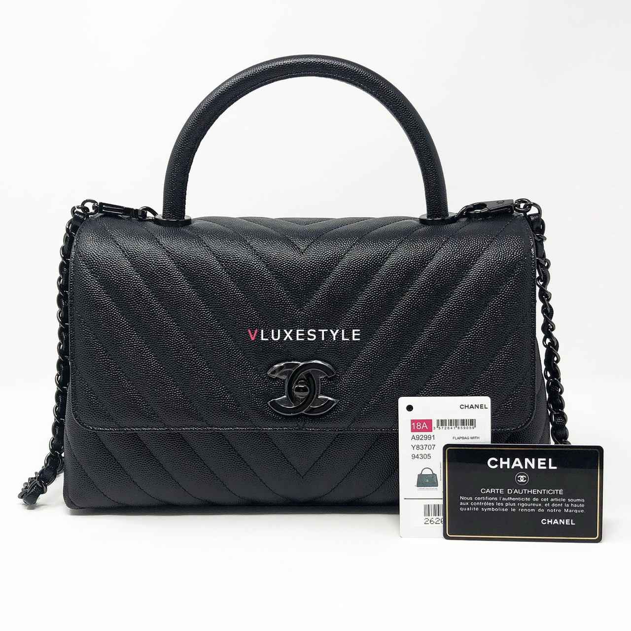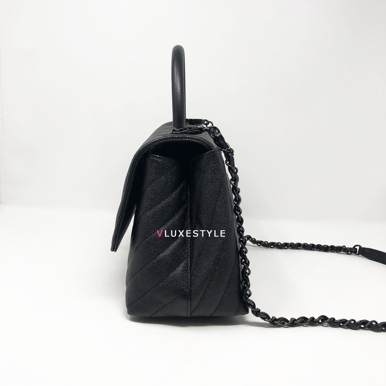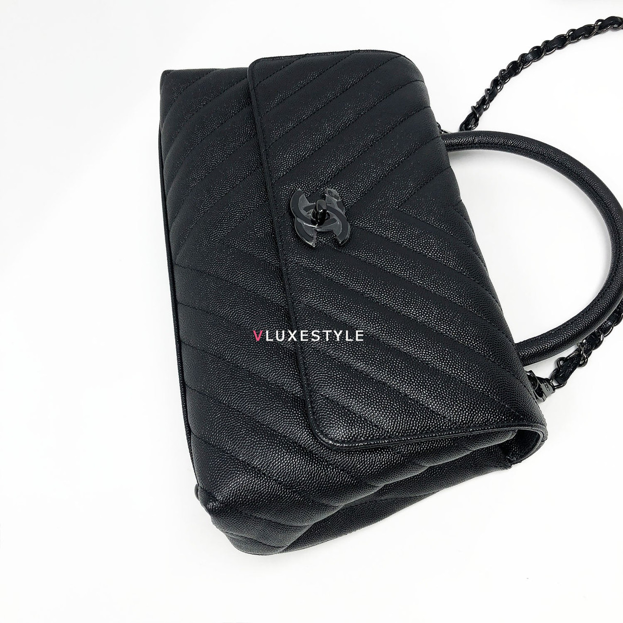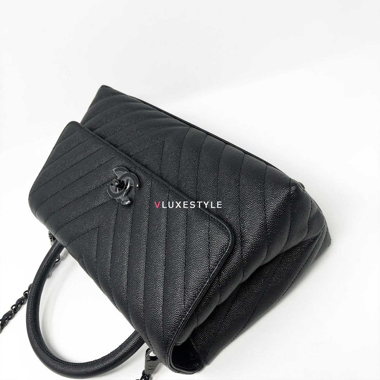The highly sought after and very hard to find! Sold out when it was released. Chanel So Black Small Coco Handle Chevron Caviar with shiny black hardware, from 2018 Pre-fall collection. The most coveted and rare combination of leather and hardware and its only limited availability in certain seasons. This shoulder bag features a black leather top handle, shiny black hardware, and removable straps. Wear this bag handheld or over-the-shoulder.