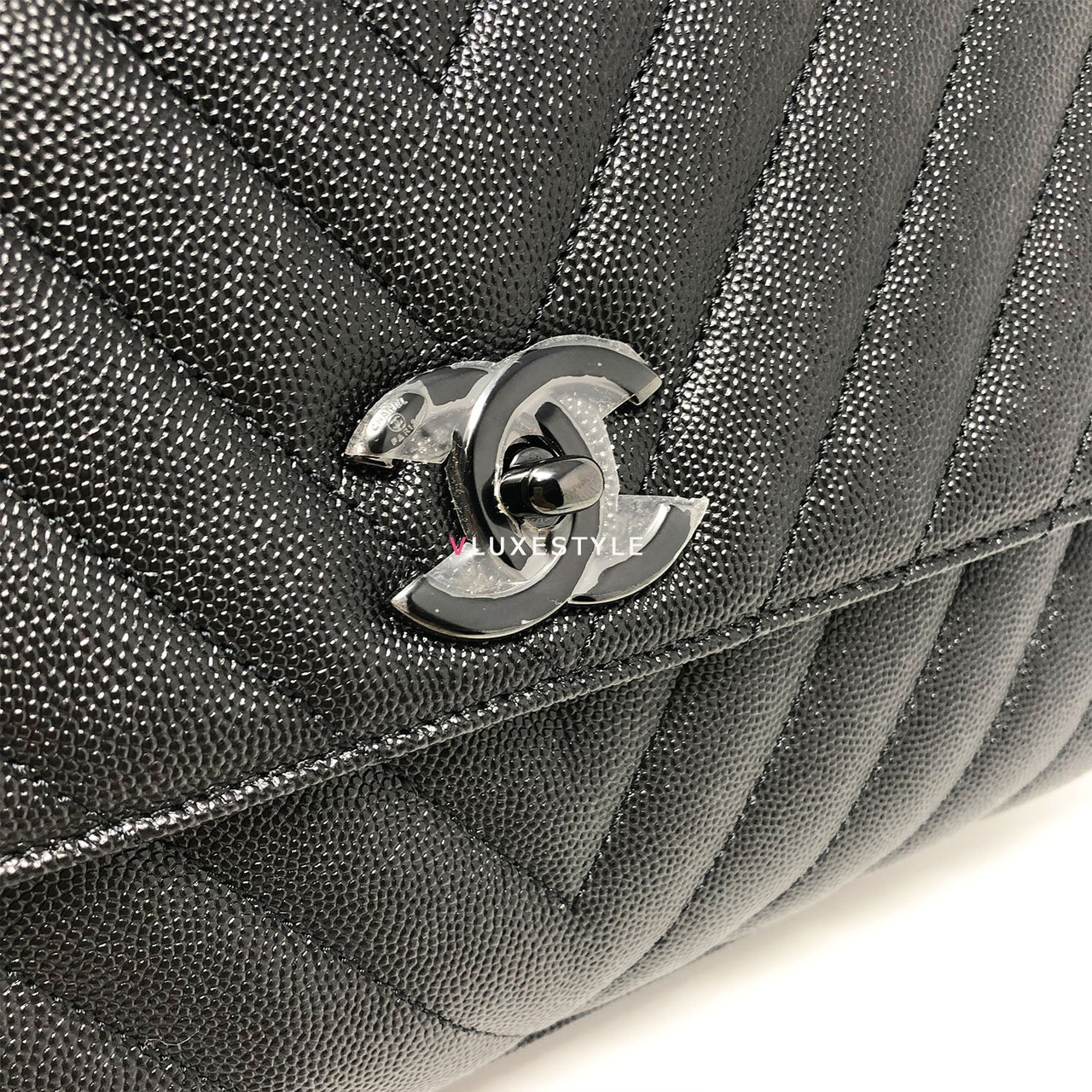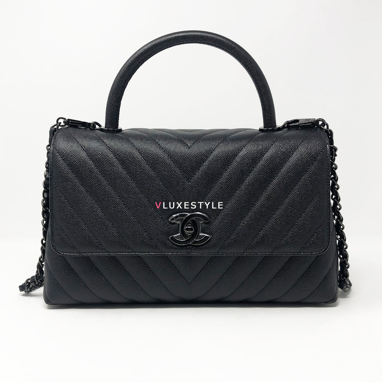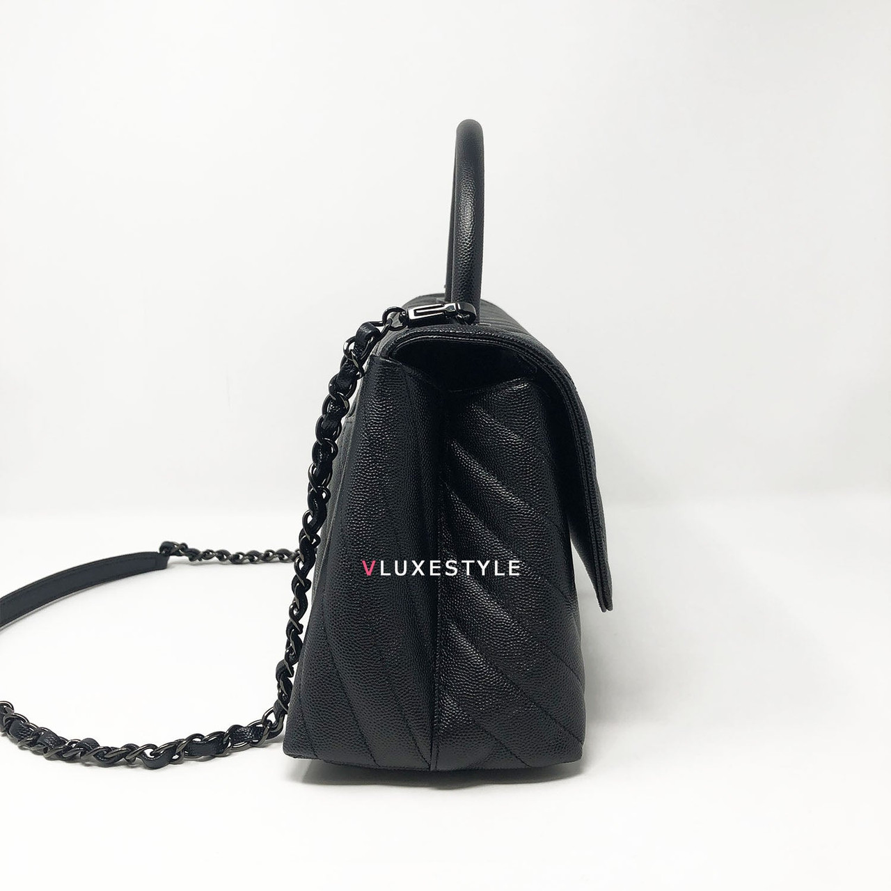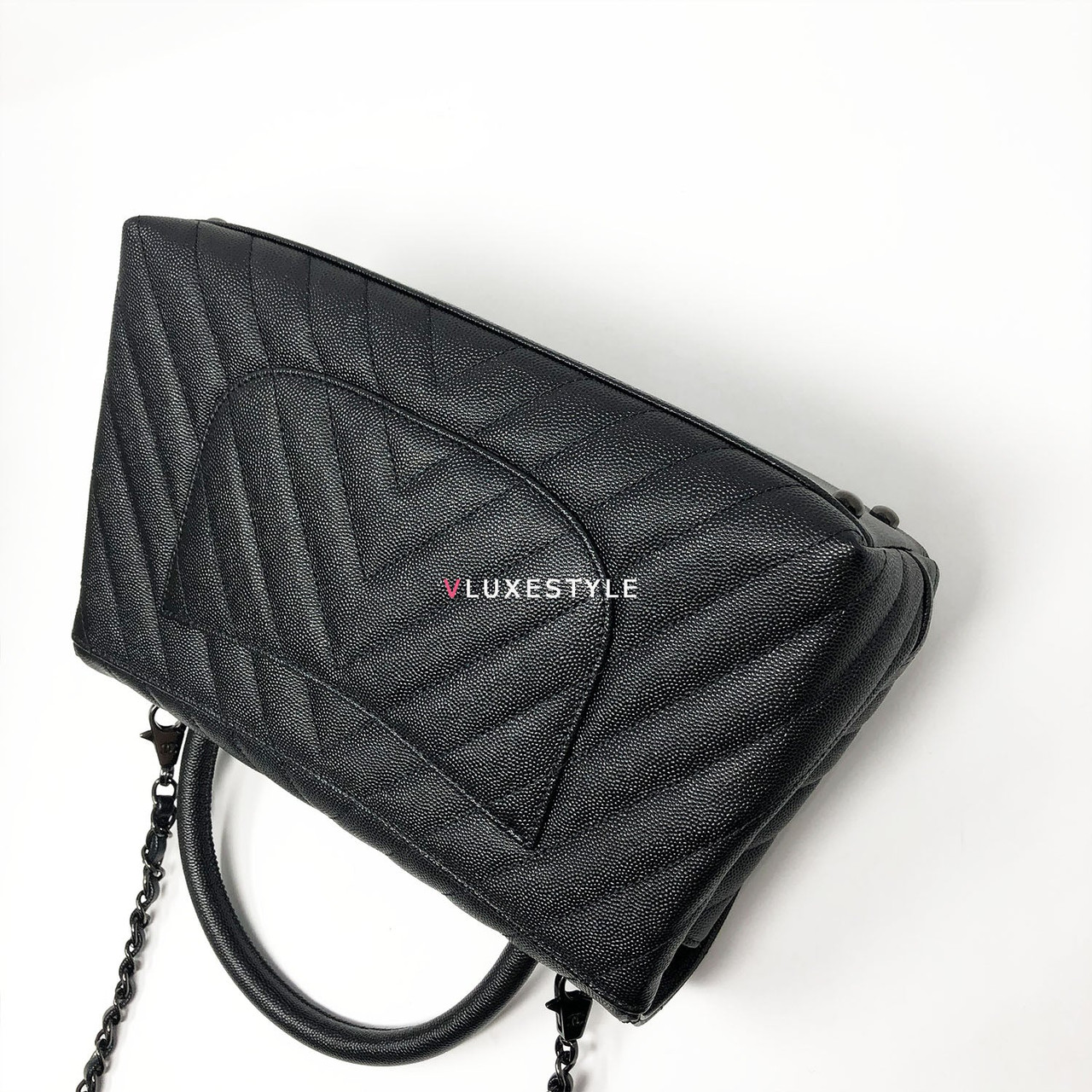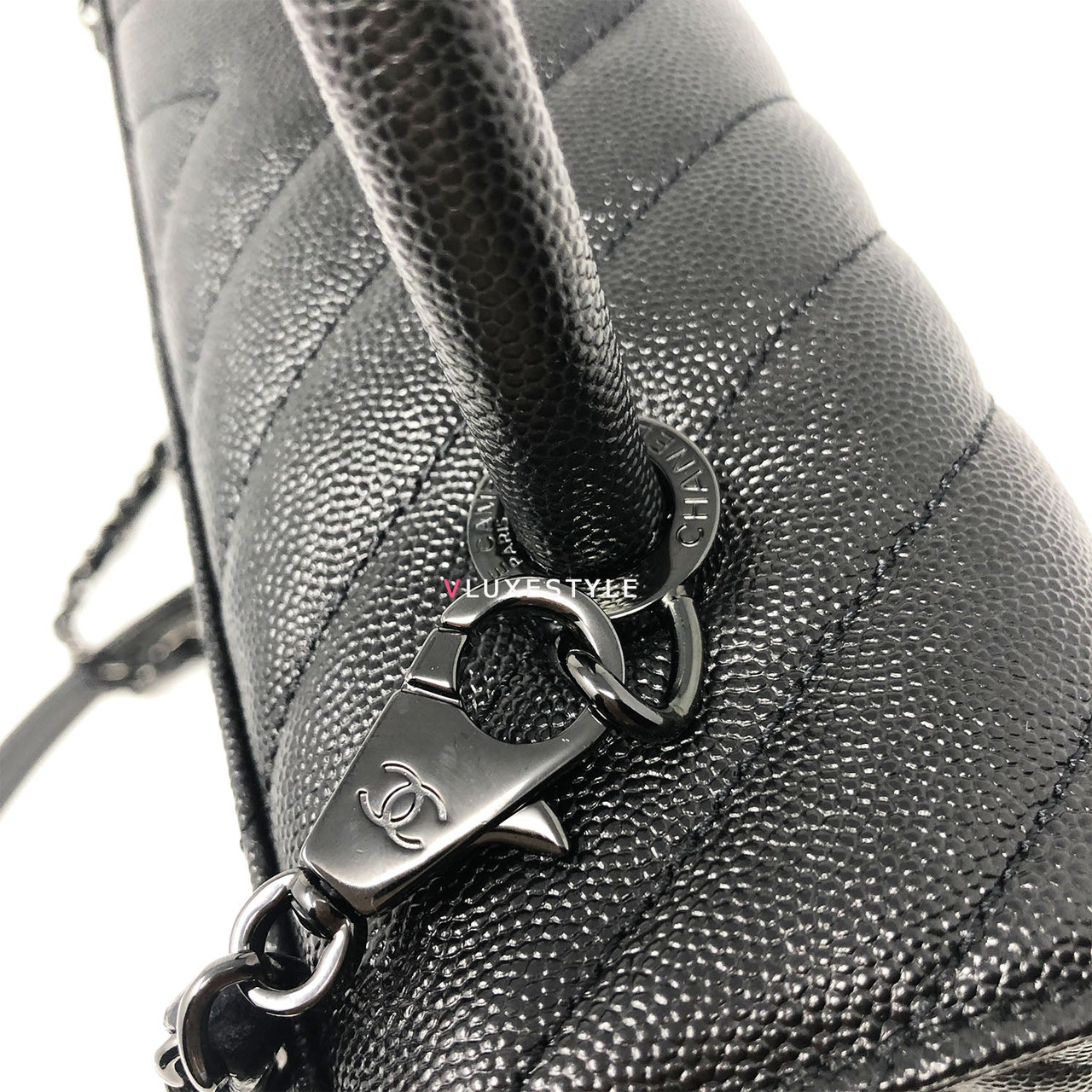 The highly sought after and very hard to find! Sold out when it was released. Chanel So Black Small Coco Handle Chevron Caviar with shiny black hardware, from 2018 Pre-fall collection. The most coveted and rare combination of leather and hardware and its only limited availability in certain seasons. This shoulder bag features a black leather top handle, shiny black hardware, and removable straps. Wear this bag handheld or over-the-shoulder.