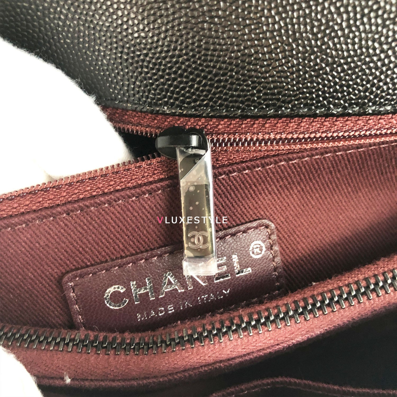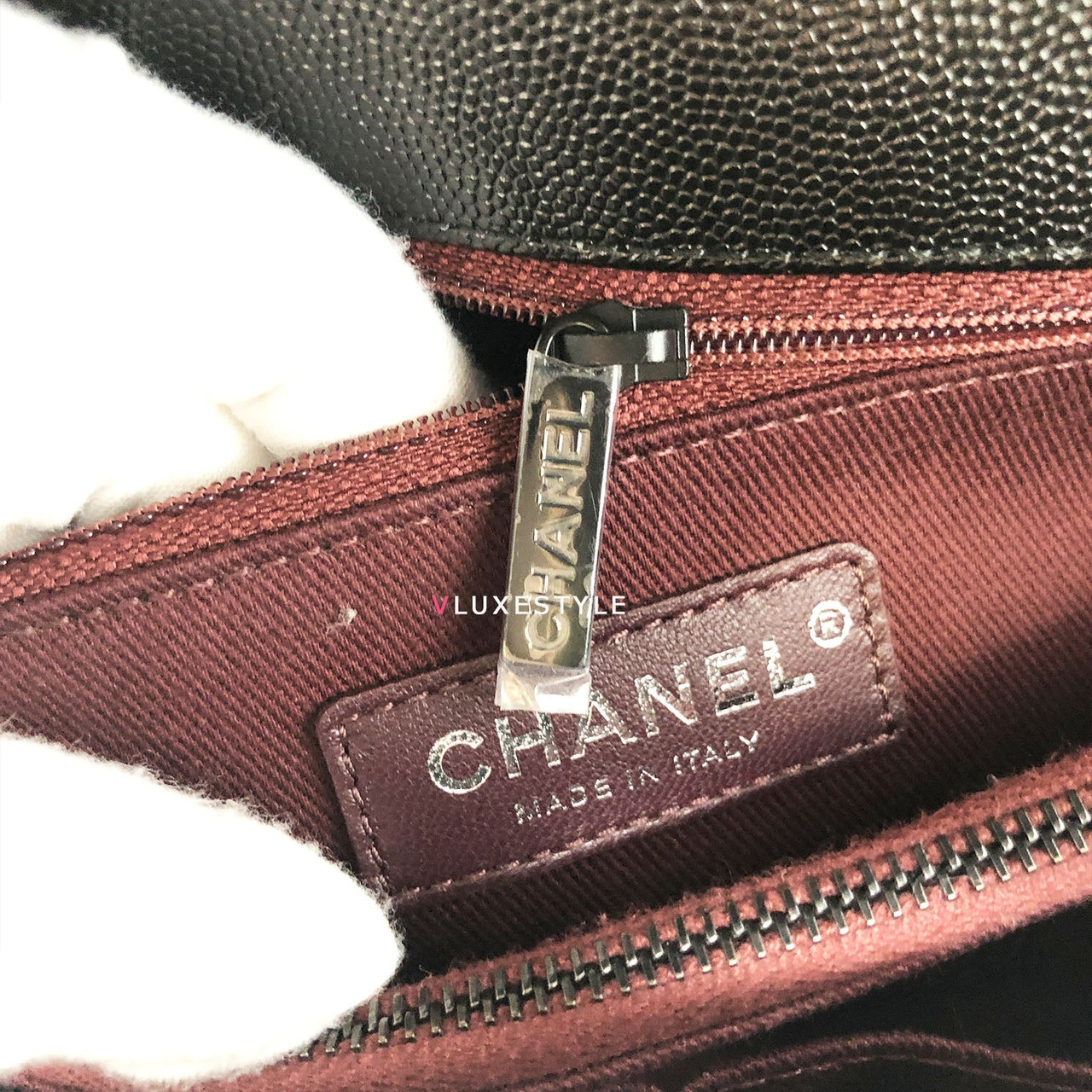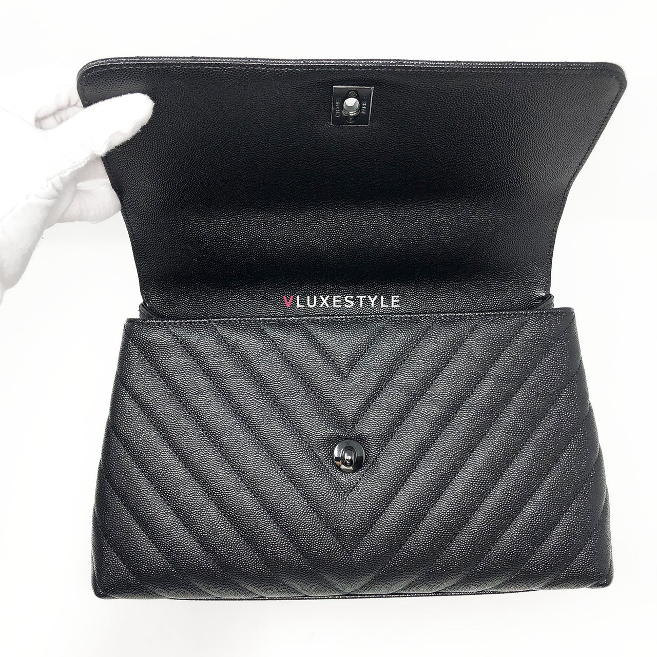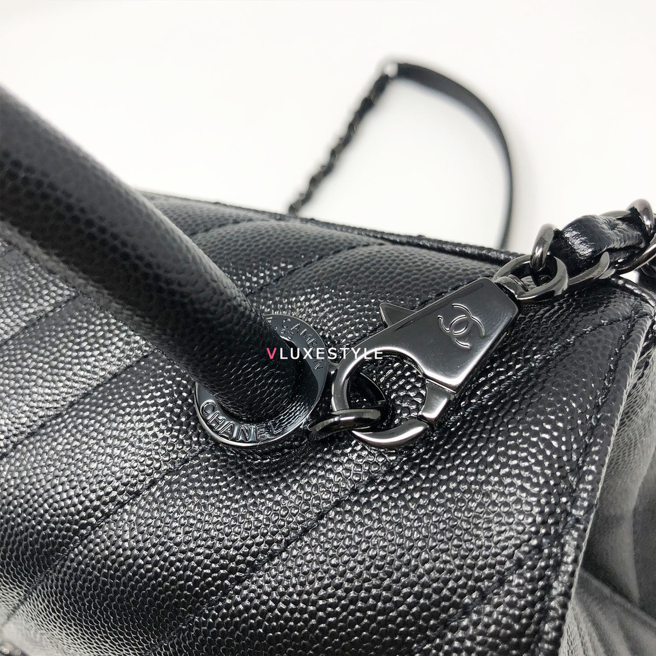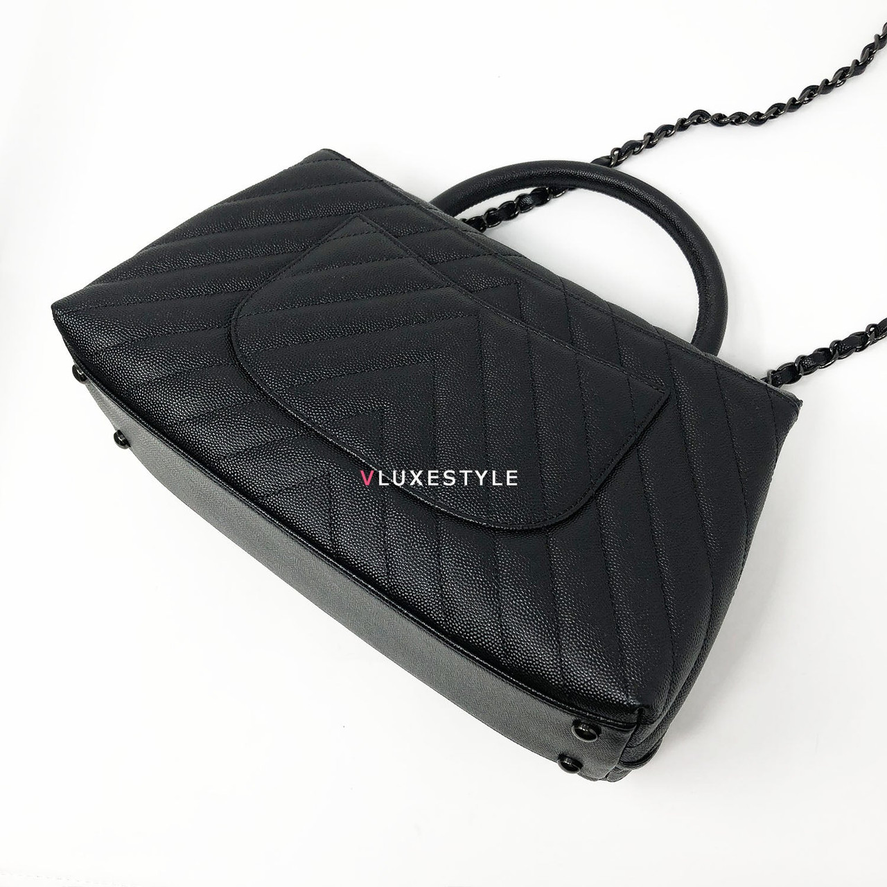 The highly sought after and very hard to find! Sold out when it was released. Chanel So Black Small Coco Handle Chevron Caviar with shiny black hardware, from 2018 Pre-fall collection. The most coveted and rare combination of leather and hardware and its only limited availability in certain seasons. This shoulder bag features a black leather top handle, shiny black hardware, and removable straps. Wear this bag handheld or over-the-shoulder.