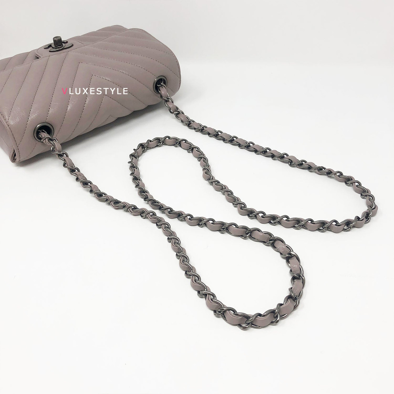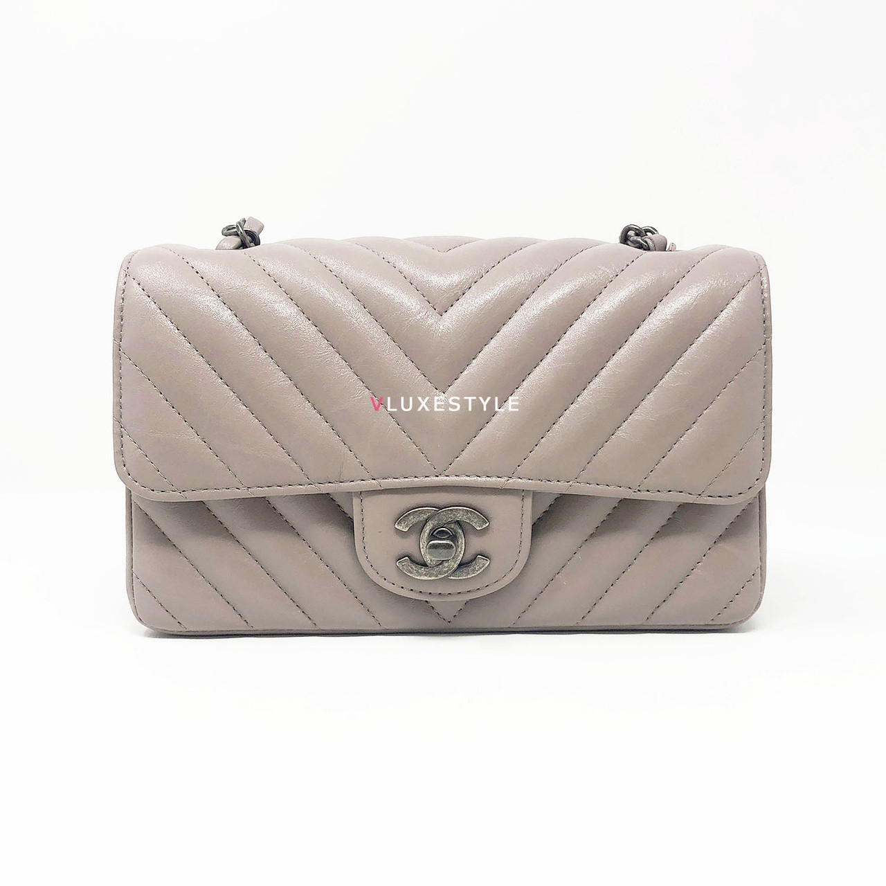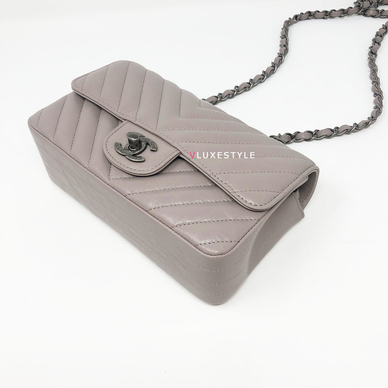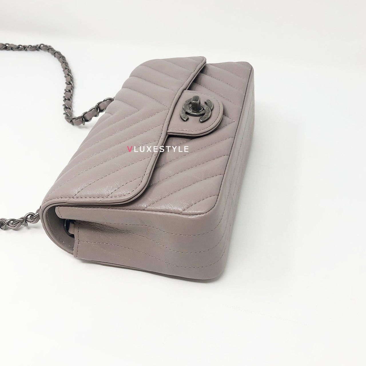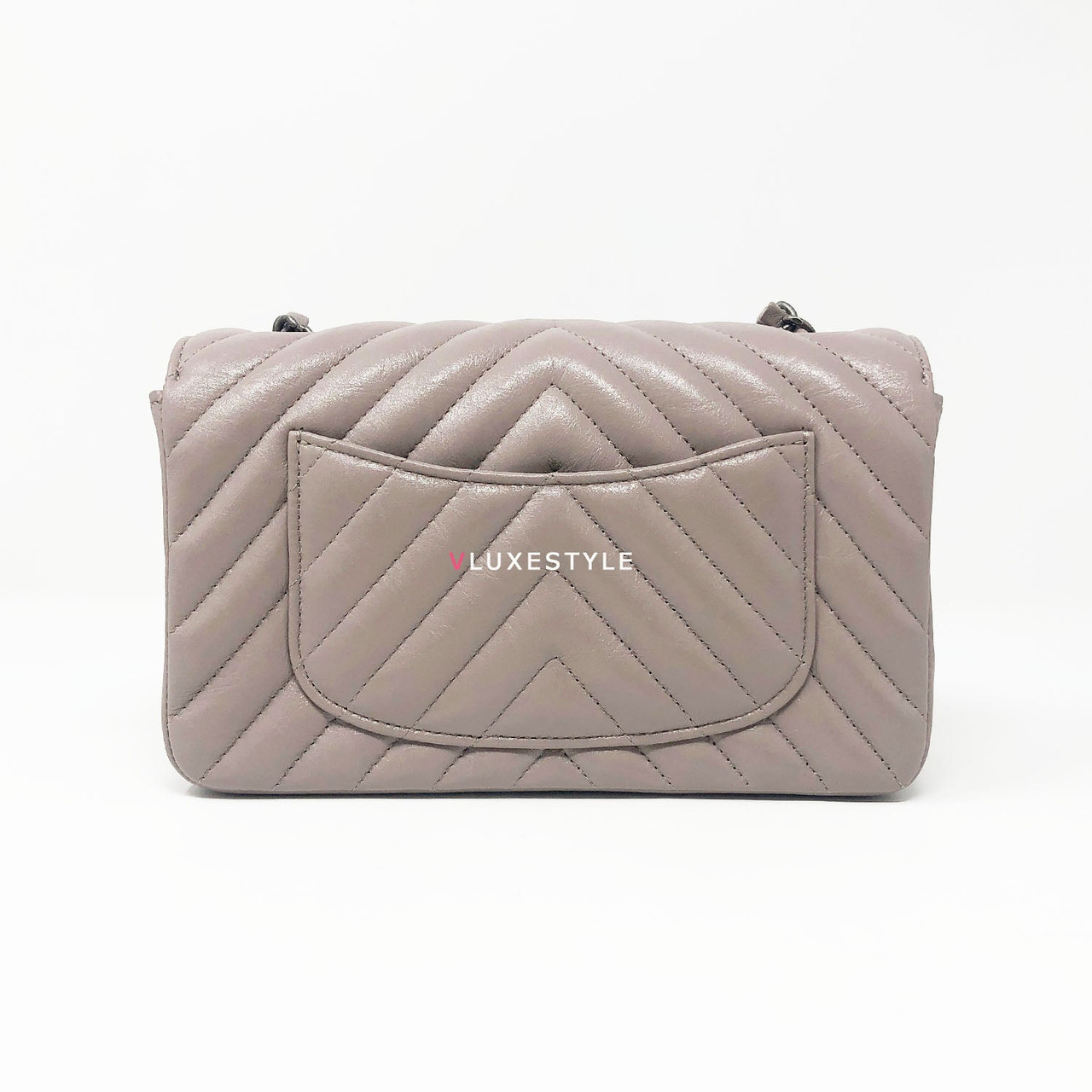 Rare find! The highly sought-after Authentic Chanel 18B Mini Rectangular Glazed Taupe Chevron Calfskin with Ruthenium hardware. This mini bag is made of luxurious and durable glazed chevron calfskin leather in gorgeous taupe and ruthenium hardware. The bag can be worn as a crossbody or over-the-shoulder bag. It's the perfect on the go bag as well as a small bag for casual and special occasions. It's the perfect neutral making it extremely versatile and timelessly popular. (Minis are always sold out in stores)