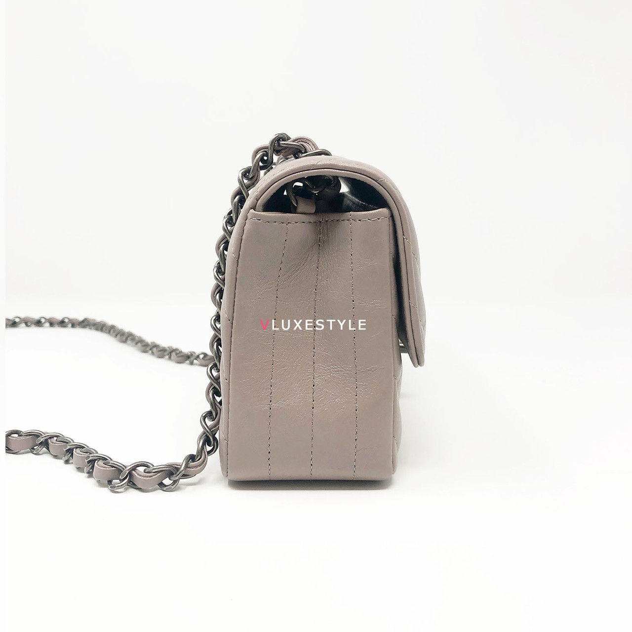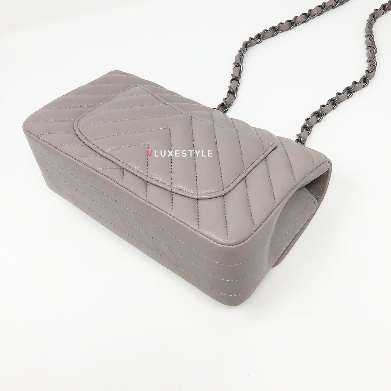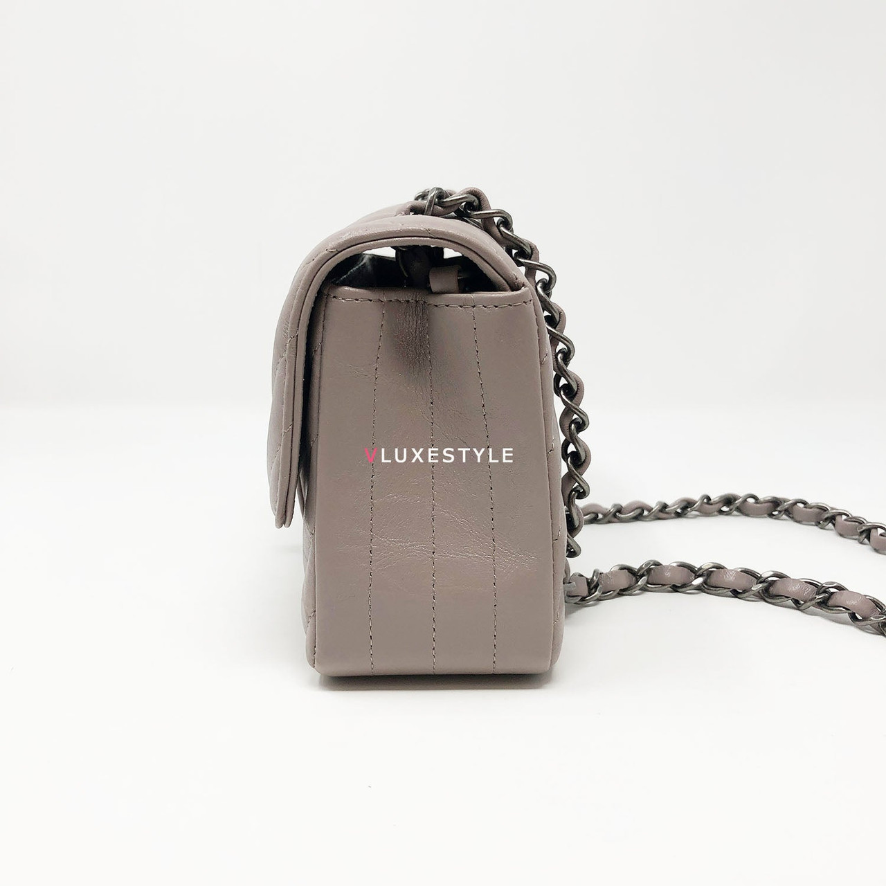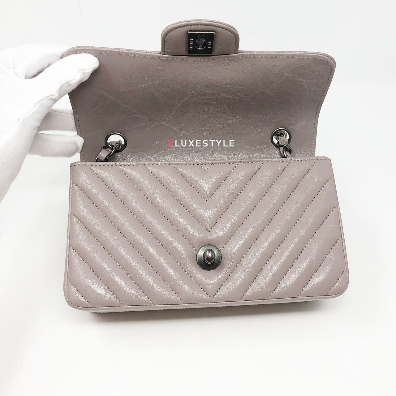 Rare find! The highly sought-after Authentic Chanel 18B Mini Rectangular Glazed Taupe Chevron Calfskin with Ruthenium hardware. This mini bag is made of luxurious and durable glazed chevron calfskin leather in gorgeous taupe and ruthenium hardware. The bag can be worn as a crossbody or over-the-shoulder bag. It's the perfect on the go bag as well as a small bag for casual and special occasions. It's the perfect neutral making it extremely versatile and timelessly popular. (Minis are always sold out in stores)