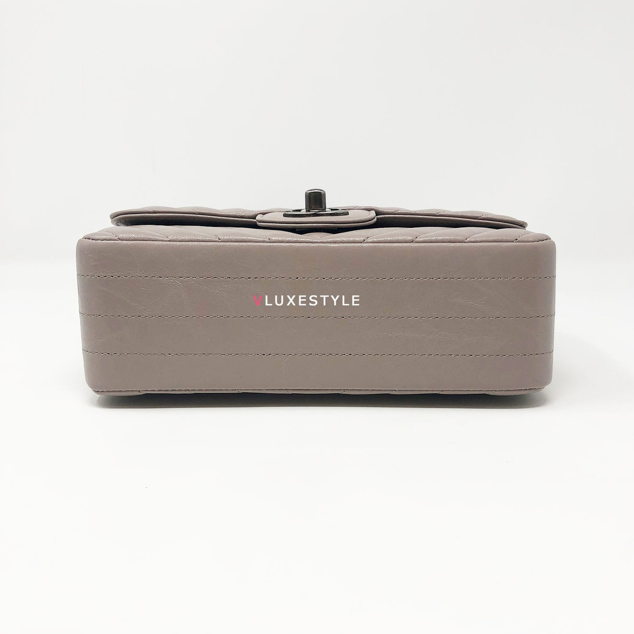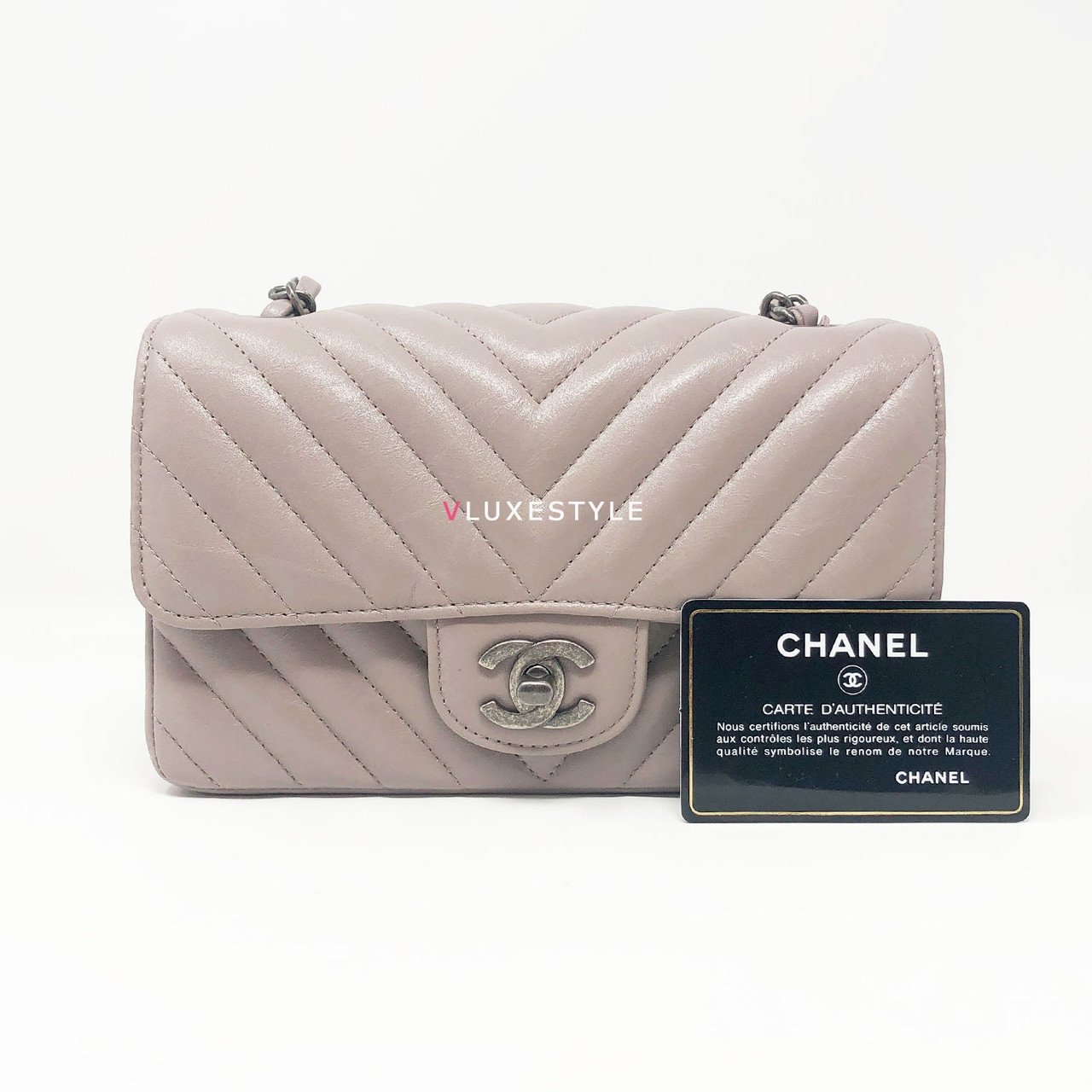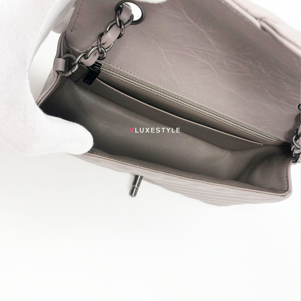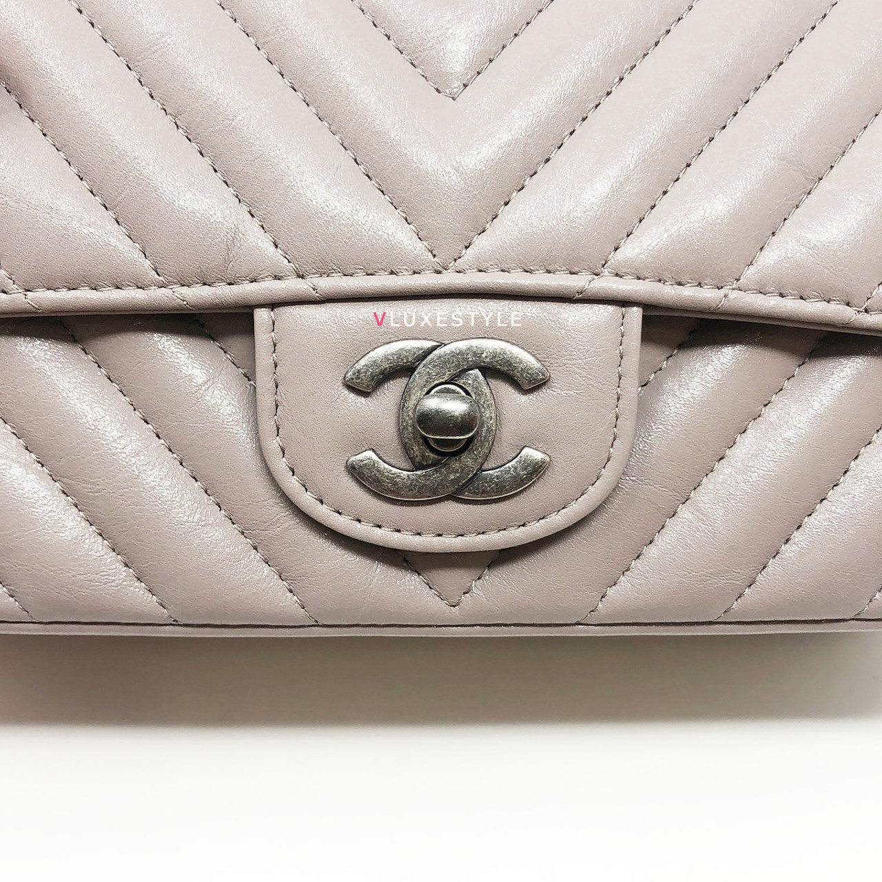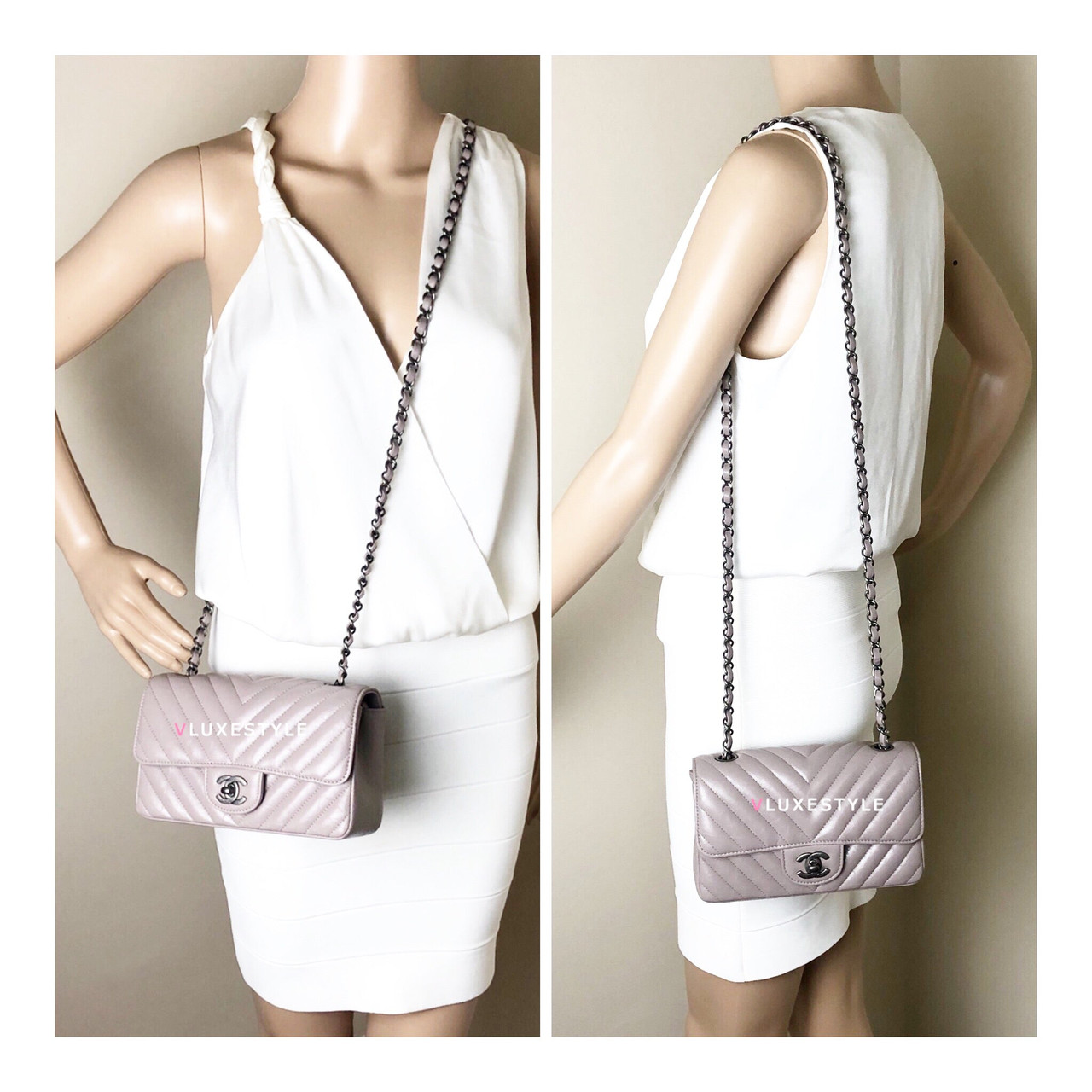 Rare find! The highly sought-after Authentic Chanel 18B Mini Rectangular Glazed Taupe Chevron Calfskin with Ruthenium hardware. This mini bag is made of luxurious and durable glazed chevron calfskin leather in gorgeous taupe and ruthenium hardware. The bag can be worn as a crossbody or over-the-shoulder bag. It's the perfect on the go bag as well as a small bag for casual and special occasions. It's the perfect neutral making it extremely versatile and timelessly popular. (Minis are always sold out in stores)