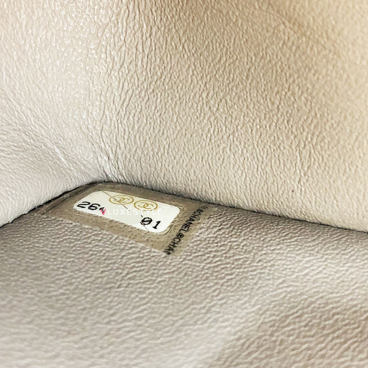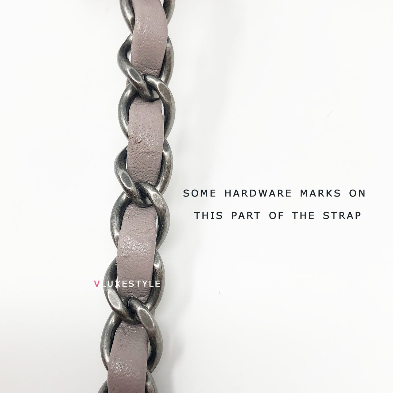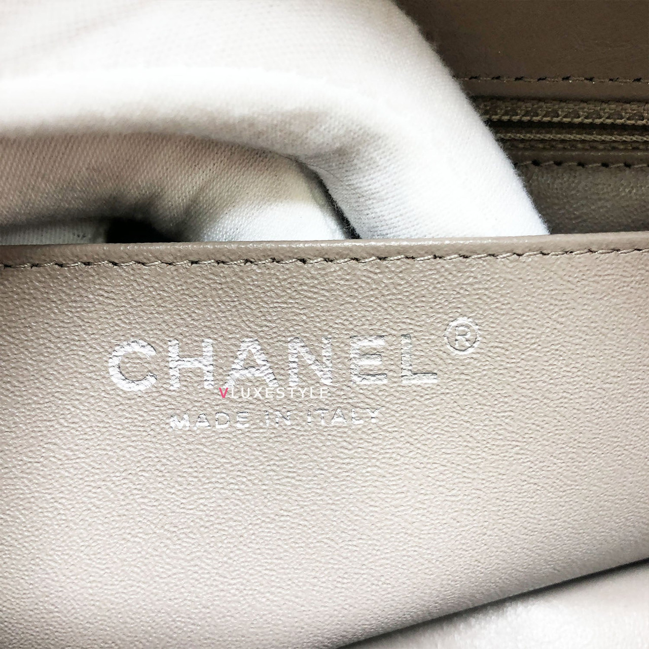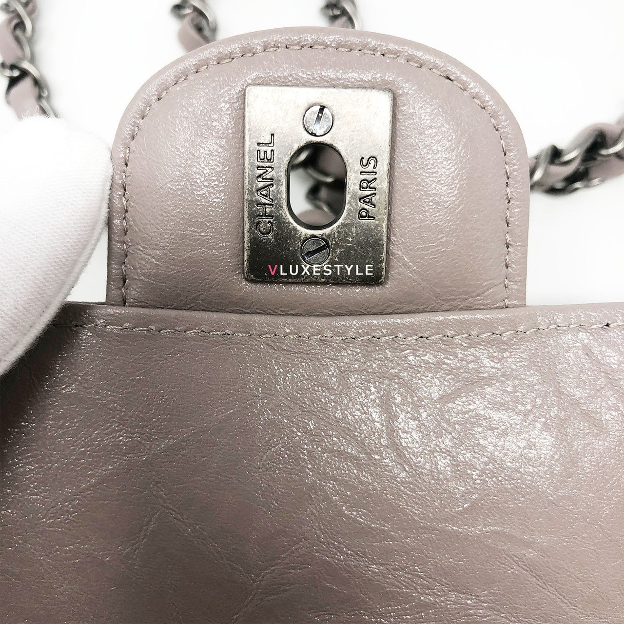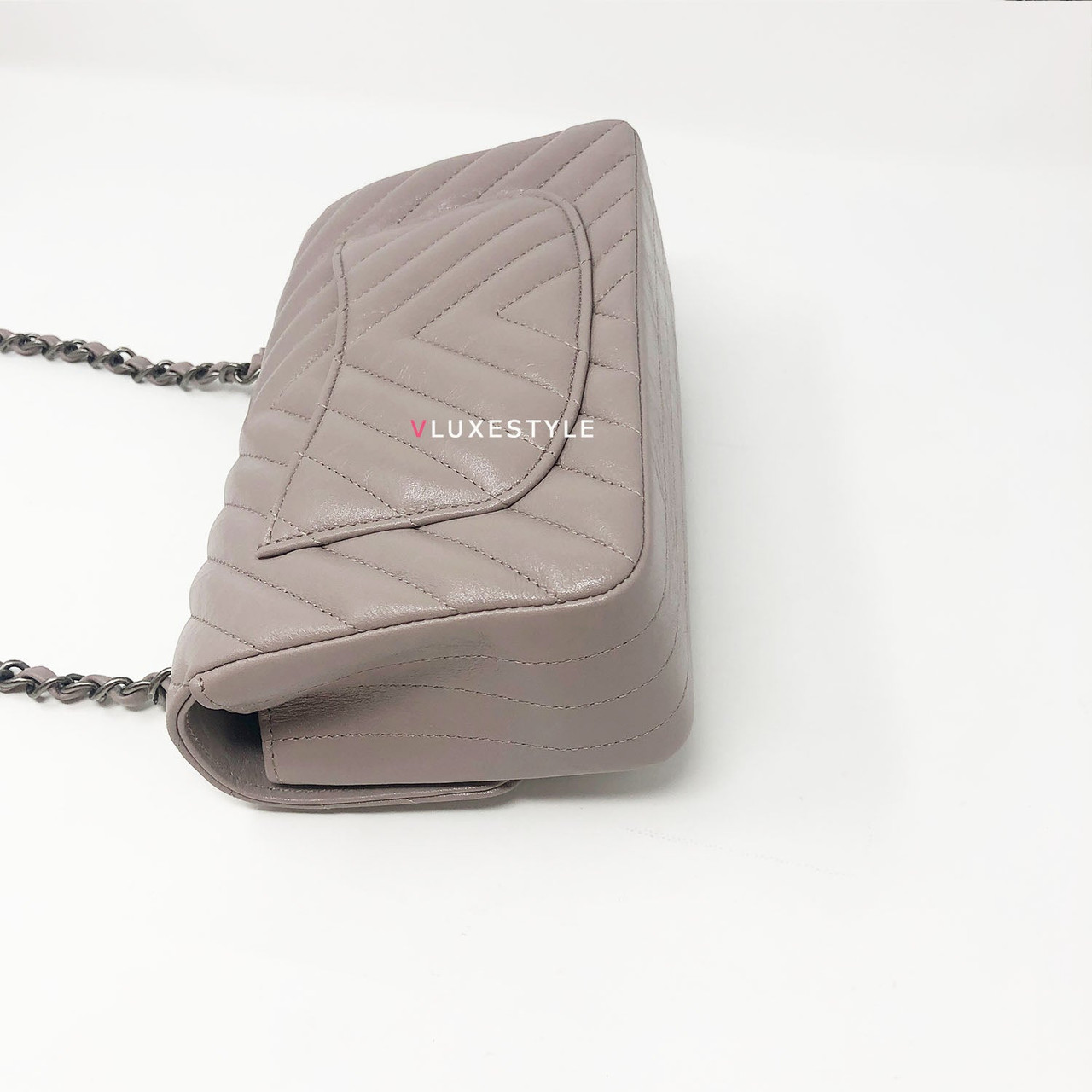 Rare find! The highly sought-after Authentic Chanel 18B Mini Rectangular Glazed Taupe Chevron Calfskin with Ruthenium hardware. This mini bag is made of luxurious and durable glazed chevron calfskin leather in gorgeous taupe and ruthenium hardware. The bag can be worn as a crossbody or over-the-shoulder bag. It's the perfect on the go bag as well as a small bag for casual and special occasions. It's the perfect neutral making it extremely versatile and timelessly popular. (Minis are always sold out in stores)
