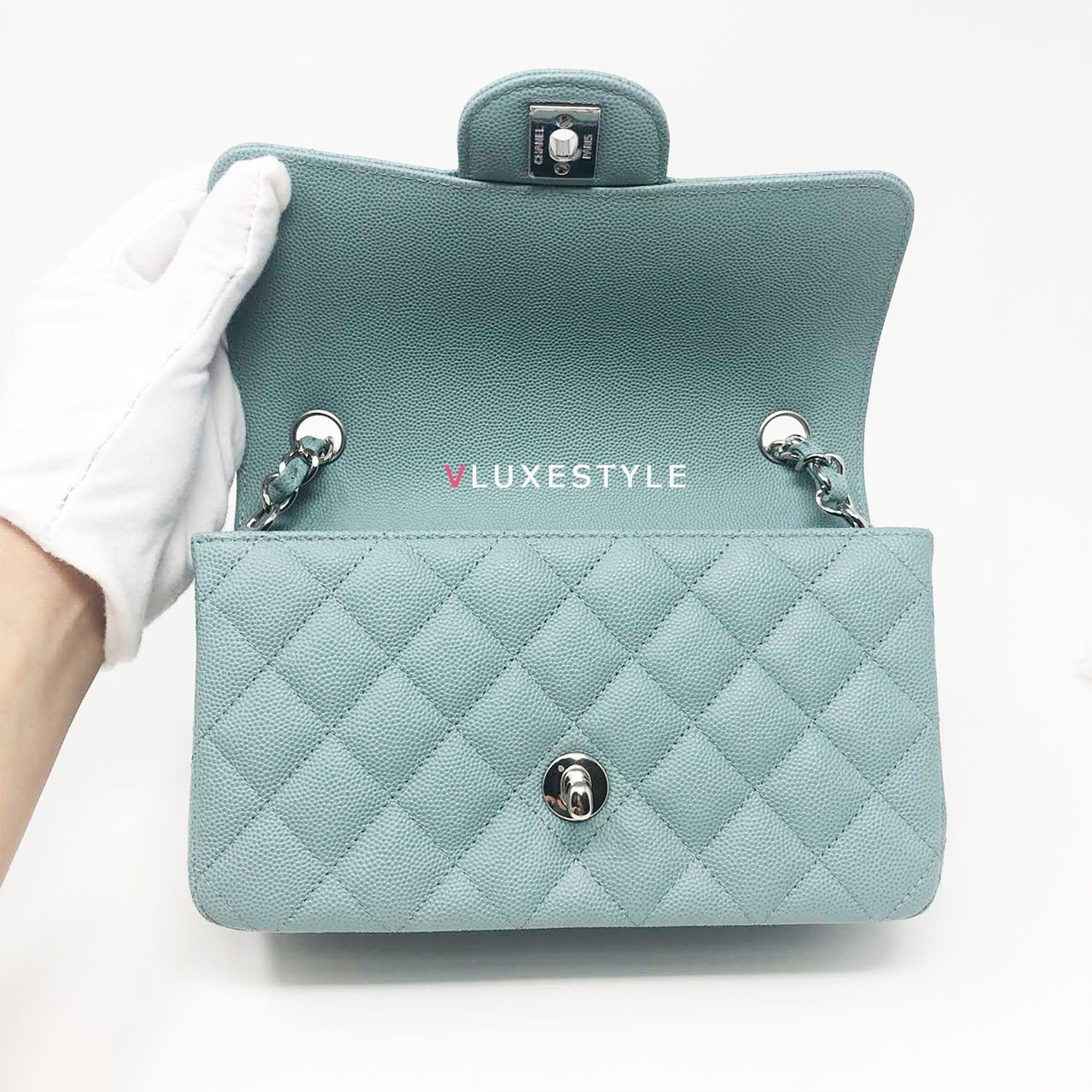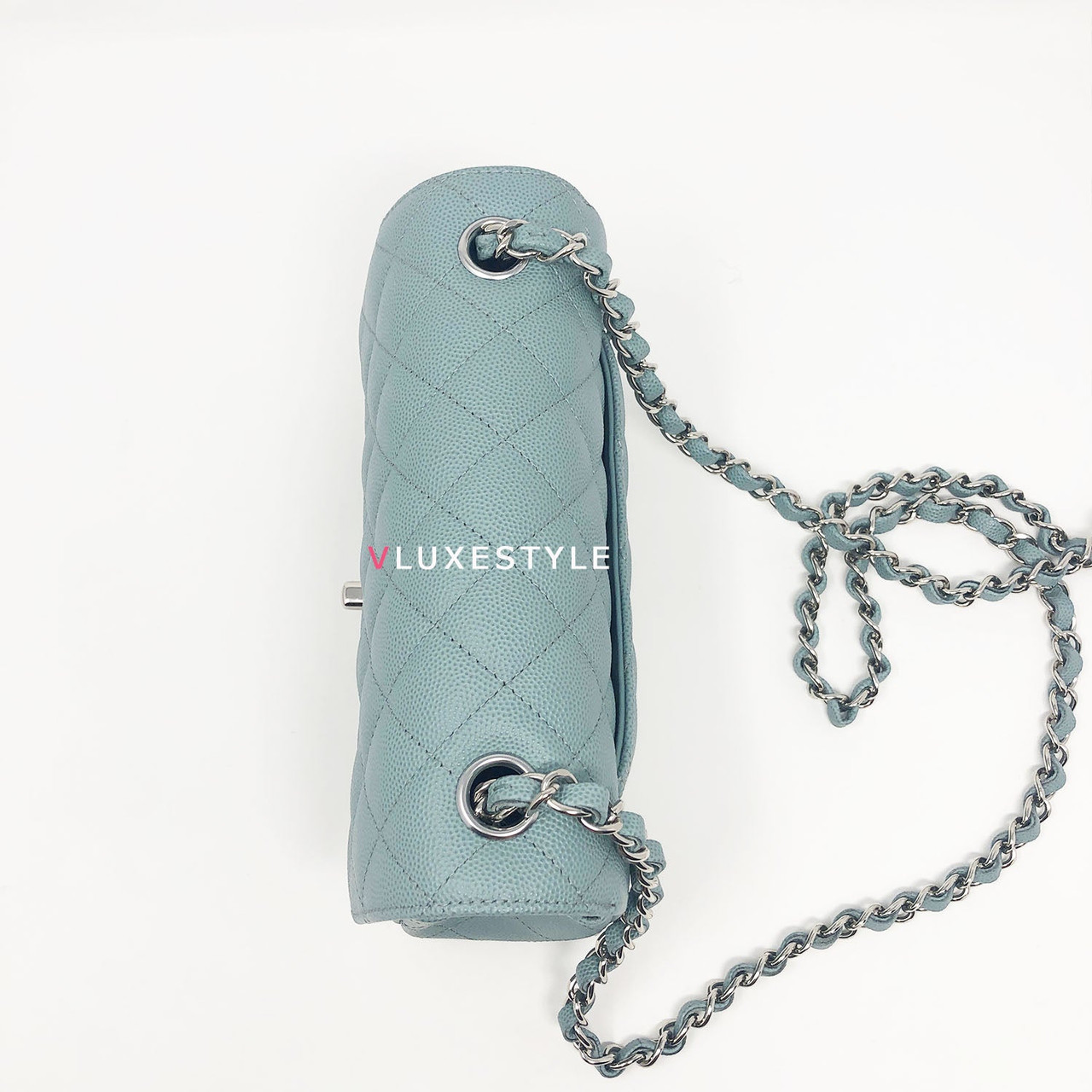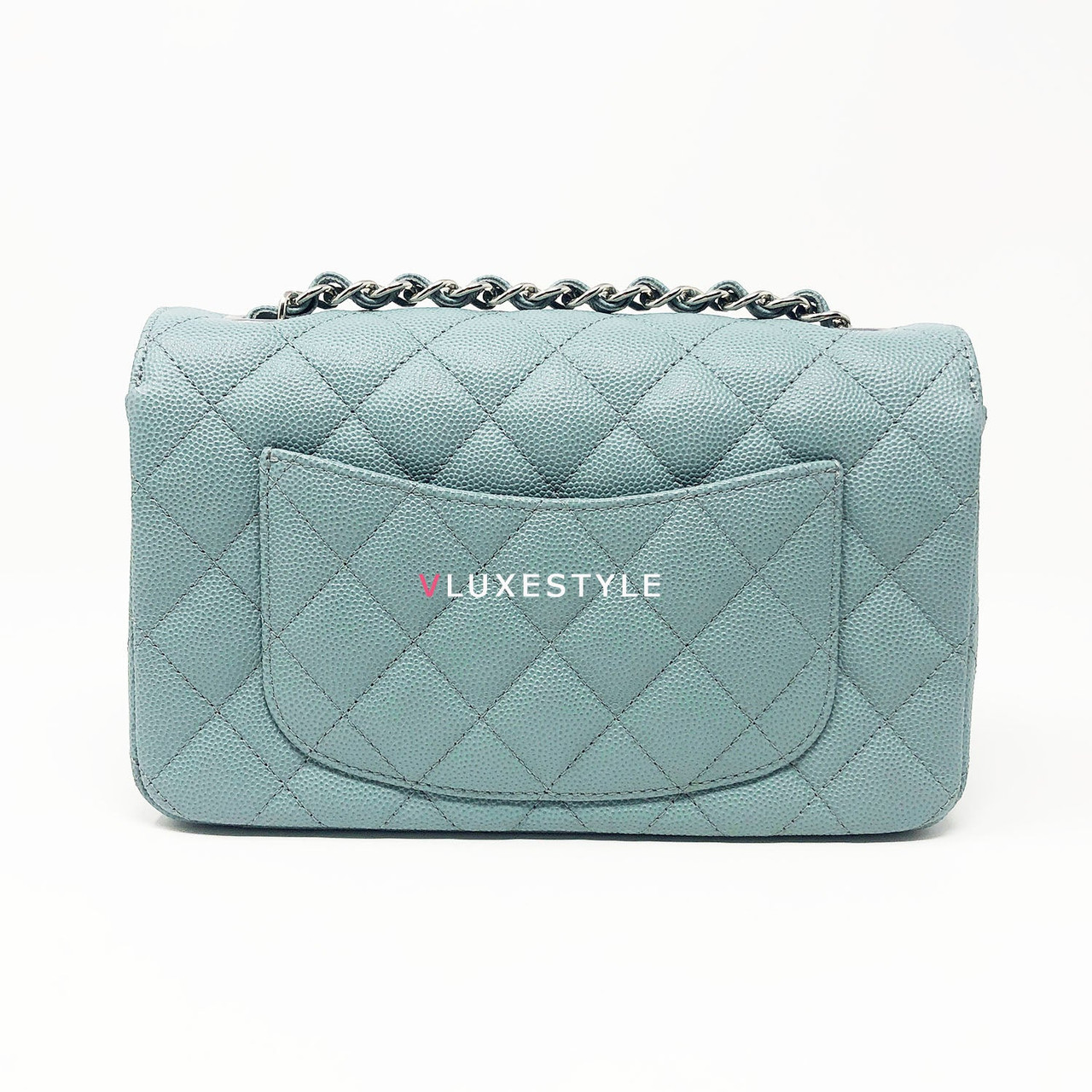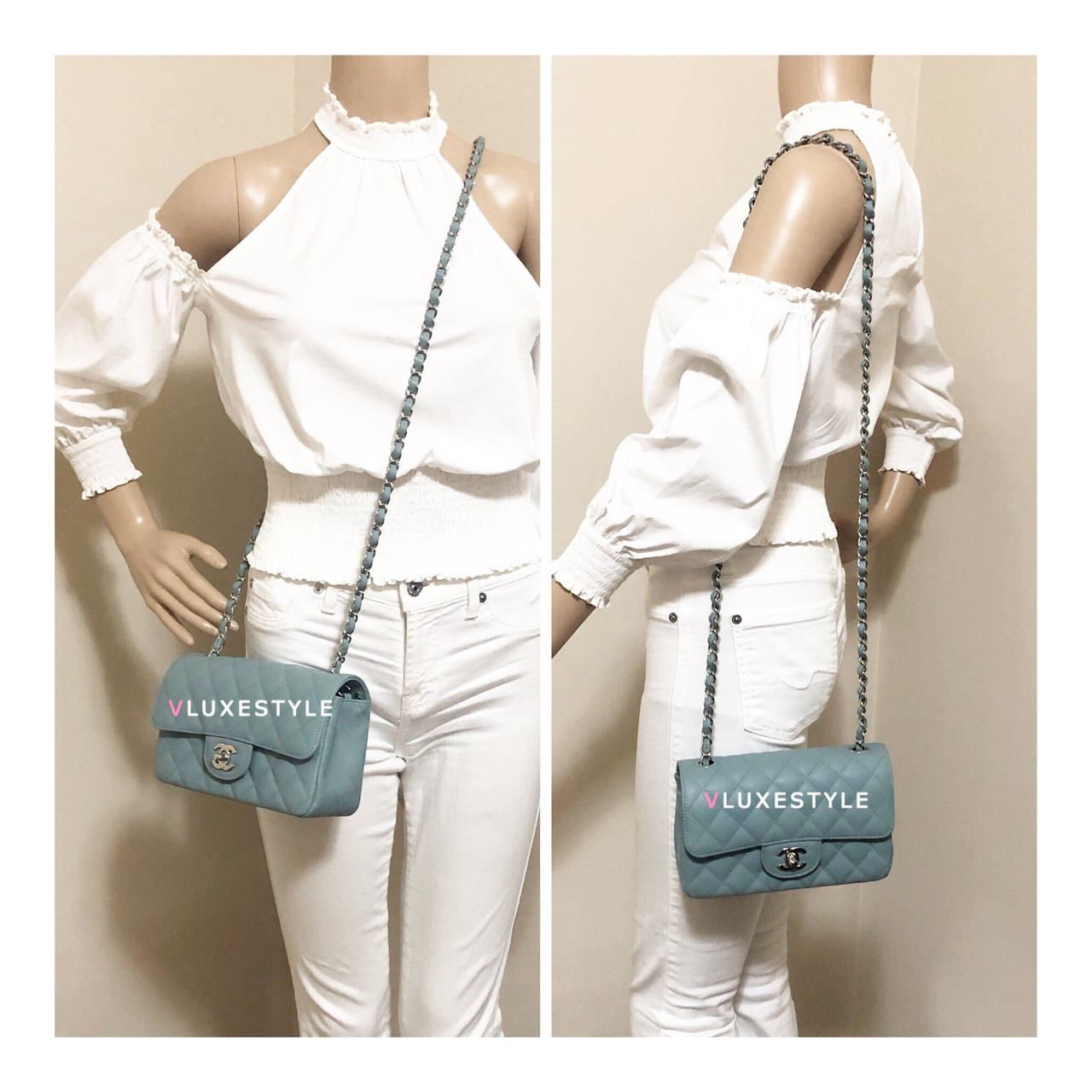 Very rare to find these days! Authentic Chanel Like New 18C Mini Rectangular Light Blue Quilted Caviar with EDGE STITCHING and silver hardware. This stunning shoulder bag is crafted of luxurious and durable quilted caviar leather in light blue. This mini bag can be worn as a cross-body or over-the-shoulder bag. Last 2018 Chanel discontinued making minis in caviar until further notice.