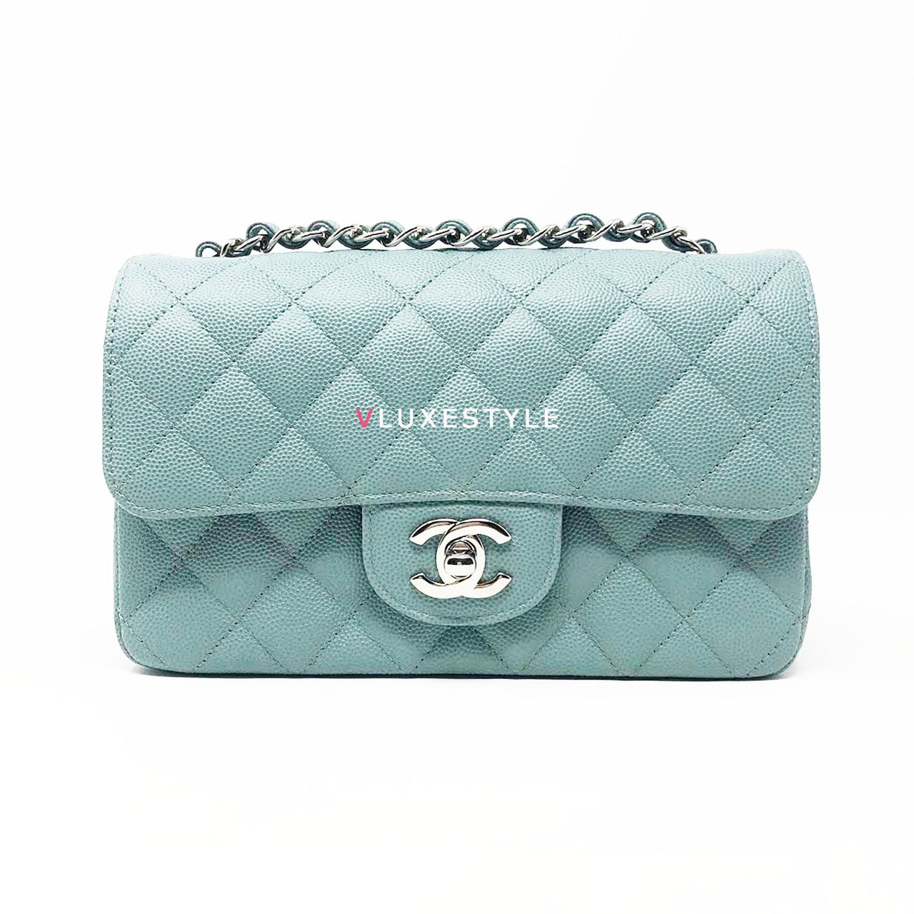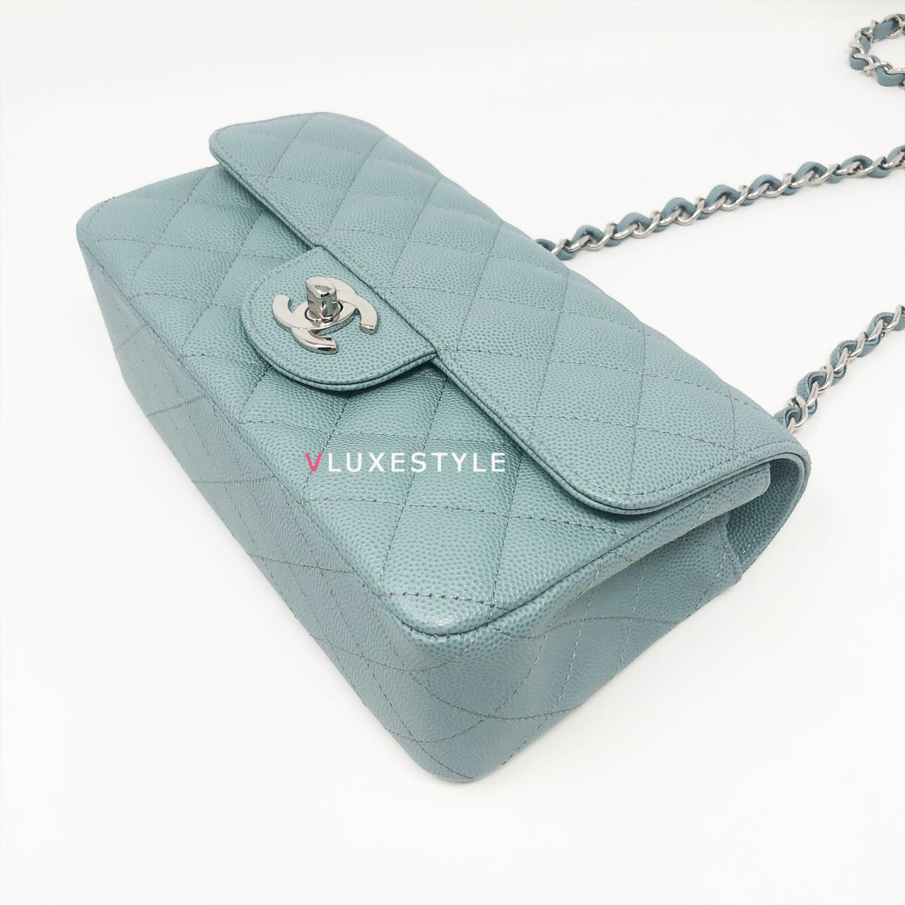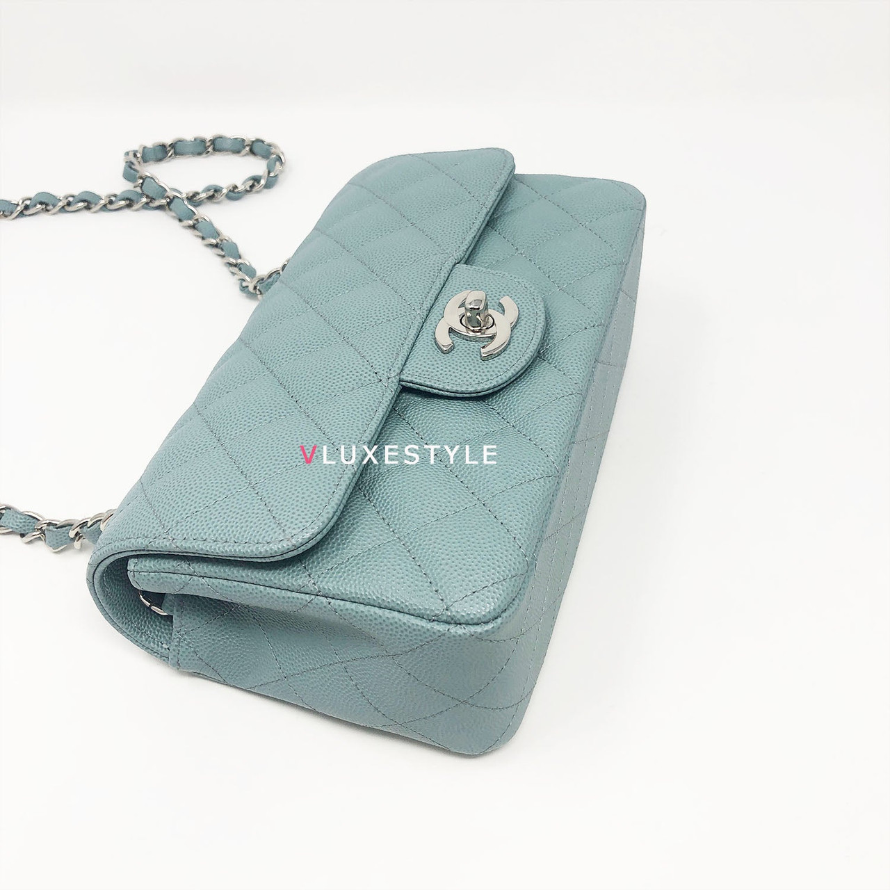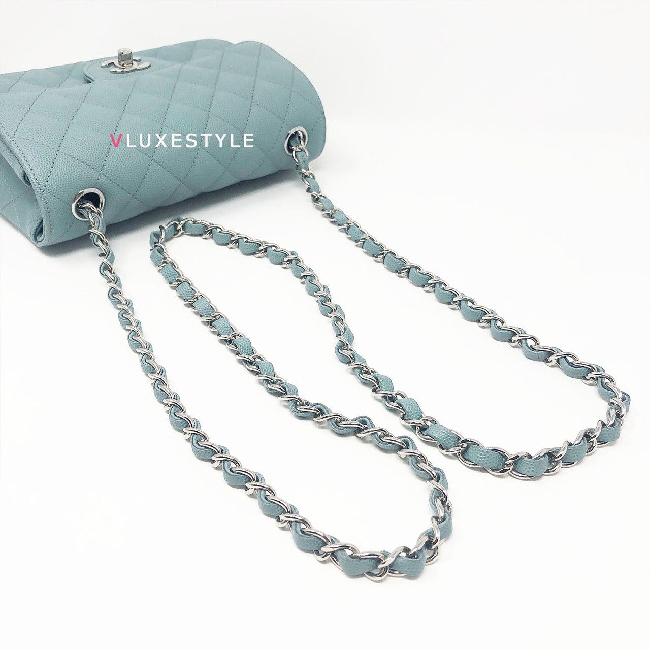 Very rare to find these days! Authentic Chanel Like New 18C Mini Rectangular Light Blue Quilted Caviar with EDGE STITCHING and silver hardware. This stunning shoulder bag is crafted of luxurious and durable quilted caviar leather in light blue. This mini bag can be worn as a cross-body or over-the-shoulder bag. Last 2018 Chanel discontinued making minis in caviar until further notice.