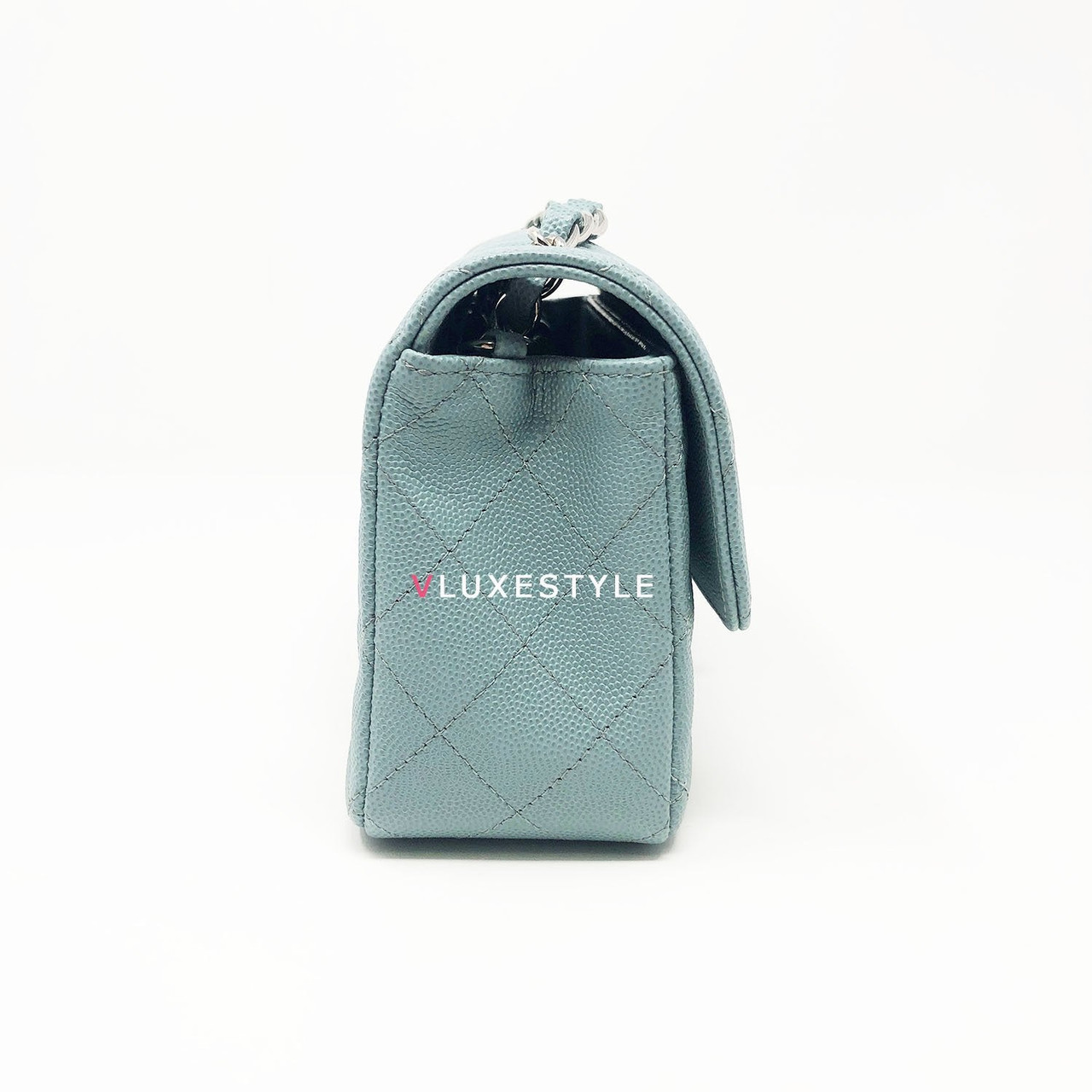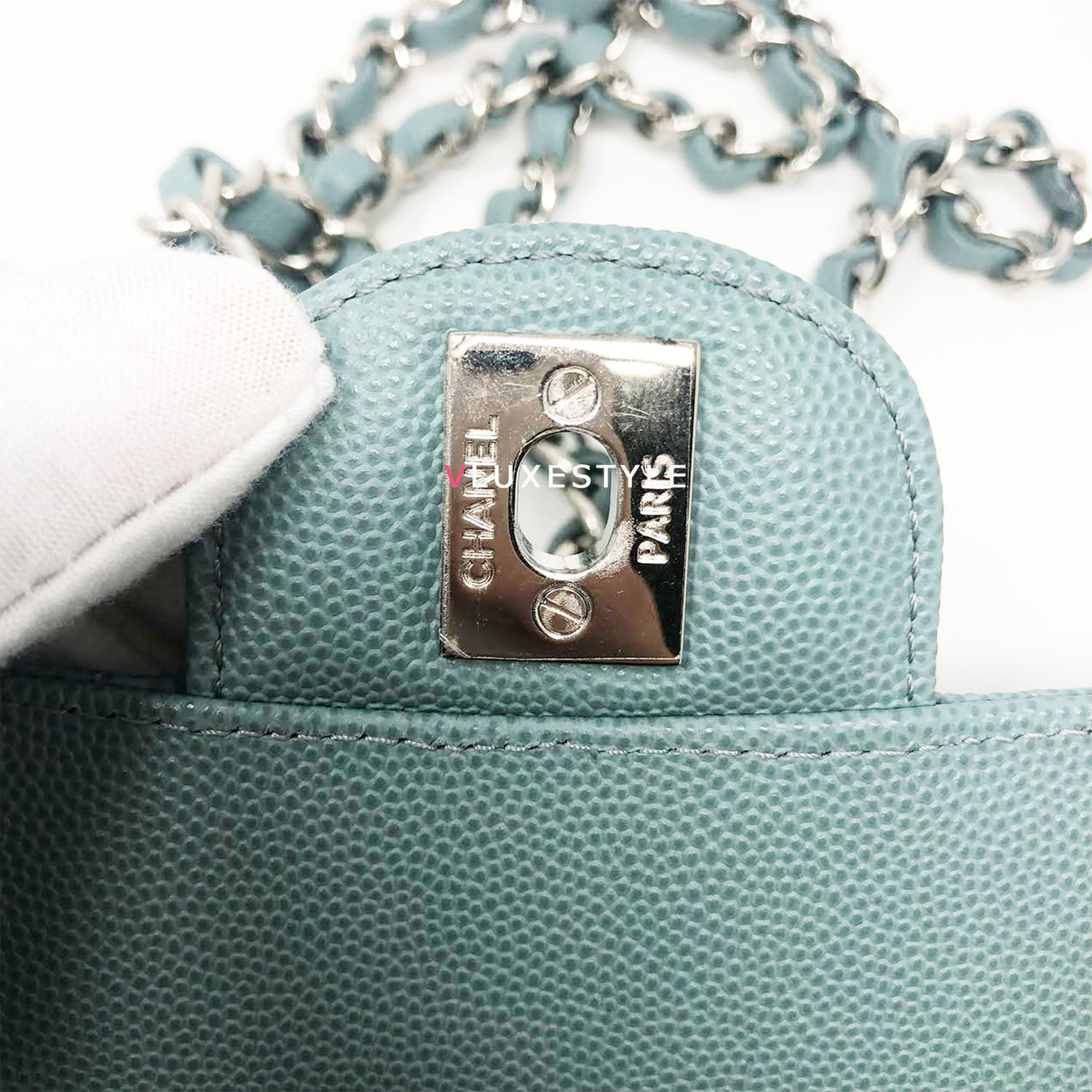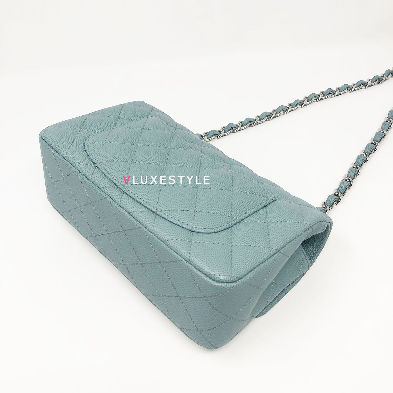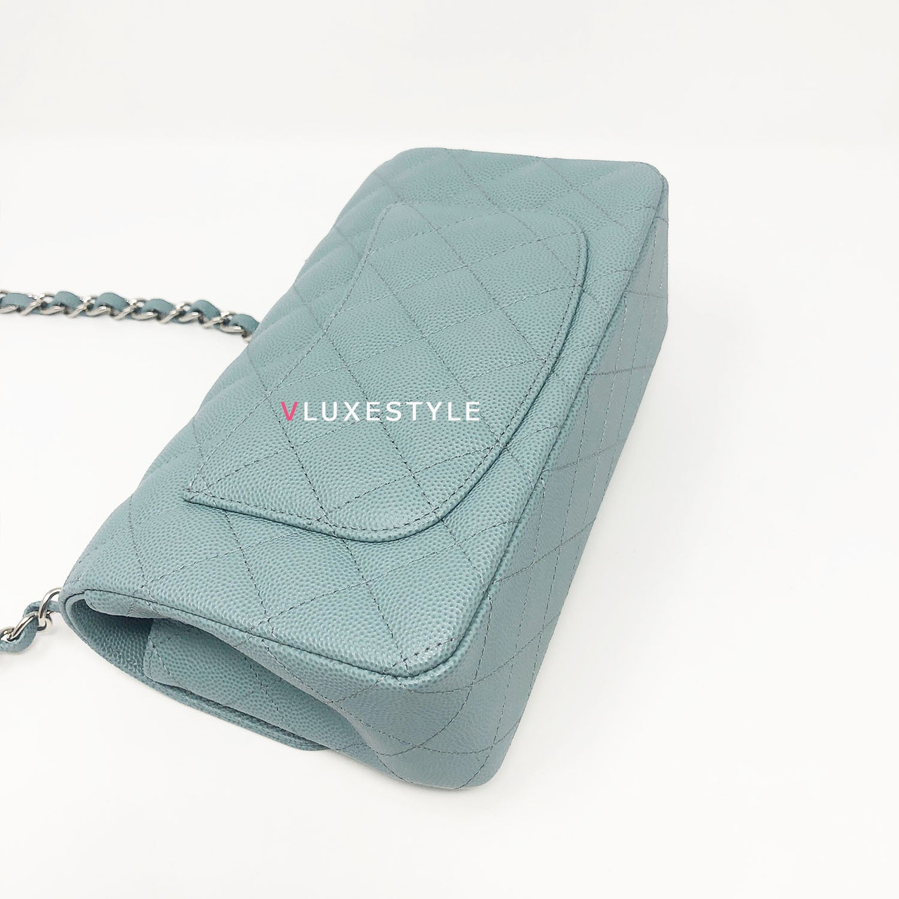 Very rare to find these days! Authentic Chanel Like New 18C Mini Rectangular Light Blue Quilted Caviar with EDGE STITCHING and silver hardware. This stunning shoulder bag is crafted of luxurious and durable quilted caviar leather in light blue. This mini bag can be worn as a cross-body or over-the-shoulder bag. Last 2018 Chanel discontinued making minis in caviar until further notice.