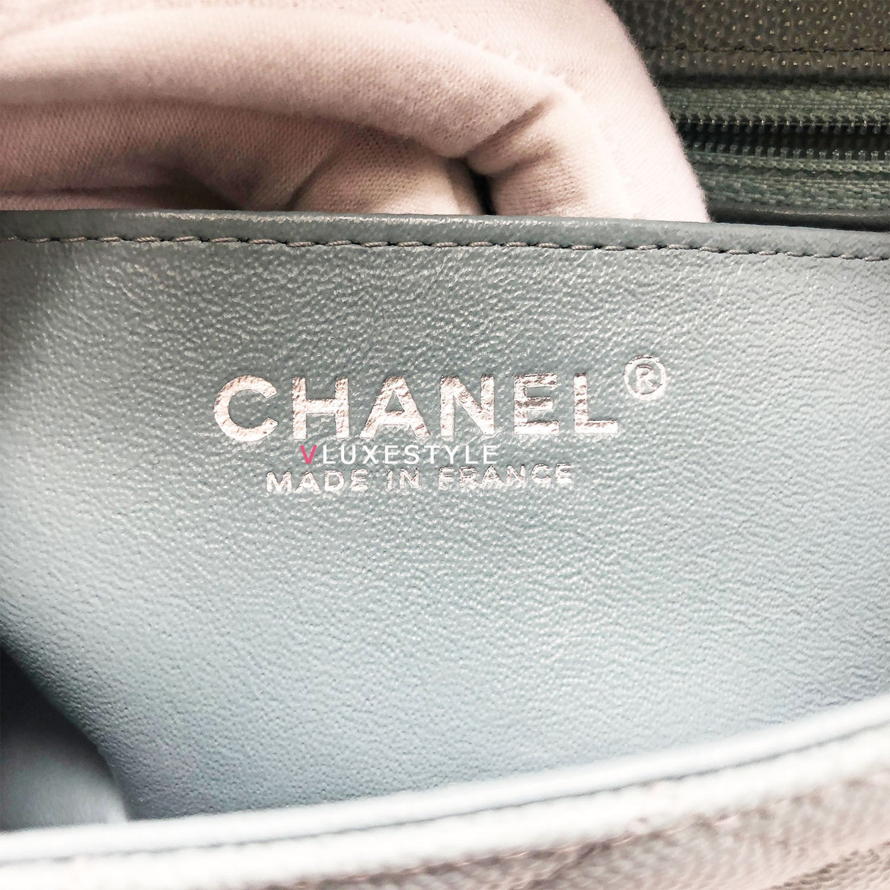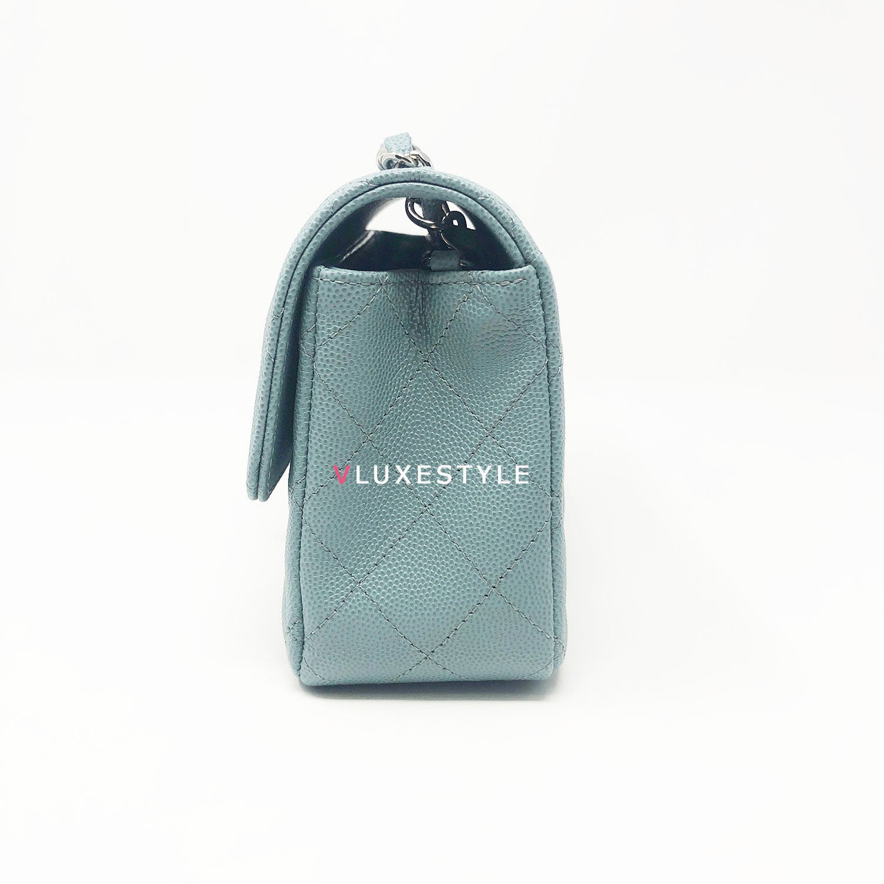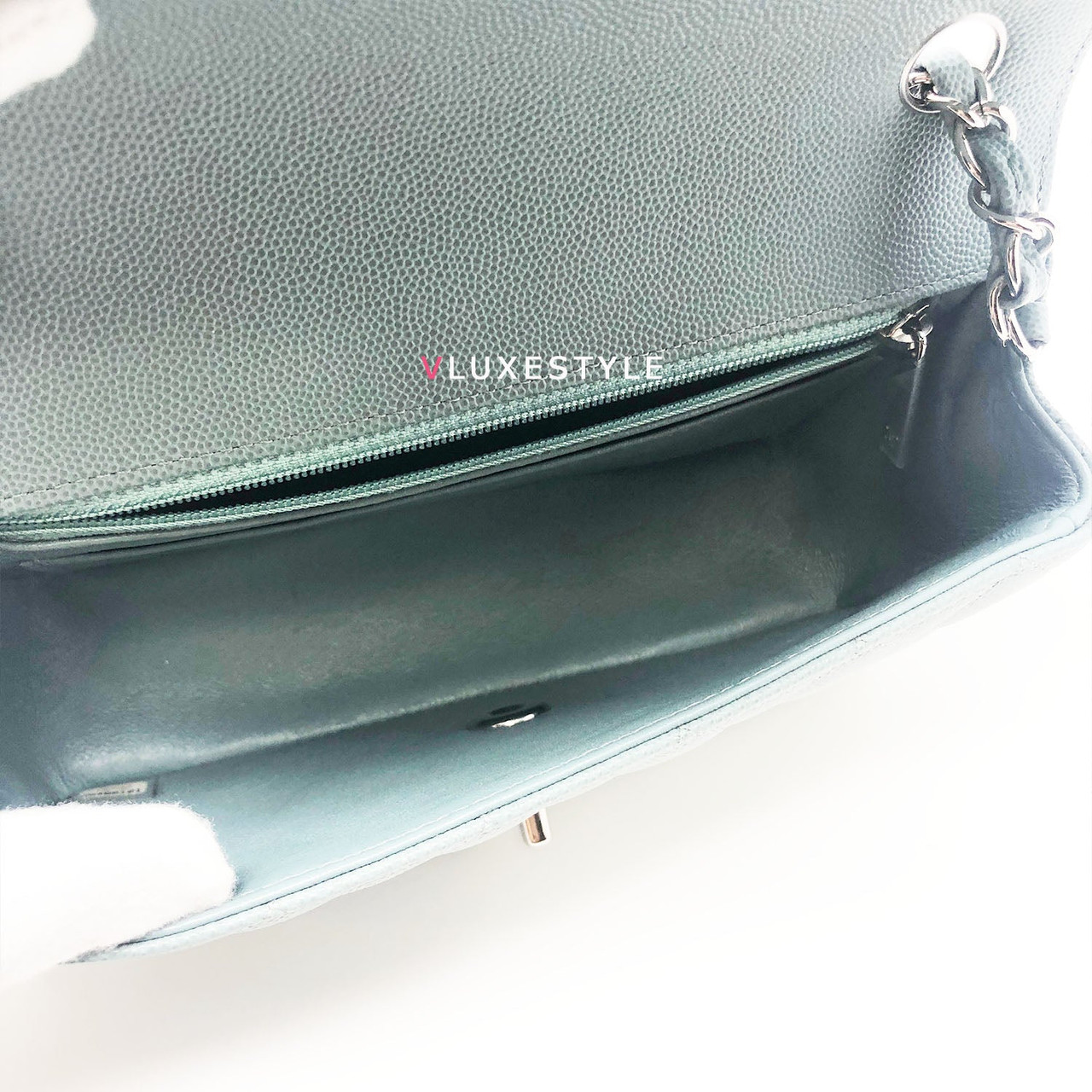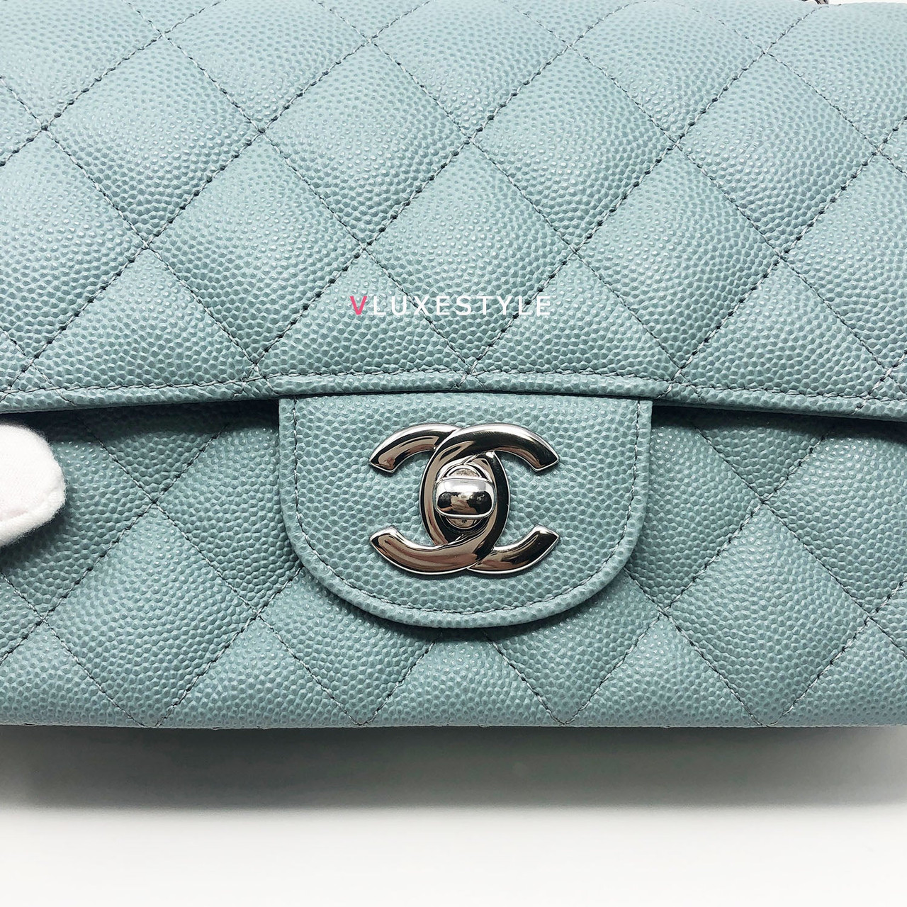 Very rare to find these days! Authentic Chanel Like New 18C Mini Rectangular Light Blue Quilted Caviar with EDGE STITCHING and silver hardware. This stunning shoulder bag is crafted of luxurious and durable quilted caviar leather in light blue. This mini bag can be worn as a cross-body or over-the-shoulder bag. Last 2018 Chanel discontinued making minis in caviar until further notice.
