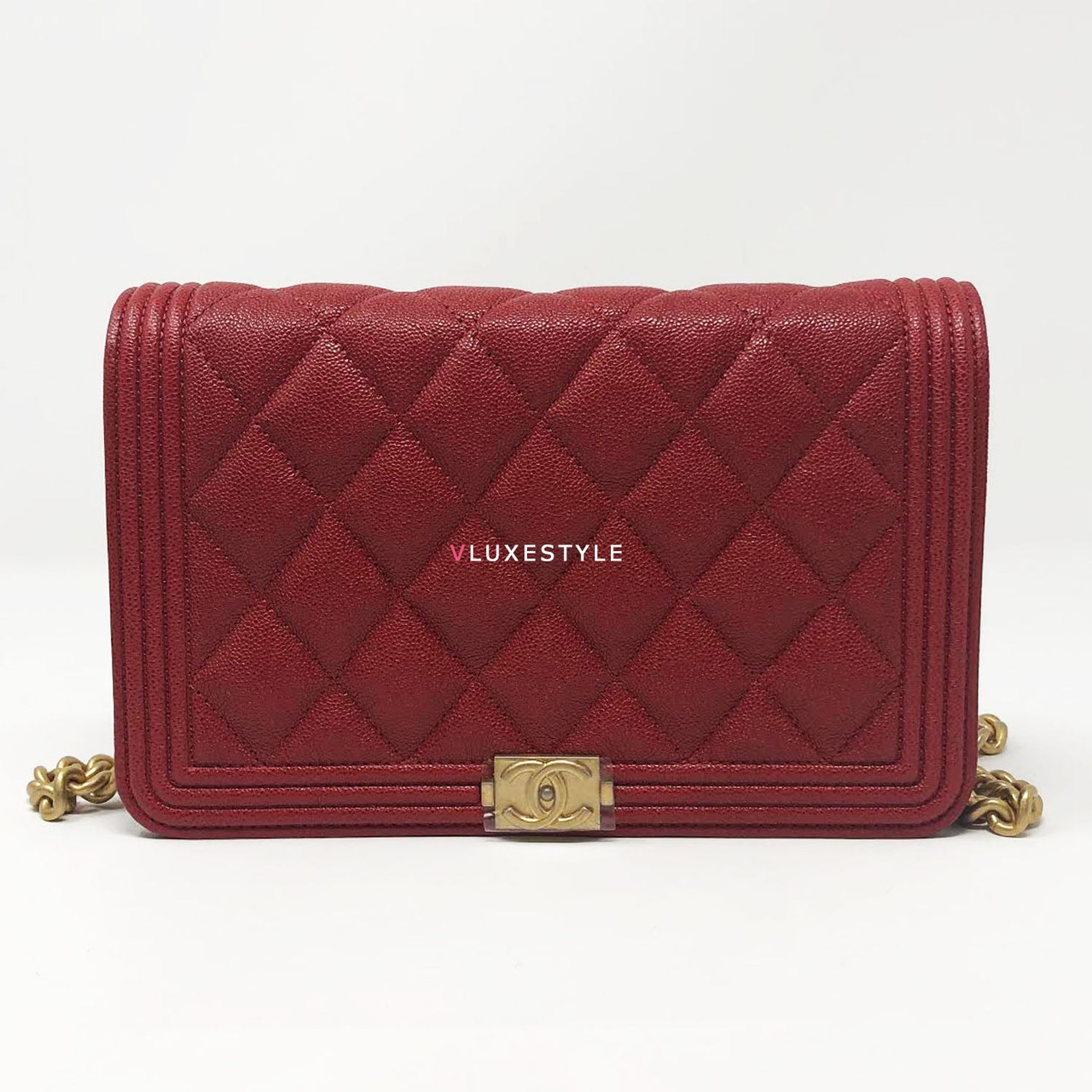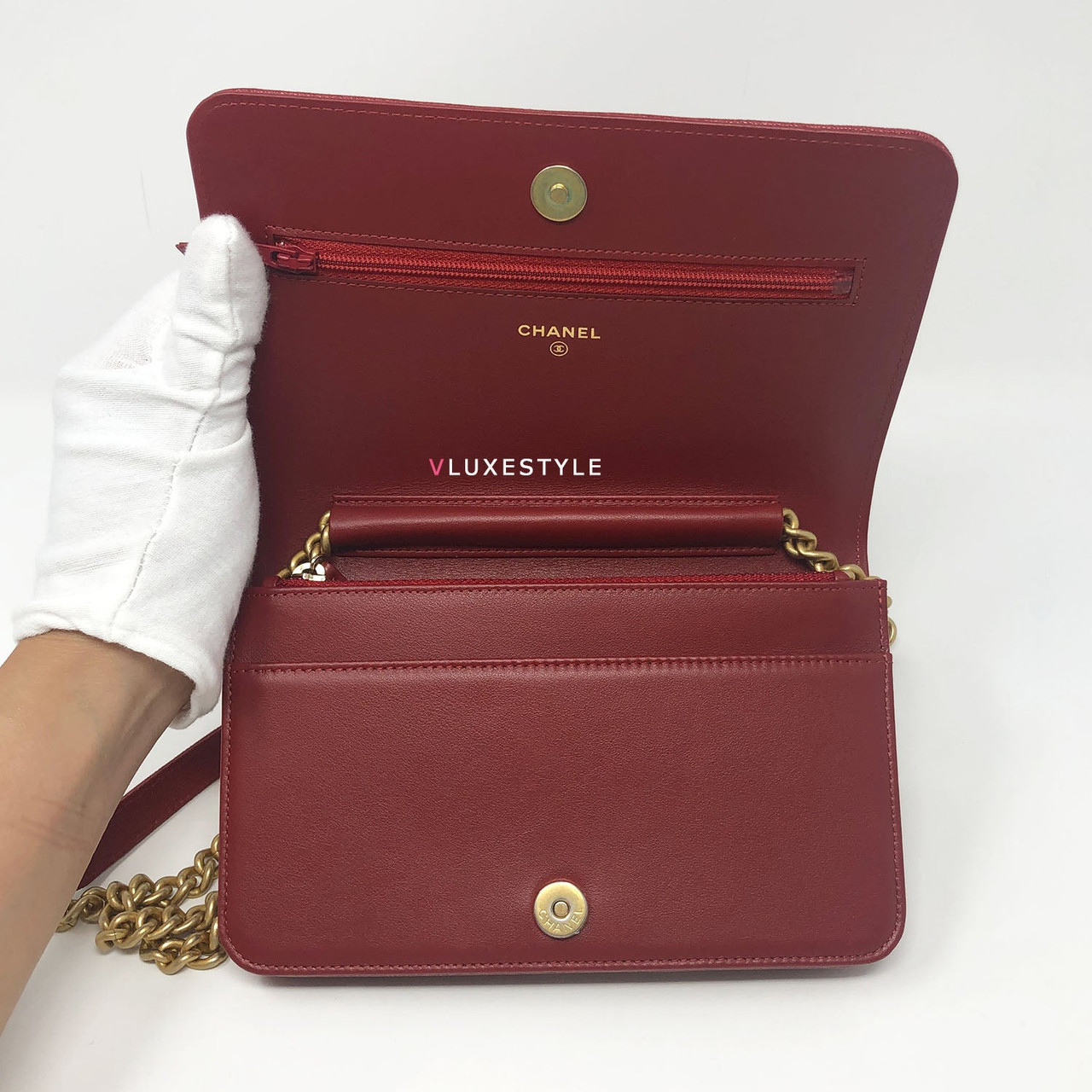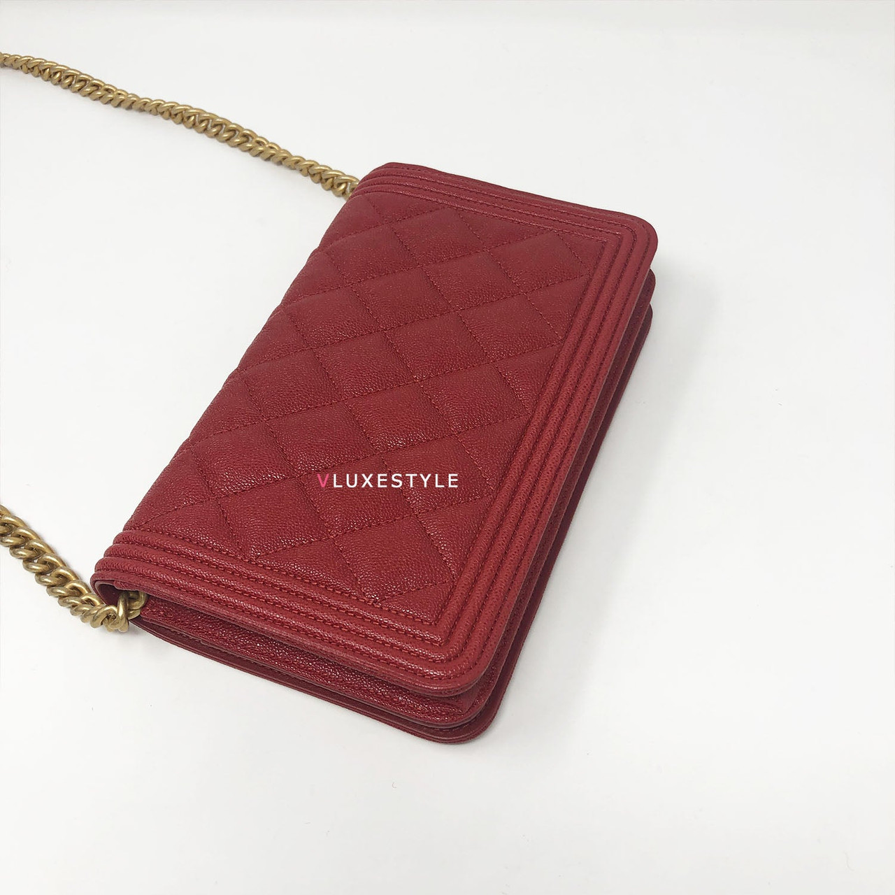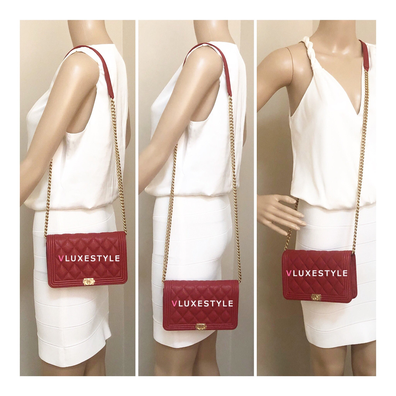 Rare find! Current release! Brand new with tags! Authentic Chanel 19A Boy Wallet on Chain in stunning red quilted caviar with brushed gold hardware. This stylish wallet on chain is crafted of luxurious and durable shiny quilted caviar leather in red and brushed gold hardware.