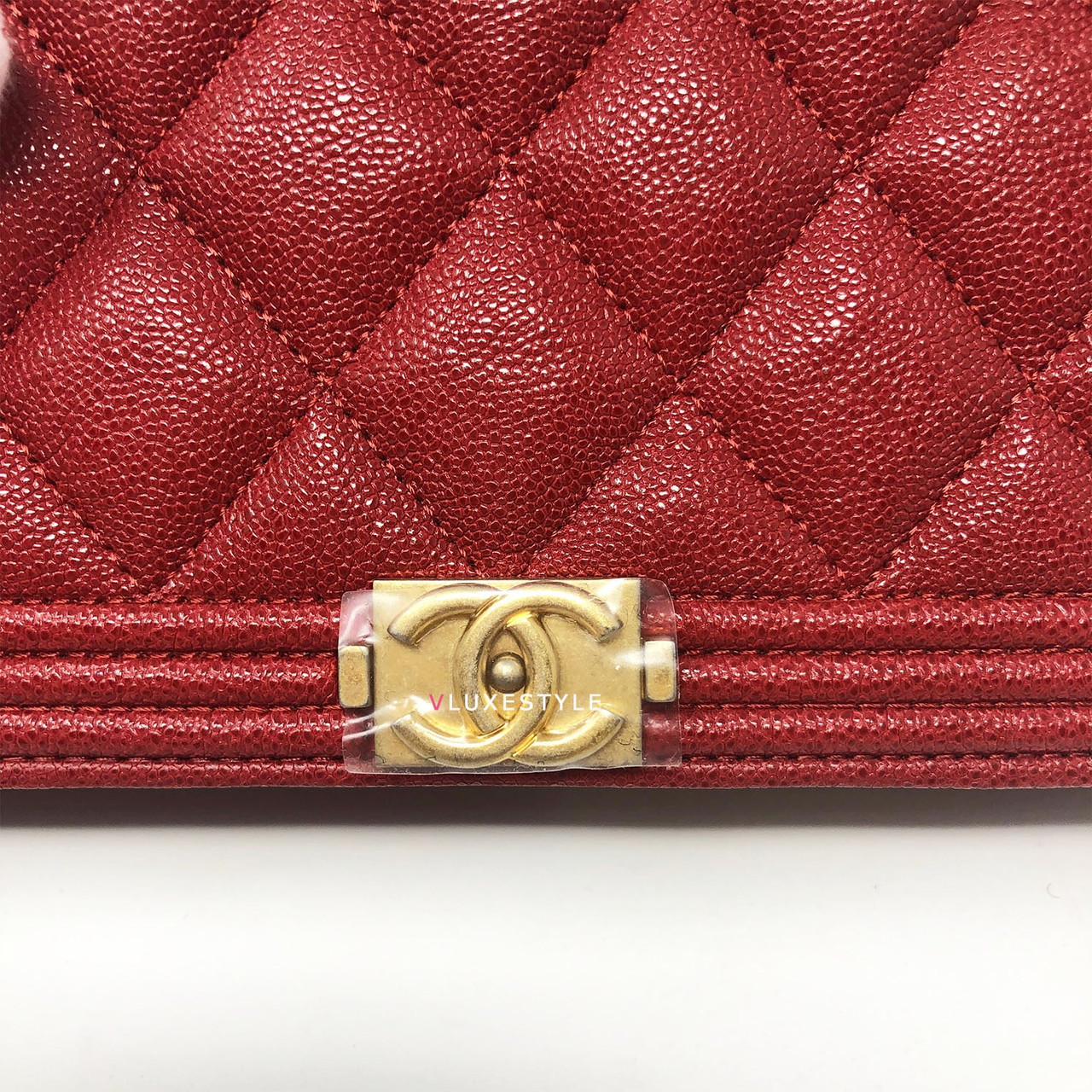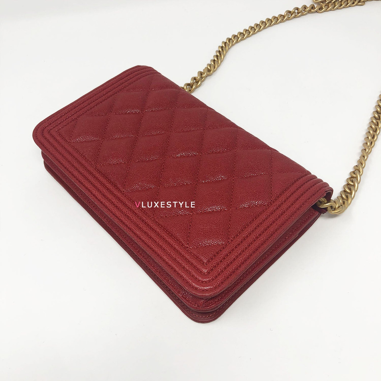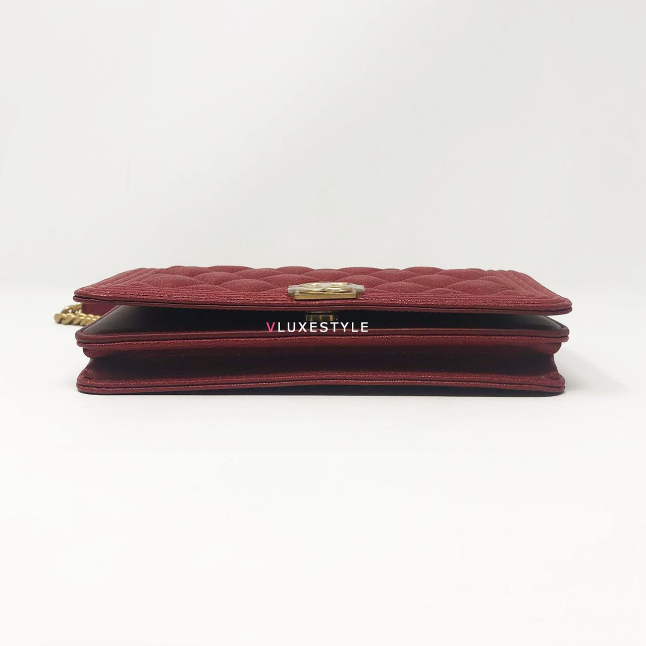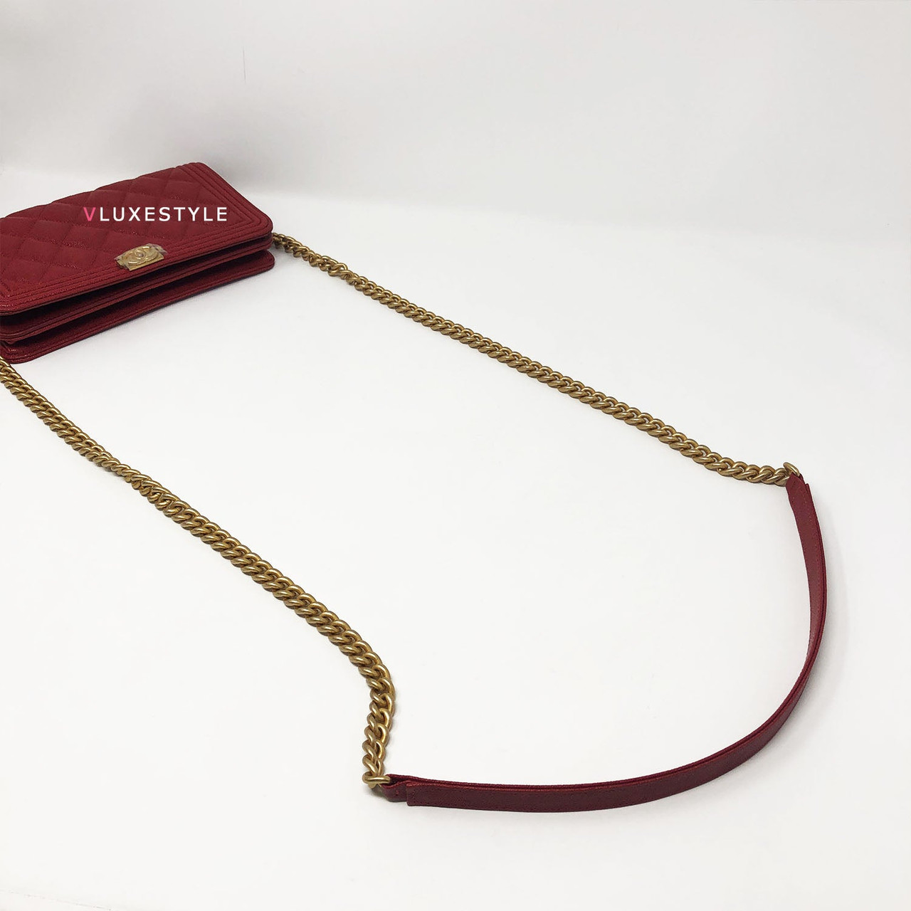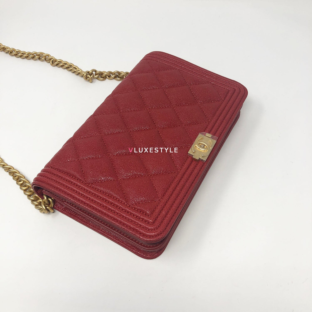Rare find! Current release! Brand new with tags! Authentic Chanel 19A Boy Wallet on Chain in stunning red quilted caviar with brushed gold hardware. This stylish wallet on chain is crafted of luxurious and durable shiny quilted caviar leather in red and brushed gold hardware.