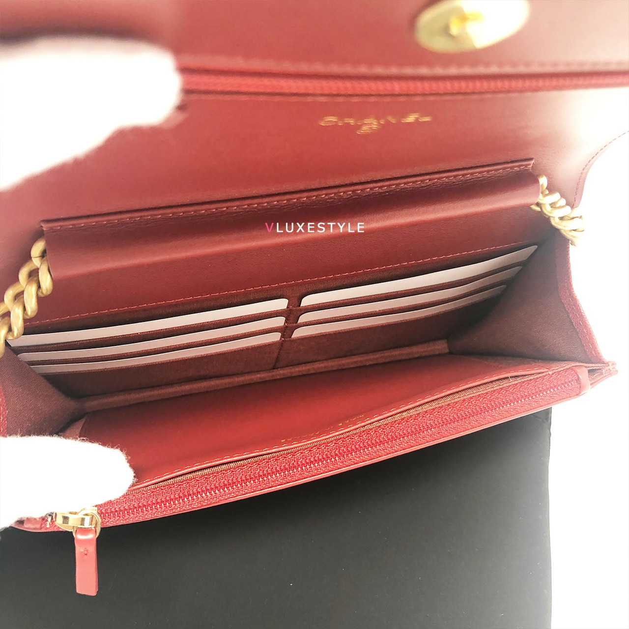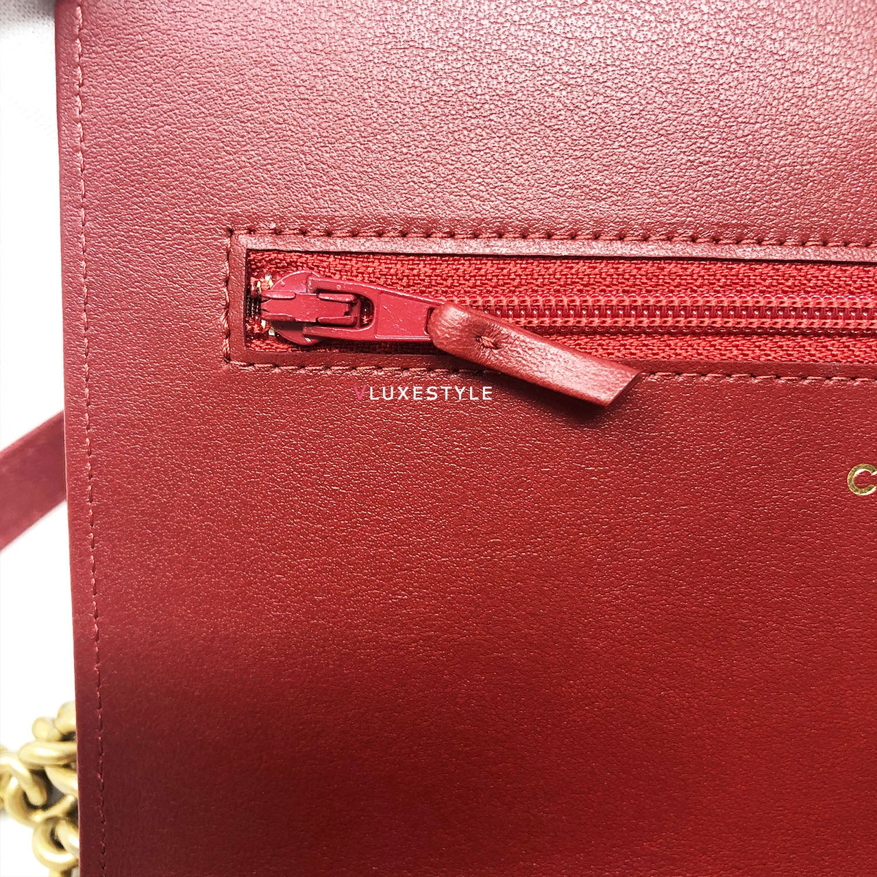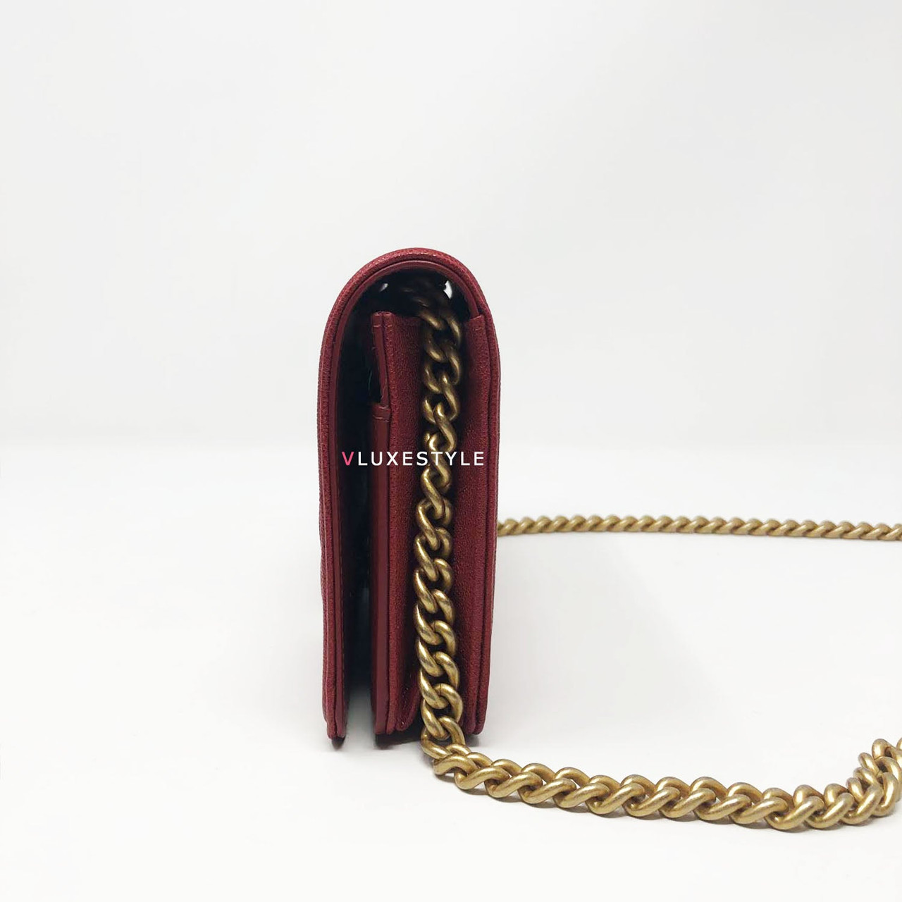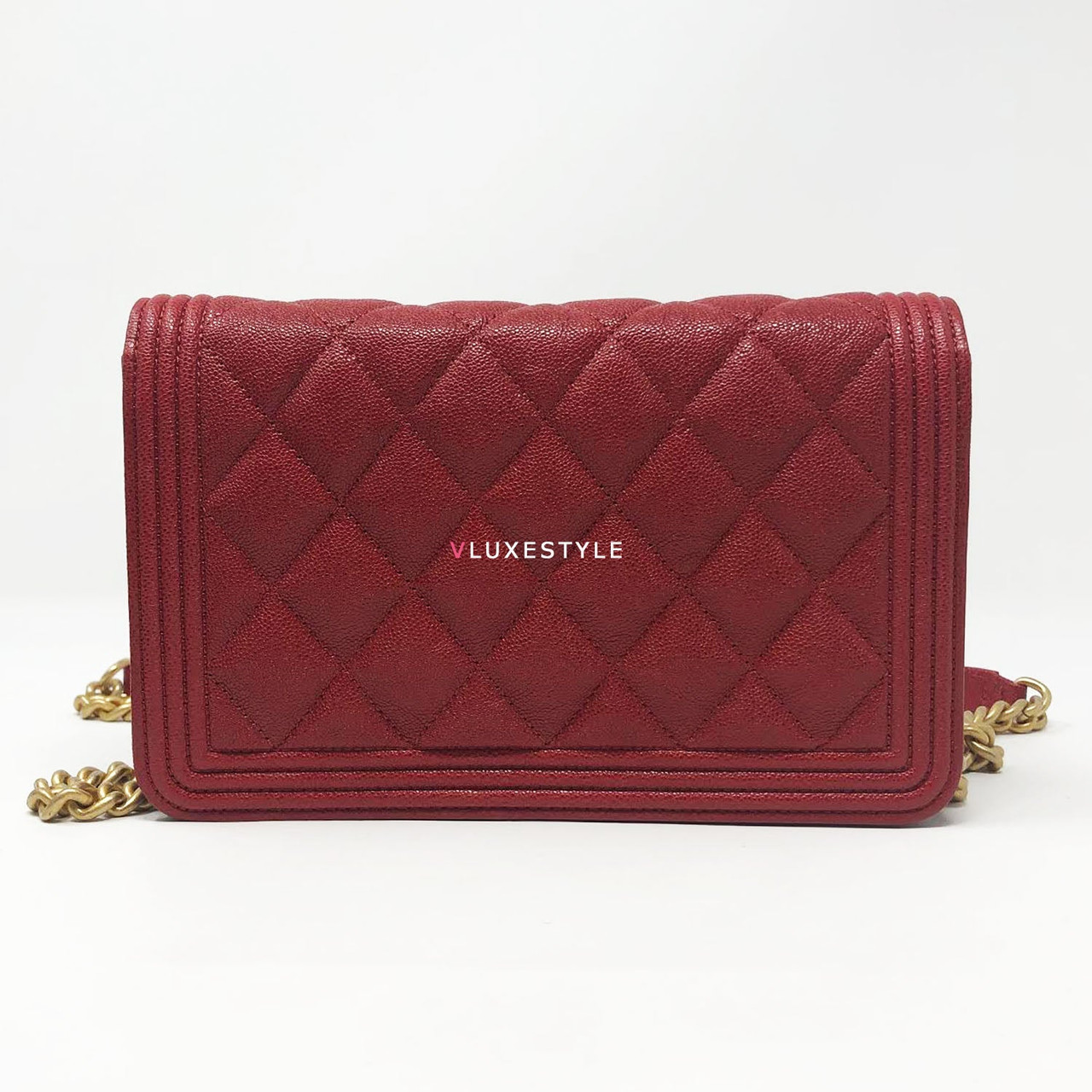 Rare find! Current release! Brand new with tags! Authentic Chanel 19A Boy Wallet on Chain in stunning red quilted caviar with brushed gold hardware. This stylish wallet on chain is crafted of luxurious and durable shiny quilted caviar leather in red and brushed gold hardware.