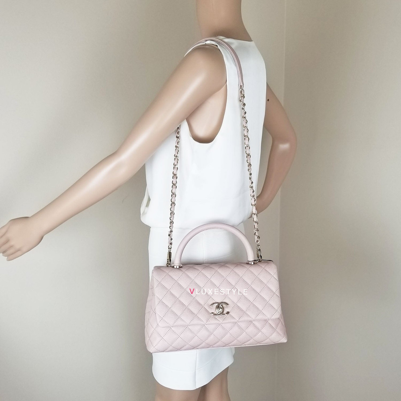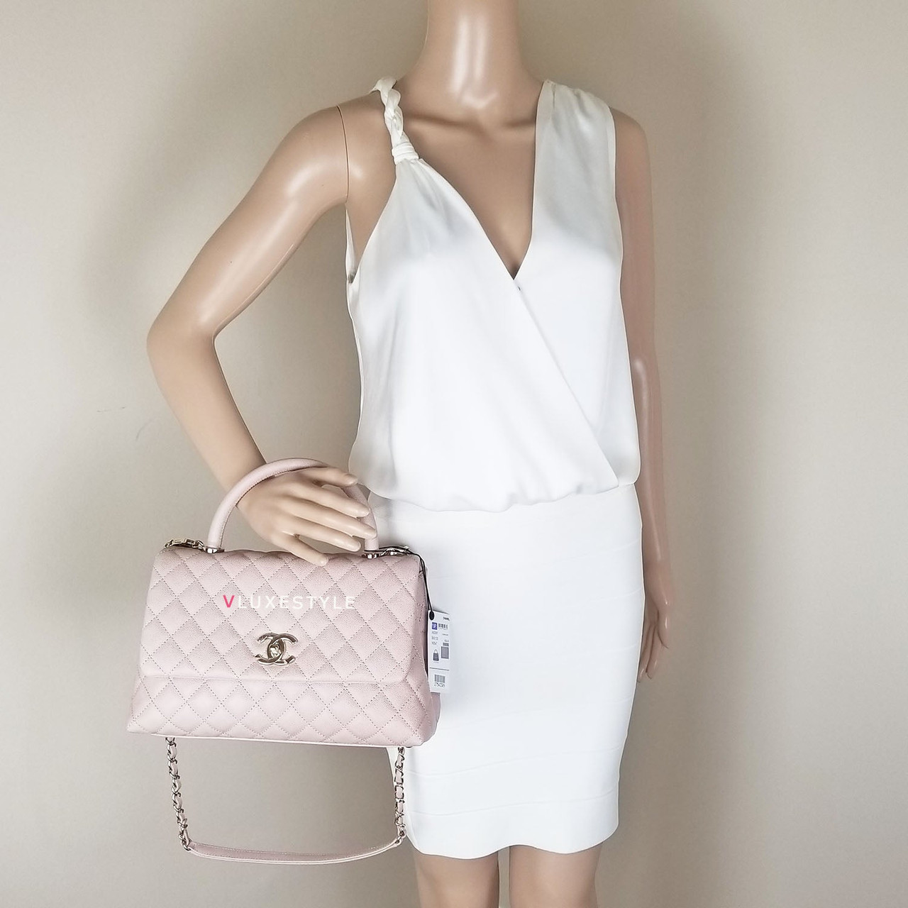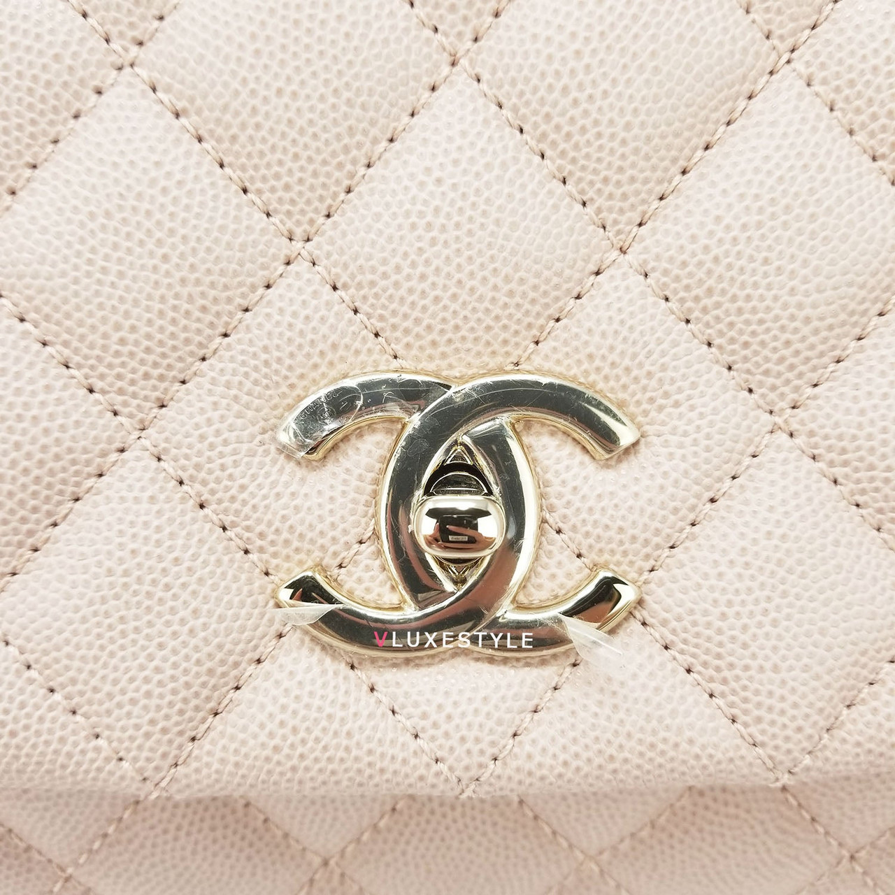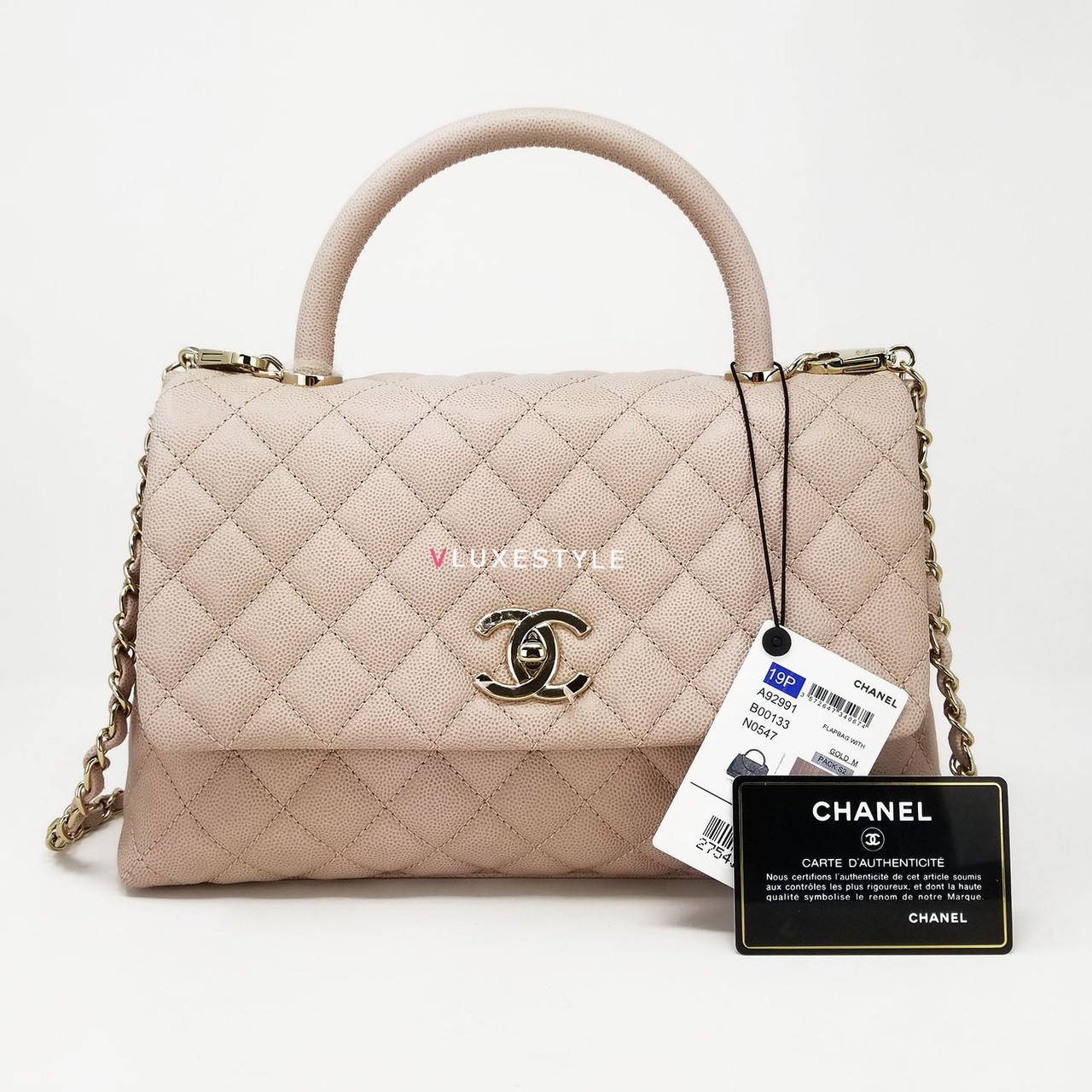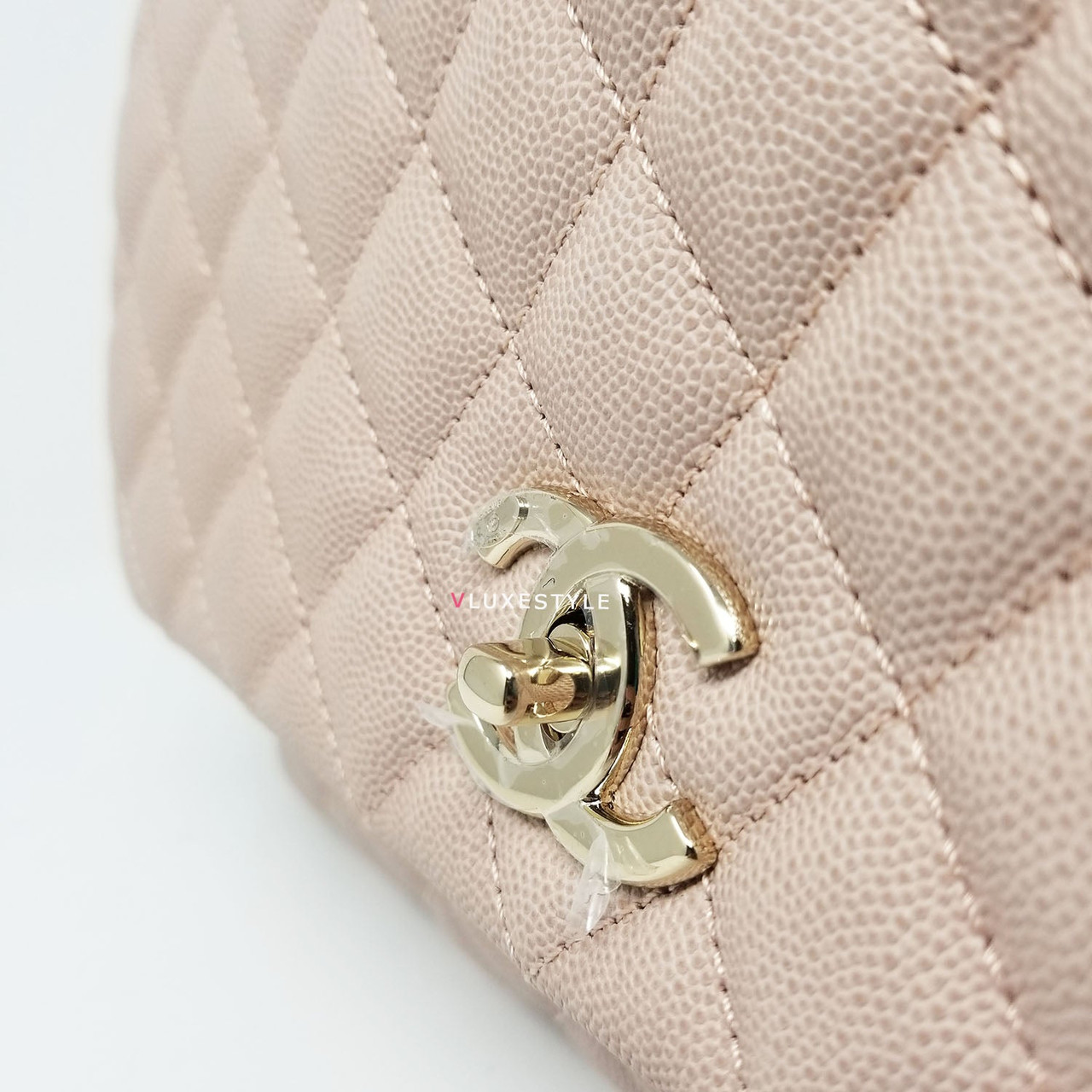 Authentic Chanel 19P Coco Handle Beige Quilted Caviar with shiny light gold hardware in size Small (one size bigger than Mini) This stylish shoulder bag is crafted of luxurious and durable caviar leather in gorgeous beige and shiny light gold hardware. It's the perfect neutral! Beautiful light beige color with a slight pink undertone, perfectly matched with light gold hardware. A very rare and highly sought-after combination, soft and very feminine. This shoulder bag features a light beige leather top handle and removable straps. Wear this bag handheld or over-the-shoulder.