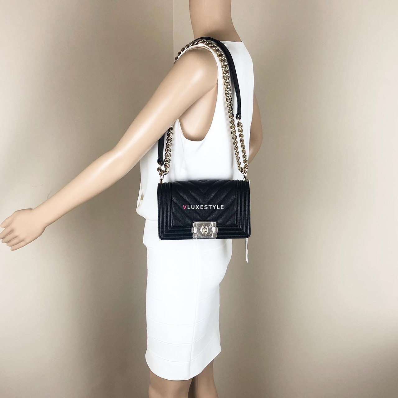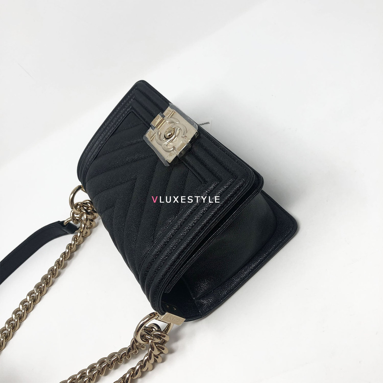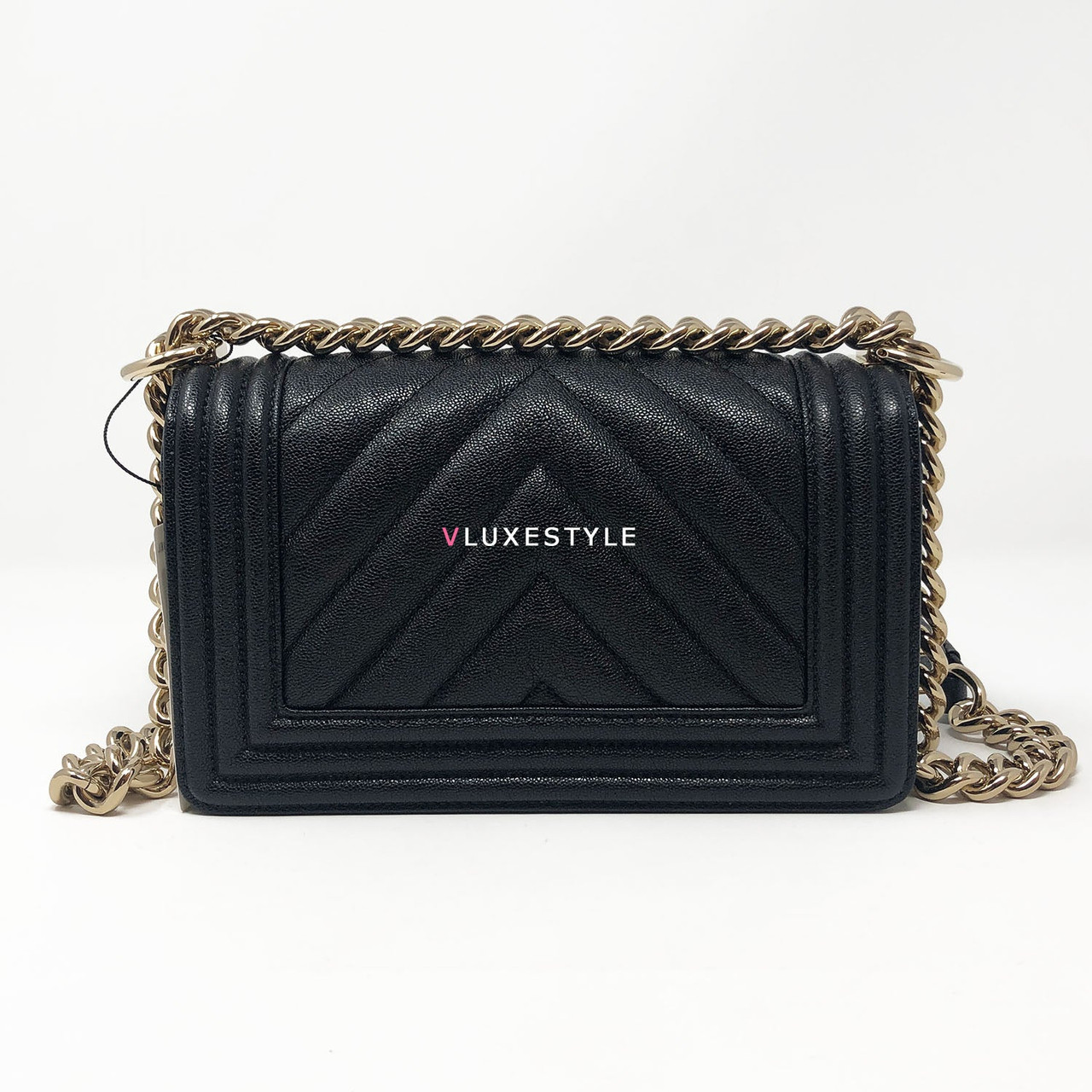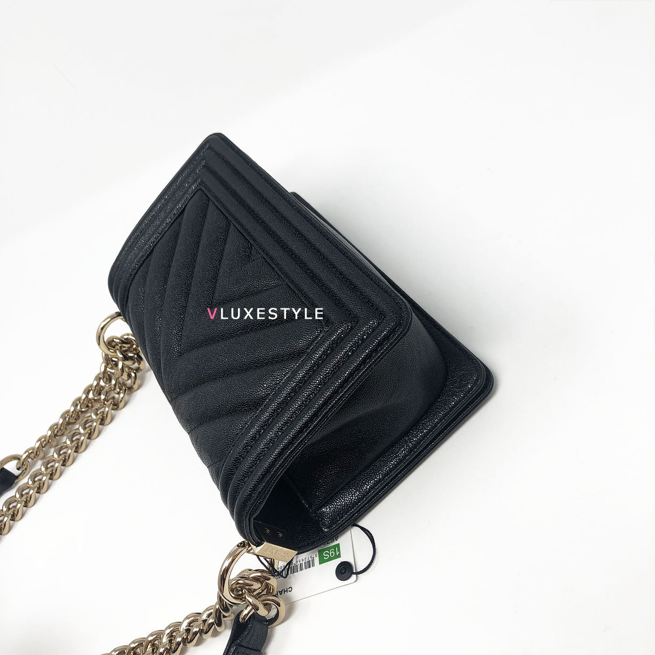 A very rare and highly sought-after combination! Authentic Chanel 19S Small Le Boy Black Chevron Caviar with shiny light gold hardware. This stylish shoulder bag is crafted of luxurious and durable caviar leather in gorgeous shiny jet black, perfectly matched with a beautiful chevron pattern and shiny light gold hardware. This combination will instantly dress up any outfit and effortlessly transition with you into the evening. The bag can be worn long and short over-the-shoulder bag and crossbody.