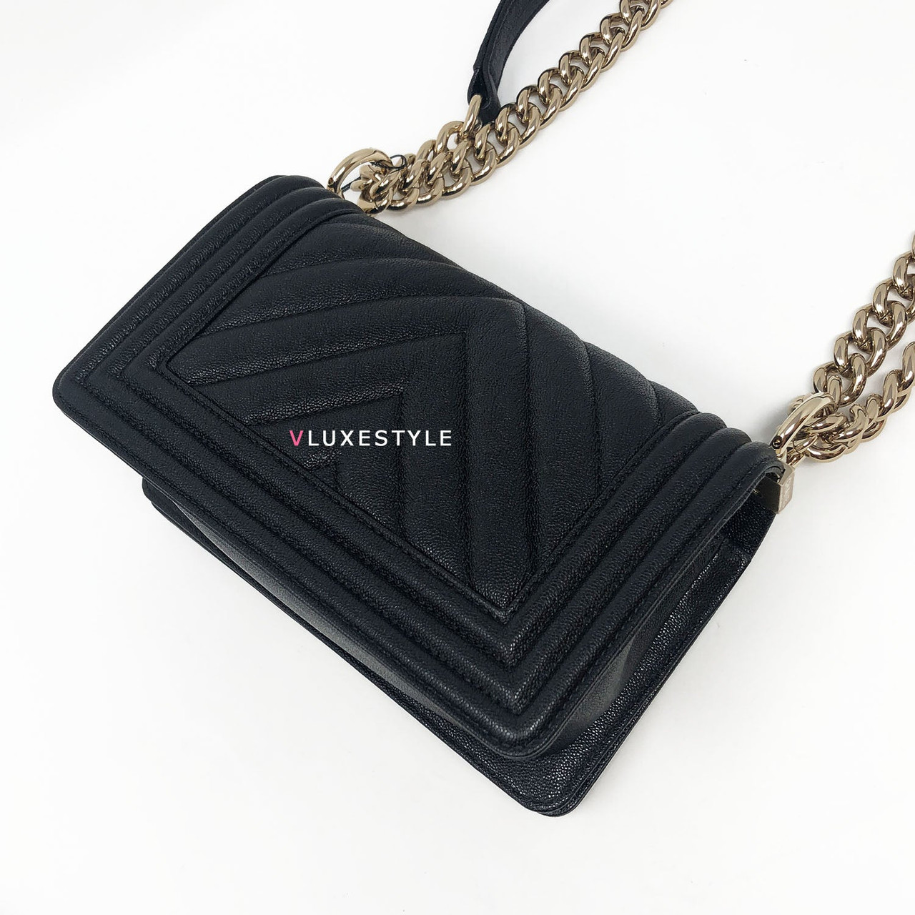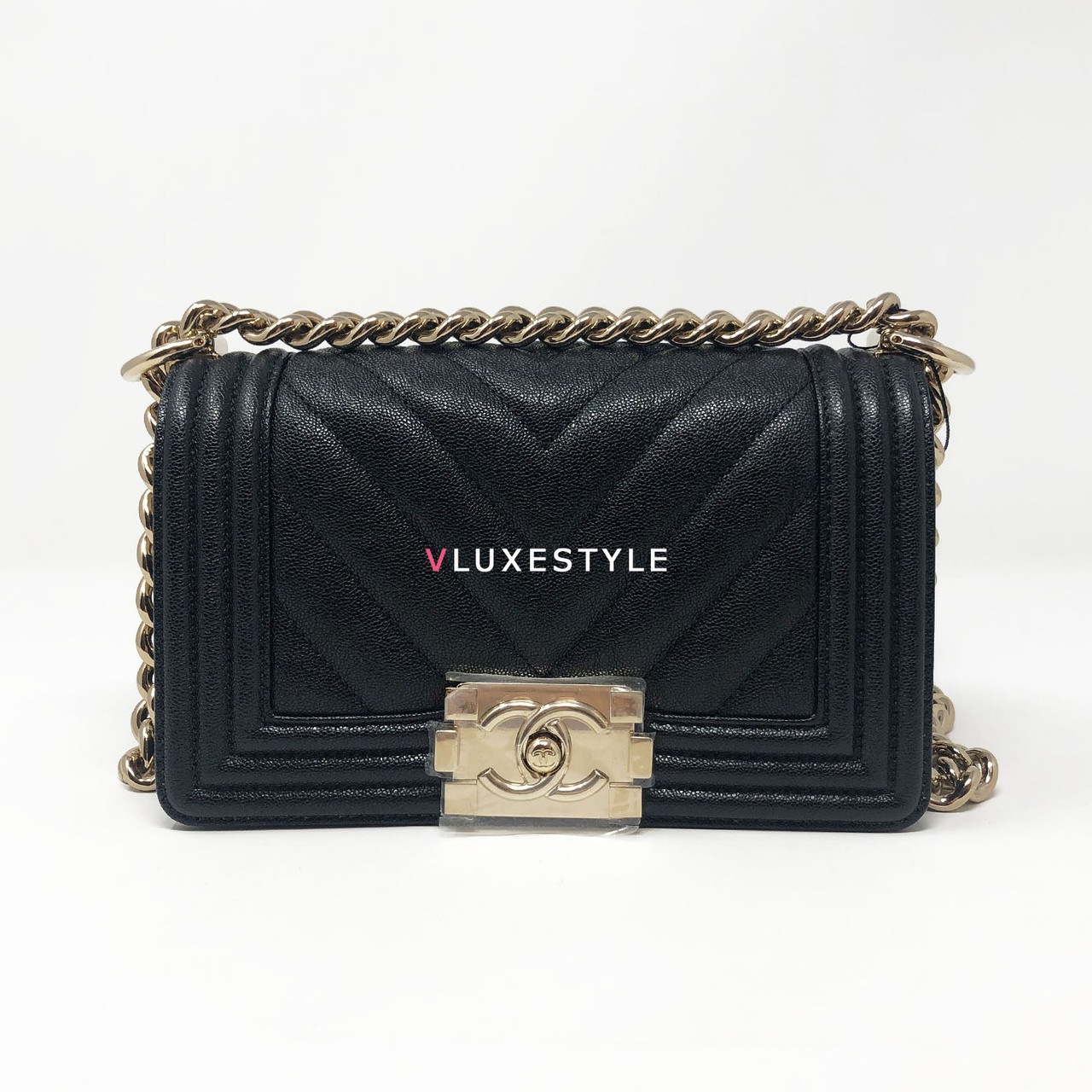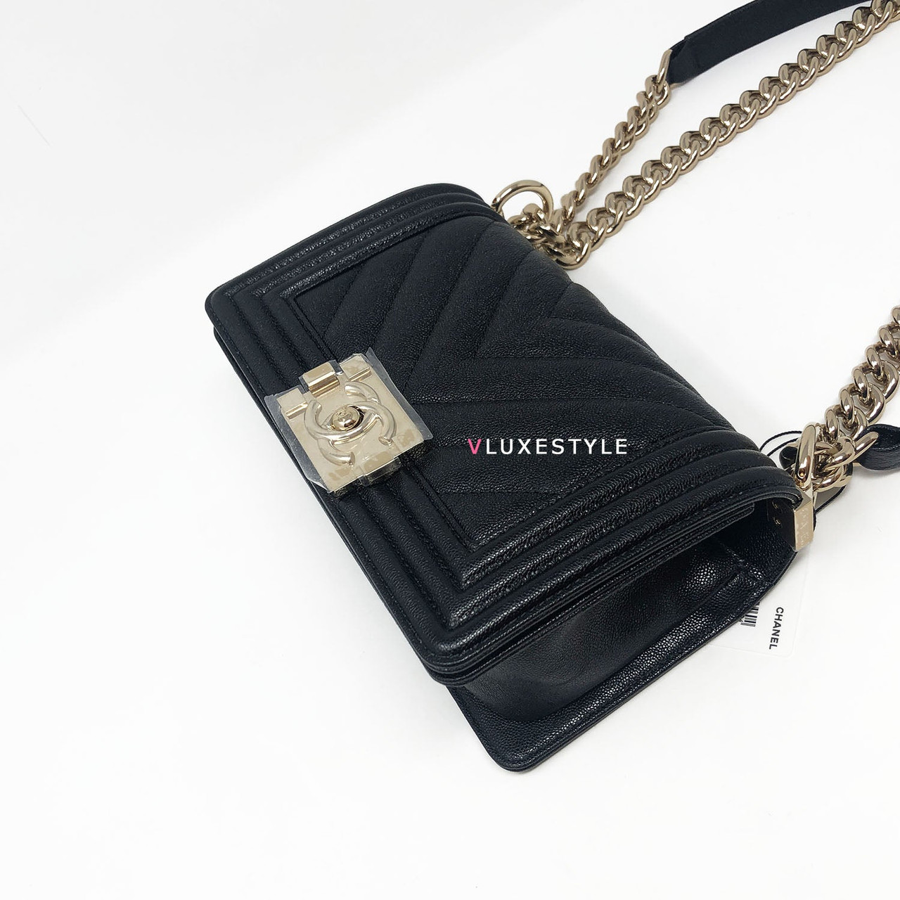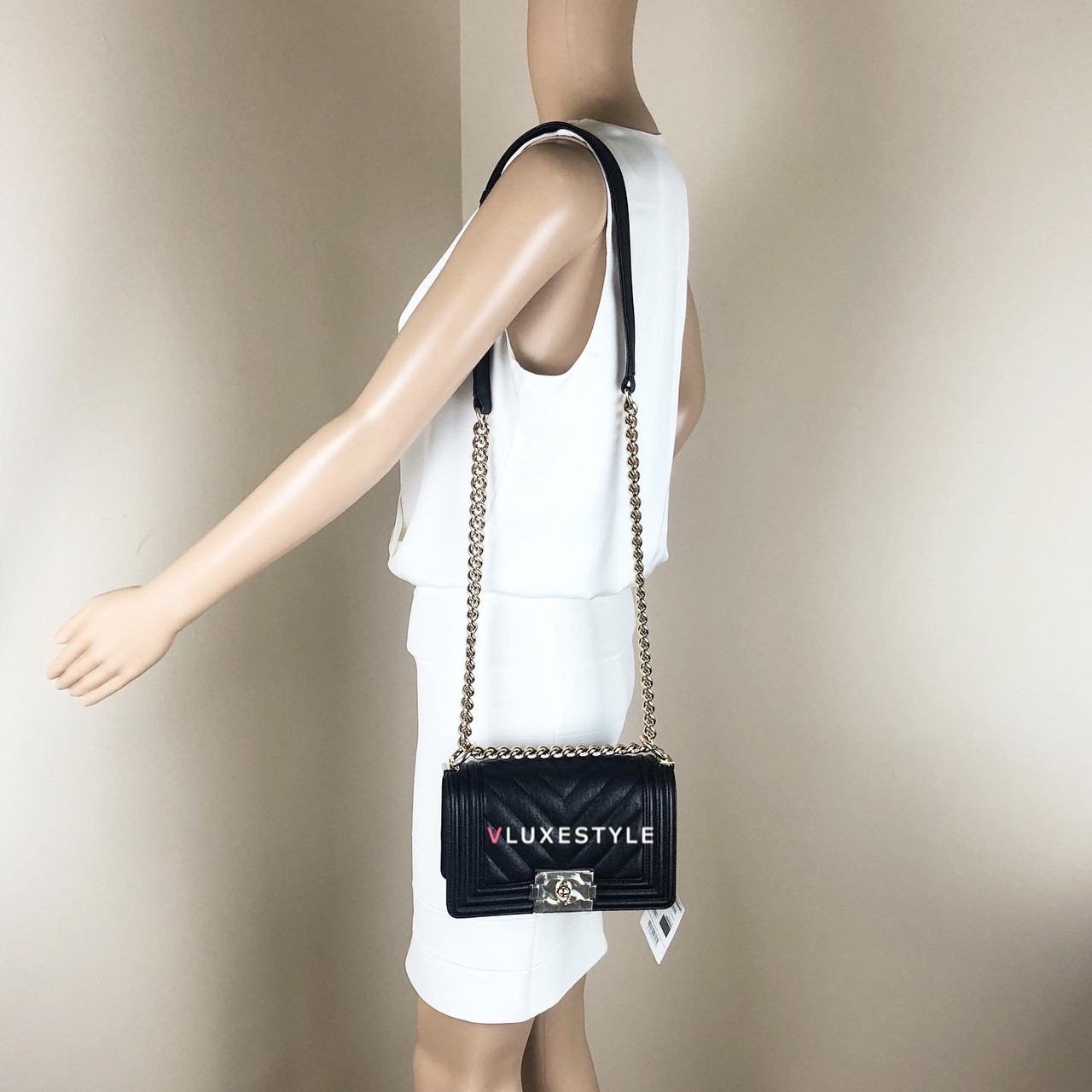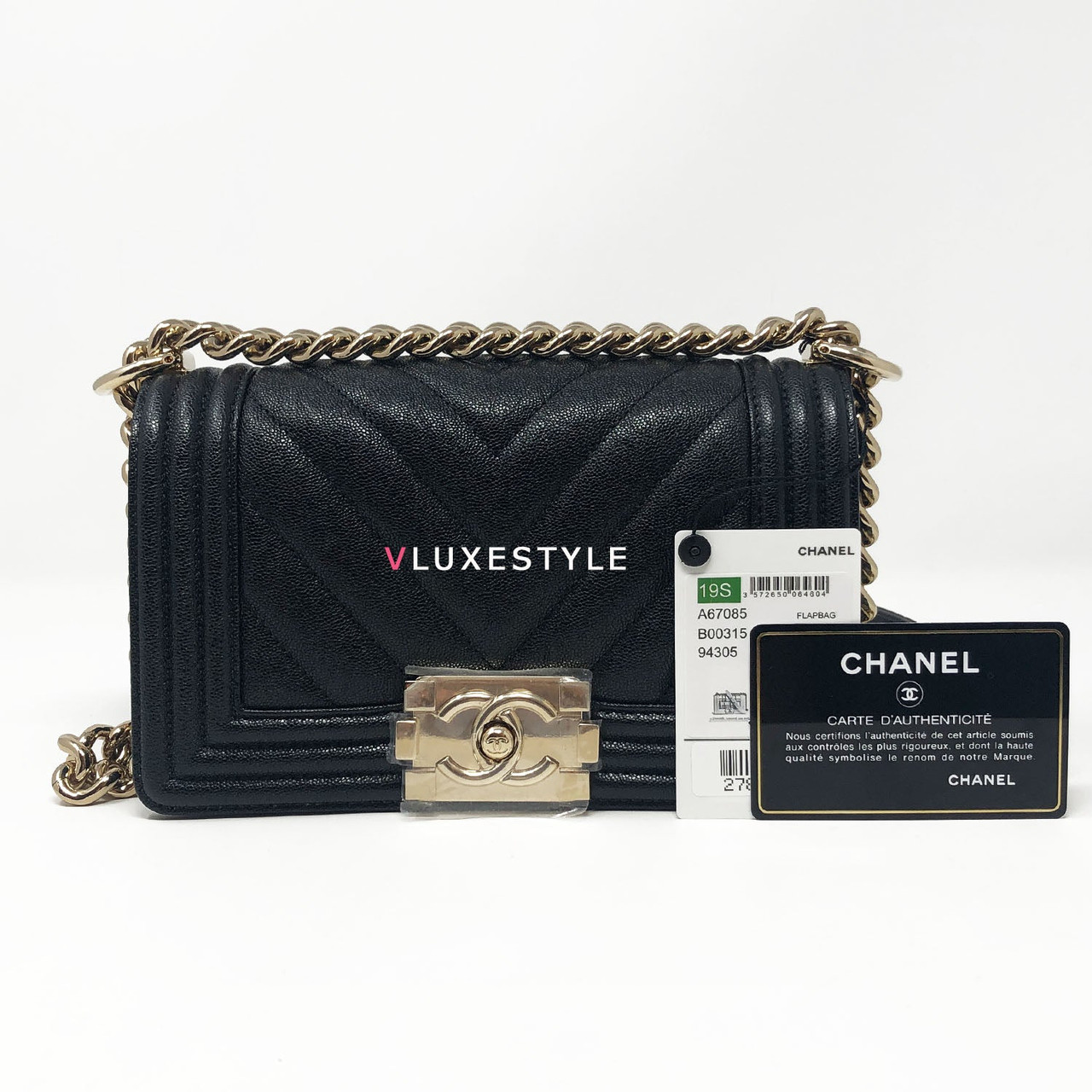 A very rare and highly sought-after combination! Authentic Chanel 19S Small Le Boy Black Chevron Caviar with shiny light gold hardware. This stylish shoulder bag is crafted of luxurious and durable caviar leather in gorgeous shiny jet black, perfectly matched with a beautiful chevron pattern and shiny light gold hardware. This combination will instantly dress up any outfit and effortlessly transition with you into the evening. The bag can be worn long and short over-the-shoulder bag and crossbody.