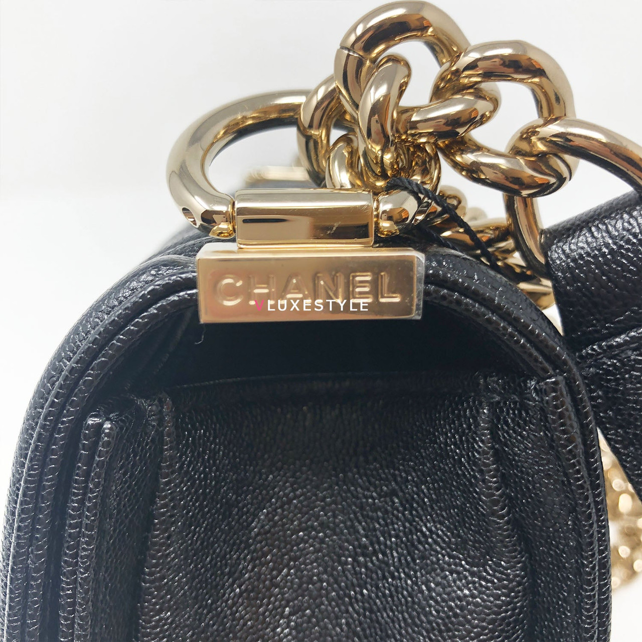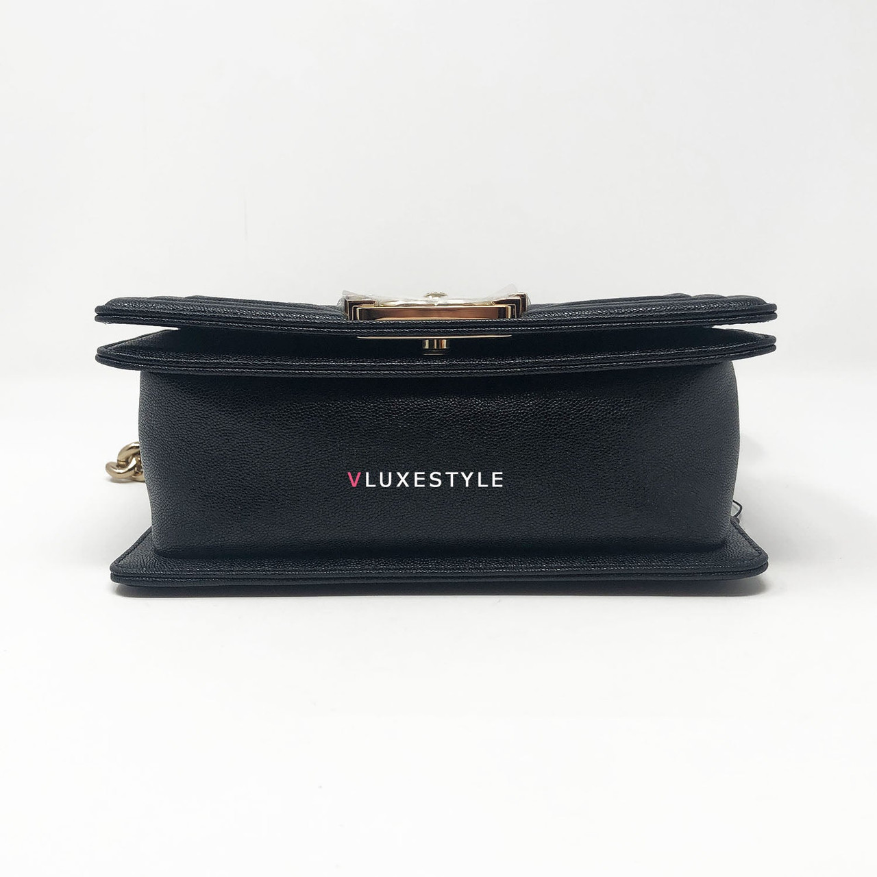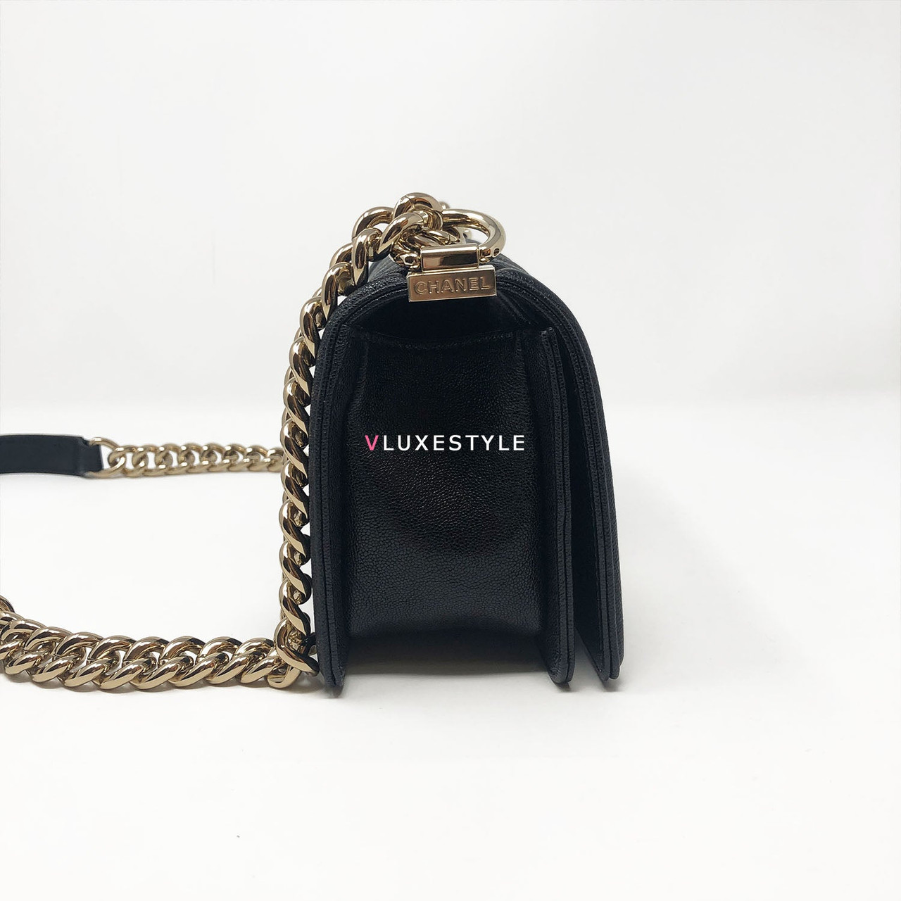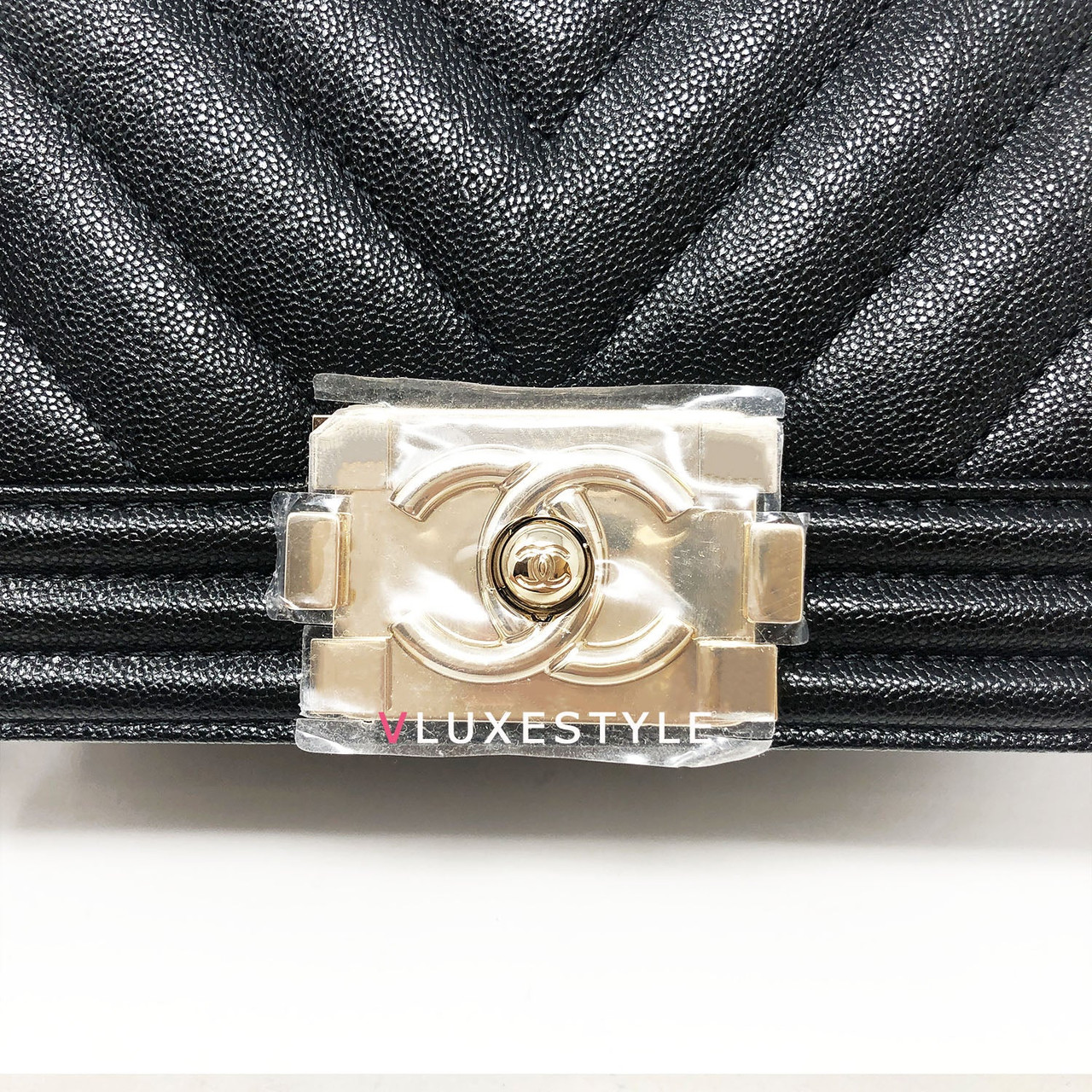 A very rare and highly sought-after combination! Authentic Chanel 19S Small Le Boy Black Chevron Caviar with shiny light gold hardware. This stylish shoulder bag is crafted of luxurious and durable caviar leather in gorgeous shiny jet black, perfectly matched with a beautiful chevron pattern and shiny light gold hardware. This combination will instantly dress up any outfit and effortlessly transition with you into the evening. The bag can be worn long and short over-the-shoulder bag and crossbody.