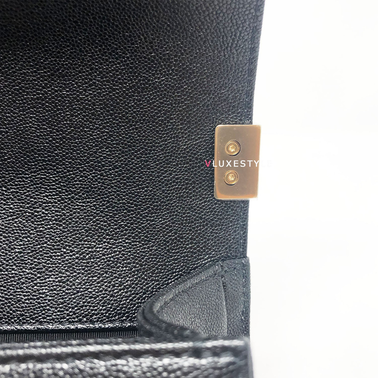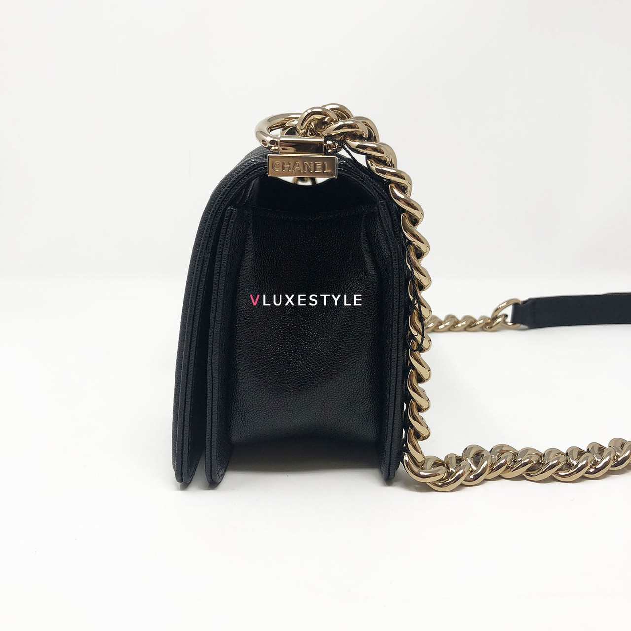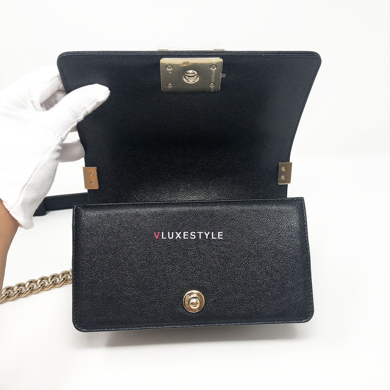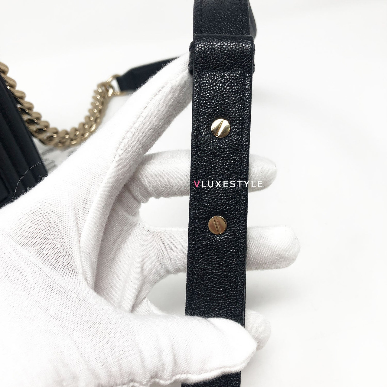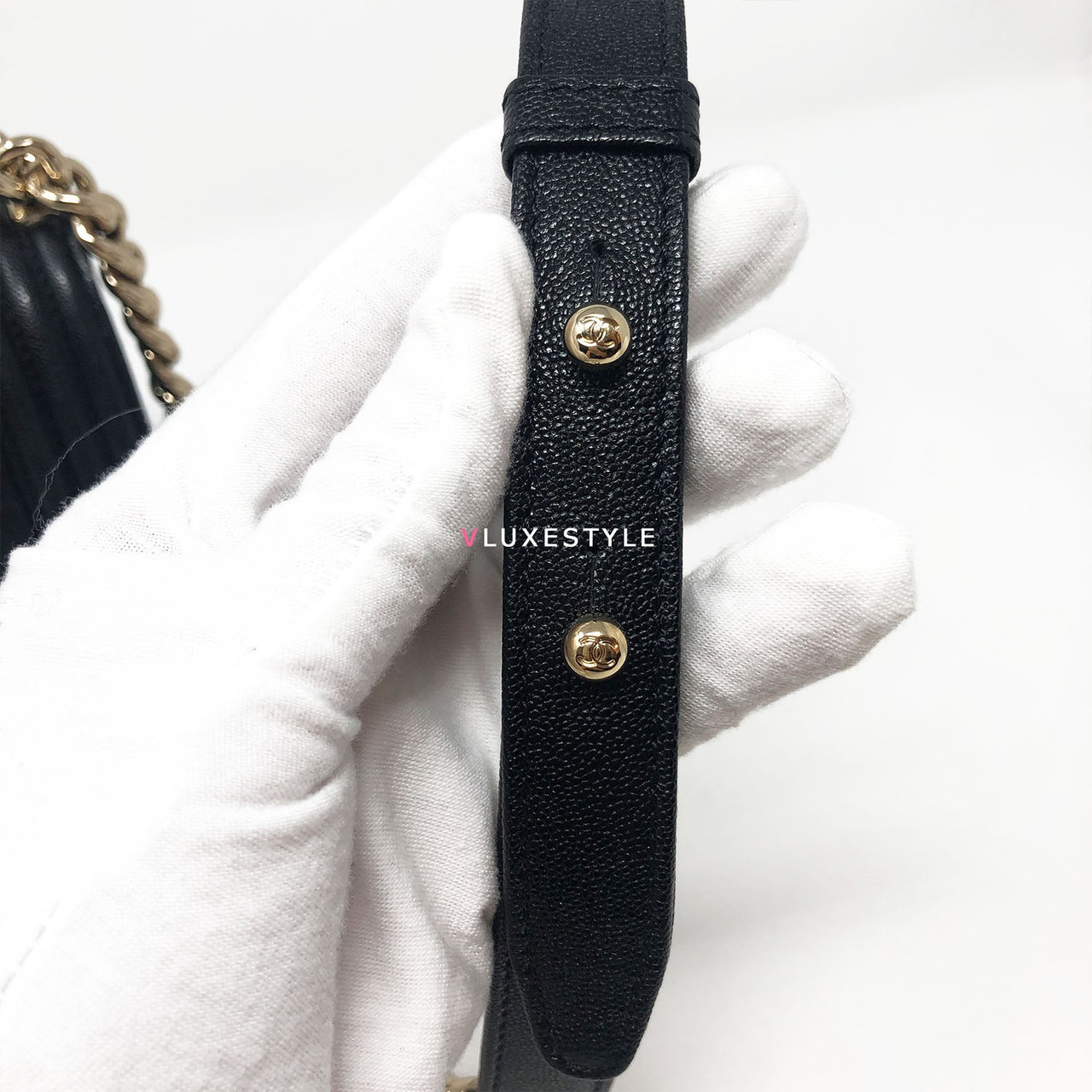 A very rare and highly sought-after combination! Authentic Chanel 19S Small Le Boy Black Chevron Caviar with shiny light gold hardware. This stylish shoulder bag is crafted of luxurious and durable caviar leather in gorgeous shiny jet black, perfectly matched with a beautiful chevron pattern and shiny light gold hardware. This combination will instantly dress up any outfit and effortlessly transition with you into the evening. The bag can be worn long and short over-the-shoulder bag and crossbody.