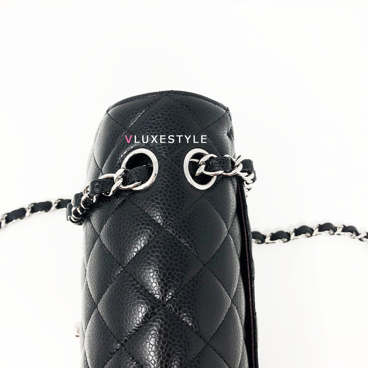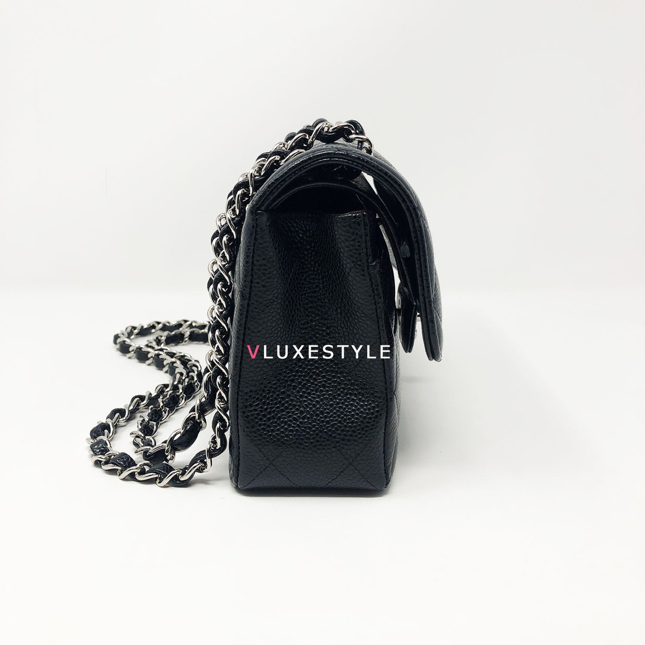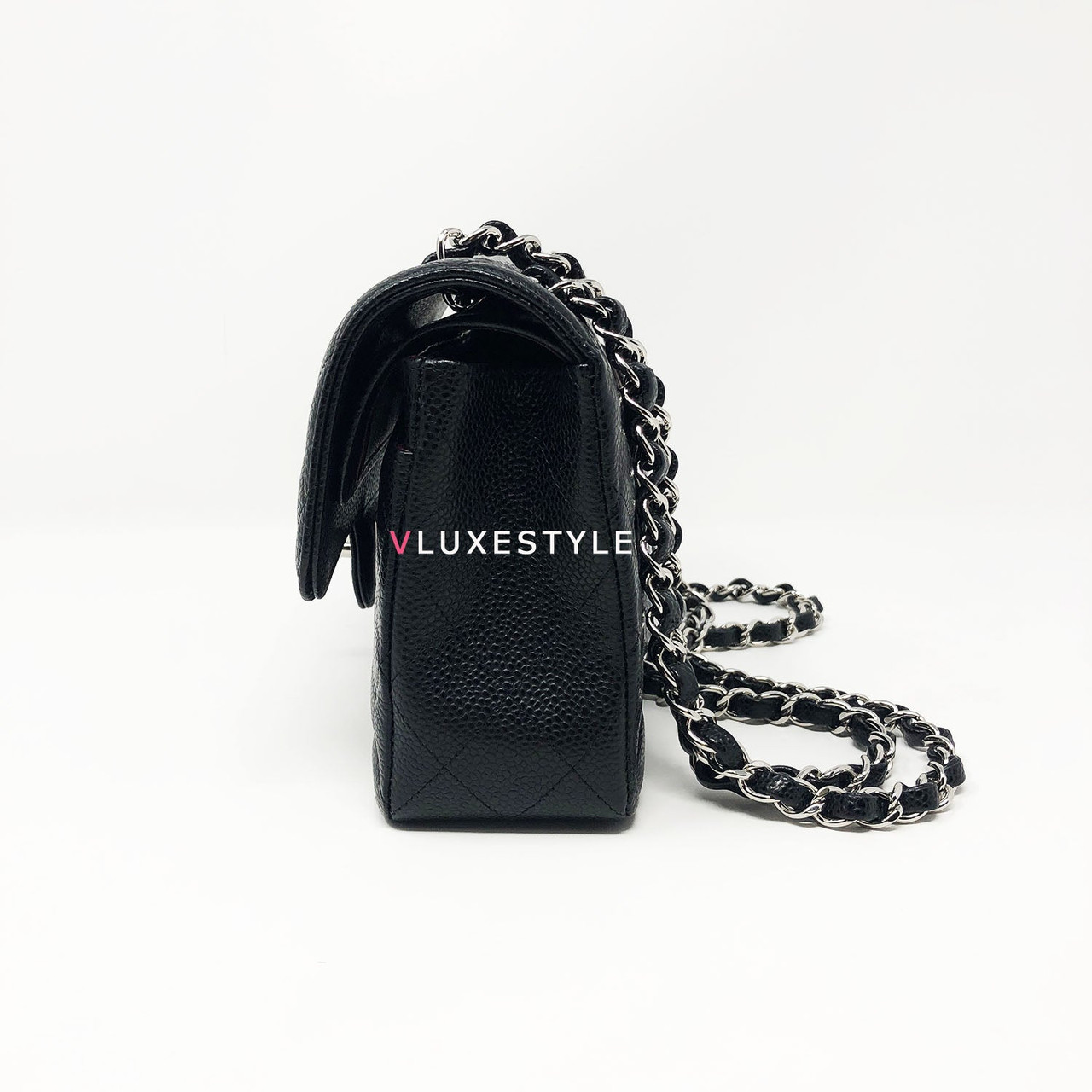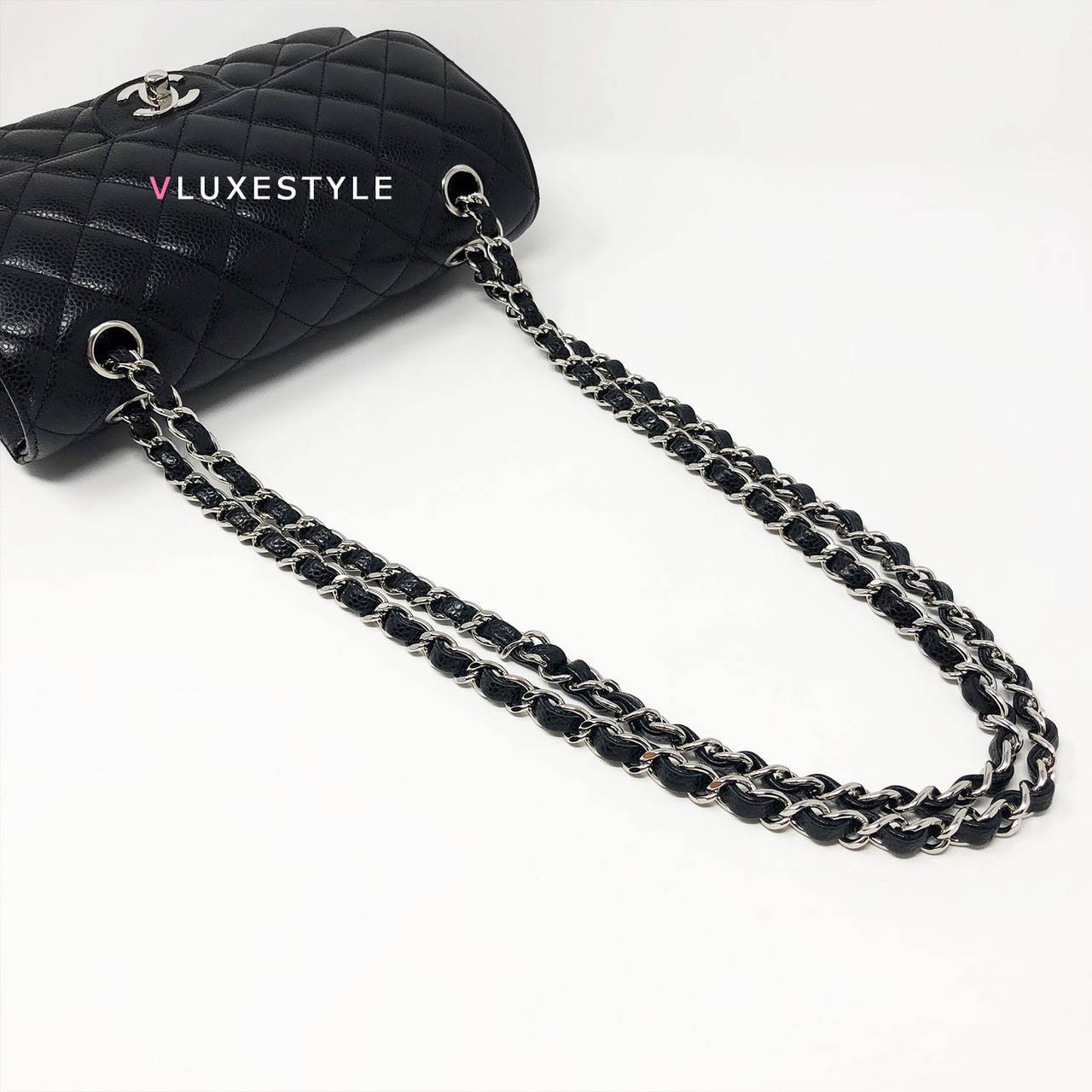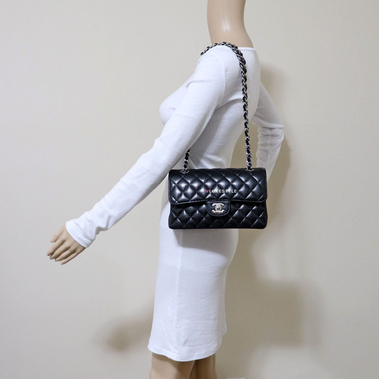 Rare and Gorgeous! Authentic Chanel Classic Small Double Flap Black Caviar with silver hardware with lengthened straps. This timeless and stylish shoulder bag is crafted of luxurious and durable quilted caviar leather in shiny jet black, quilting is puffy with silver hardware.