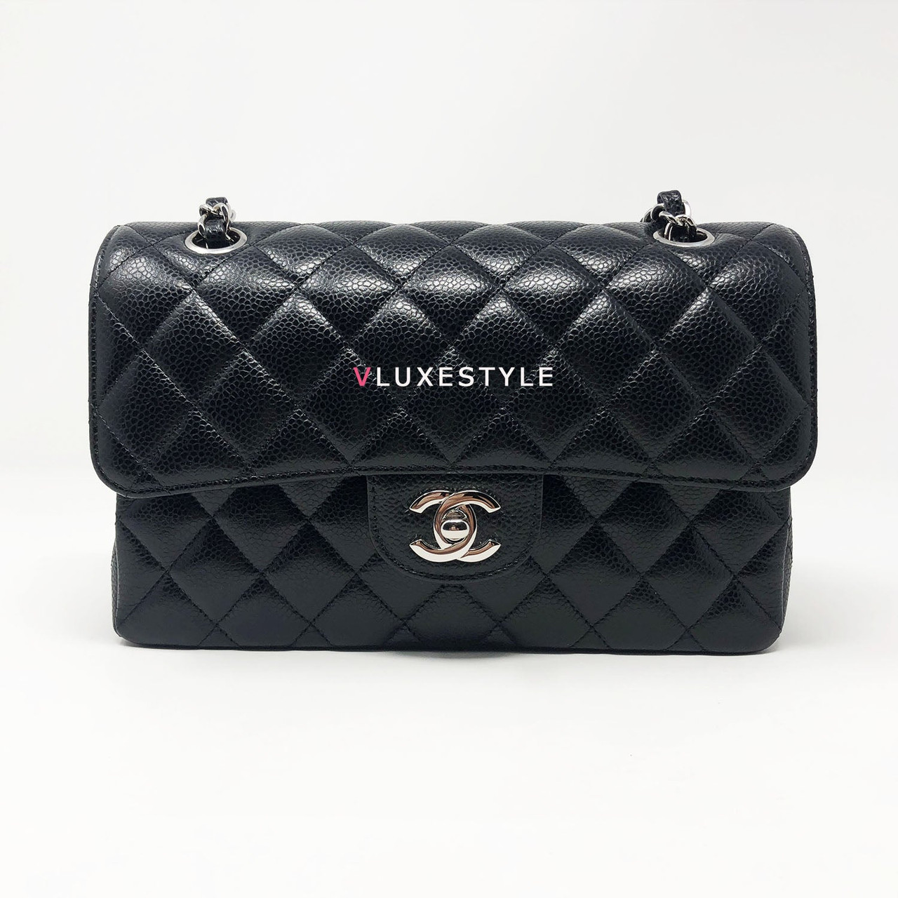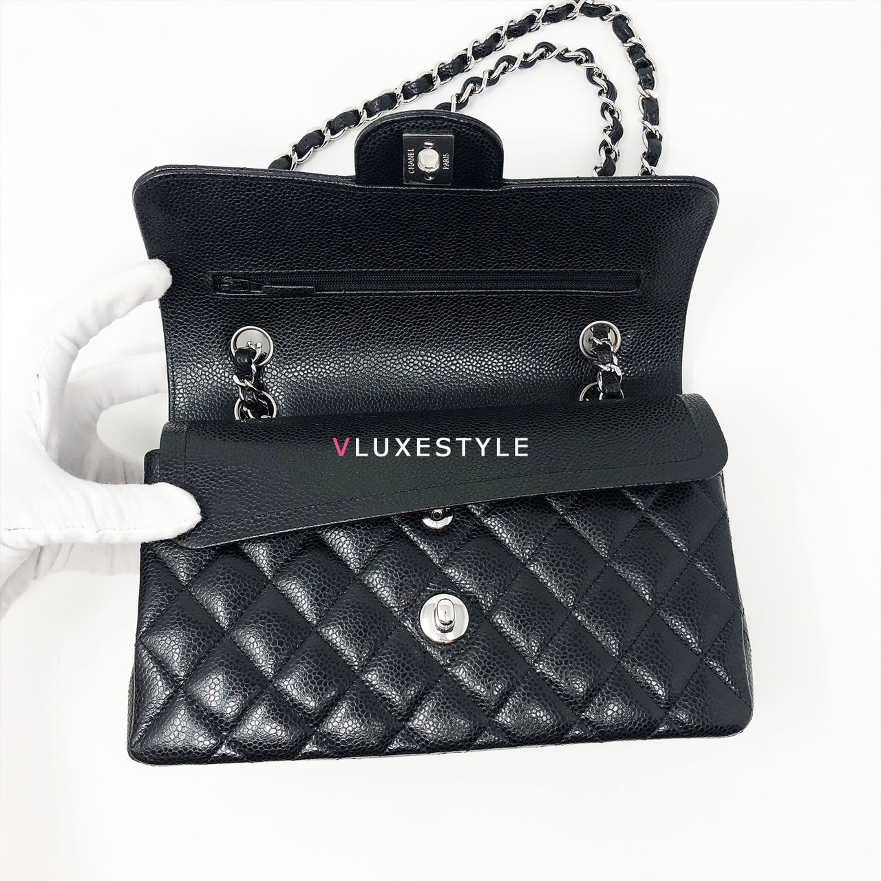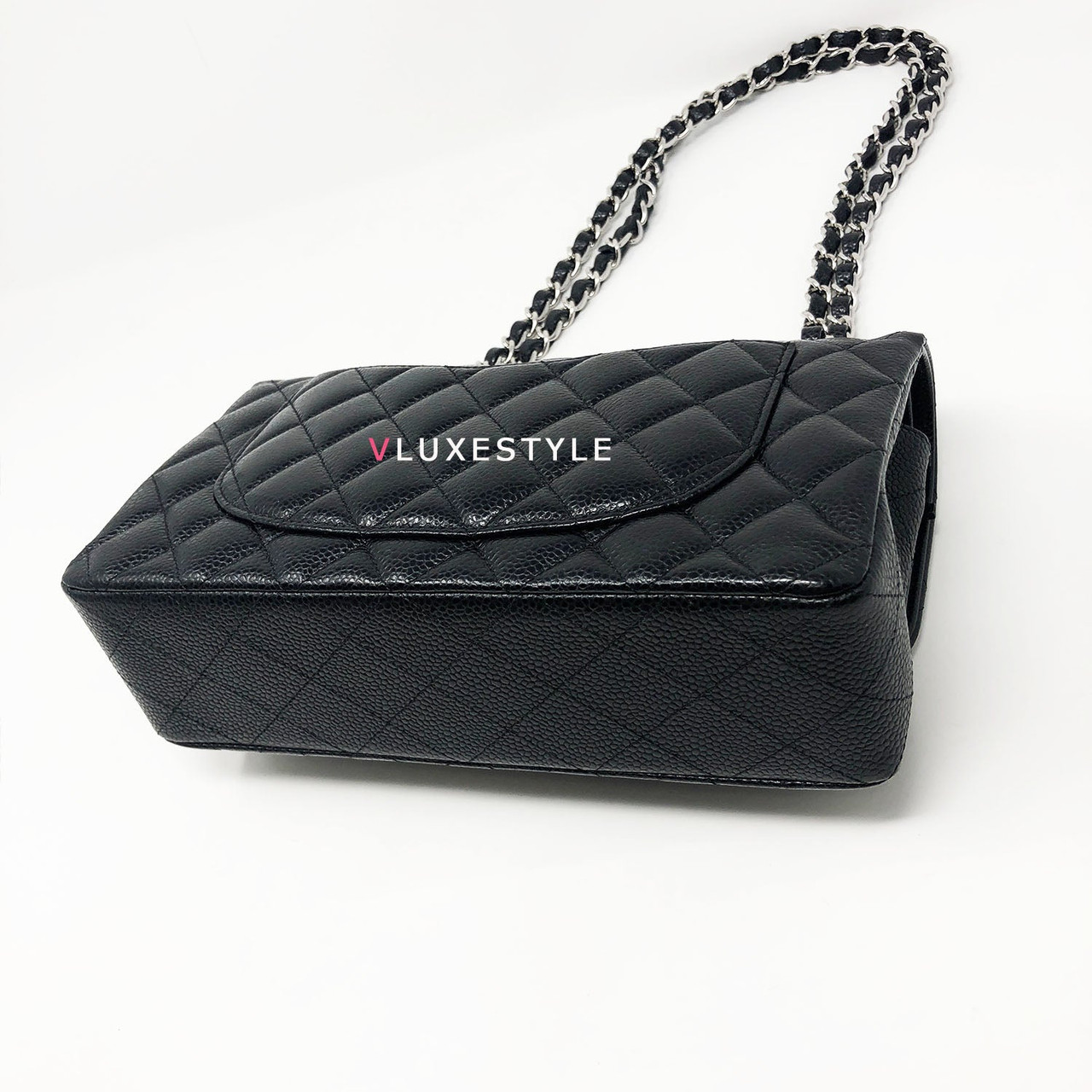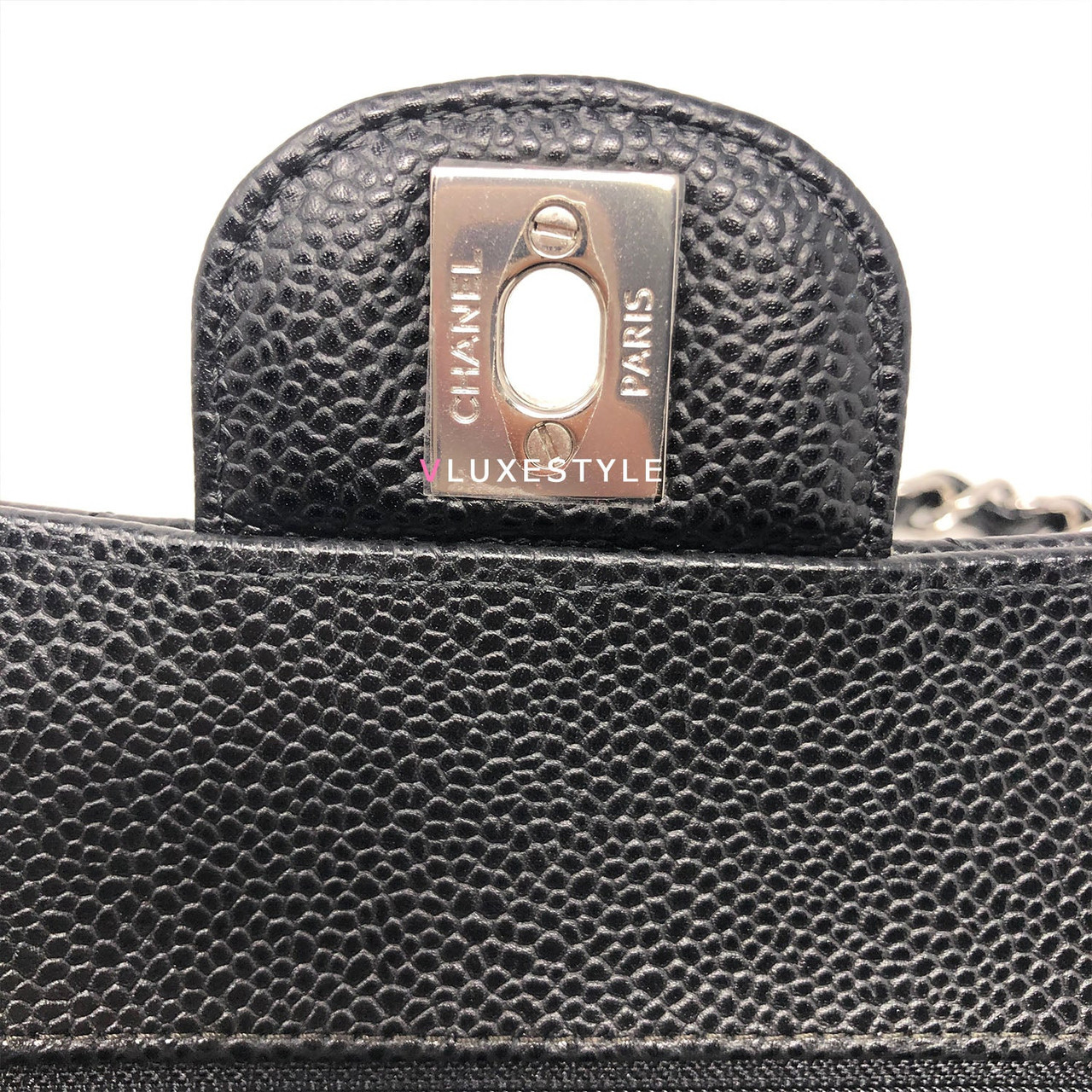 Rare and Gorgeous! Authentic Chanel Classic Small Double Flap Black Caviar with silver hardware with lengthened straps. This timeless and stylish shoulder bag is crafted of luxurious and durable quilted caviar leather in shiny jet black, quilting is puffy with silver hardware.
