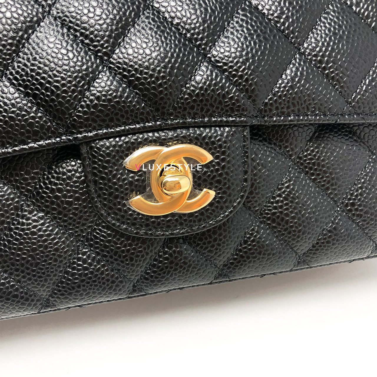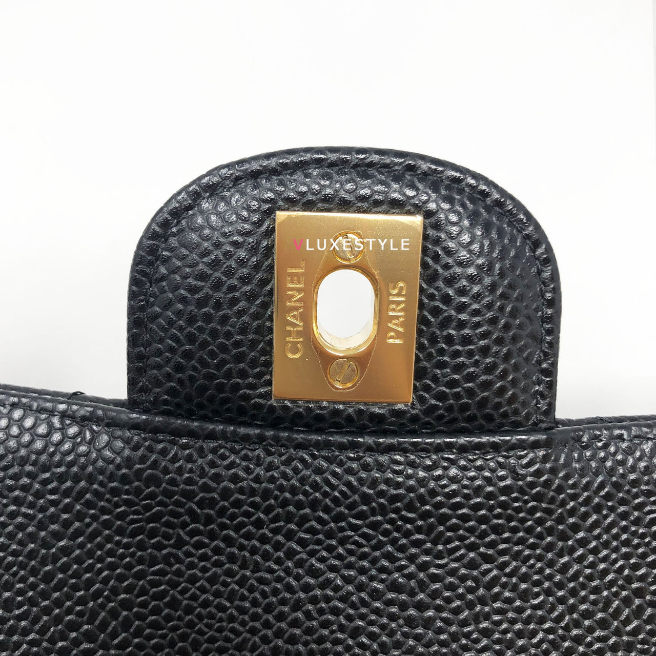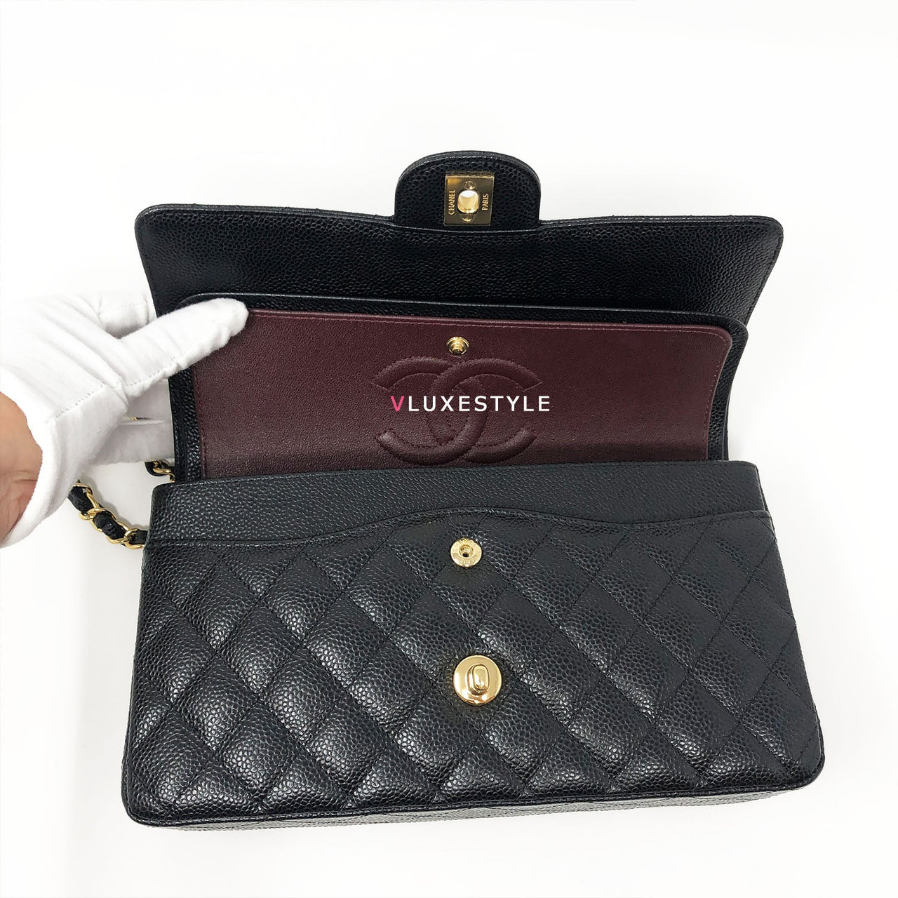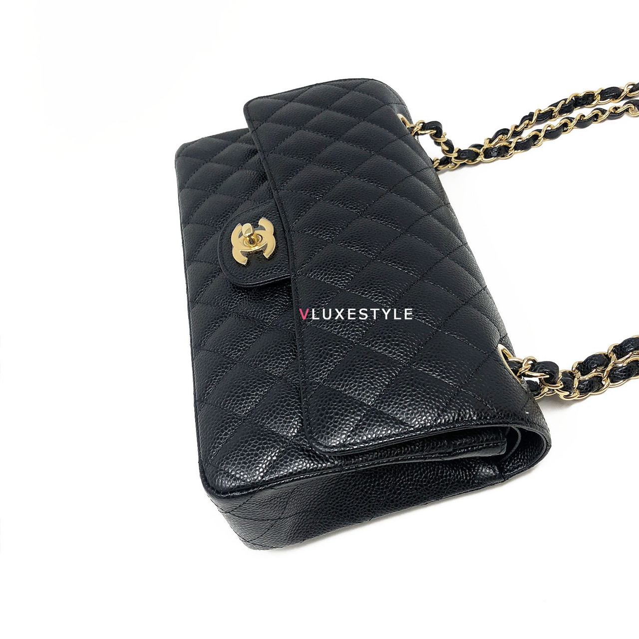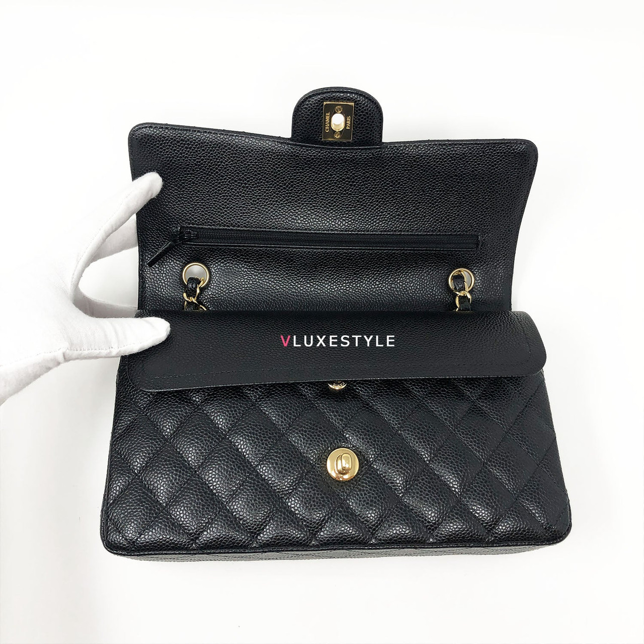 Authentic Chanel Classic Black Quilted Caviar Medium Double Flap with gold hardware. This timeless and stylish shoulder bag is crafted of luxurious and durable quilted caviar leather in shiny jet black and gold hardware. The bag can be worn long and short over-the-shoulder. It's the most classic and timeless piece of Chanel. Classy and elegant! it’s the perfect bag for every occasion.