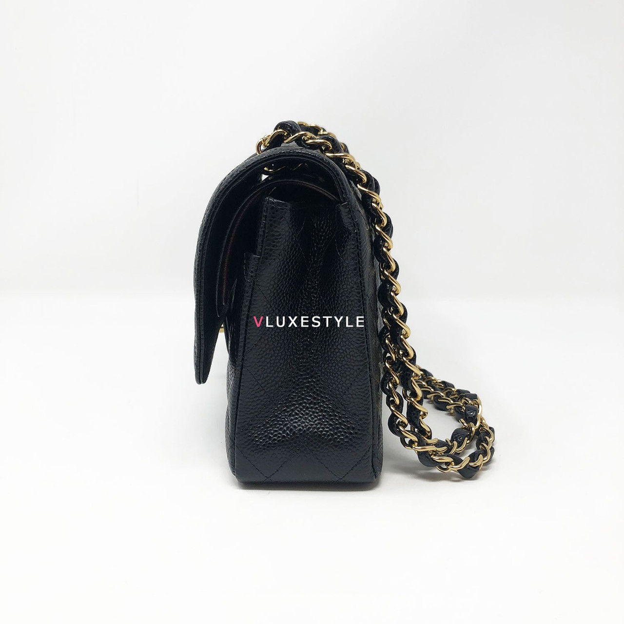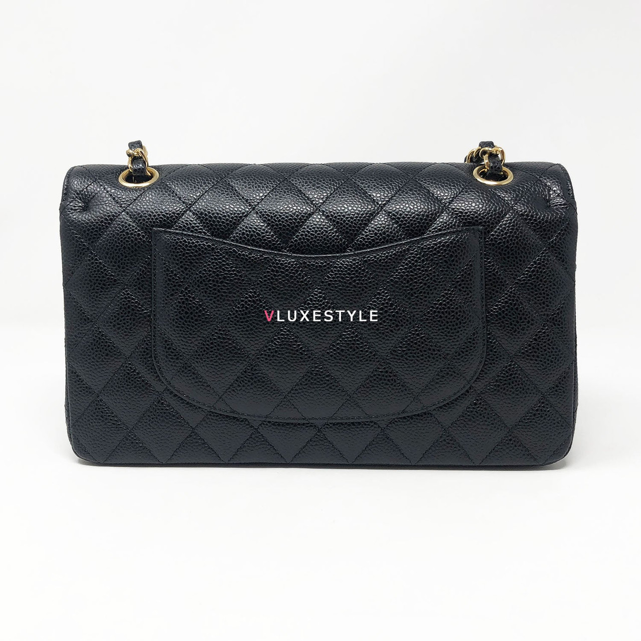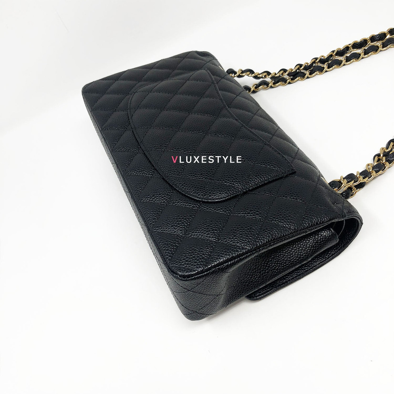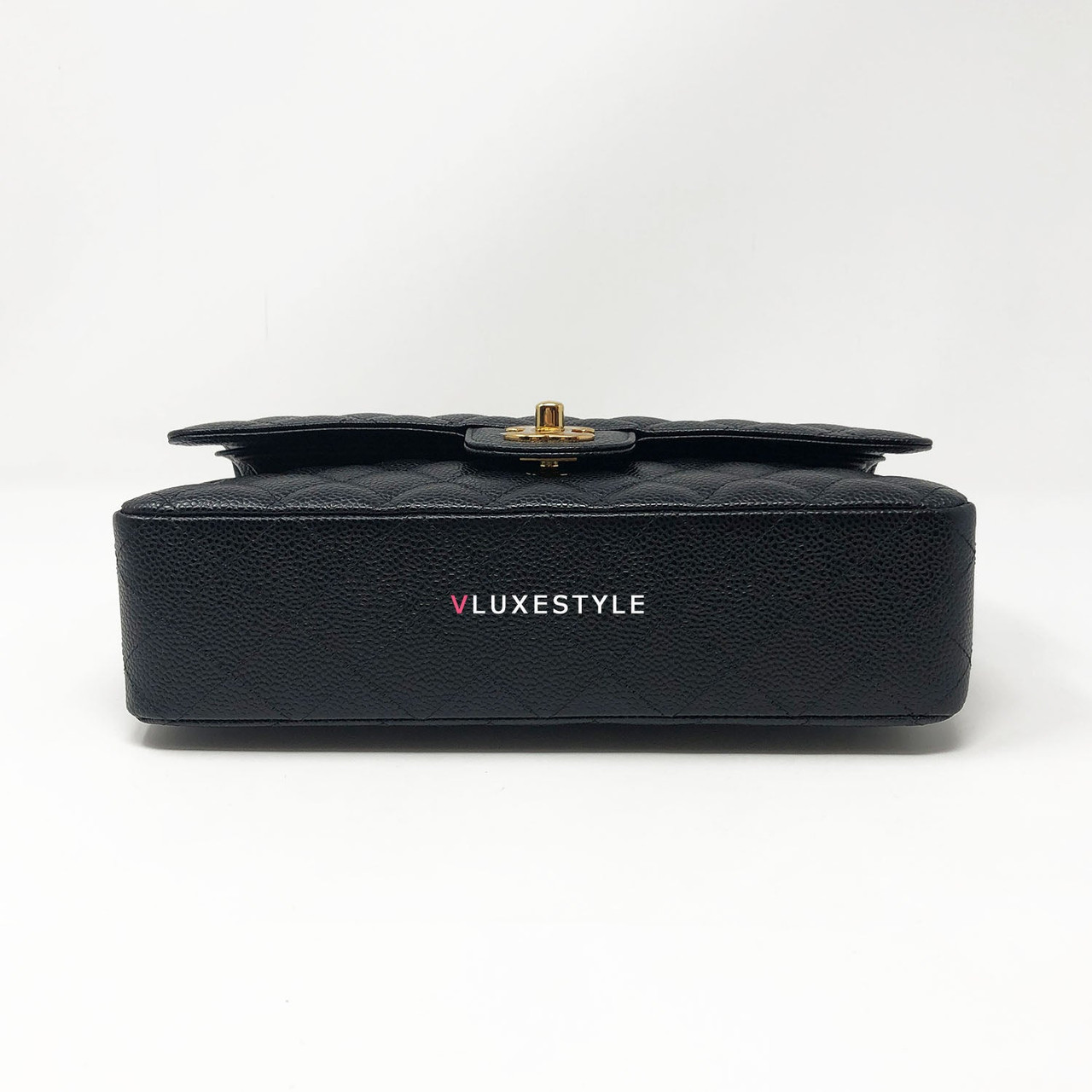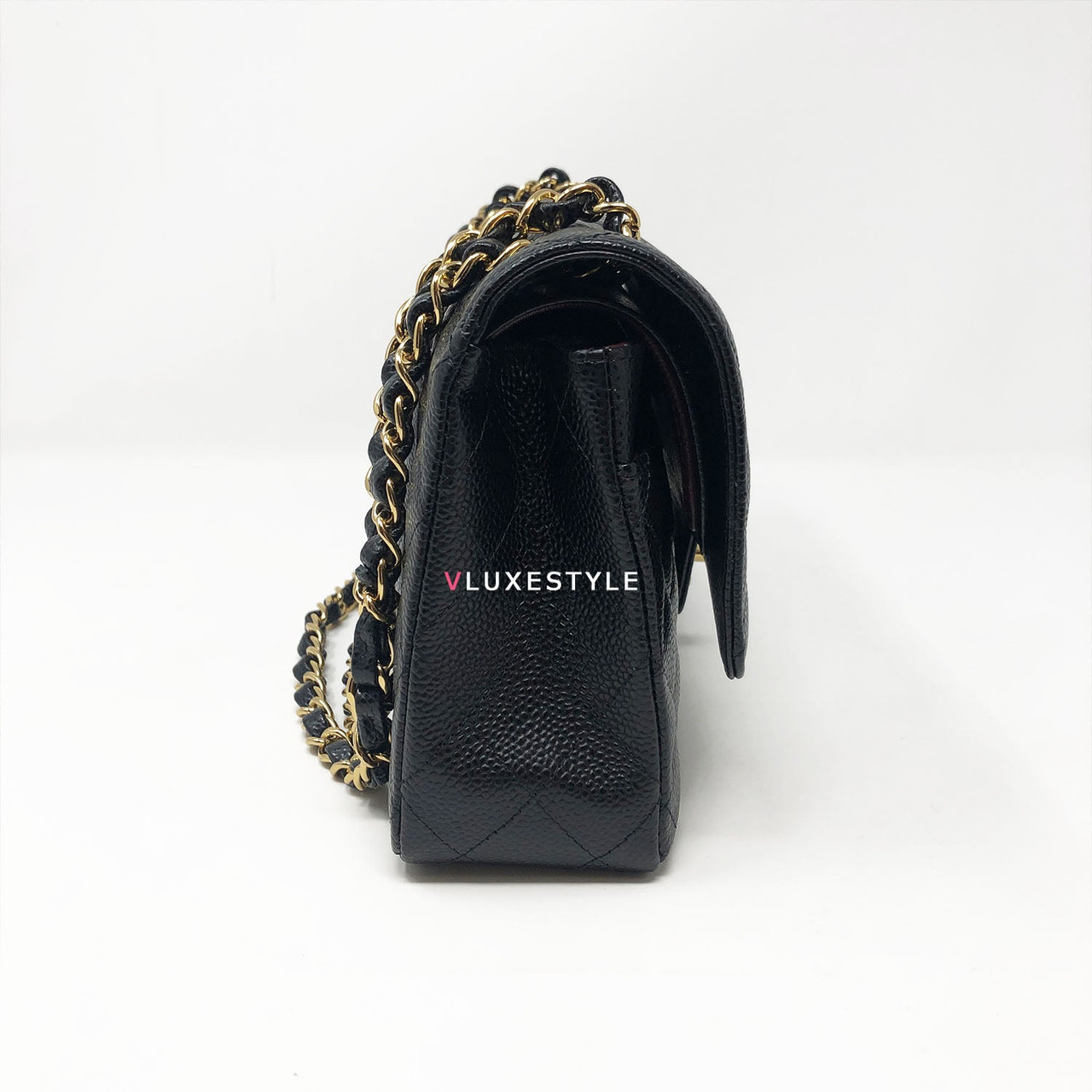 Authentic Chanel Classic Black Quilted Caviar Medium Double Flap with gold hardware. This timeless and stylish shoulder bag is crafted of luxurious and durable quilted caviar leather in shiny jet black and gold hardware. The bag can be worn long and short over-the-shoulder. It's the most classic and timeless piece of Chanel. Classy and elegant! it’s the perfect bag for every occasion.