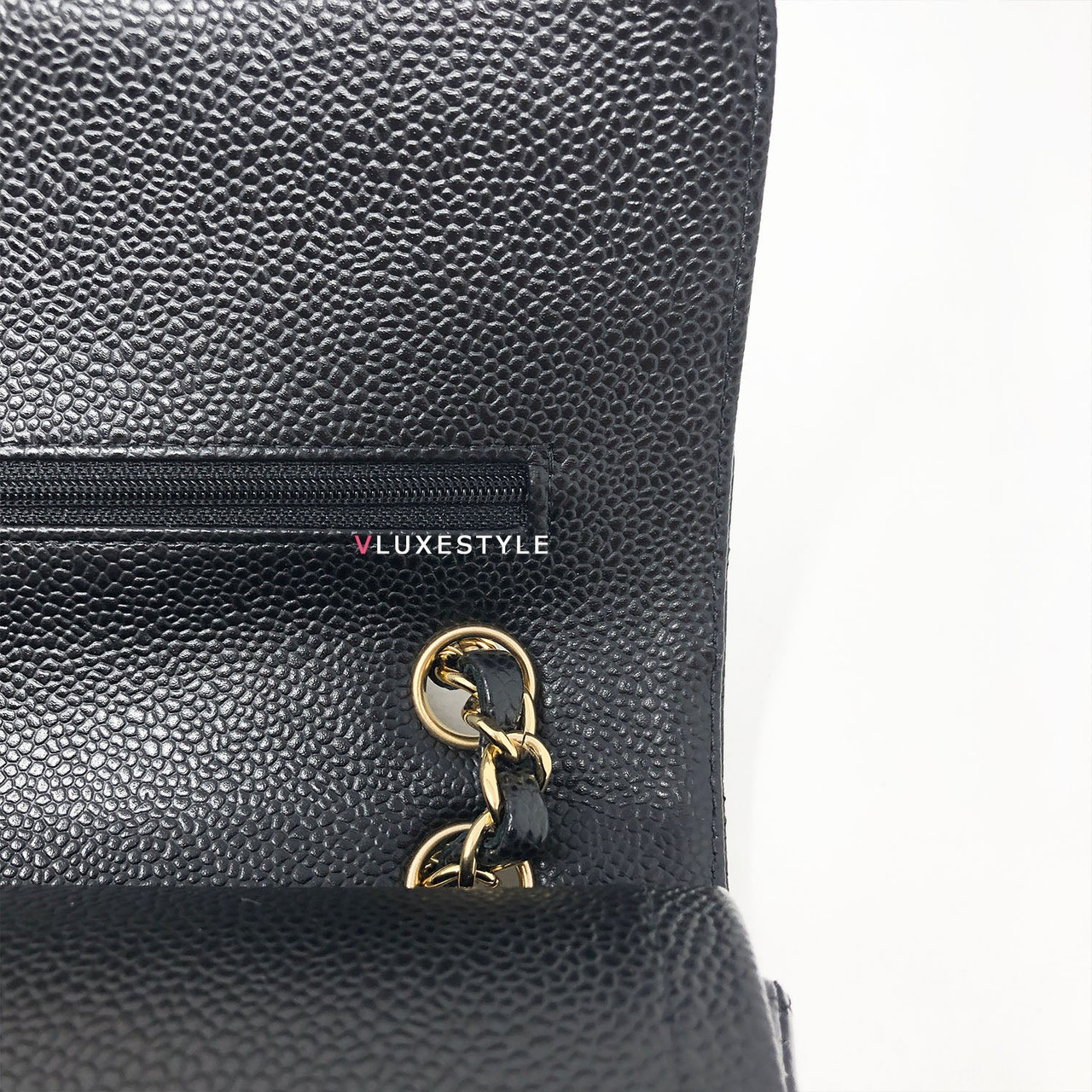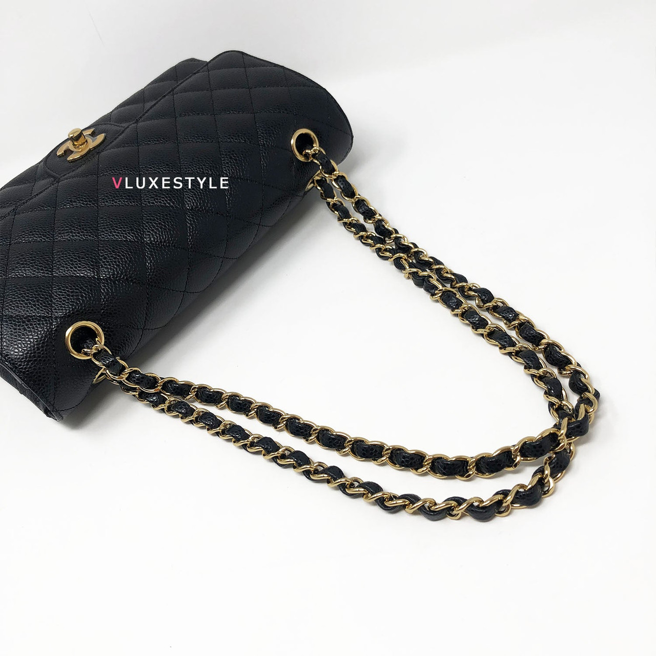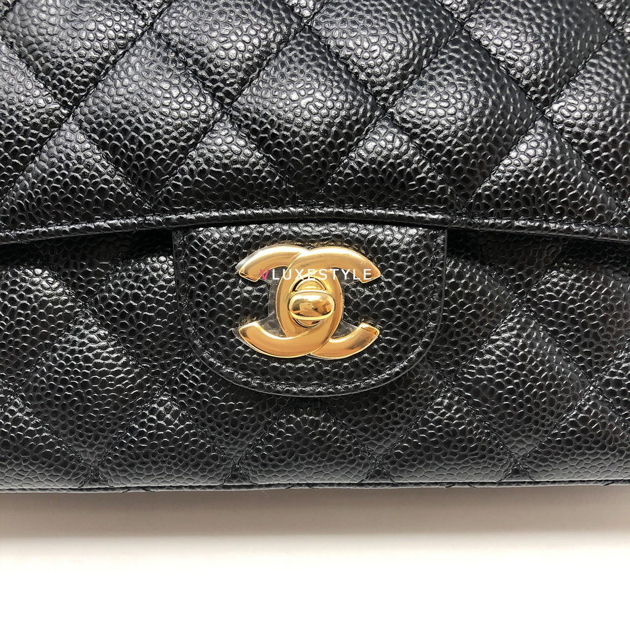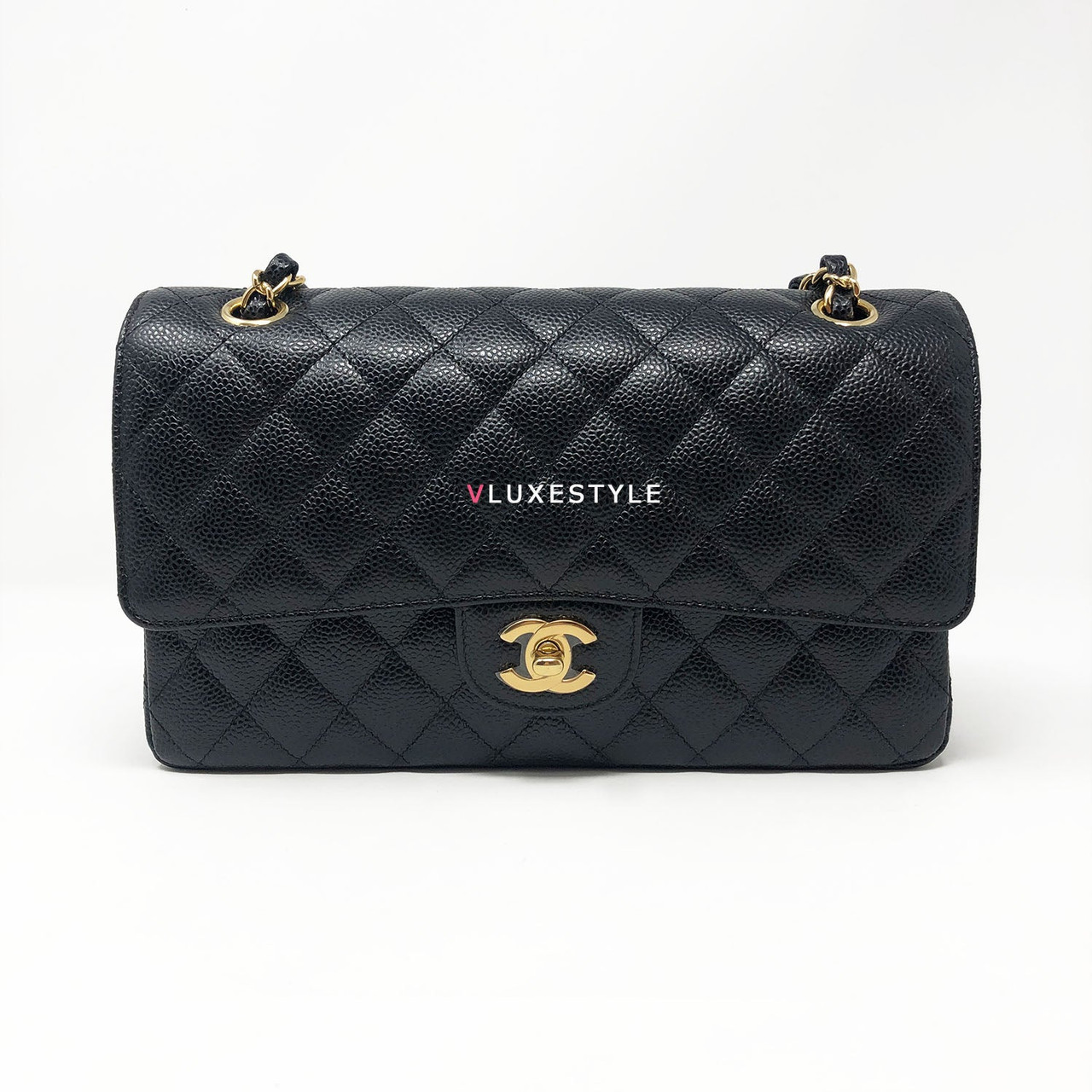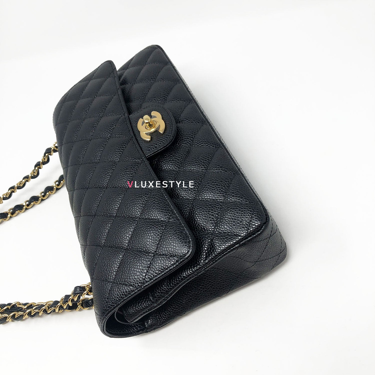Authentic Chanel Classic Black Quilted Caviar Medium Double Flap with gold hardware. This timeless and stylish shoulder bag is crafted of luxurious and durable quilted caviar leather in shiny jet black and gold hardware. The bag can be worn long and short over-the-shoulder. It's the most classic and timeless piece of Chanel. Classy and elegant! it’s the perfect bag for every occasion.