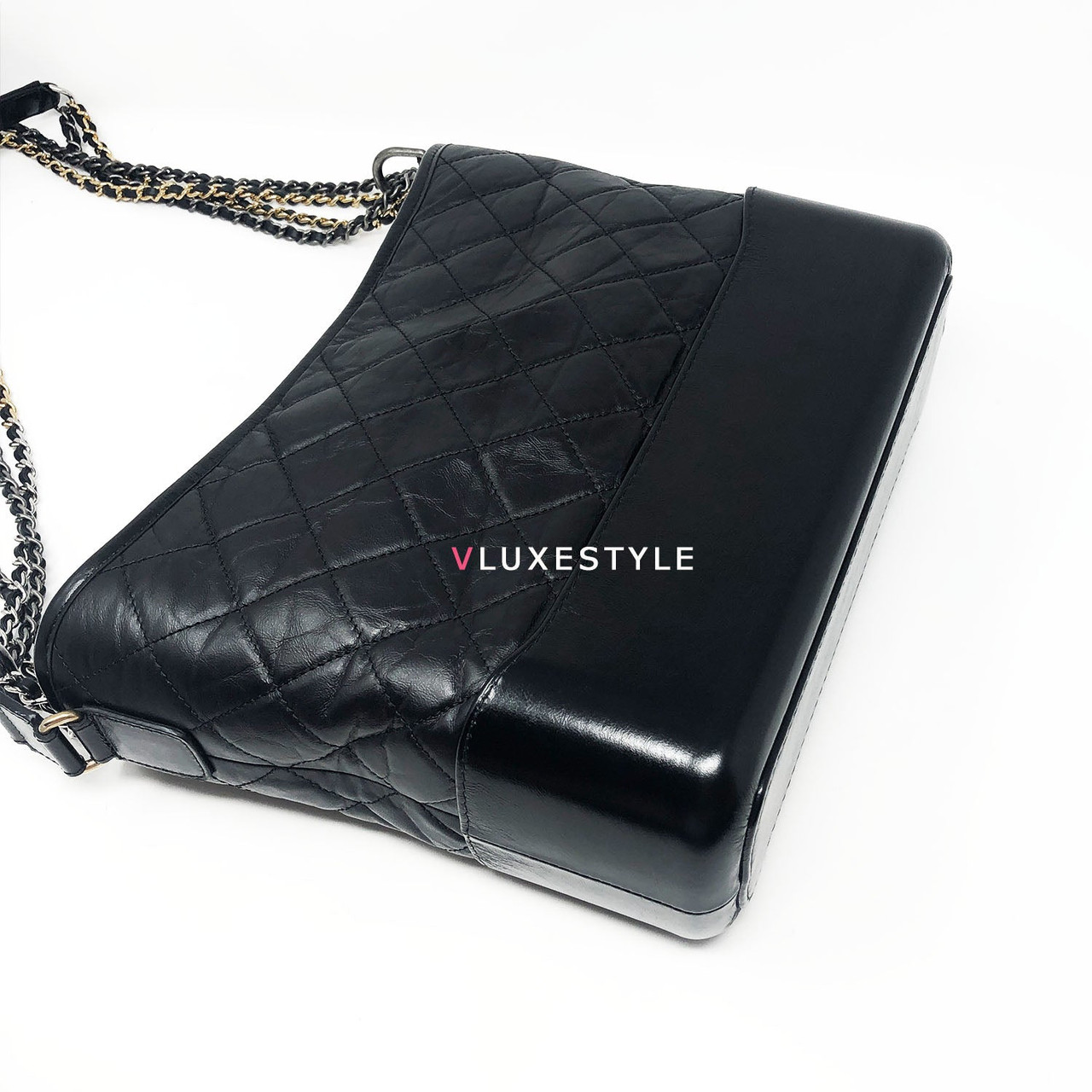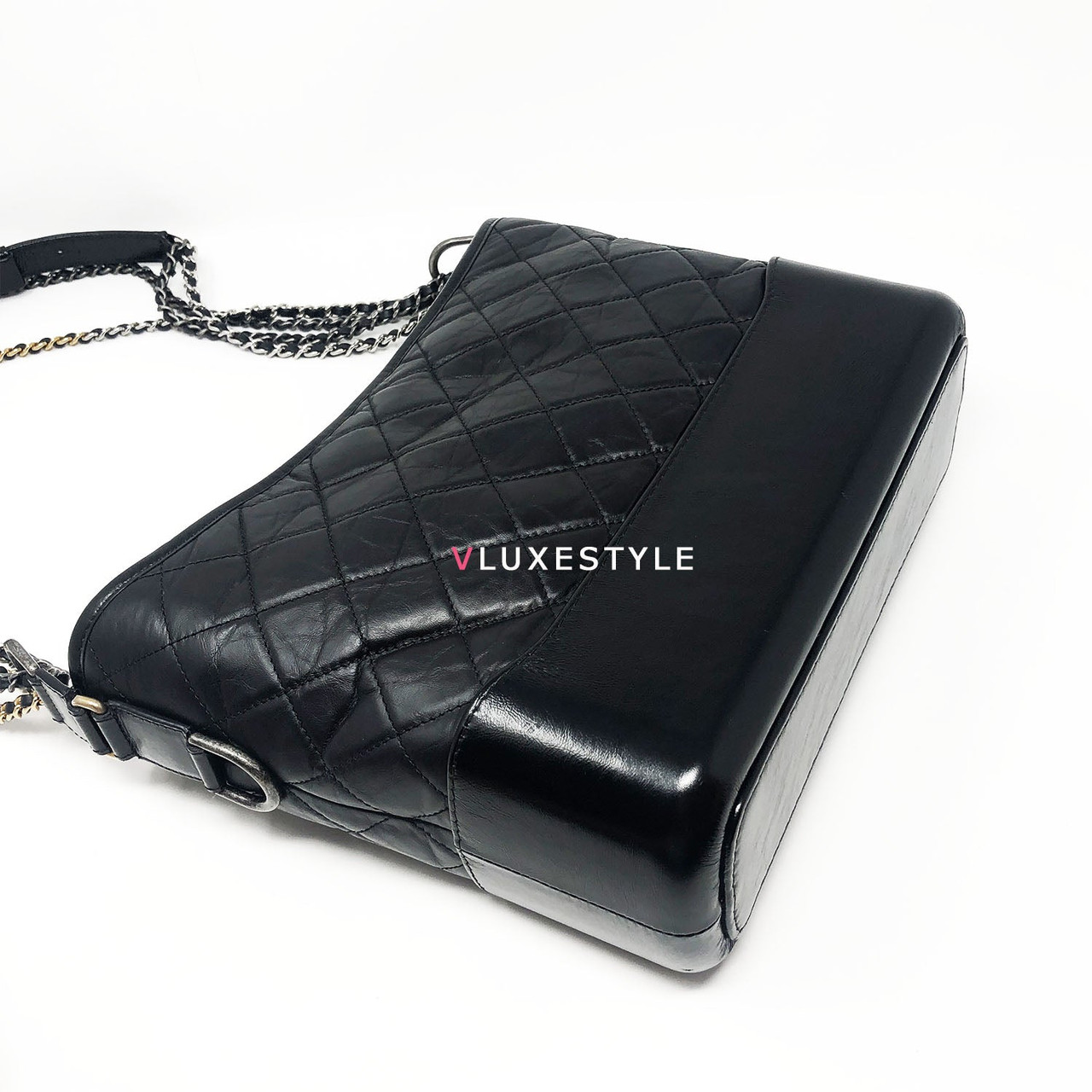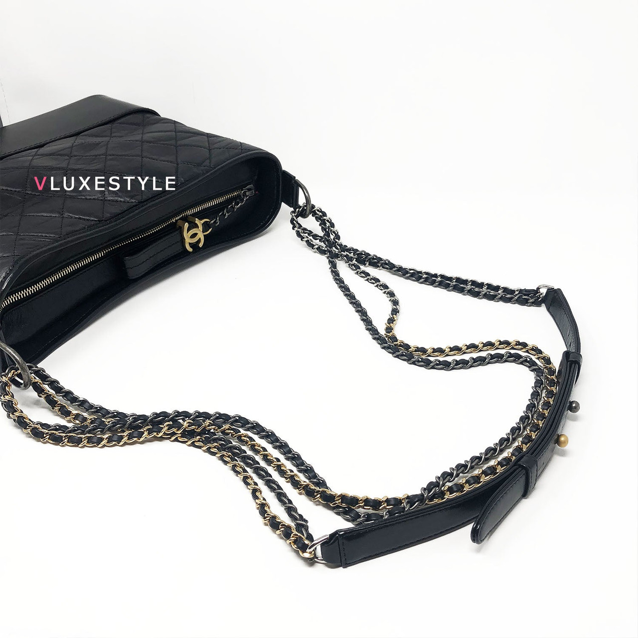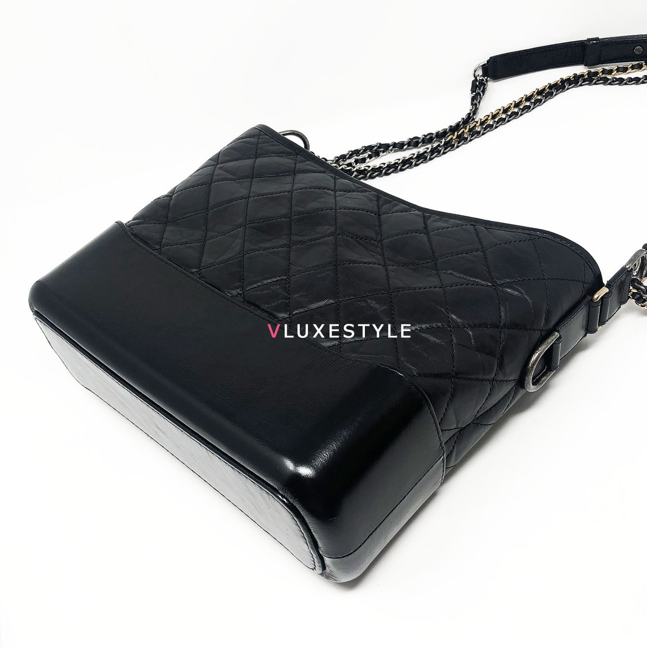 The gorgeous Authentic CHANEL 18P Gabrielle Medium Hobo Aged Quilted Calfskin with mixed hardware. This stylish hobo bag crafted of luxurious and durable quilted aged black calfskin body and smooth calf base and mixed hardware of silver, gold, and ruthenium hardware. This timeless, functional, spacious, and super-versatile bag can be worn in multiple ways, perfect to fit all your everyday essentials.
