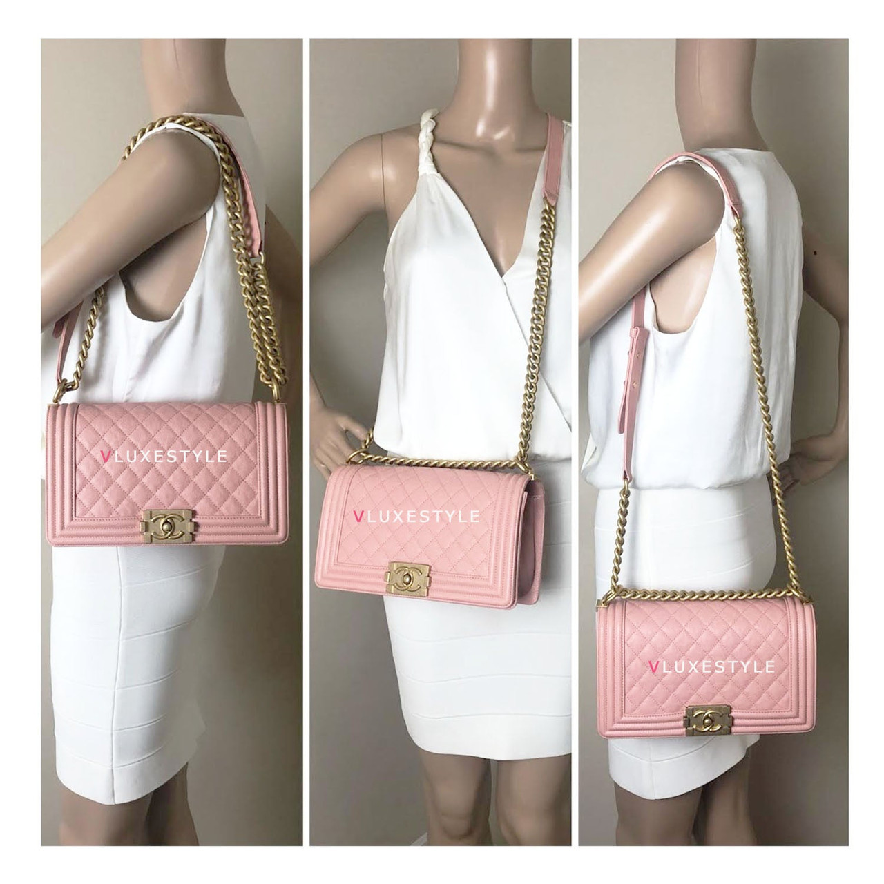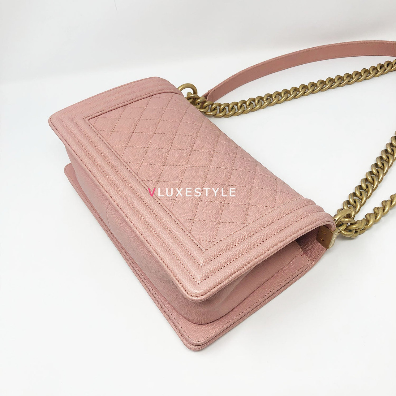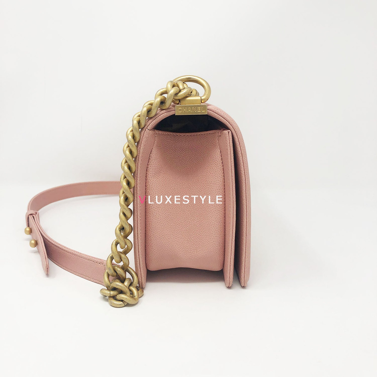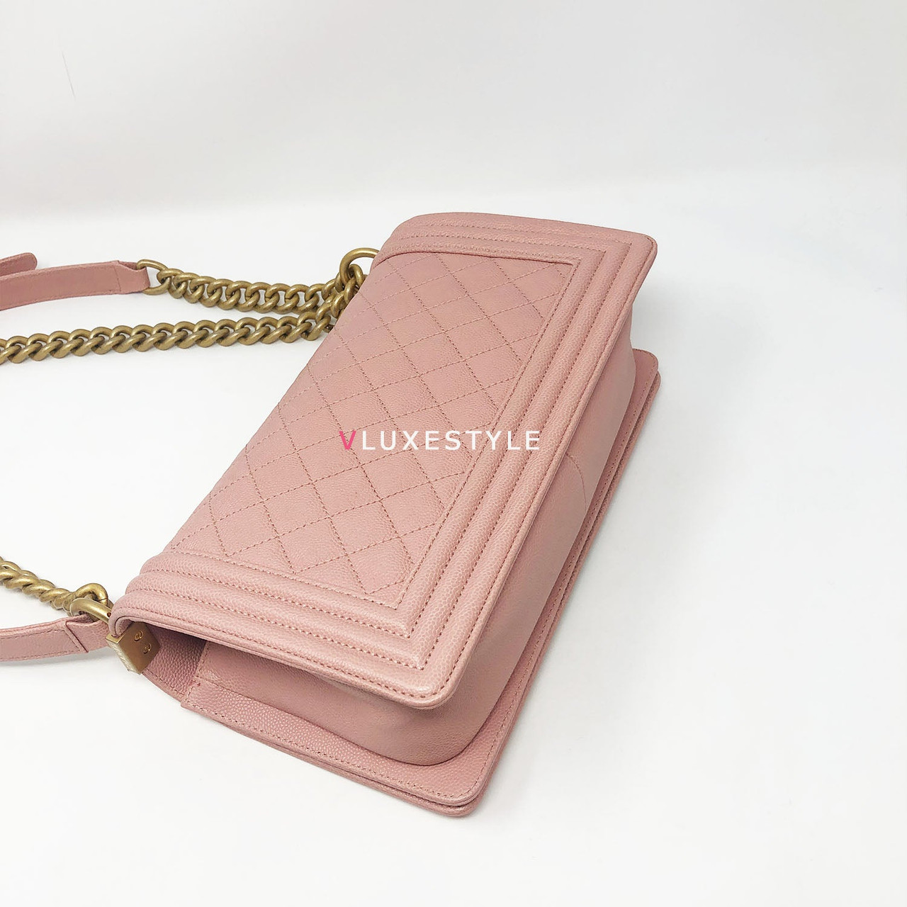 Chanel 18P Le Boy Old Medium Light Pink Quilted Caviar with brushed gold hardware. This stylish shoulder bag is crafted of luxurious and durable caviar leather in gorgeous light pink and brushed gold hardware. The color is a beautiful powder-blush nude or a pink-beige.The bag can be worn long and short over-the-shoulder bag and crossbody.