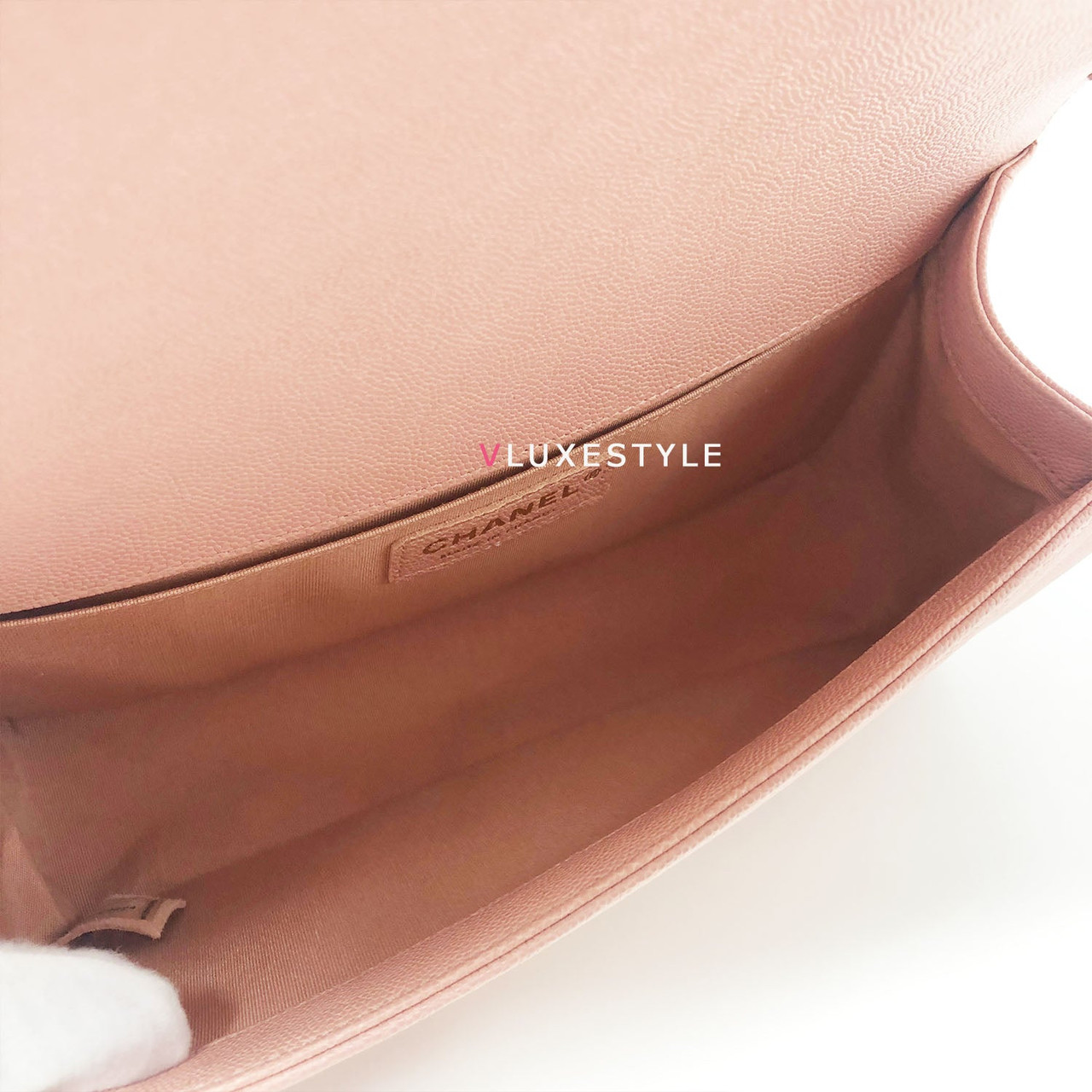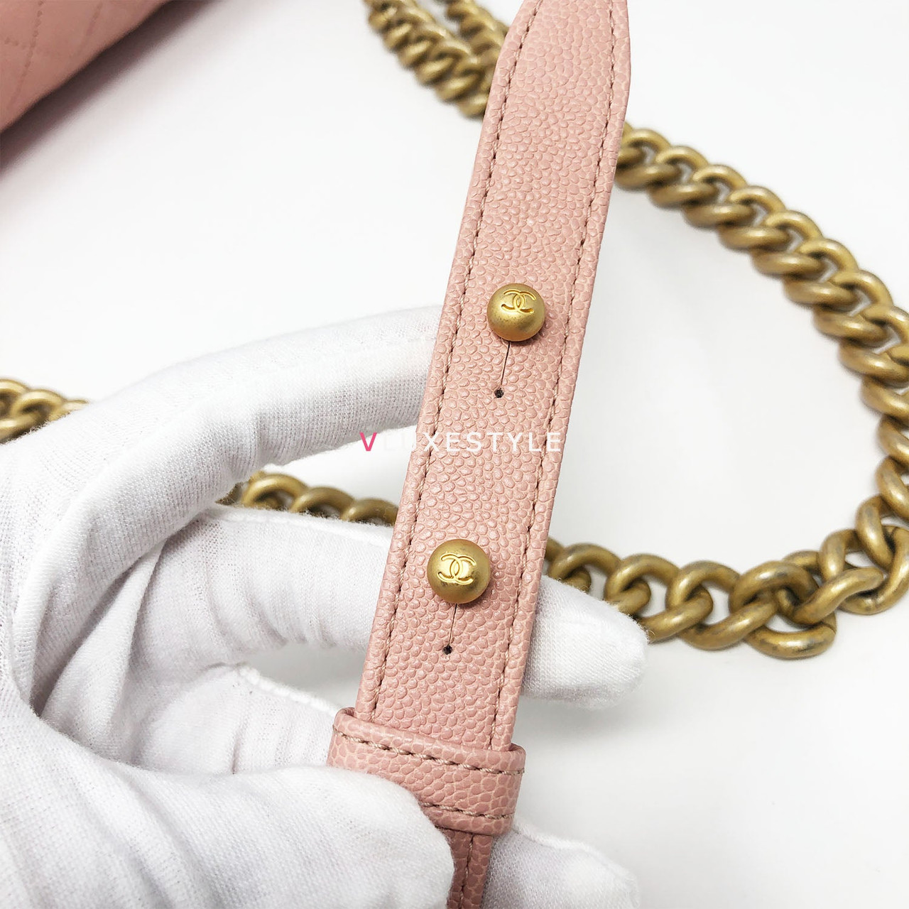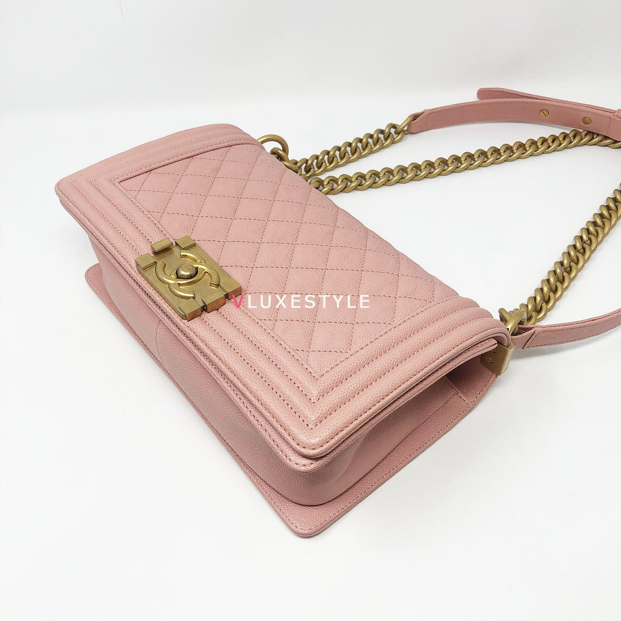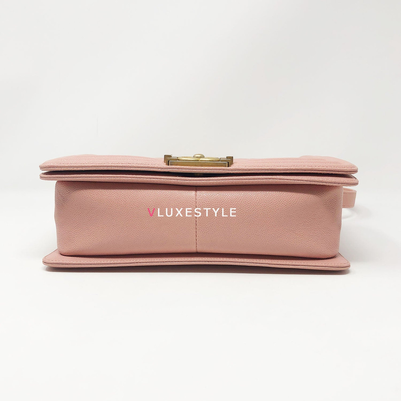 Chanel 18P Le Boy Old Medium Light Pink Quilted Caviar with brushed gold hardware. This stylish shoulder bag is crafted of luxurious and durable caviar leather in gorgeous light pink and brushed gold hardware. The color is a beautiful powder-blush nude or a pink-beige.The bag can be worn long and short over-the-shoulder bag and crossbody.