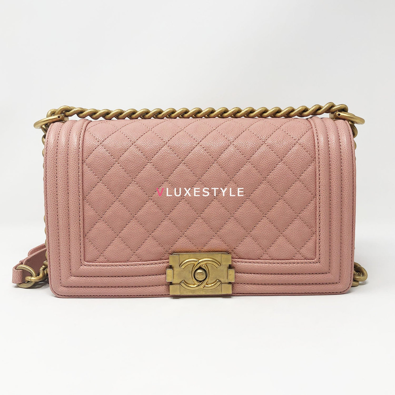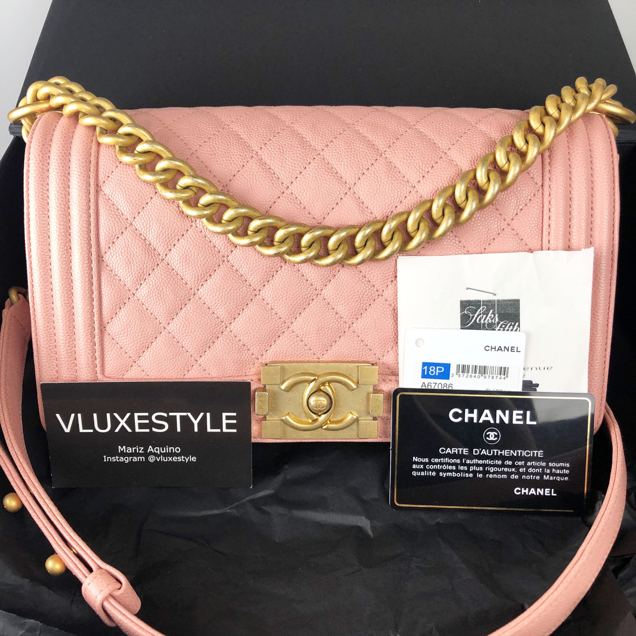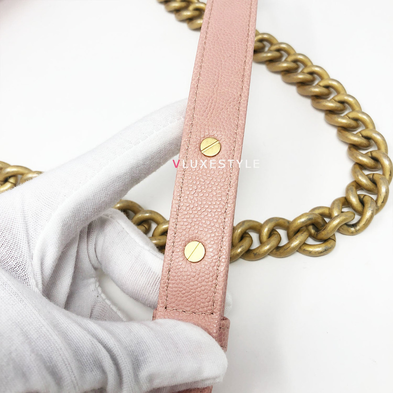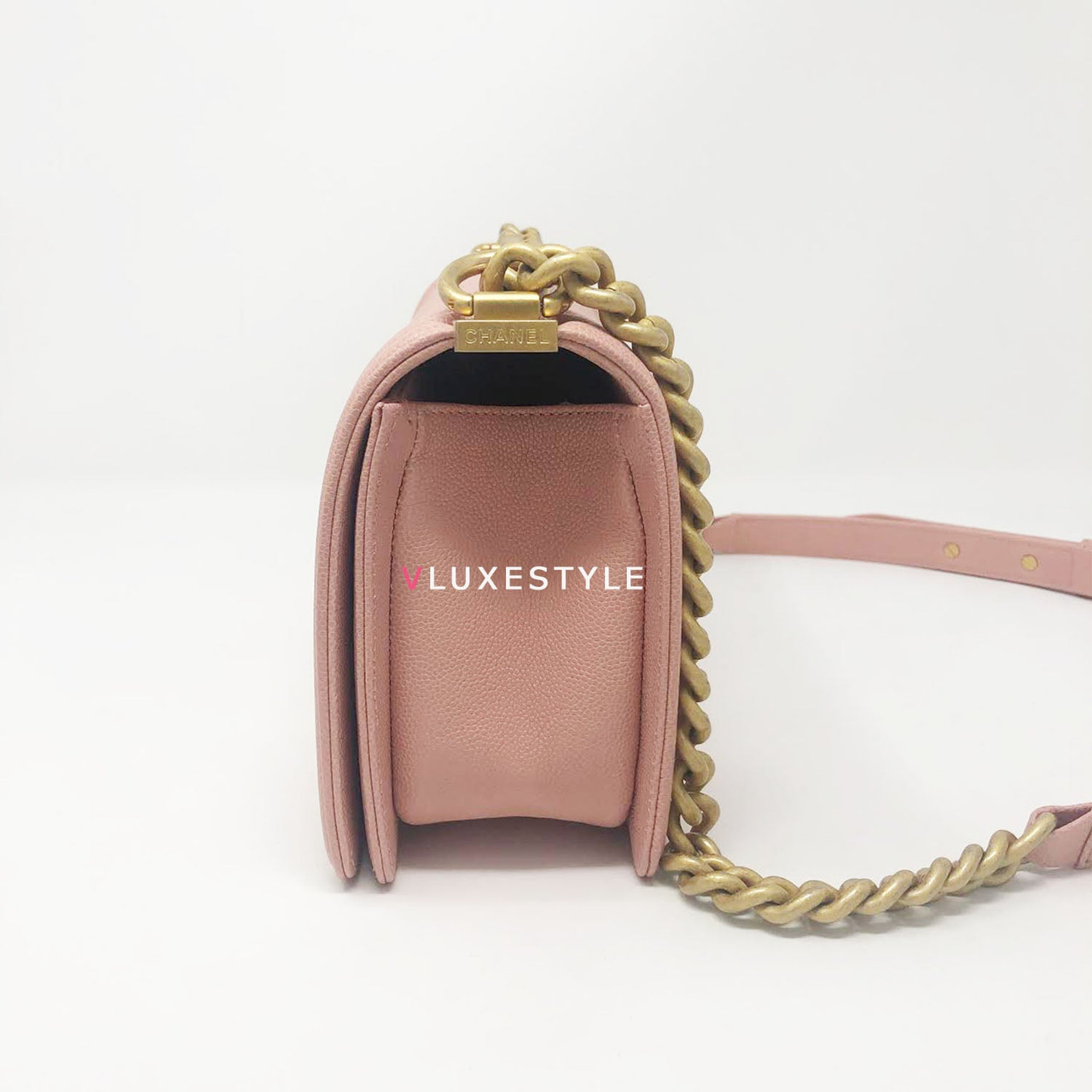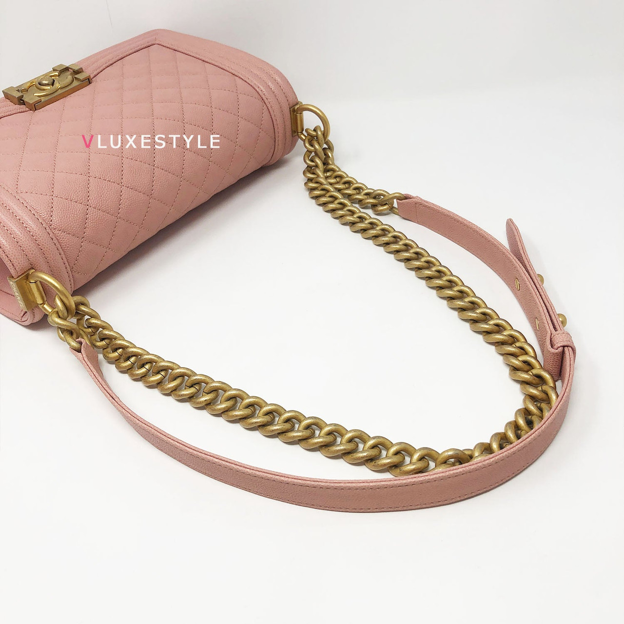 Chanel 18P Le Boy Old Medium Light Pink Quilted Caviar with brushed gold hardware. This stylish shoulder bag is crafted of luxurious and durable caviar leather in gorgeous light pink and brushed gold hardware. The color is a beautiful powder-blush nude or a pink-beige.The bag can be worn long and short over-the-shoulder bag and crossbody.