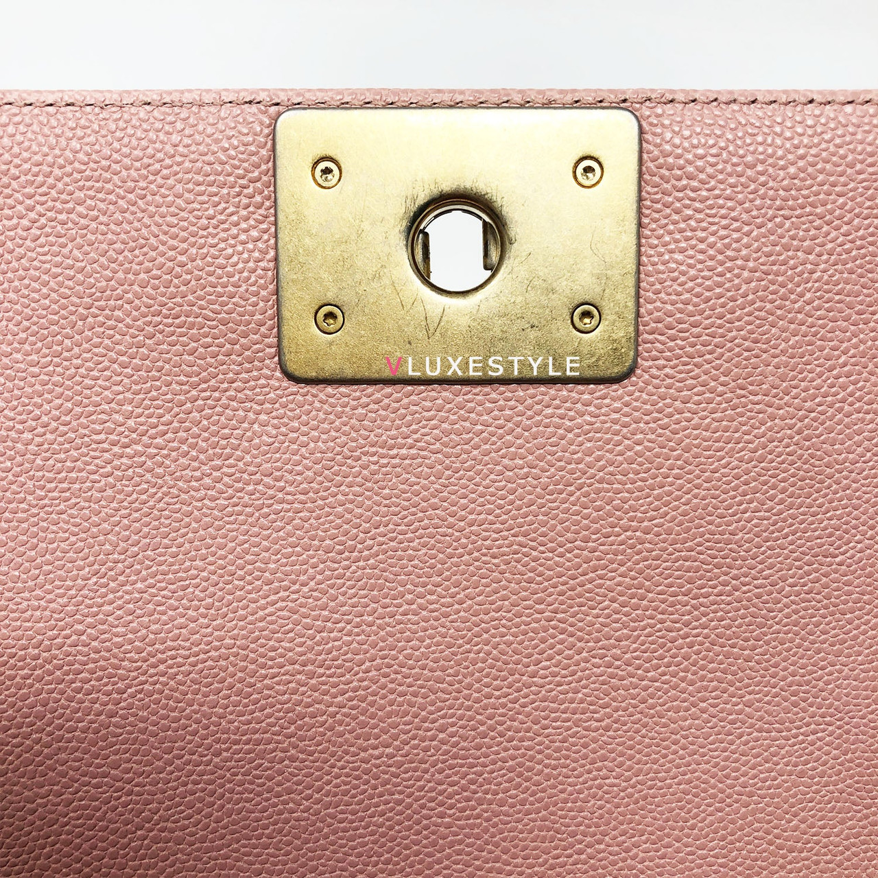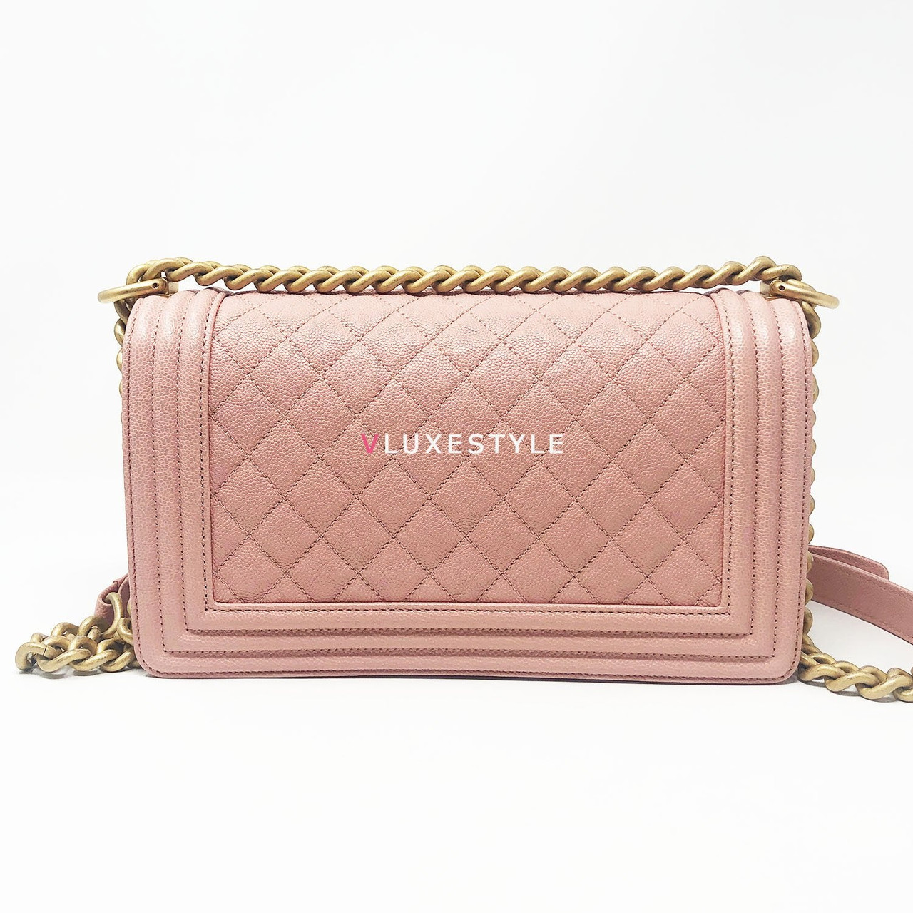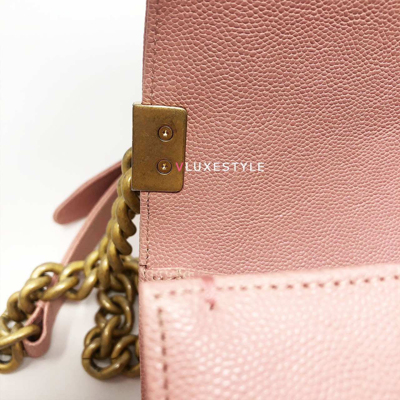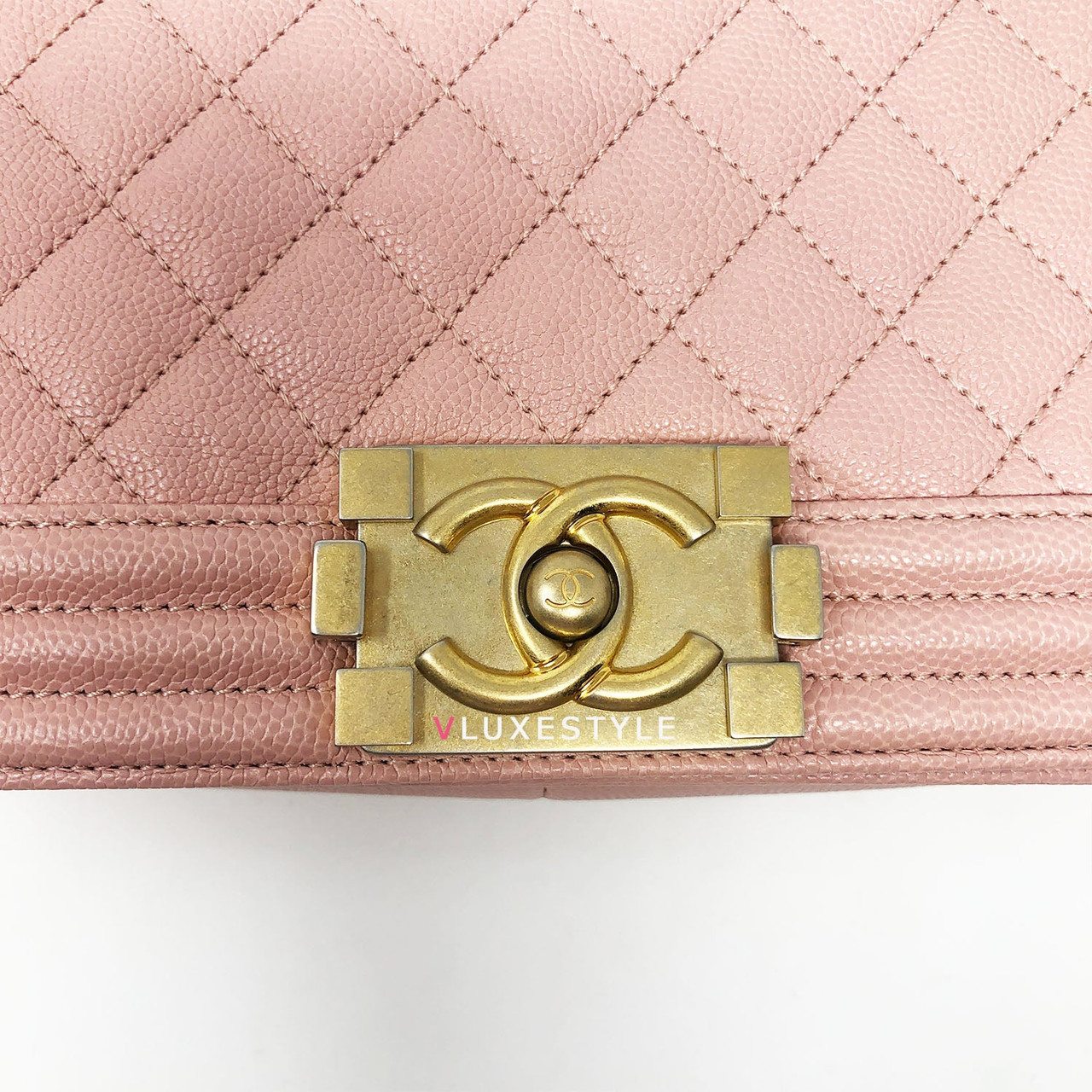 Chanel 18P Le Boy Old Medium Light Pink Quilted Caviar with brushed gold hardware. This stylish shoulder bag is crafted of luxurious and durable caviar leather in gorgeous light pink and brushed gold hardware. The color is a beautiful powder-blush nude or a pink-beige.The bag can be worn long and short over-the-shoulder bag and crossbody.