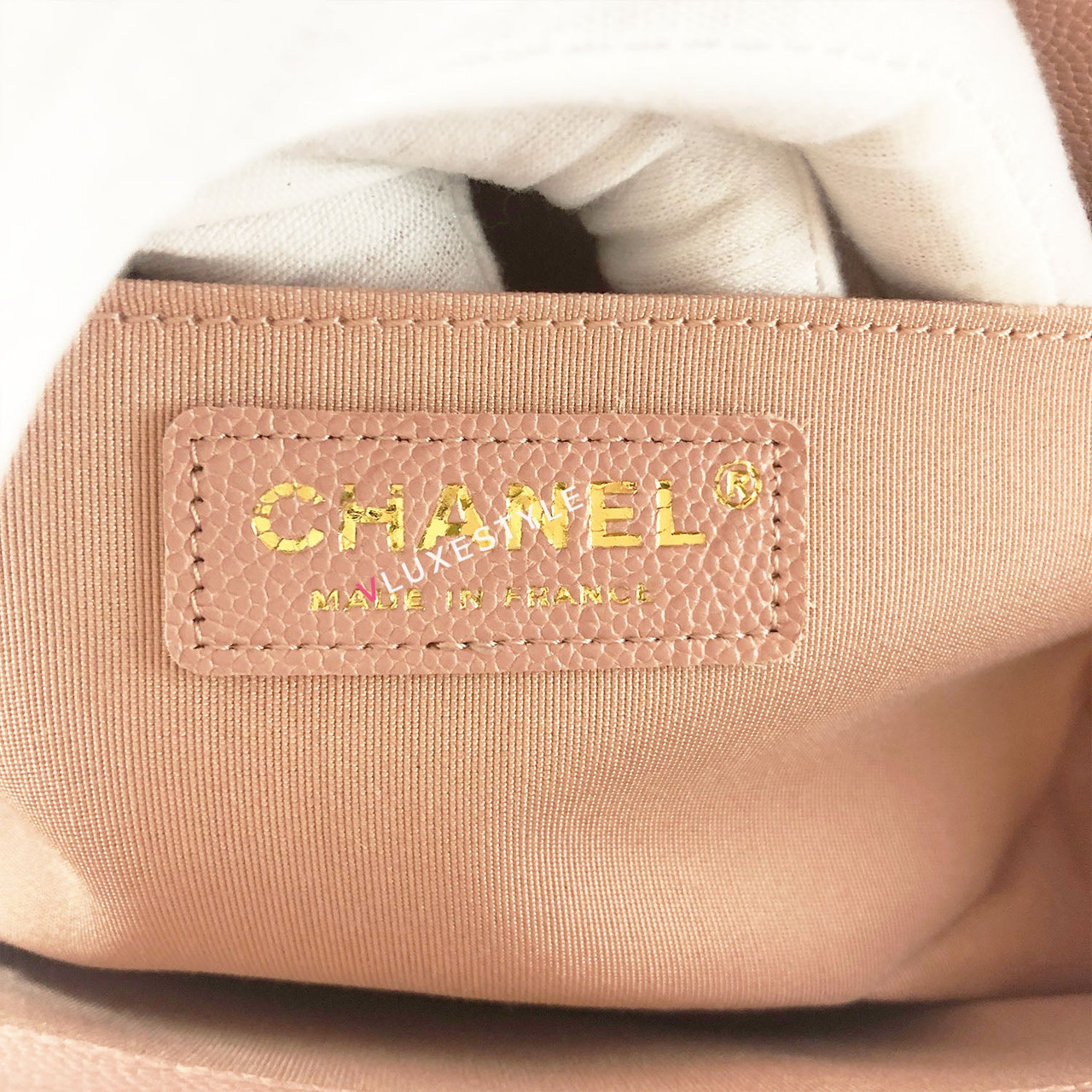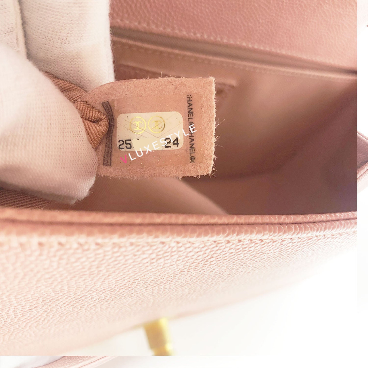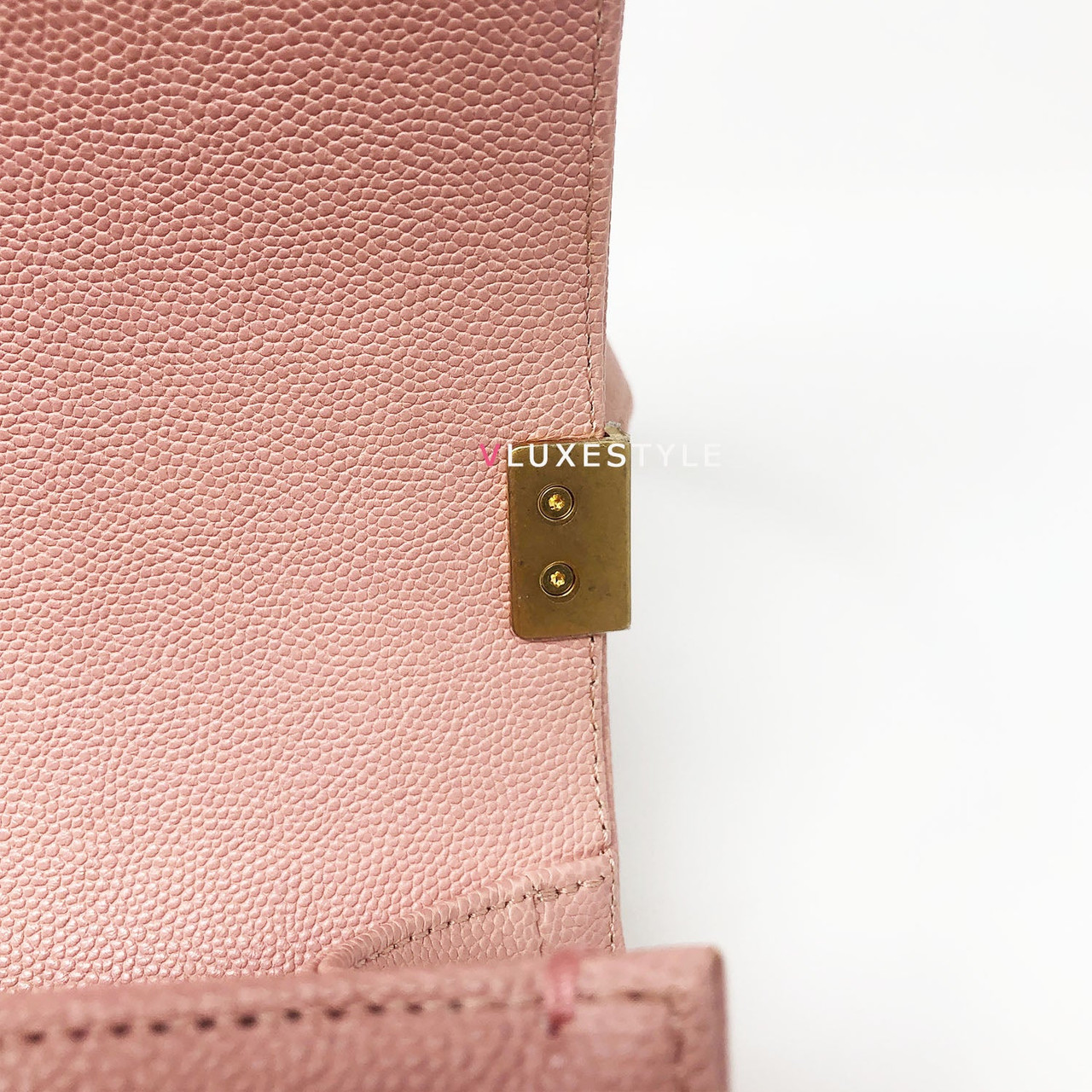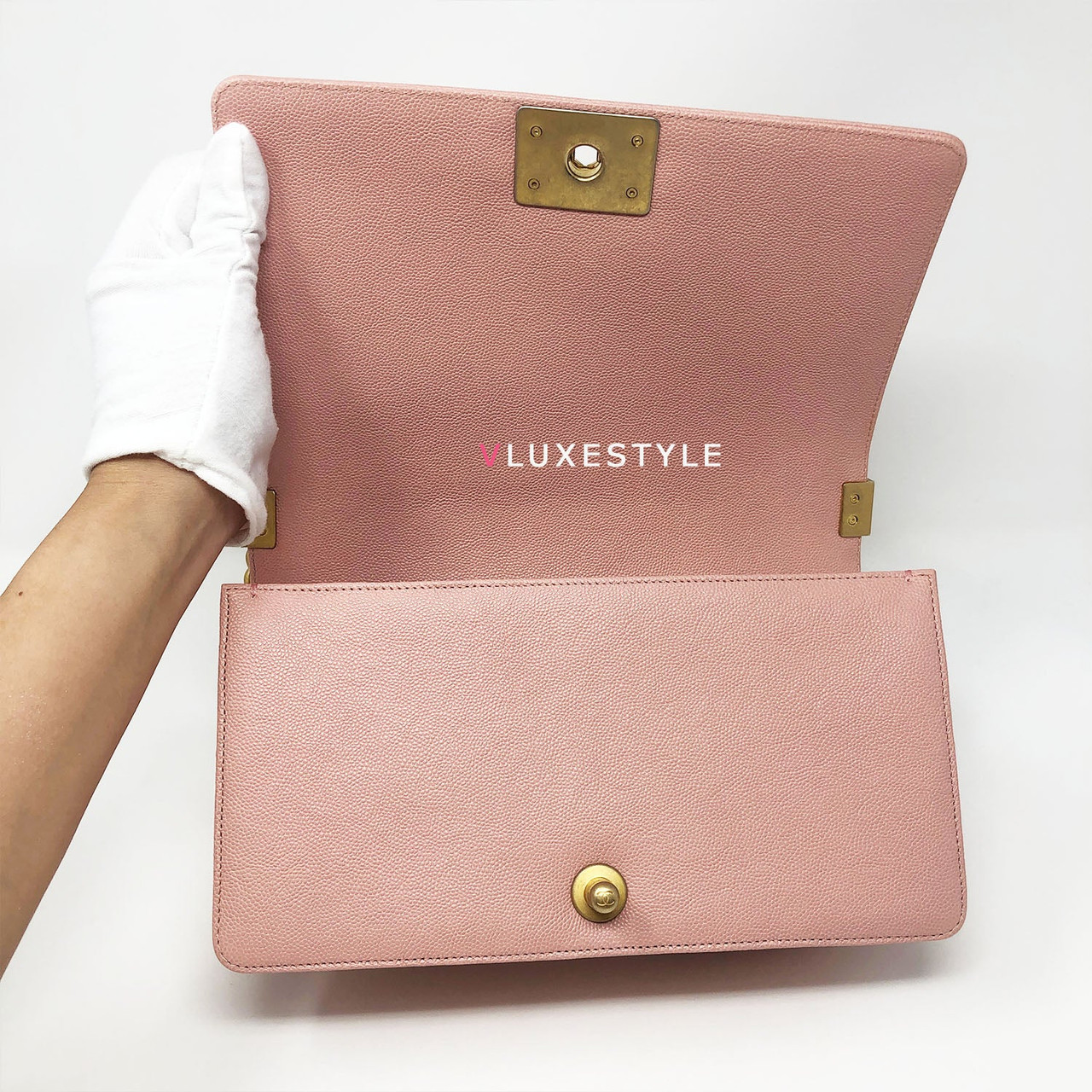 Chanel 18P Le Boy Old Medium Light Pink Quilted Caviar with brushed gold hardware. This stylish shoulder bag is crafted of luxurious and durable caviar leather in gorgeous light pink and brushed gold hardware. The color is a beautiful powder-blush nude or a pink-beige.The bag can be worn long and short over-the-shoulder bag and crossbody.