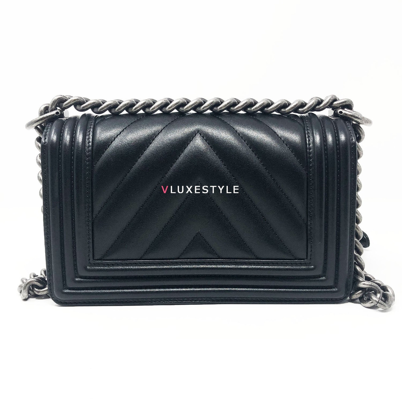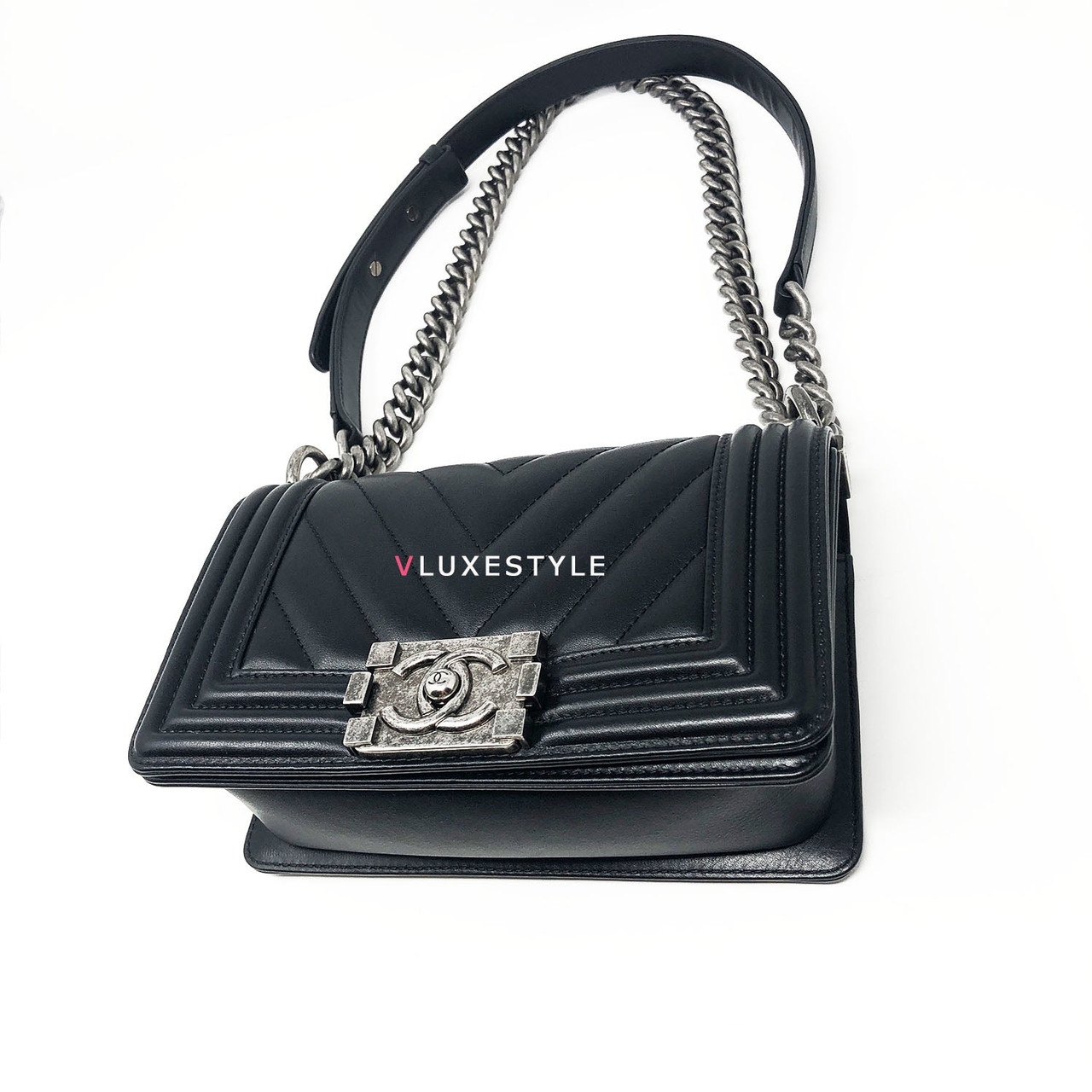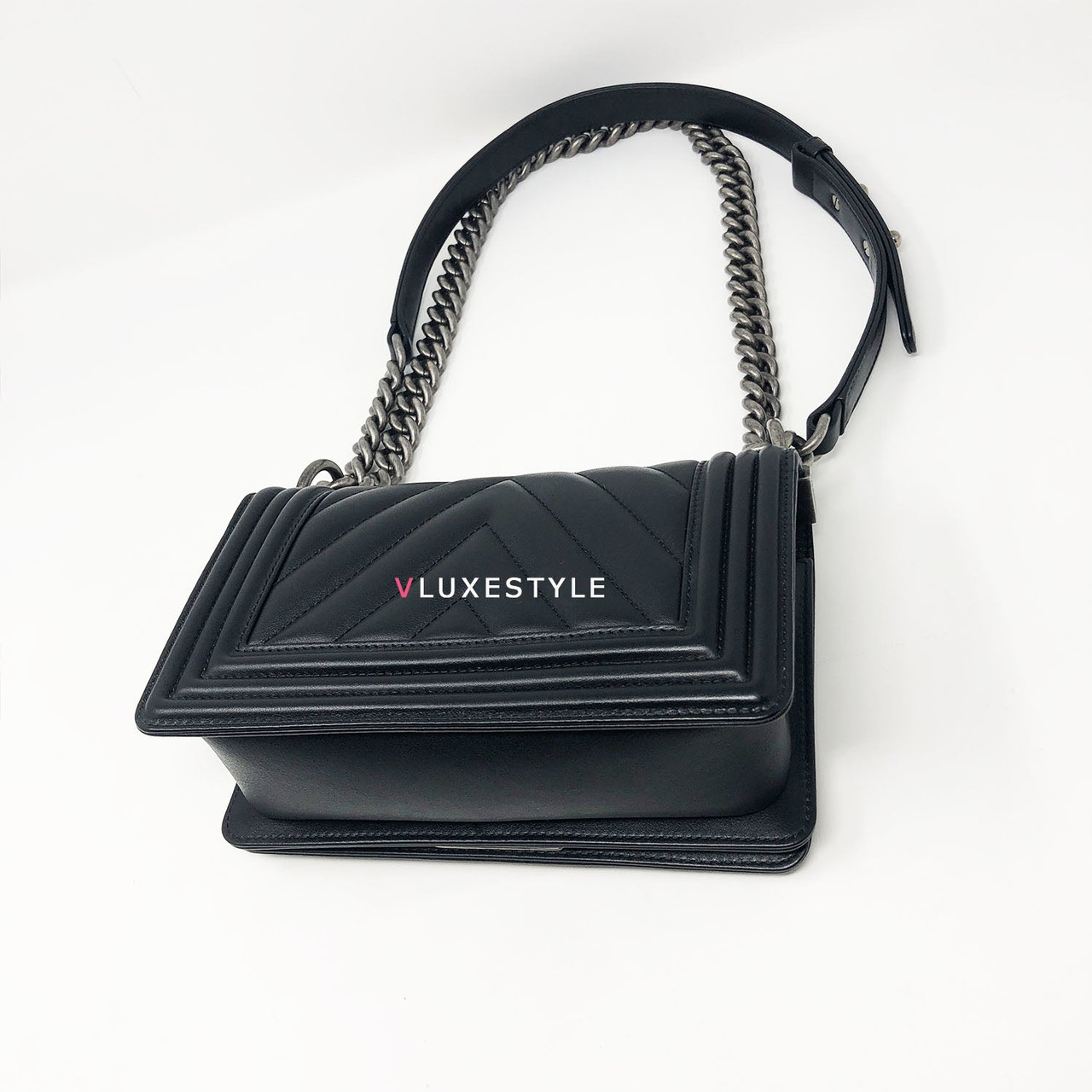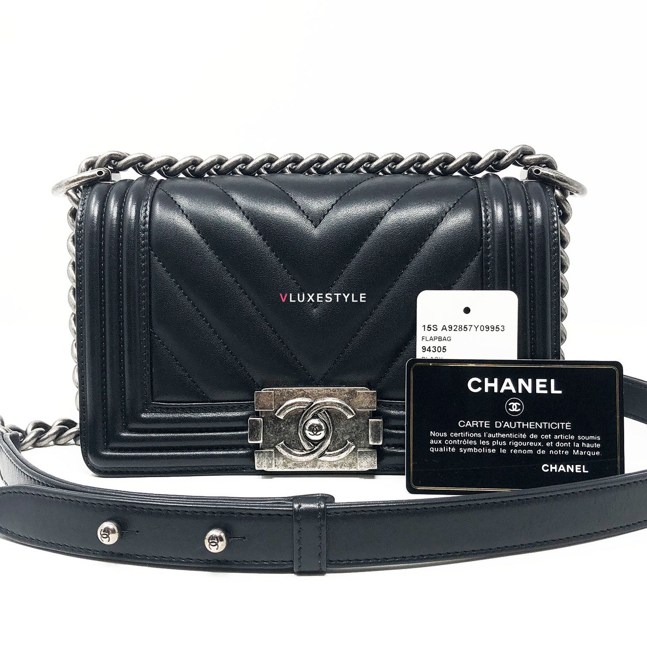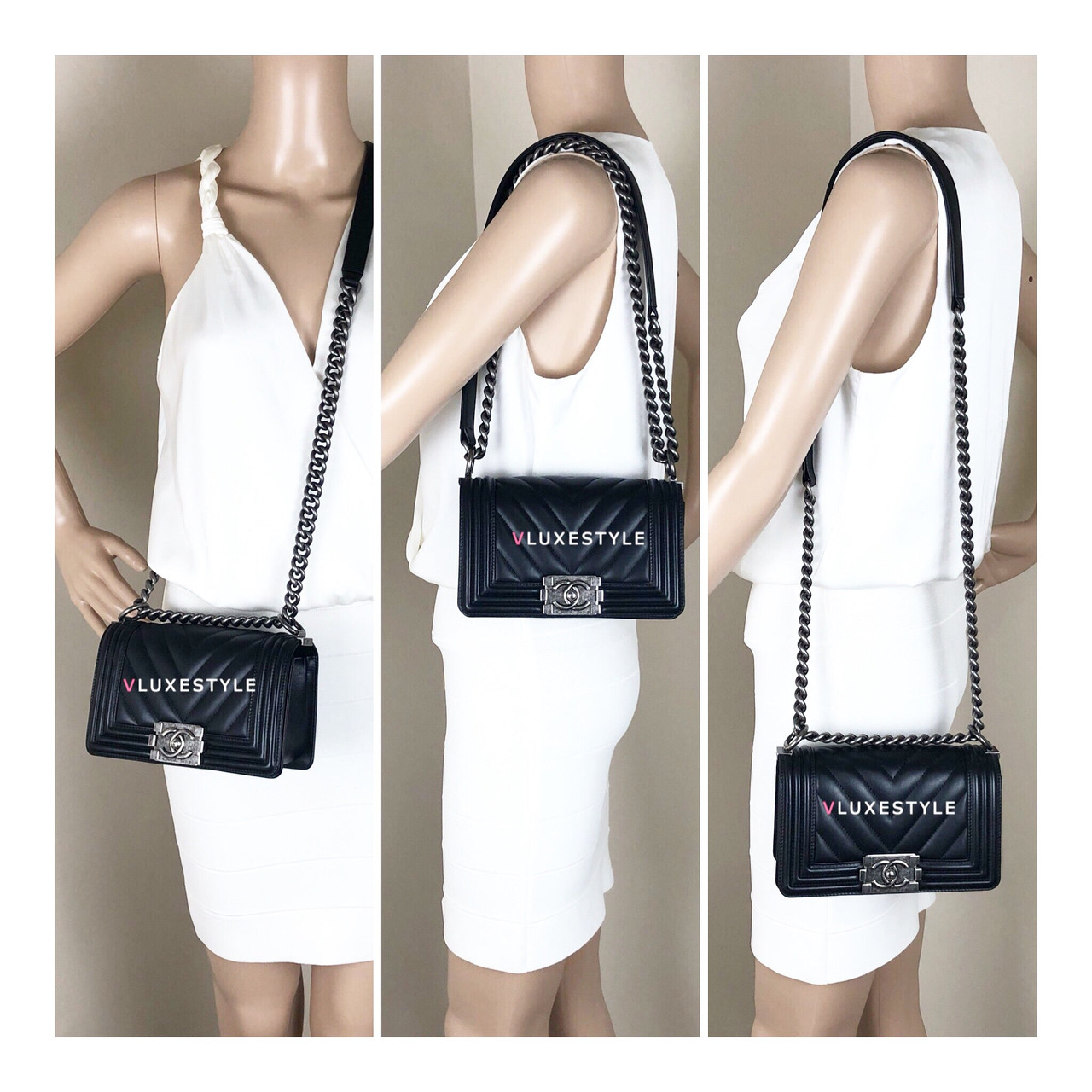 One of the most coveted style and combination! Authentic Chanel 15S Small Le Boy Black Chevron Calfskin with ruthenium hardware. This stylish shoulder bag is crafted of luxurious and durable calfskin leather in black. The ruthenium hardware gives this bag an edgier style perfectly matched with a beautiful chevron pattern. The bag can be worn long and short over-the-shoulder bag and crossbody. It's the perfect size to carry around all of your everyday essentials.