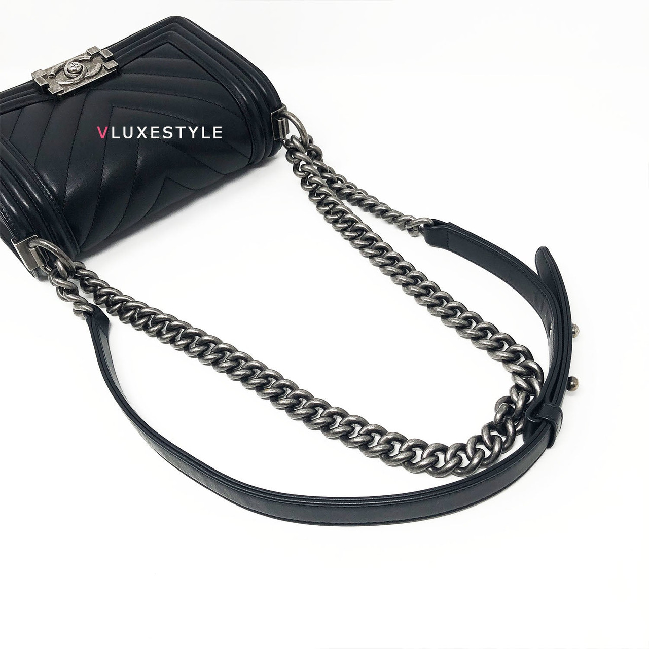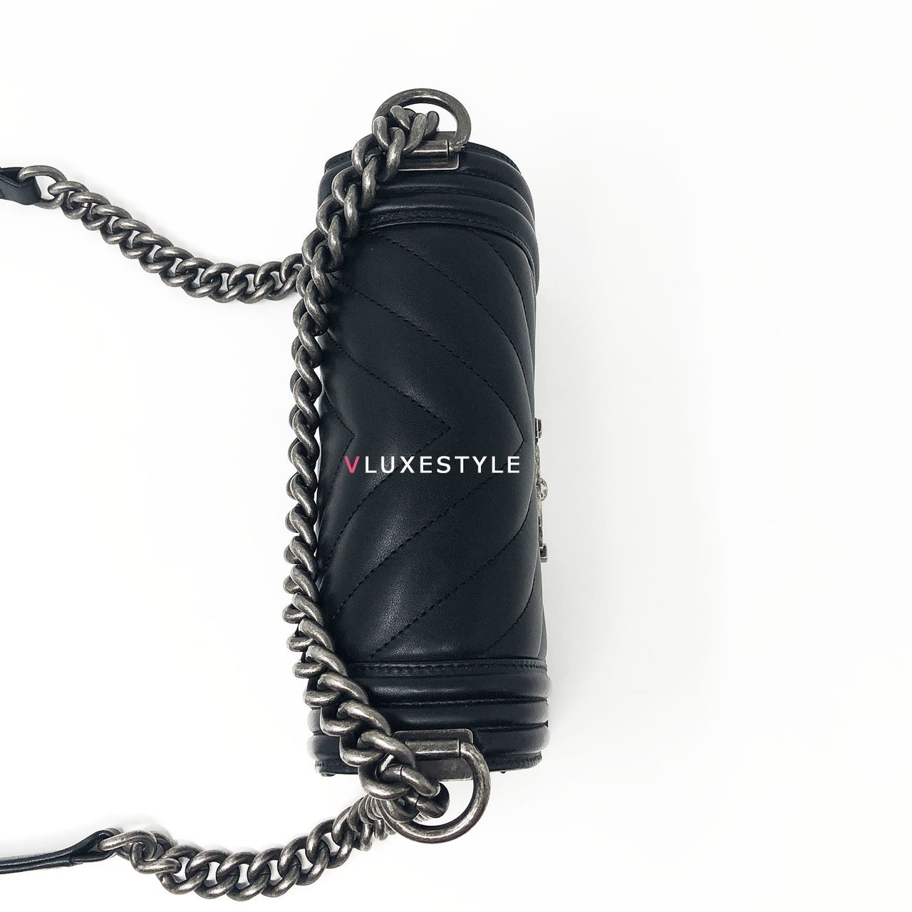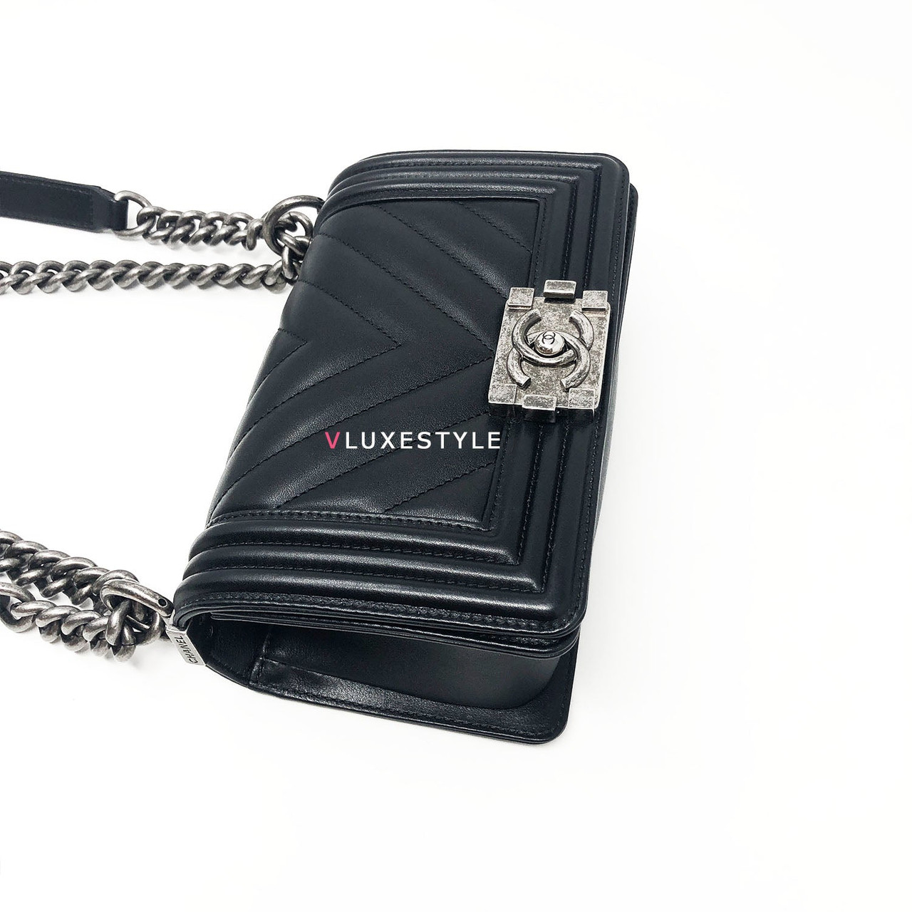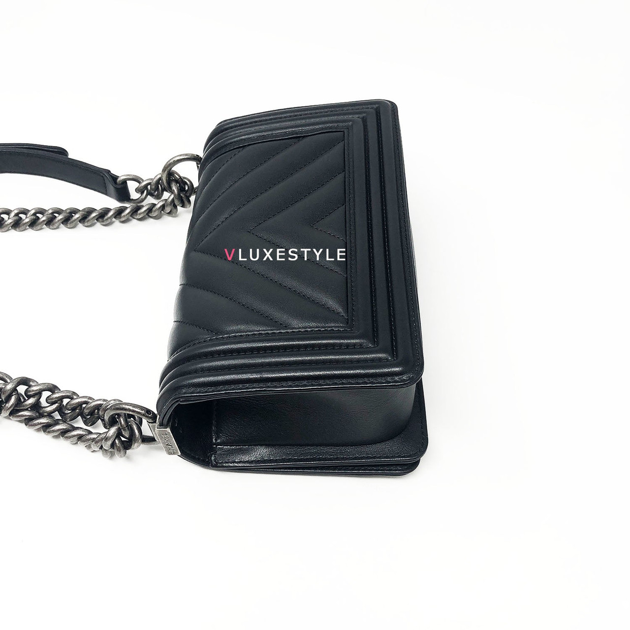 One of the most coveted style and combination! Authentic Chanel 15S Small Le Boy Black Chevron Calfskin with ruthenium hardware. This stylish shoulder bag is crafted of luxurious and durable calfskin leather in black. The ruthenium hardware gives this bag an edgier style perfectly matched with a beautiful chevron pattern. The bag can be worn long and short over-the-shoulder bag and crossbody. It's the perfect size to carry around all of your everyday essentials.