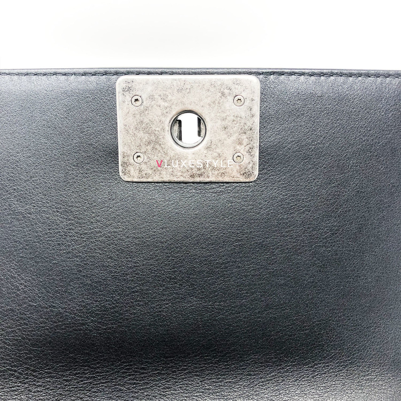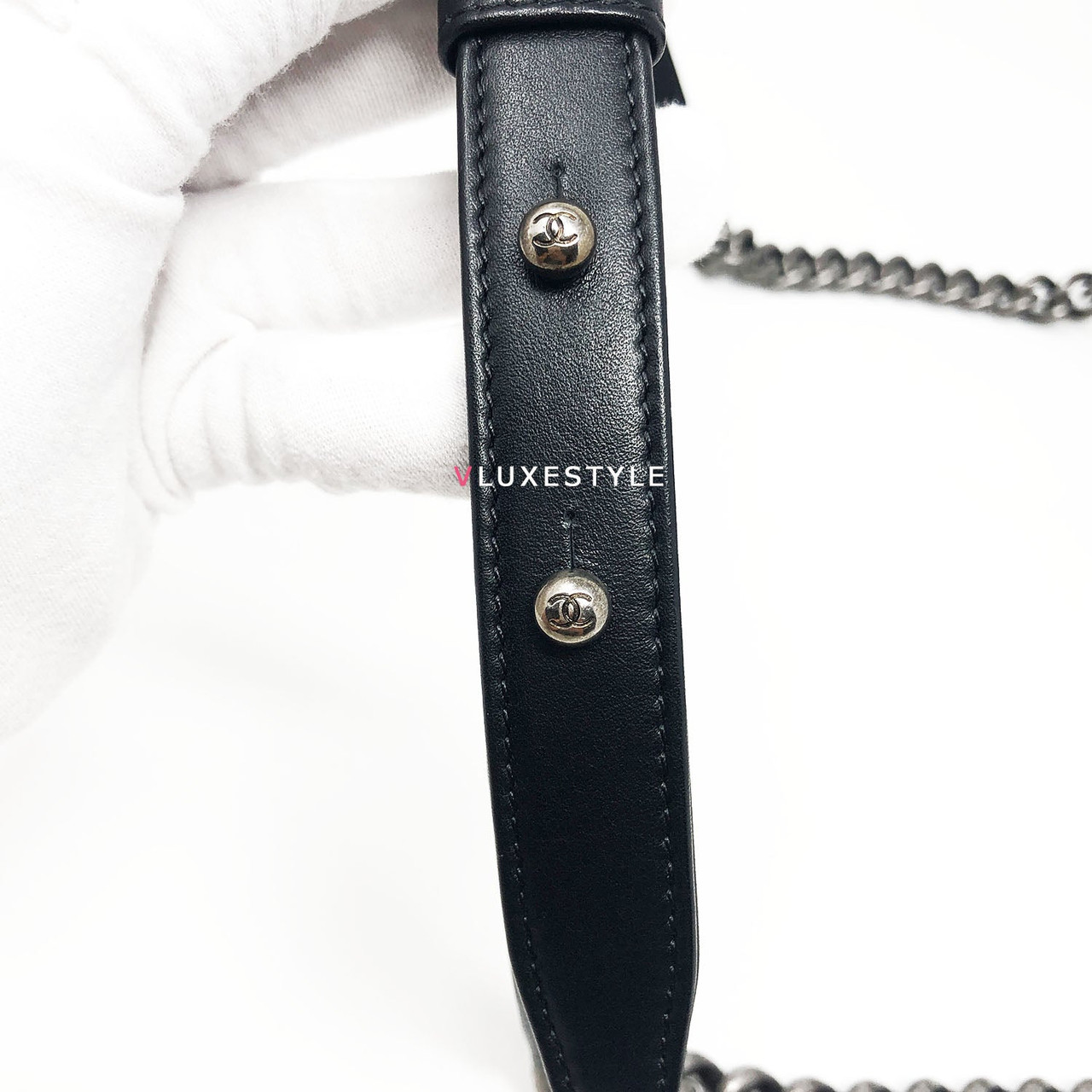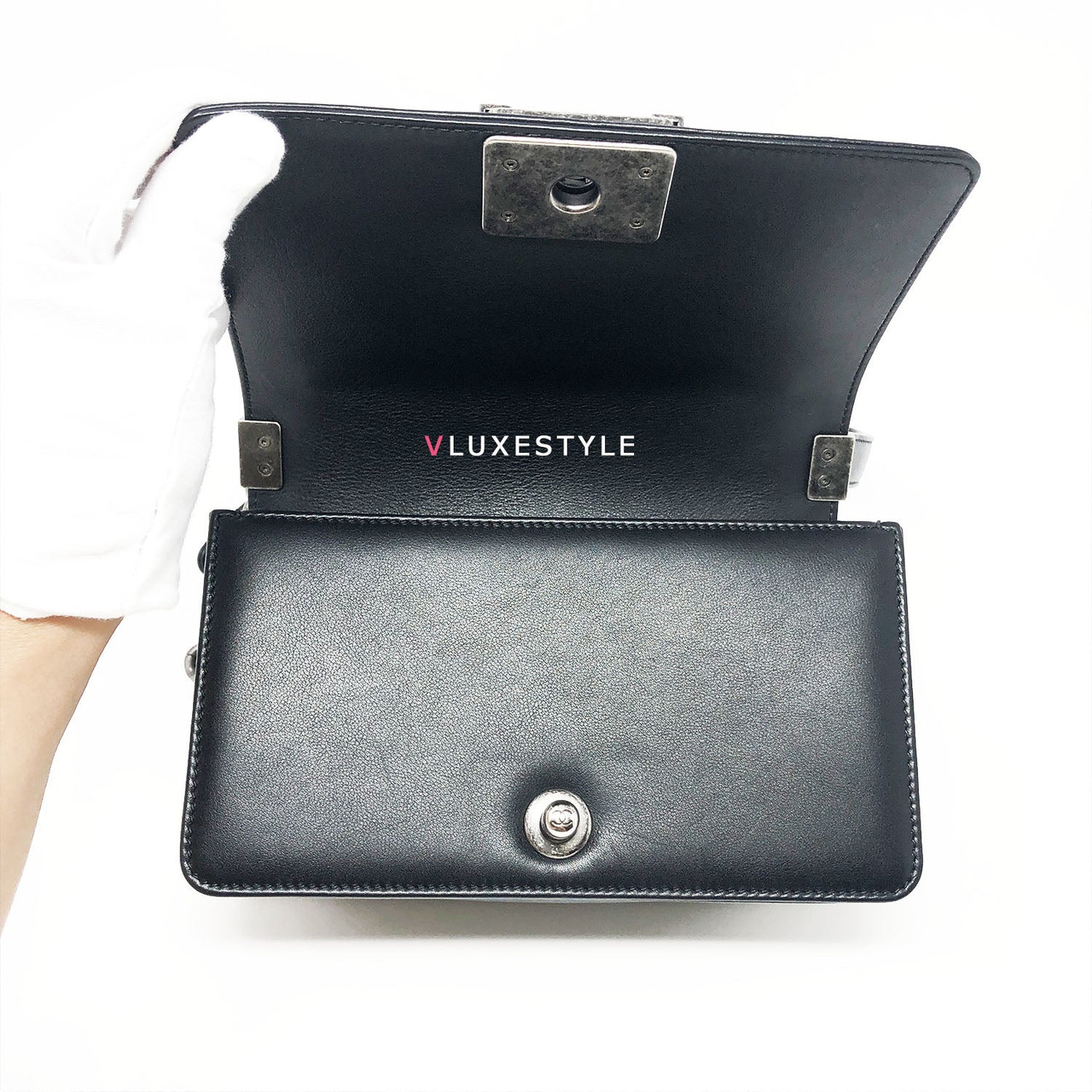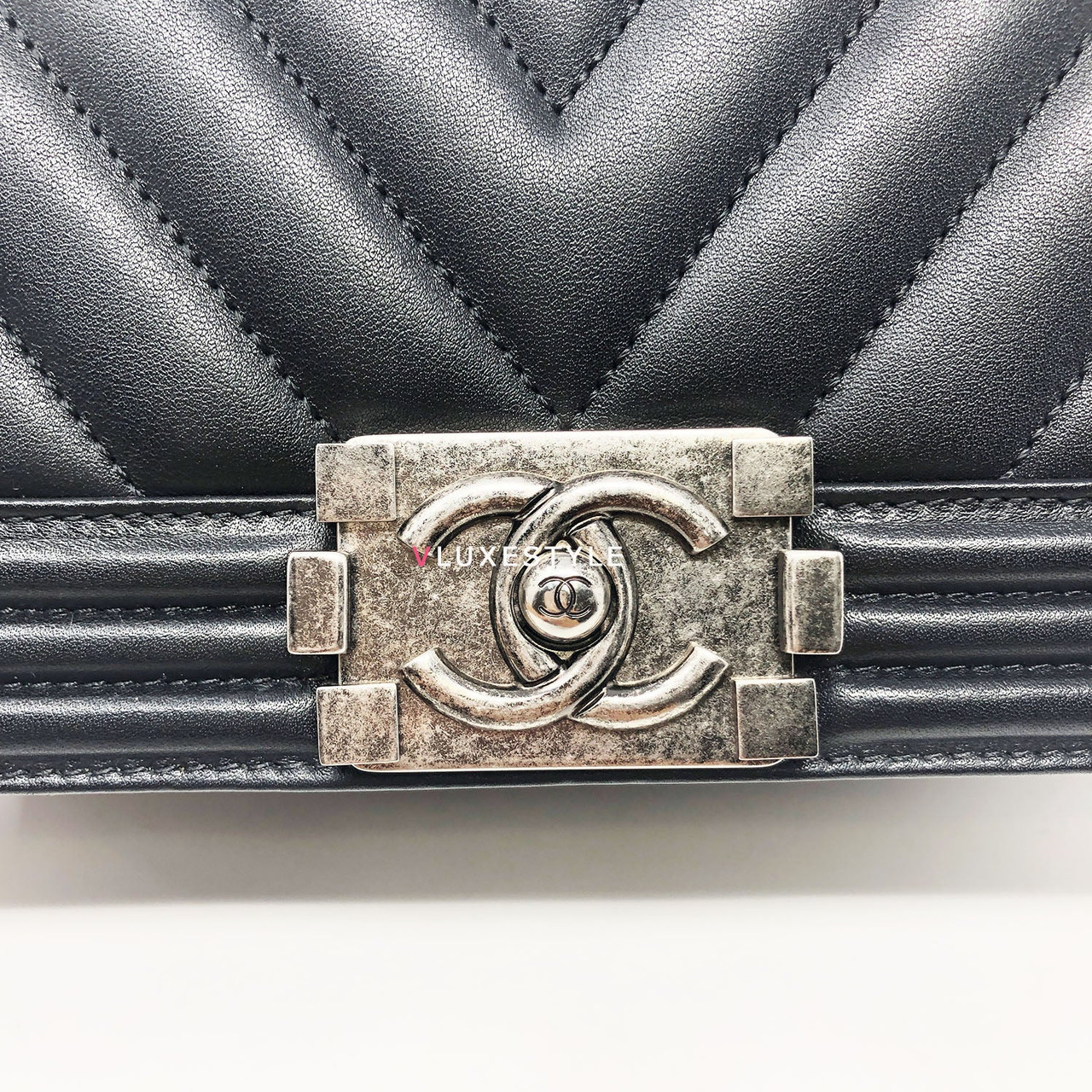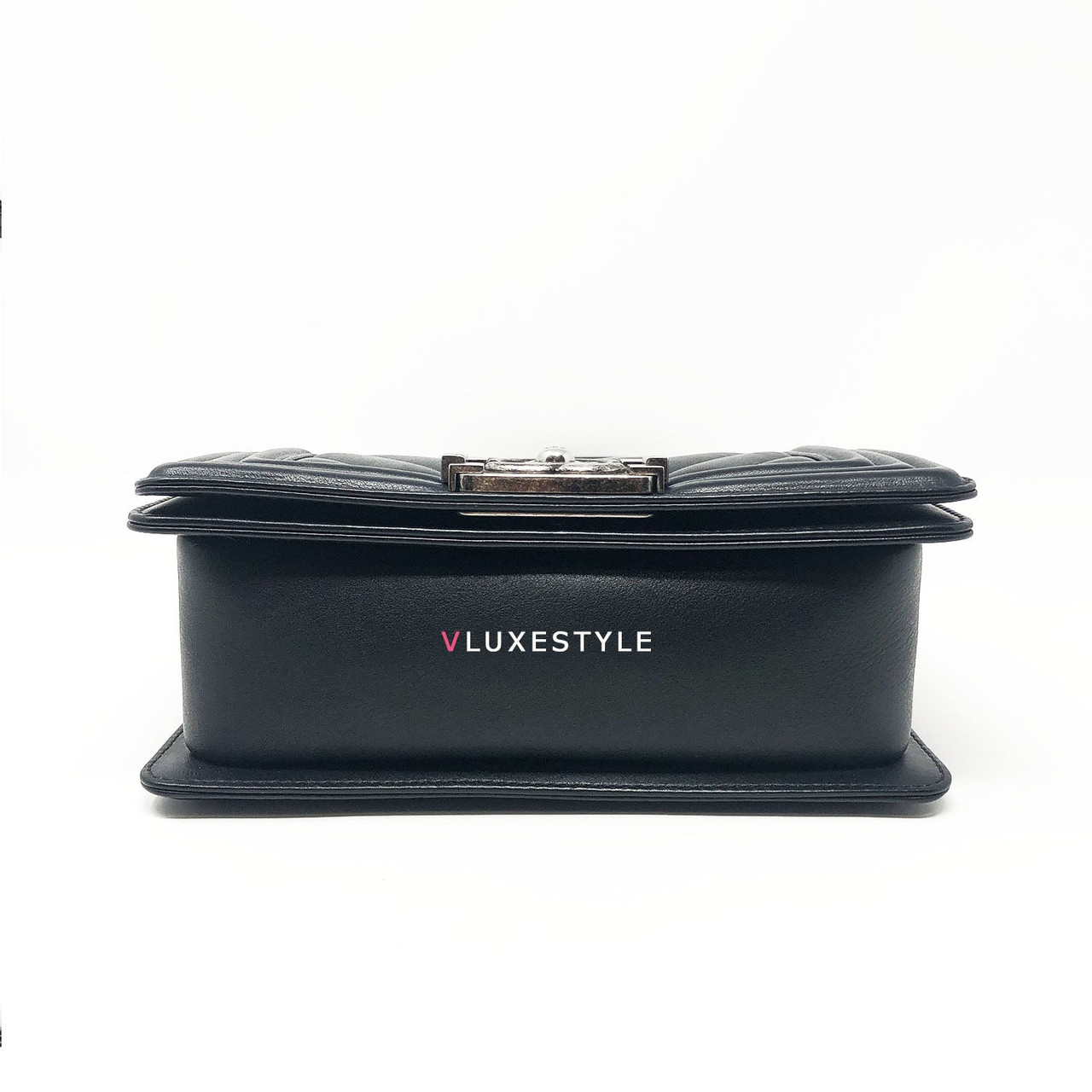 One of the most coveted style and combination! Authentic Chanel 15S Small Le Boy Black Chevron Calfskin with ruthenium hardware. This stylish shoulder bag is crafted of luxurious and durable calfskin leather in black. The ruthenium hardware gives this bag an edgier style perfectly matched with a beautiful chevron pattern. The bag can be worn long and short over-the-shoulder bag and crossbody. It's the perfect size to carry around all of your everyday essentials.