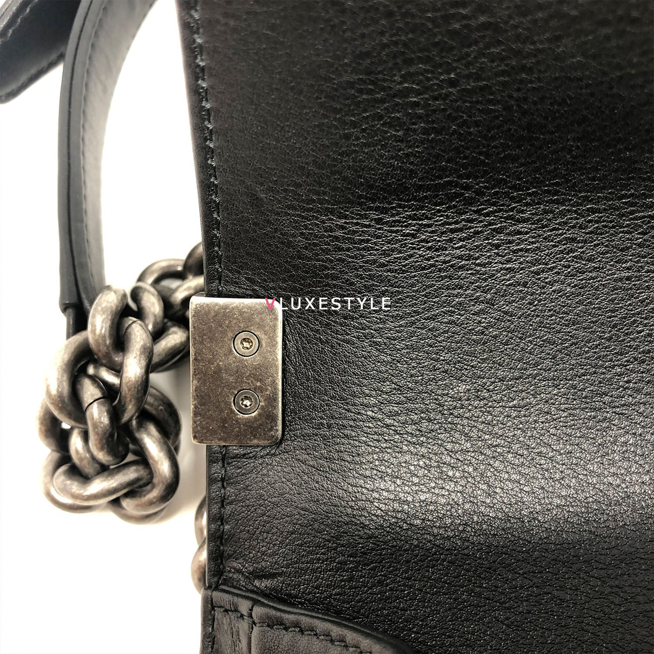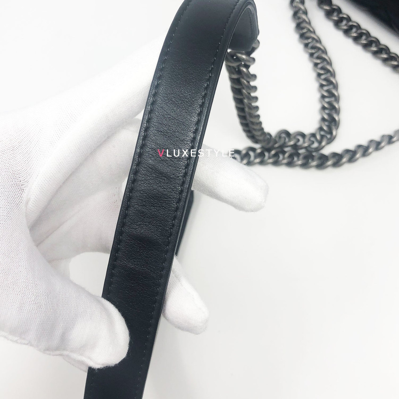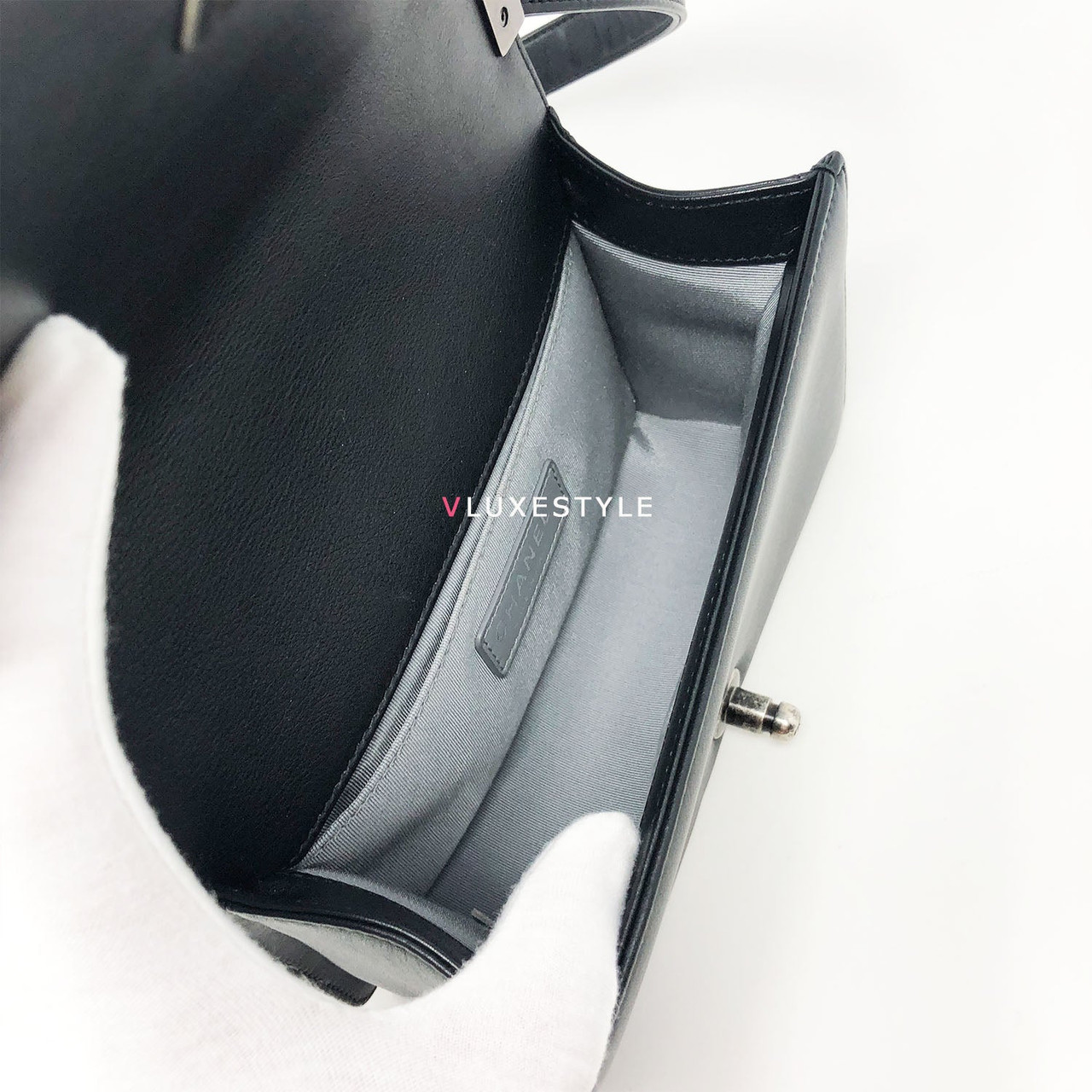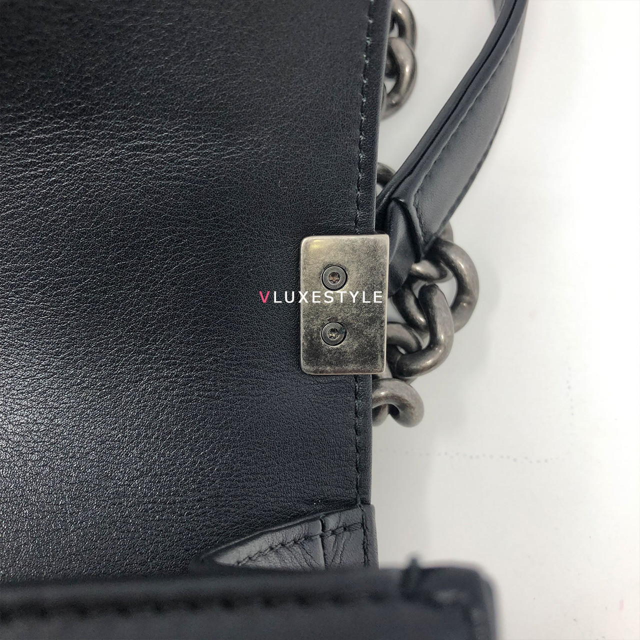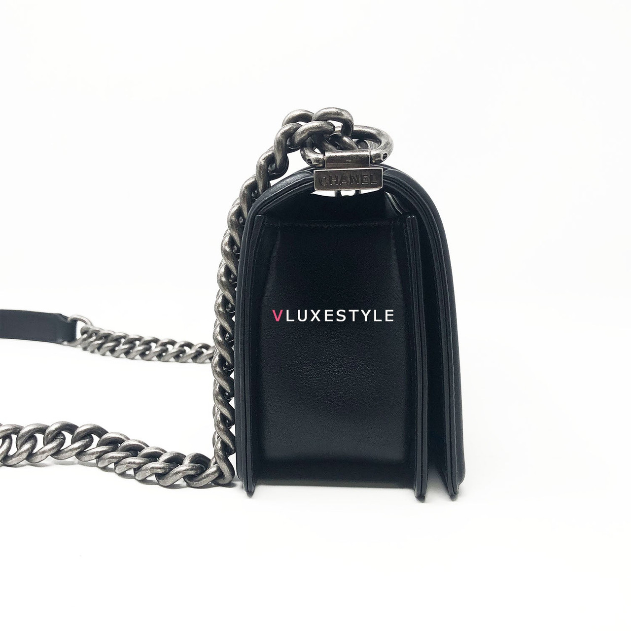 One of the most coveted style and combination! Authentic Chanel 15S Small Le Boy Black Chevron Calfskin with ruthenium hardware. This stylish shoulder bag is crafted of luxurious and durable calfskin leather in black. The ruthenium hardware gives this bag an edgier style perfectly matched with a beautiful chevron pattern. The bag can be worn long and short over-the-shoulder bag and crossbody. It's the perfect size to carry around all of your everyday essentials.
