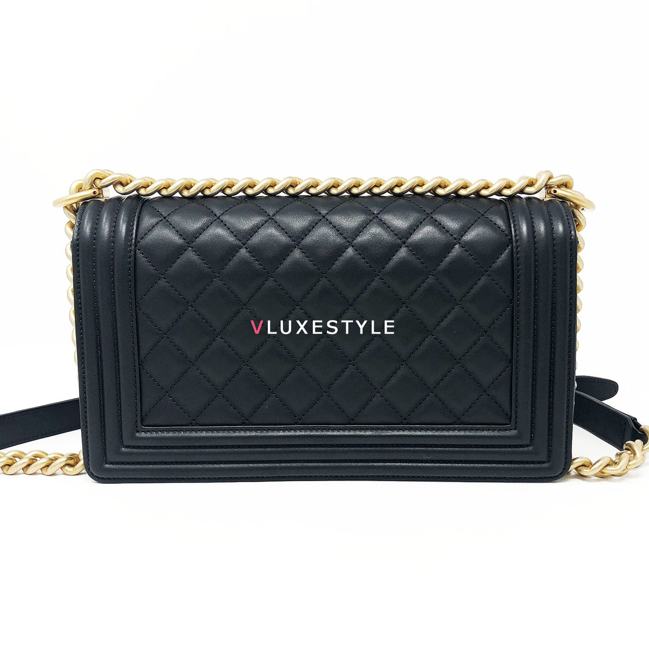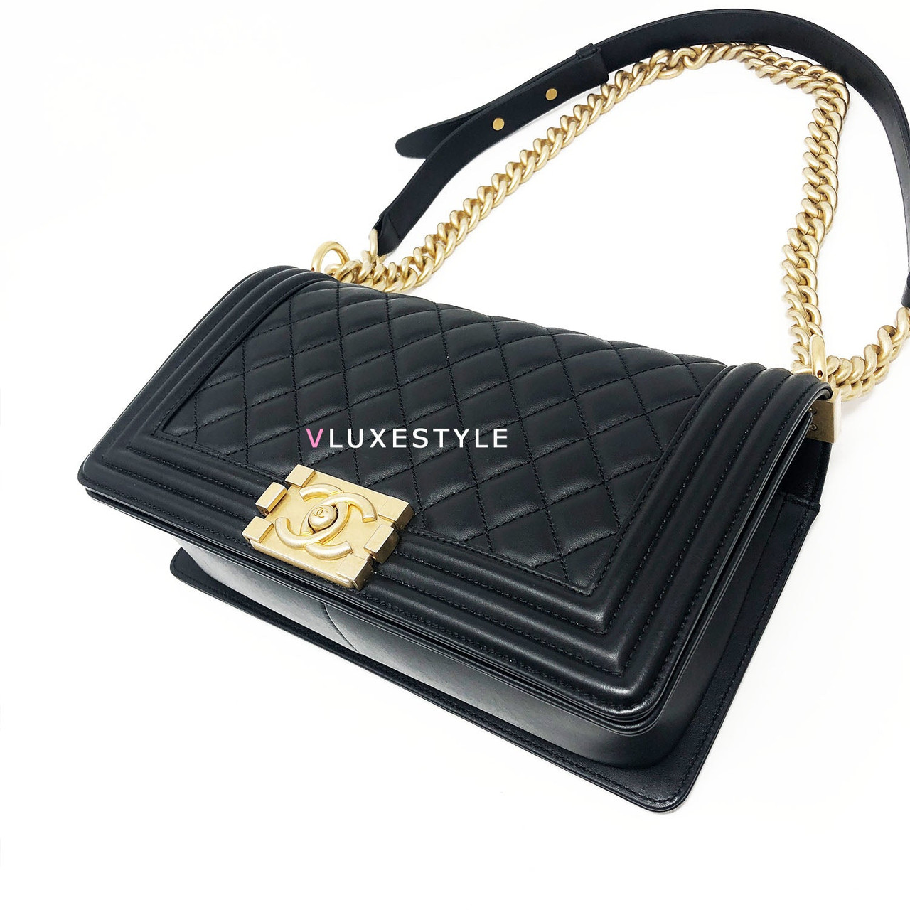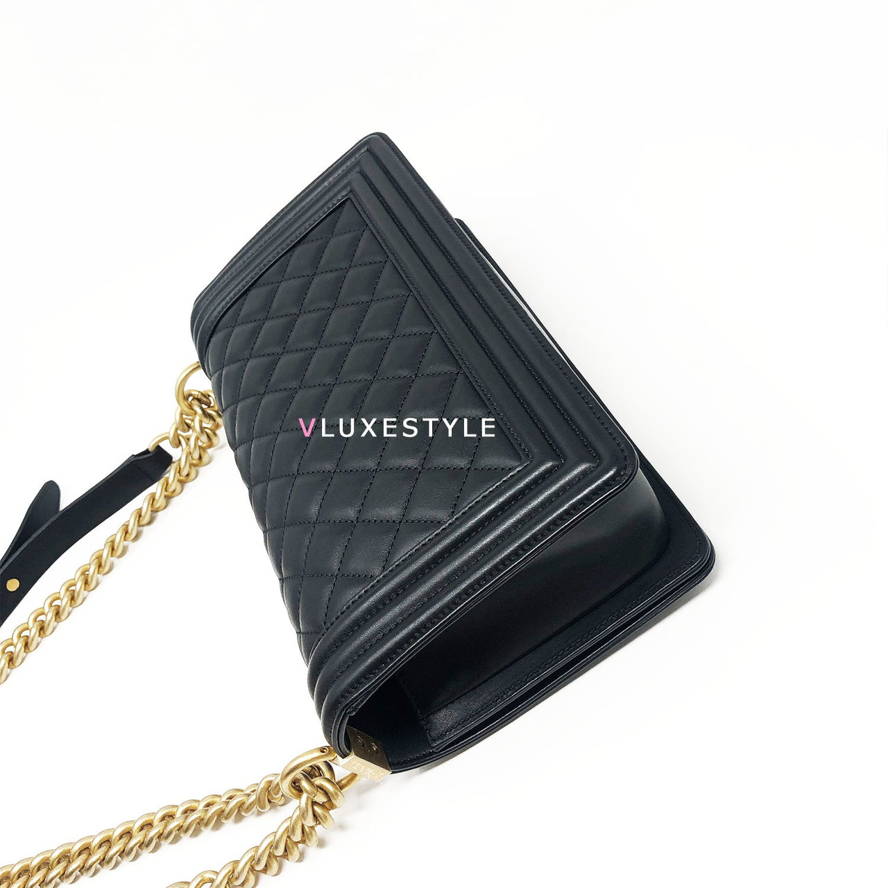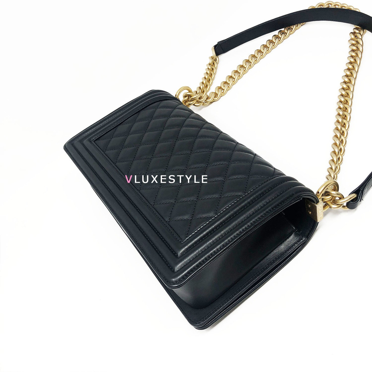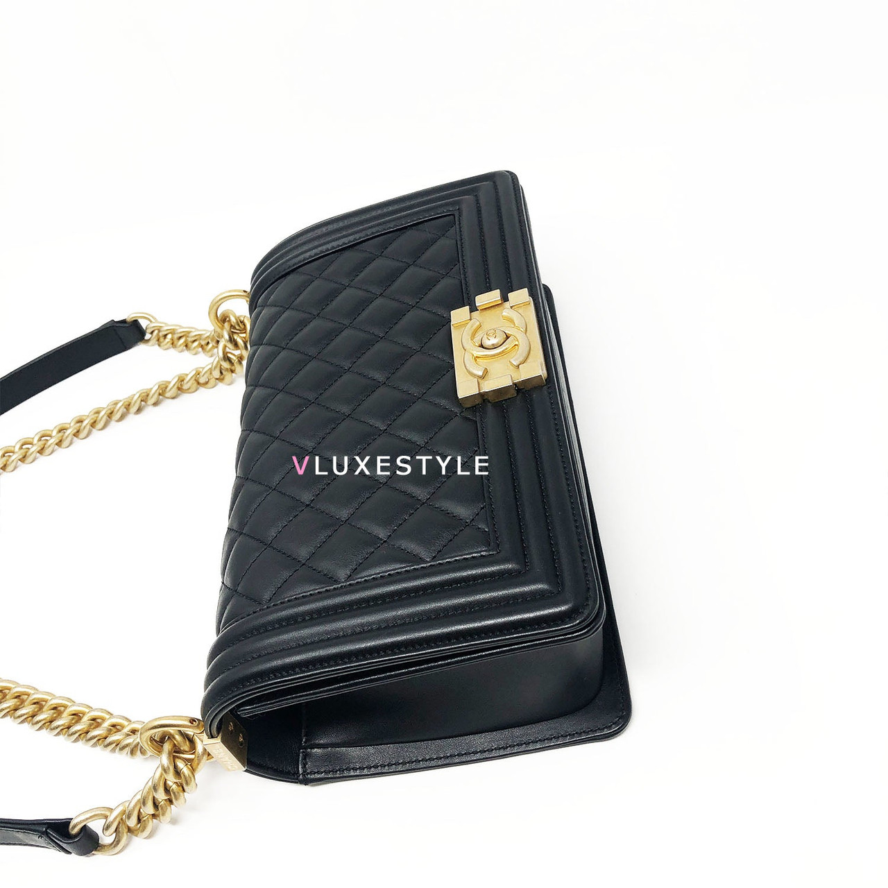 Authentic Chanel Le Boy Old Medium Black Quilted Calfskin with brushed gold hardware. This stylish shoulder bag is crafted of luxurious and durable quilted calfskin leather in black and brushed gold hardware. It's functional and versatile and features enough interior space to fit in all your essentials. The bag can be worn long and short over-the-shoulder bag and crossbody. It's the perfect bag for any occasion, wear it as a casual or formal bag.