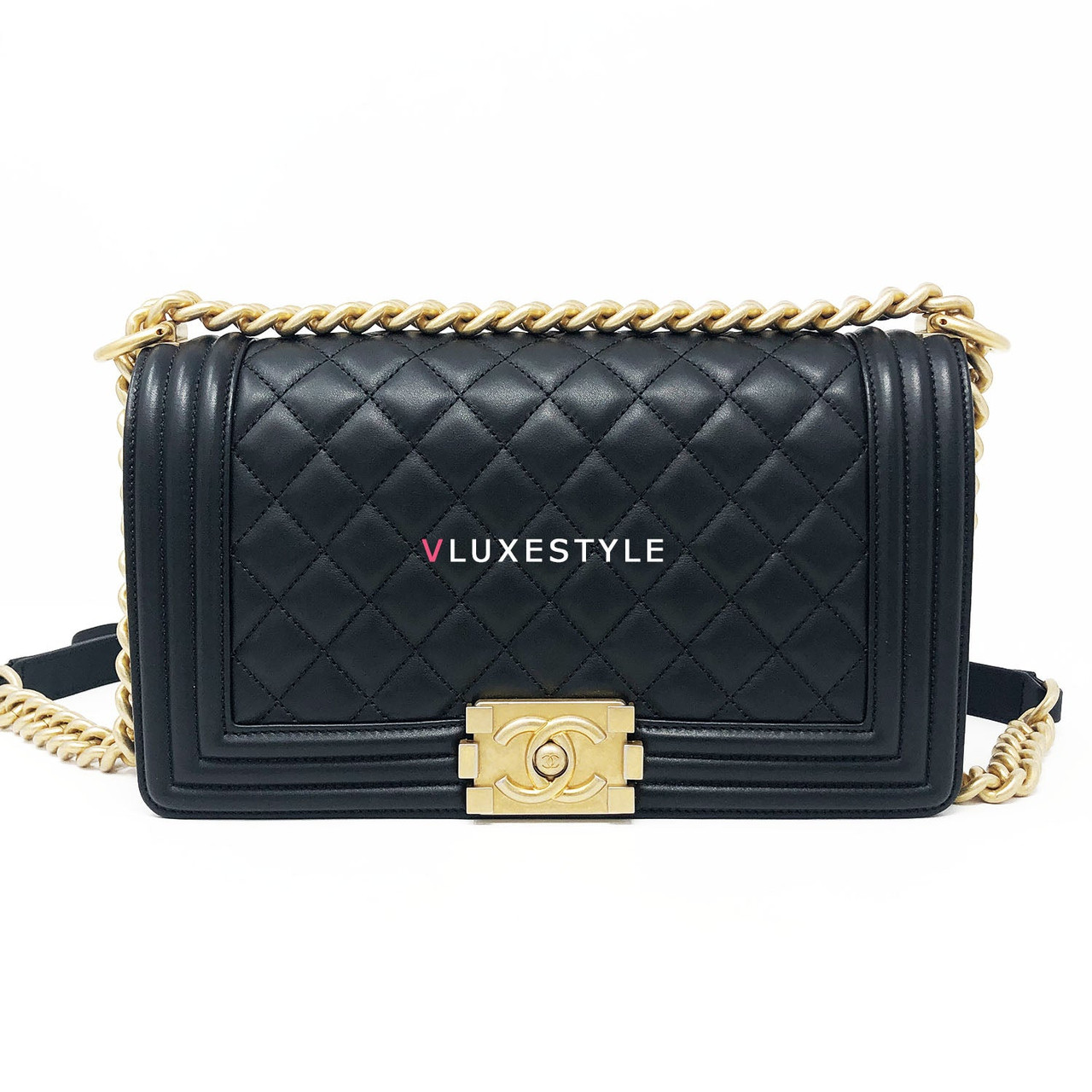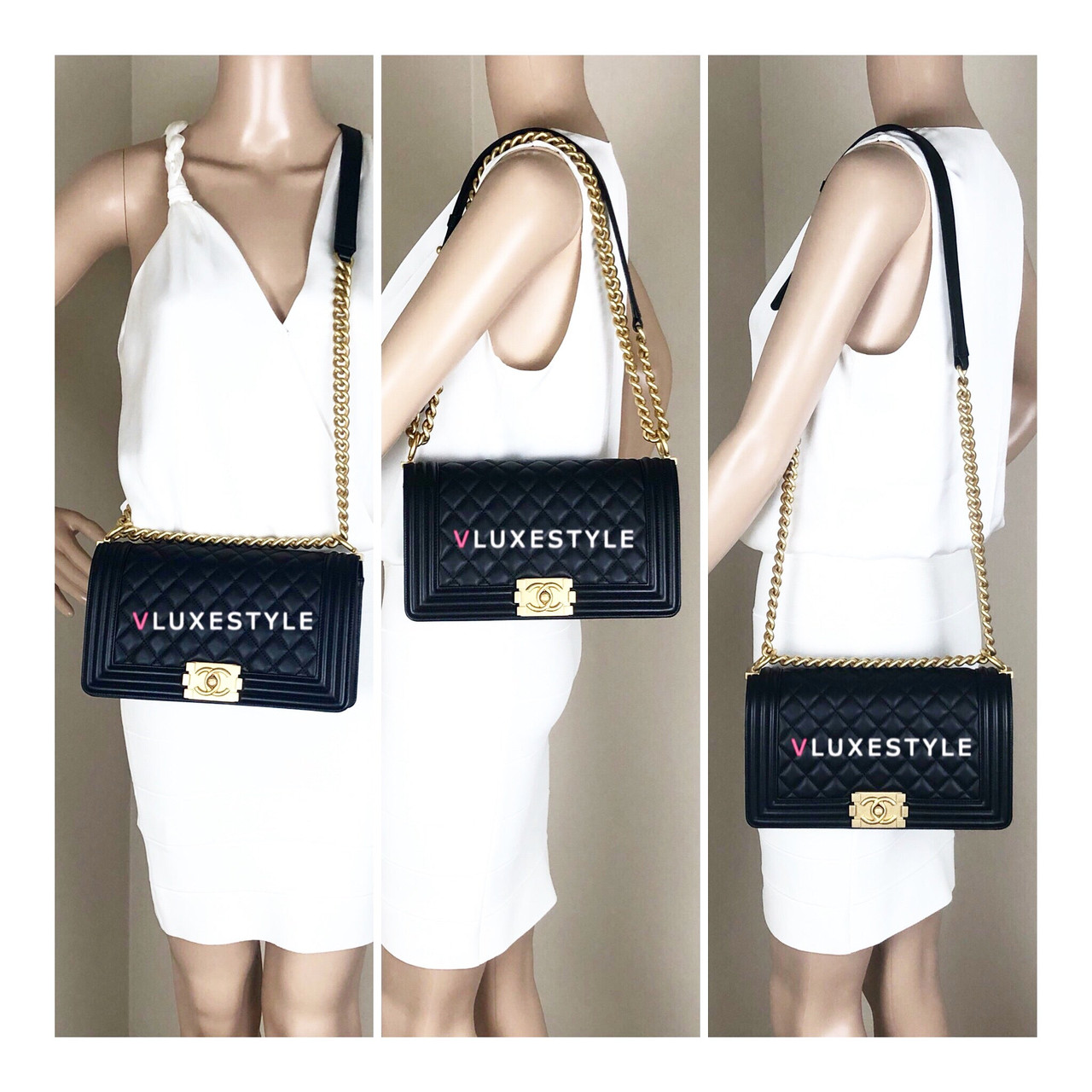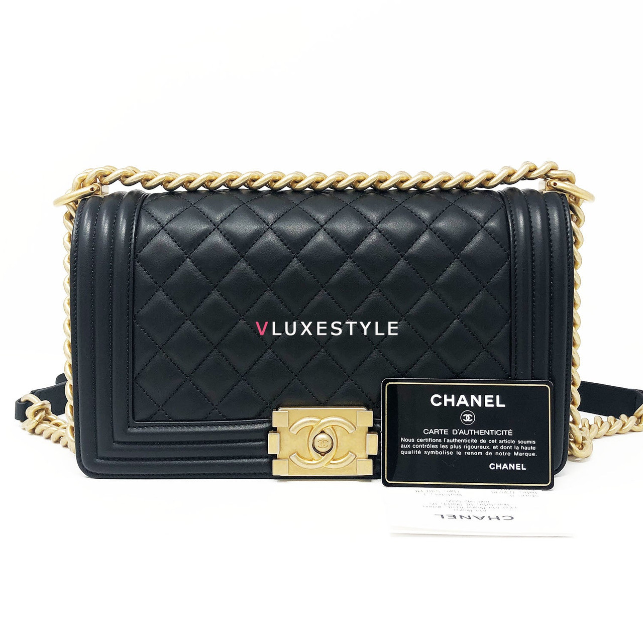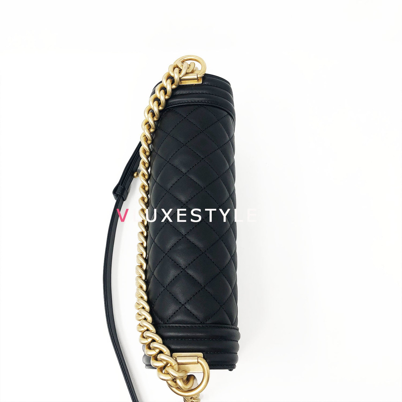 Authentic Chanel Le Boy Old Medium Black Quilted Calfskin with brushed gold hardware. This stylish shoulder bag is crafted of luxurious and durable quilted calfskin leather in black and brushed gold hardware. It's functional and versatile and features enough interior space to fit in all your essentials. The bag can be worn long and short over-the-shoulder bag and crossbody. It's the perfect bag for any occasion, wear it as a casual or formal bag.