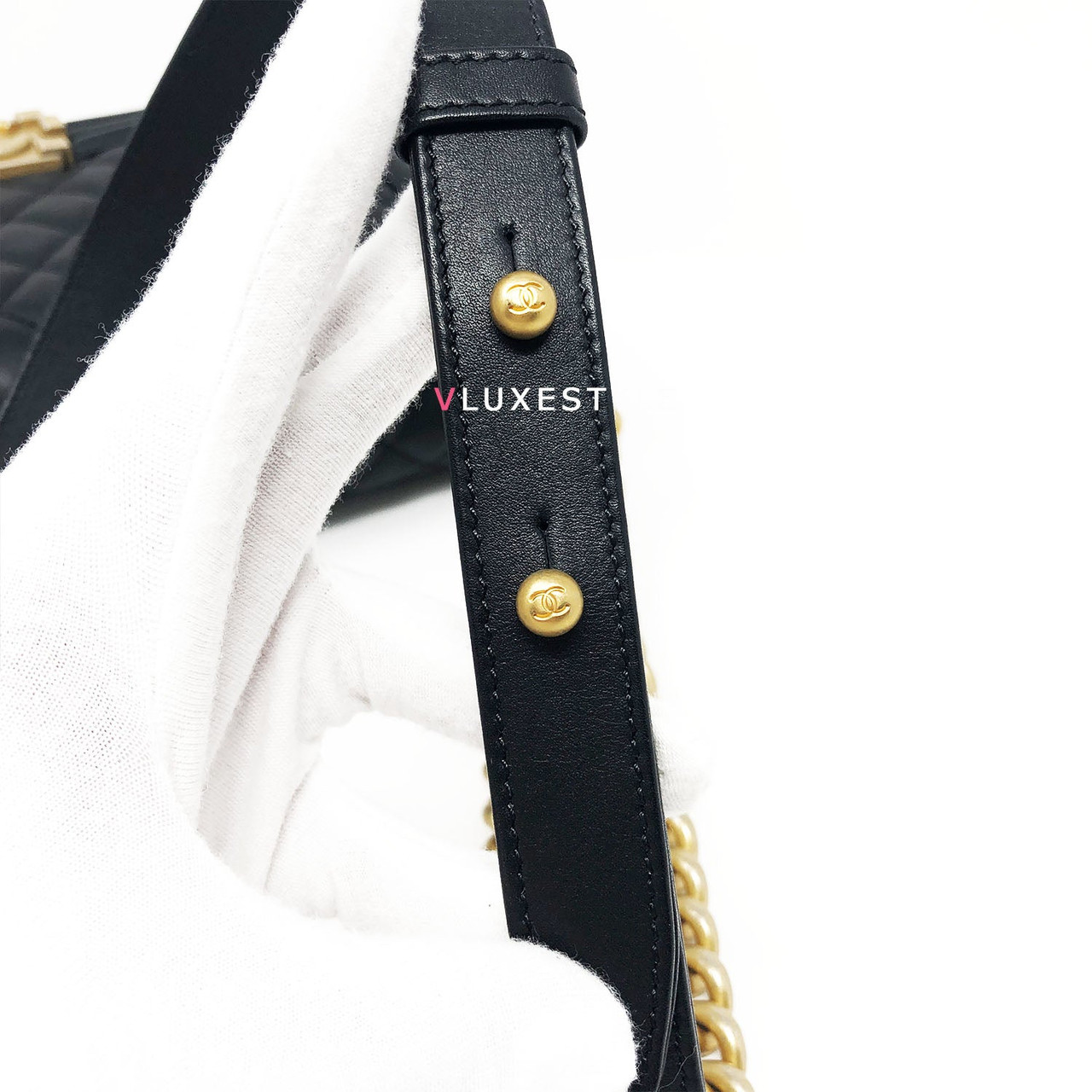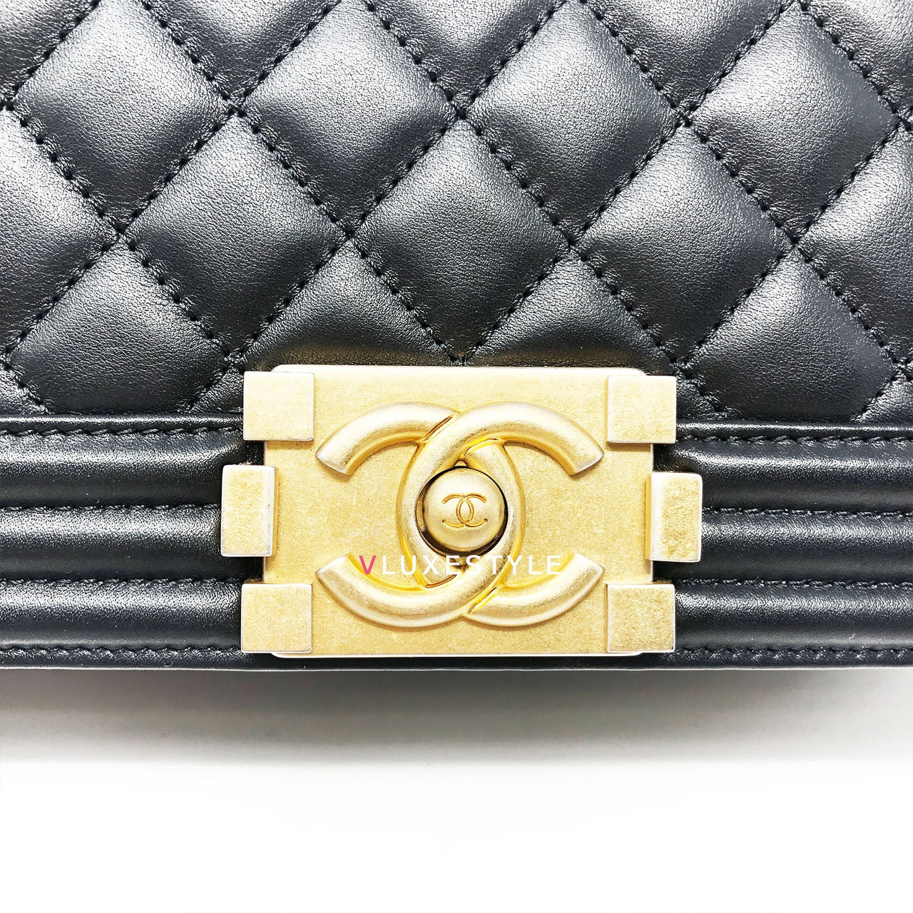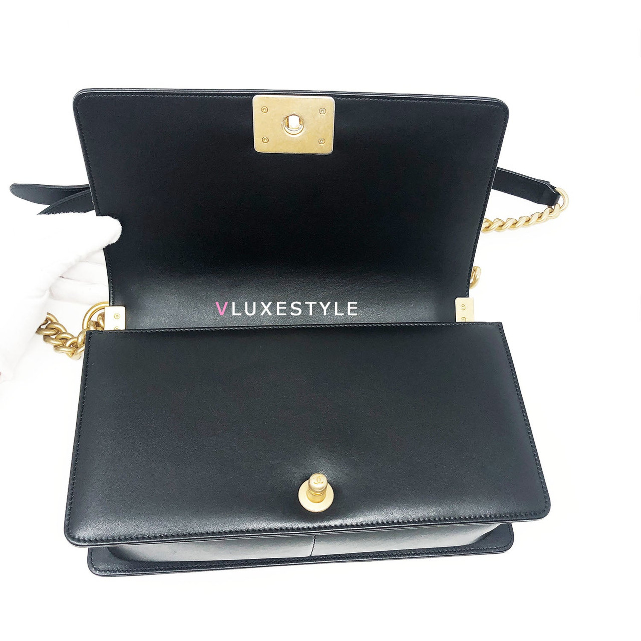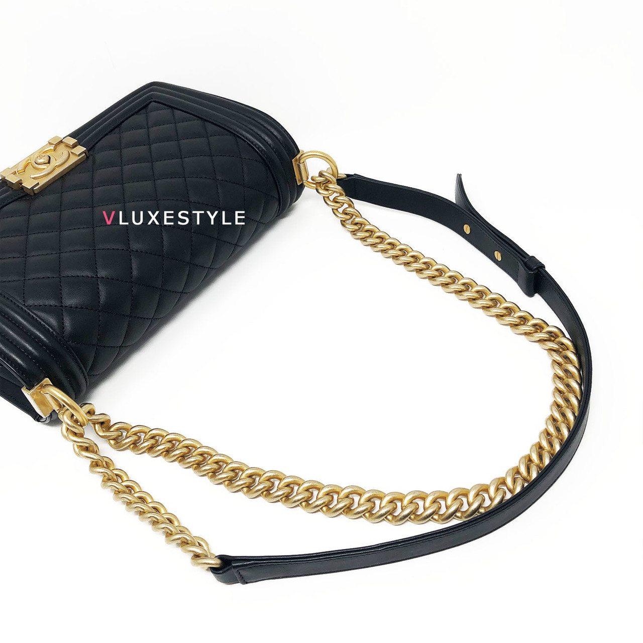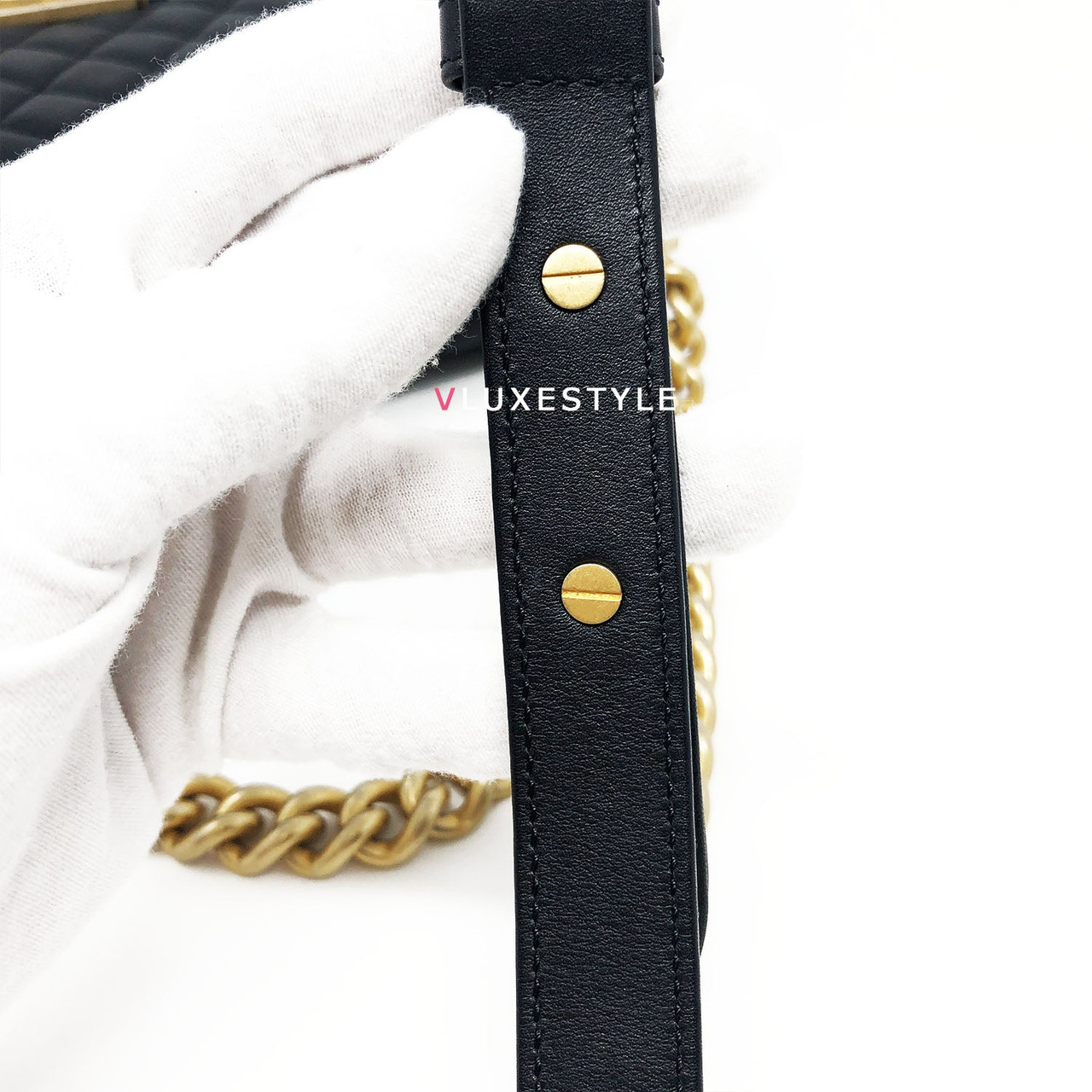 Authentic Chanel Le Boy Old Medium Black Quilted Calfskin with brushed gold hardware. This stylish shoulder bag is crafted of luxurious and durable quilted calfskin leather in black and brushed gold hardware. It's functional and versatile and features enough interior space to fit in all your essentials. The bag can be worn long and short over-the-shoulder bag and crossbody. It's the perfect bag for any occasion, wear it as a casual or formal bag.